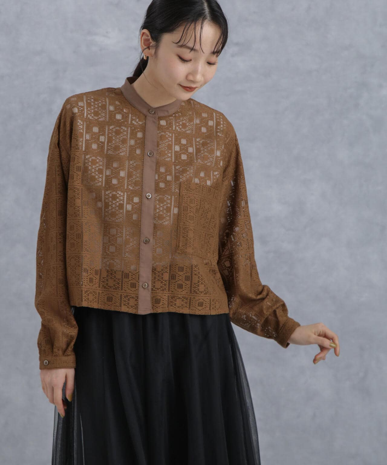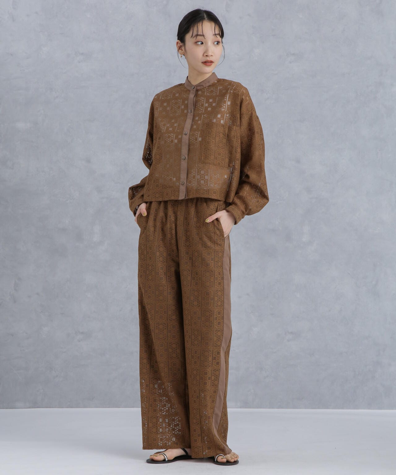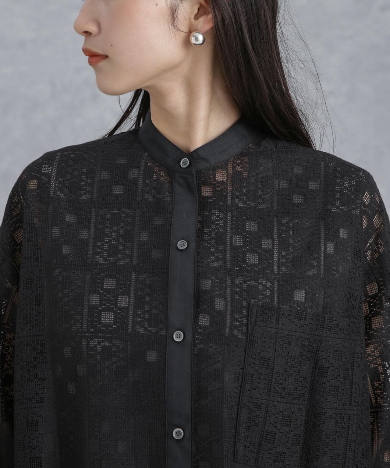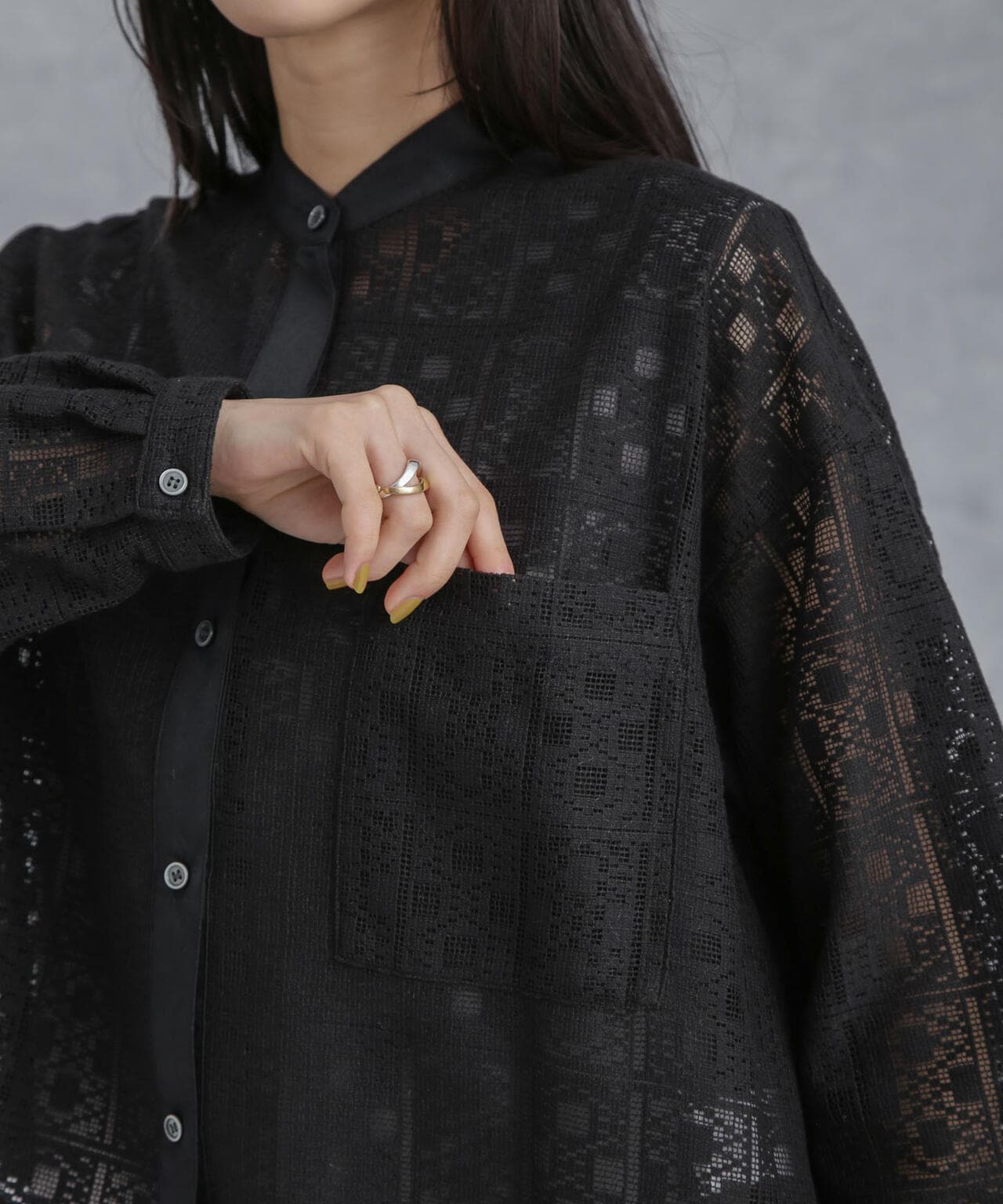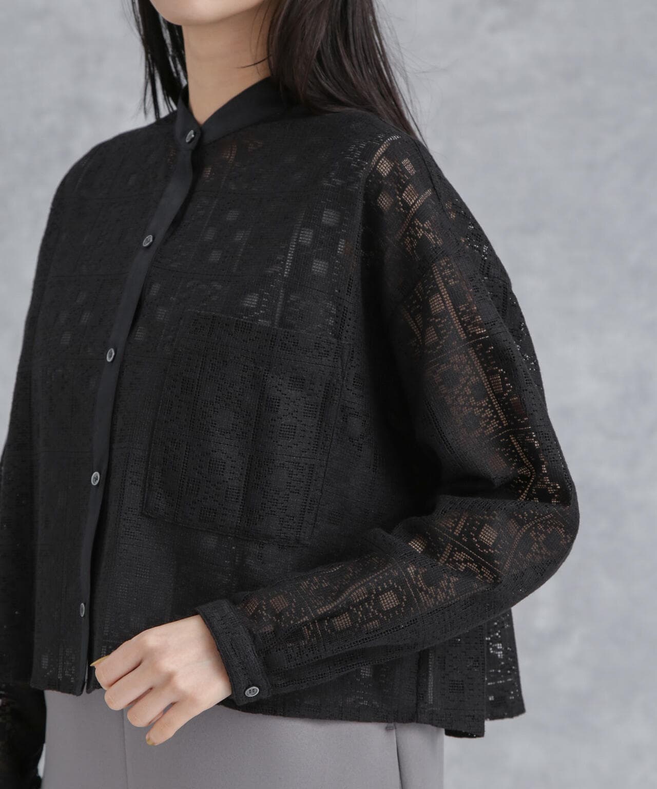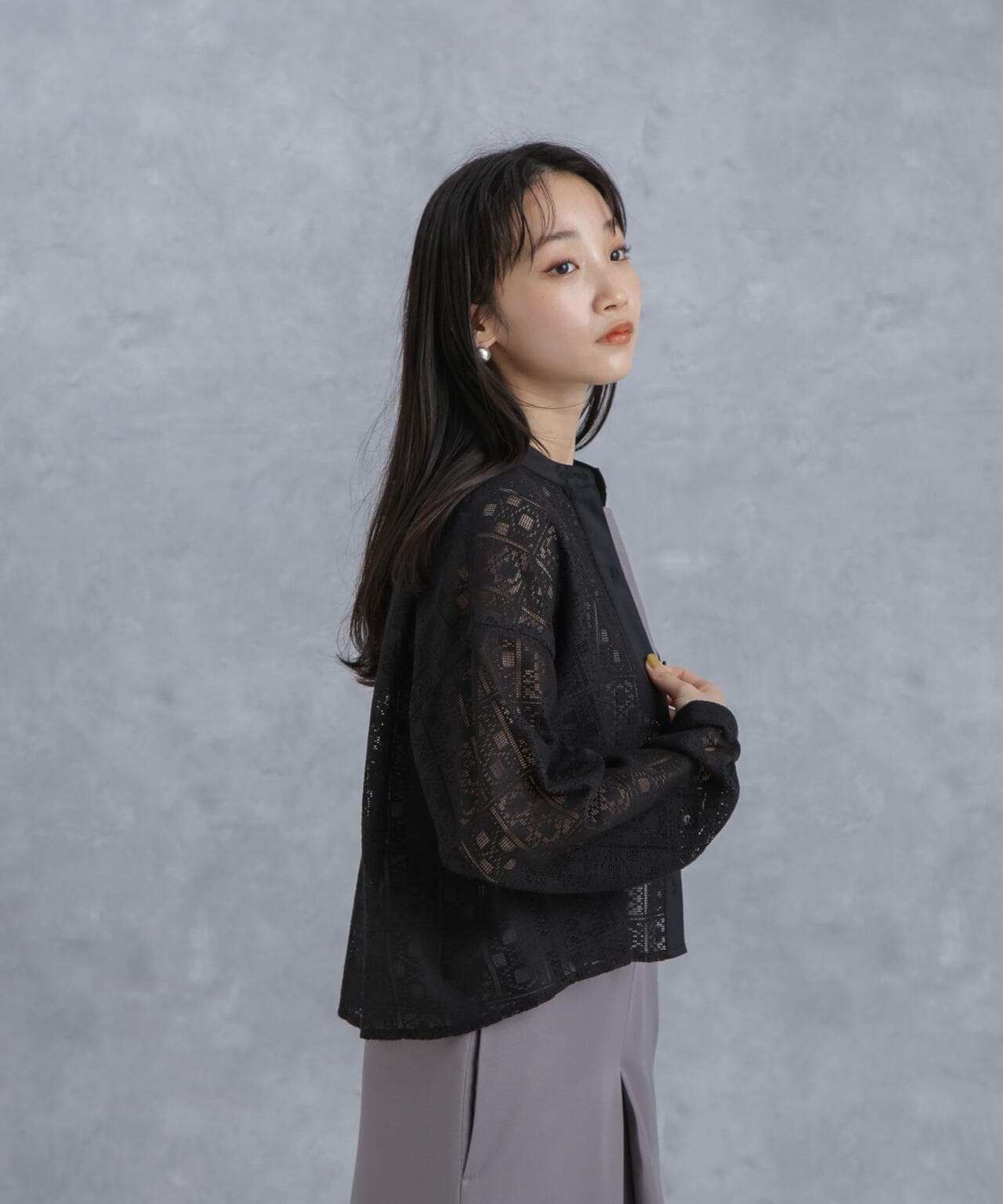 格子柄のレースを使用したスタンドカラーシャツ。短すぎないクロップドの着丈とタックを施した袖口のシルエットデザインがポイント◎。ナチュラル感をおさえたクリーンな印象のレースなので、トレンドライクな着こなしが叶う一枚。同素材のイージーパンツと合わせセットアップコーデなど、ワイドパンツとの相性がよいアイテムです!