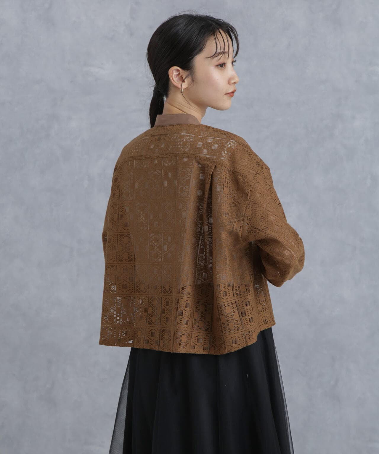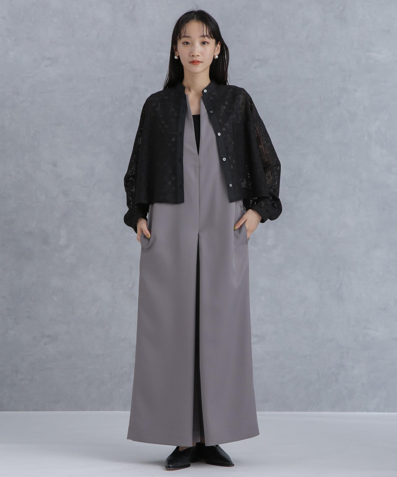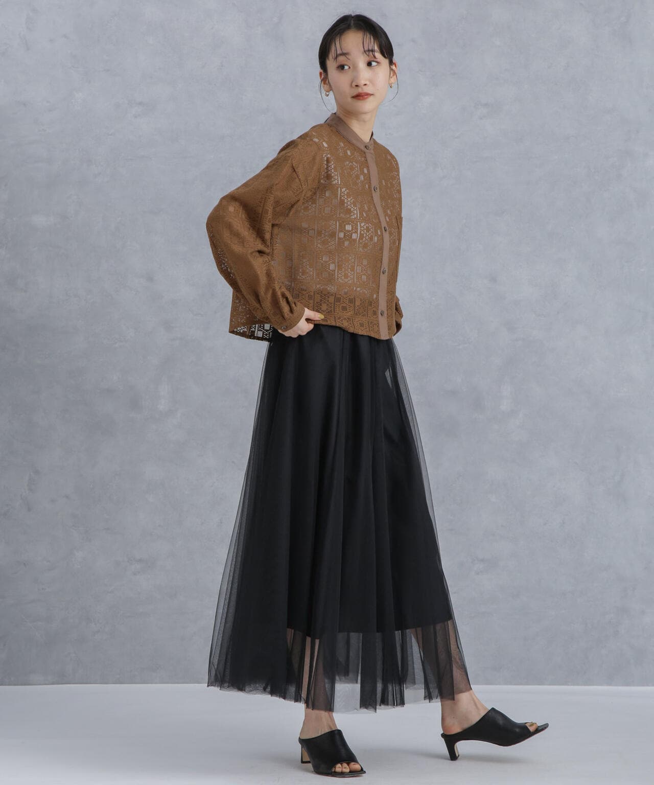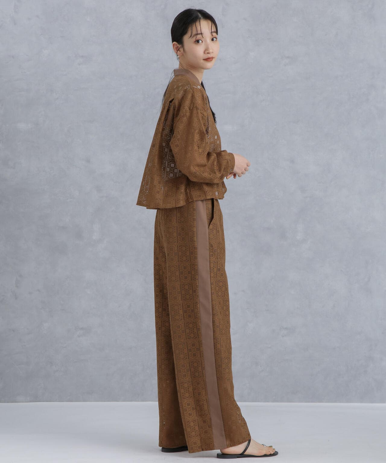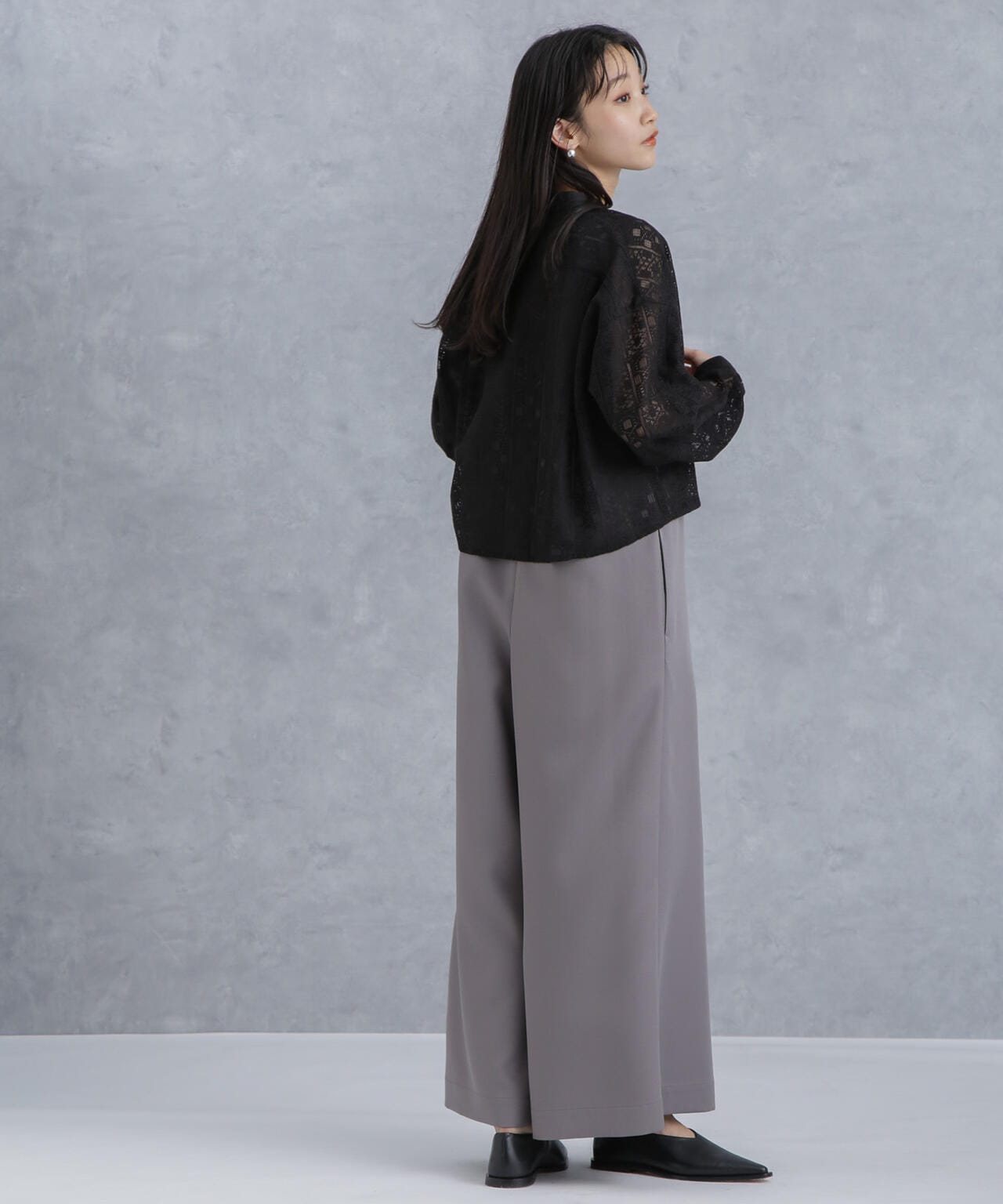 格子柄のレースを使用したスタンドカラーシャツ。短すぎないクロップドの着丈とタックを施した袖口のシルエットデザインがポイント◎。ナチュラル感をおさえたクリーンな印象のレースなので、トレンドライクな着こなしが叶う一枚。同素材のイージーパンツと合わせセットアップコーデなど、ワイドパンツとの相性がよいアイテムです!