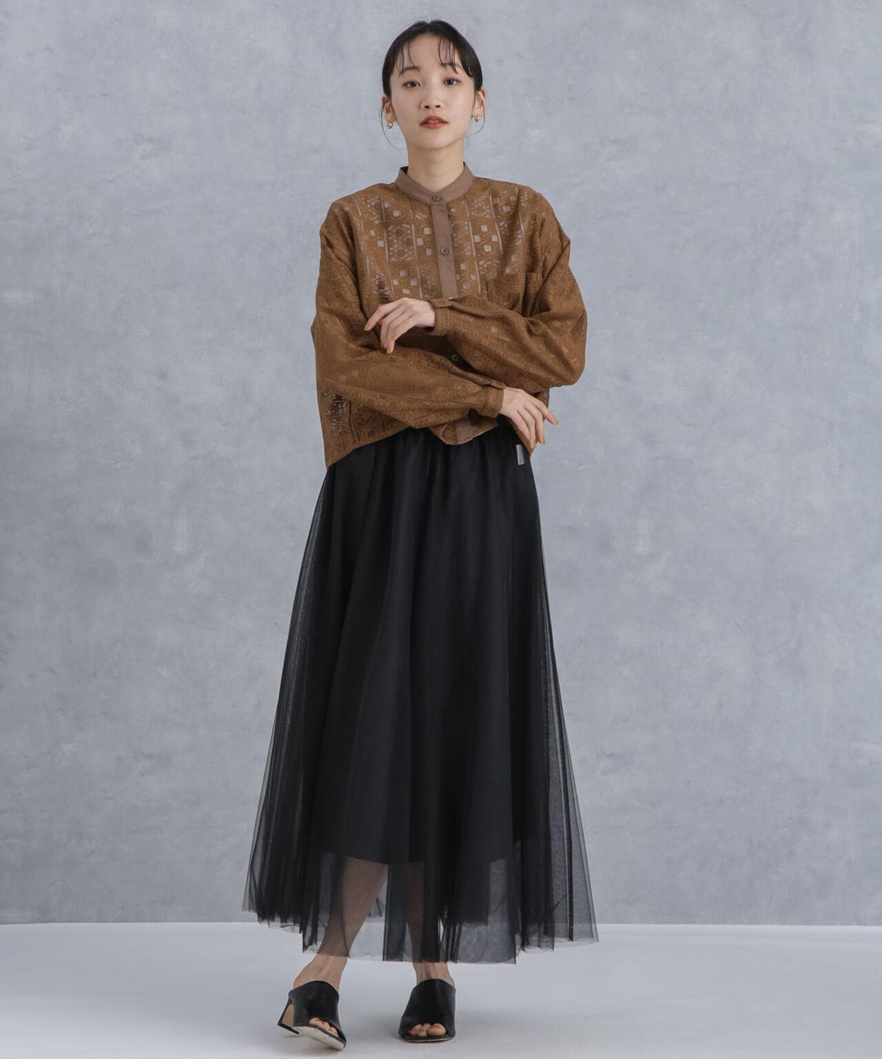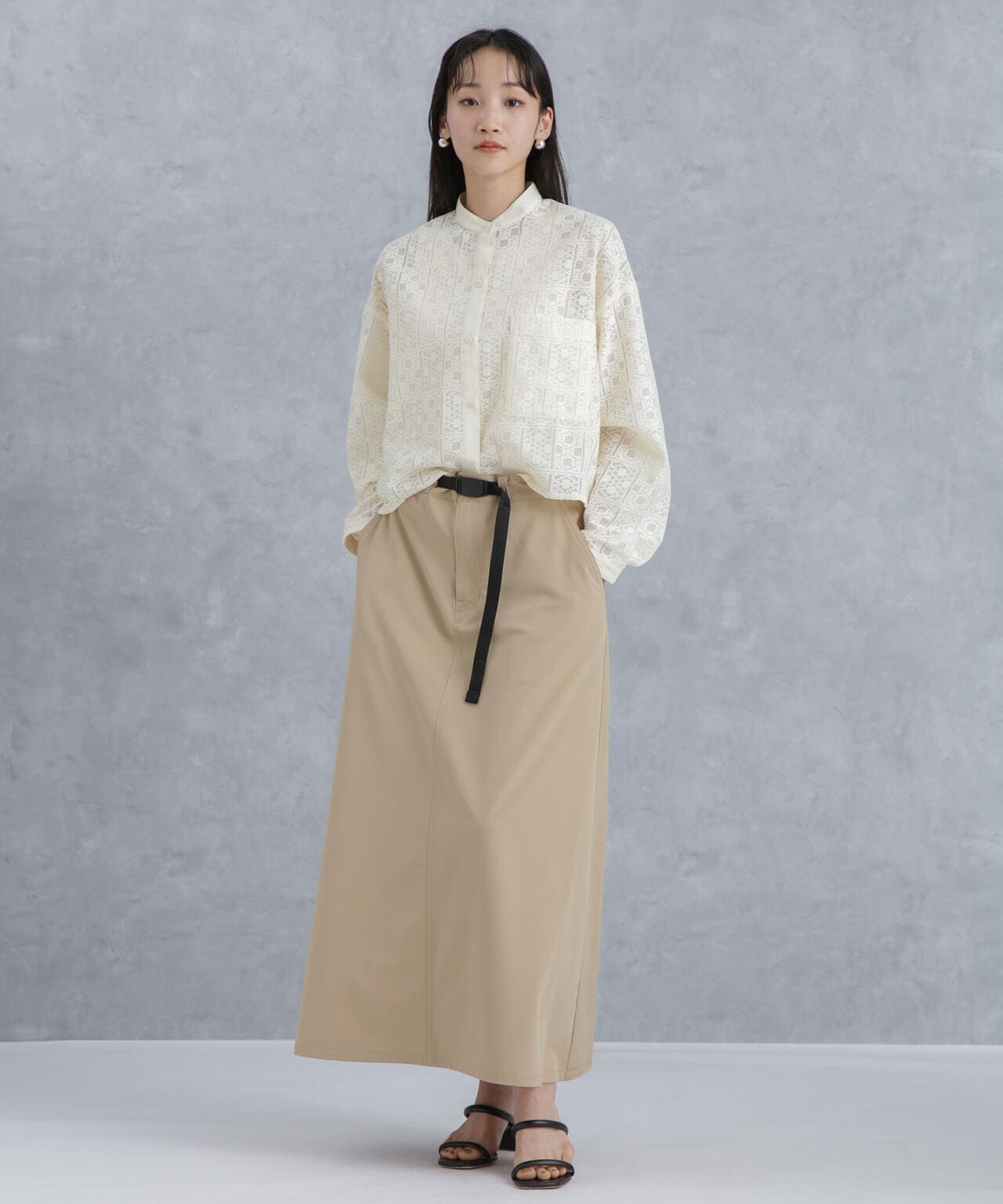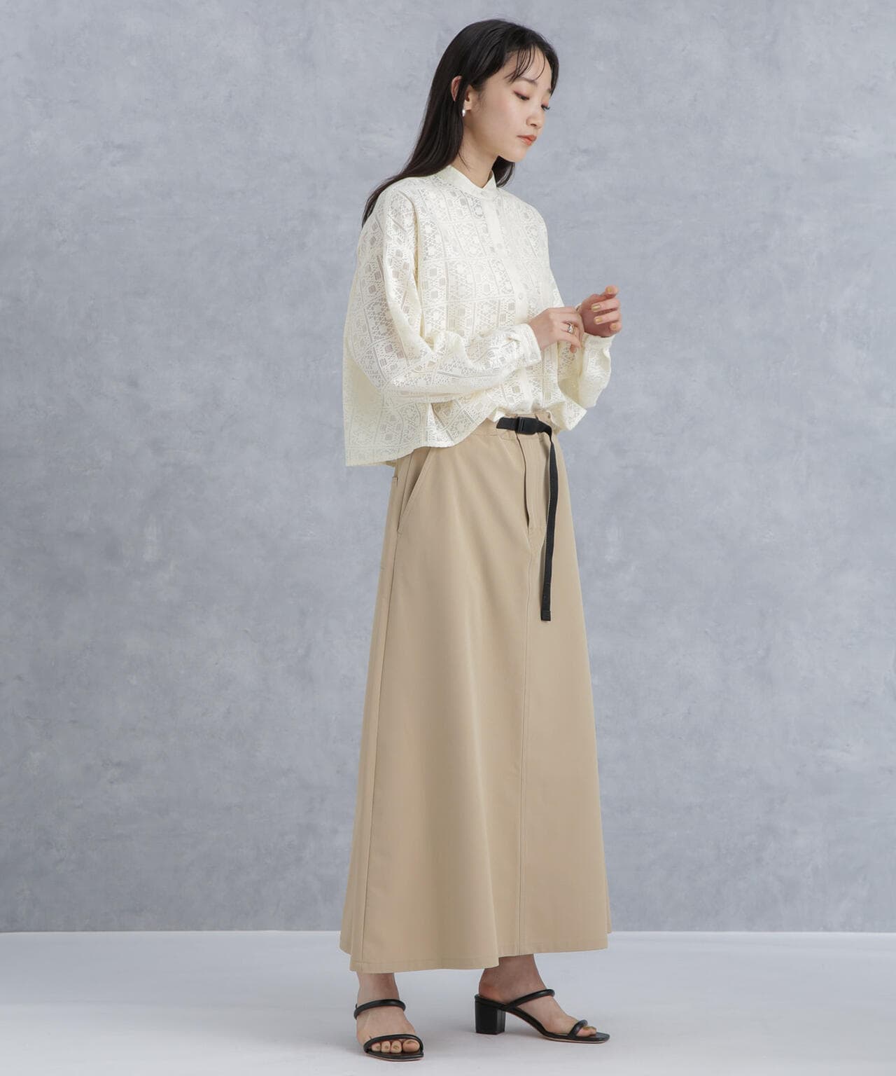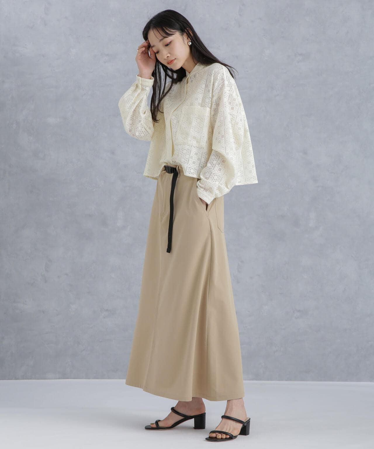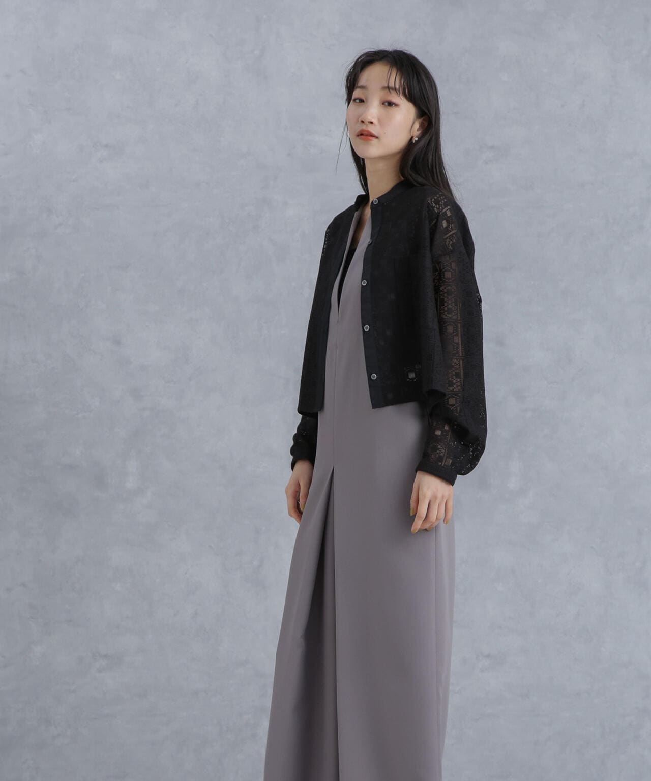 格子柄のレースを使用したスタンドカラーシャツ。短すぎないクロップドの着丈とタックを施した袖口のシルエットデザインがポイント◎。ナチュラル感をおさえたクリーンな印象のレースなので、トレンドライクな着こなしが叶う一枚。同素材のイージーパンツと合わせセットアップコーデなど、ワイドパンツとの相性がよいアイテムです!