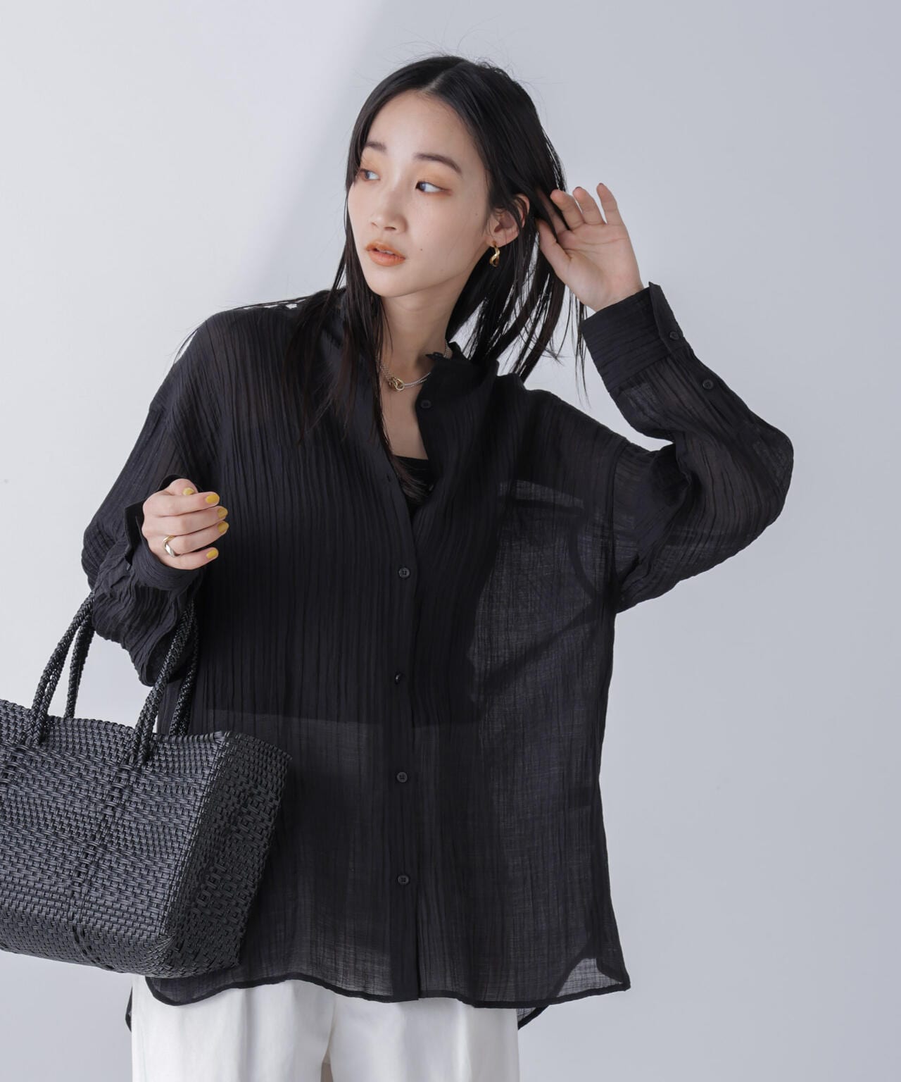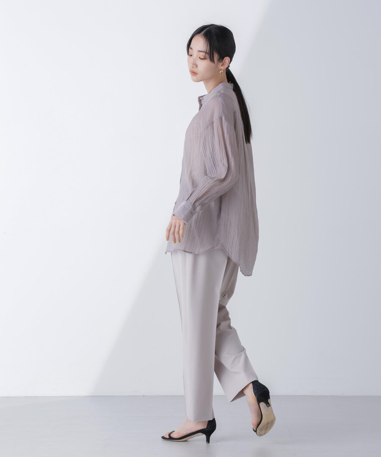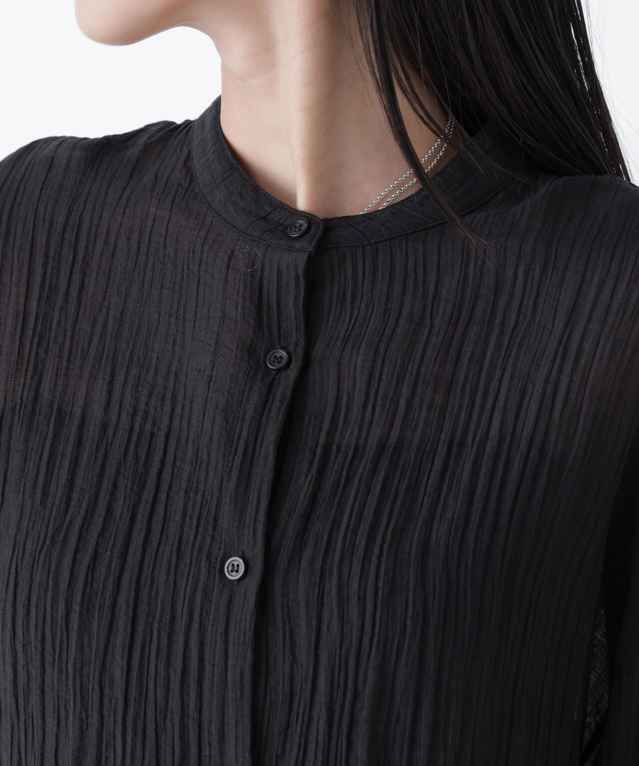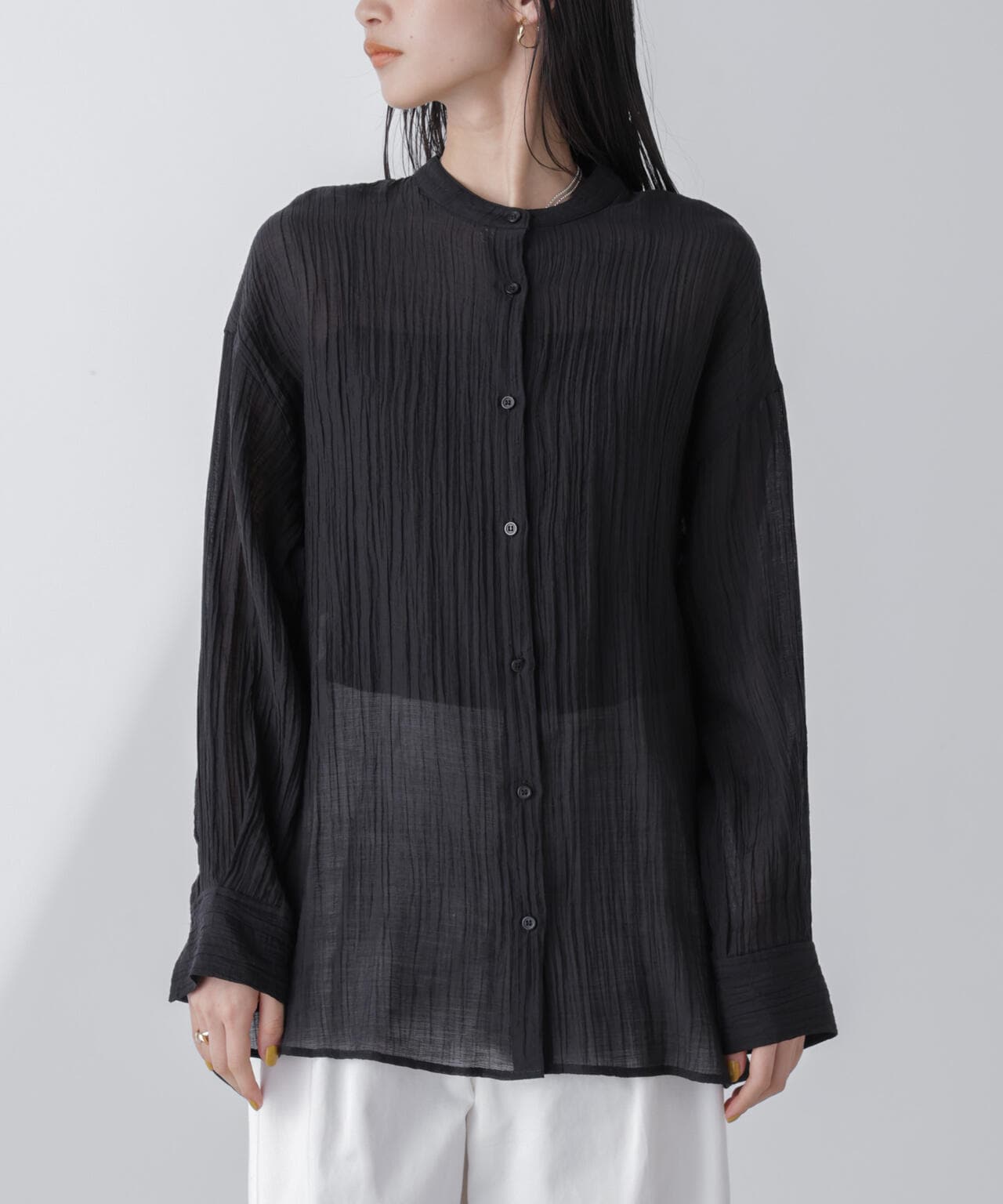 すっきりとしたバンドカラーがポイントのシアーシャツ。シワ加工が施された軽やかなシアー素材が抜け感を演出。