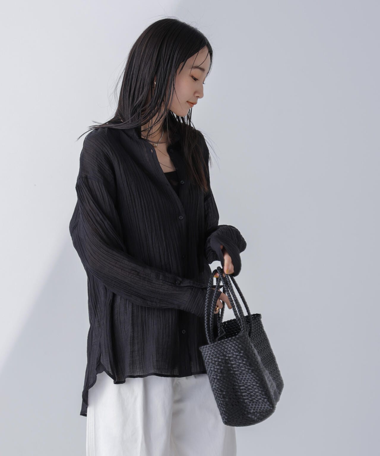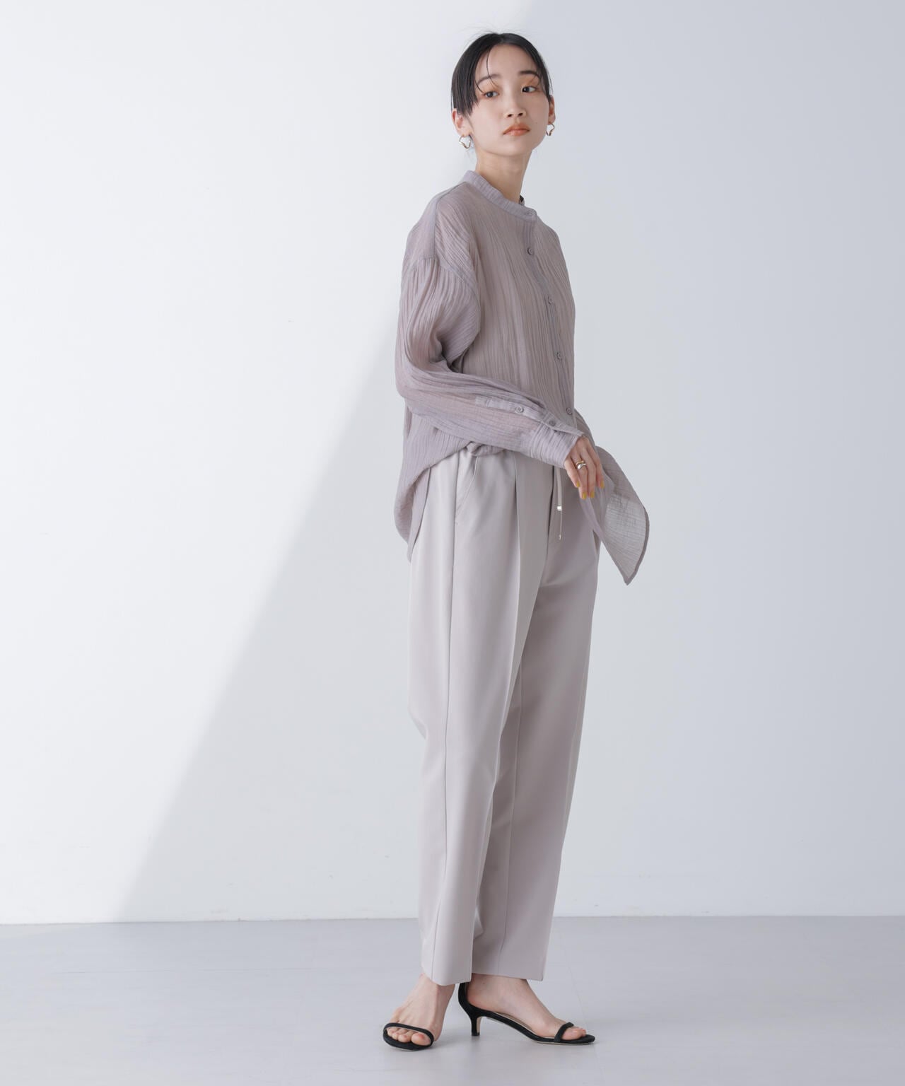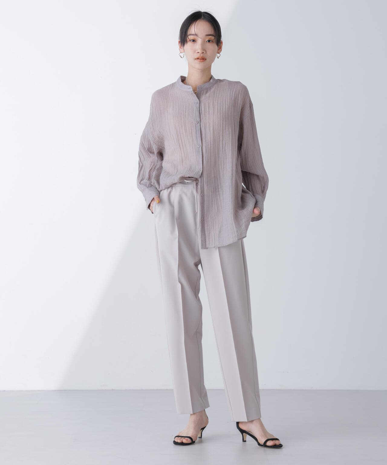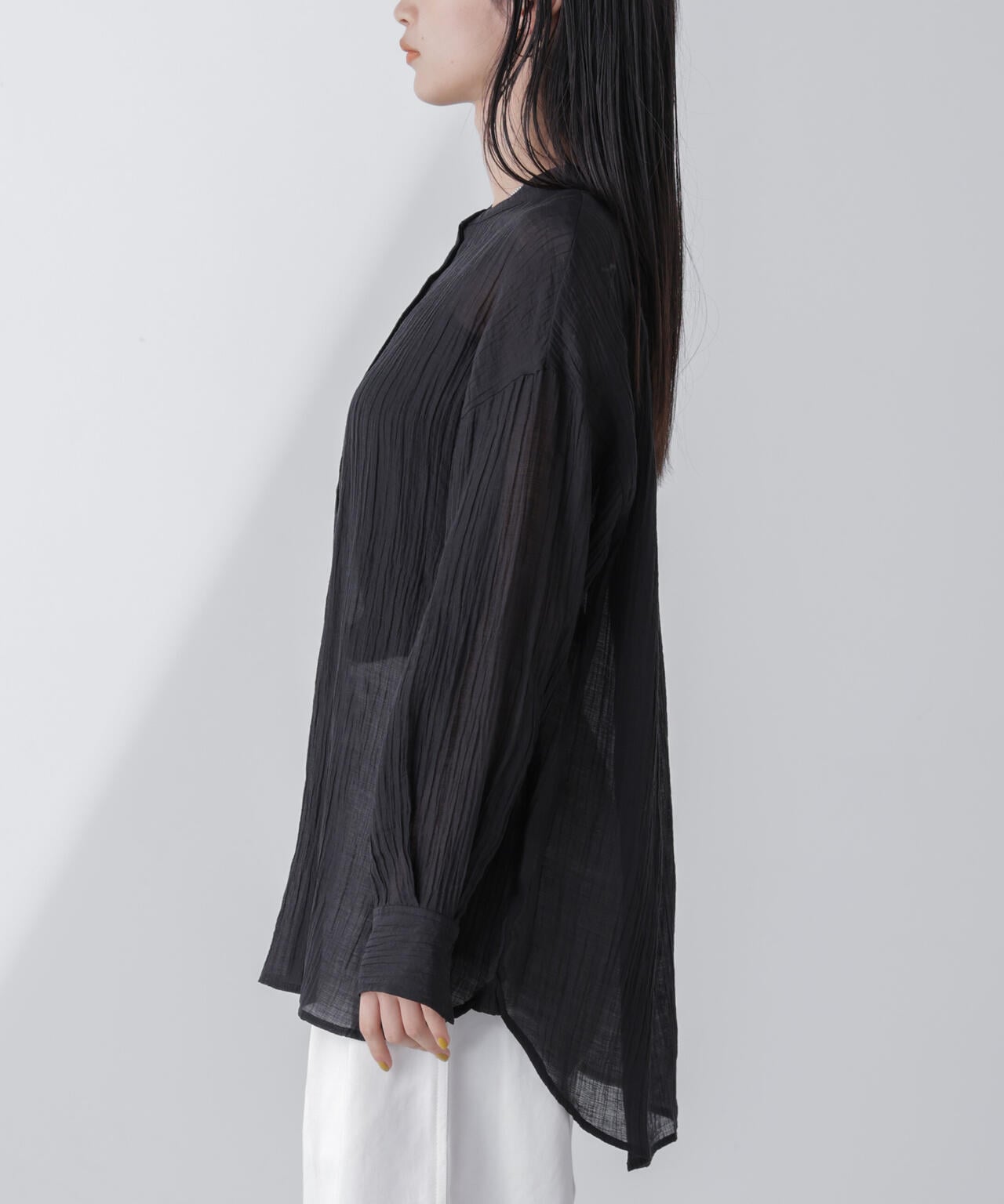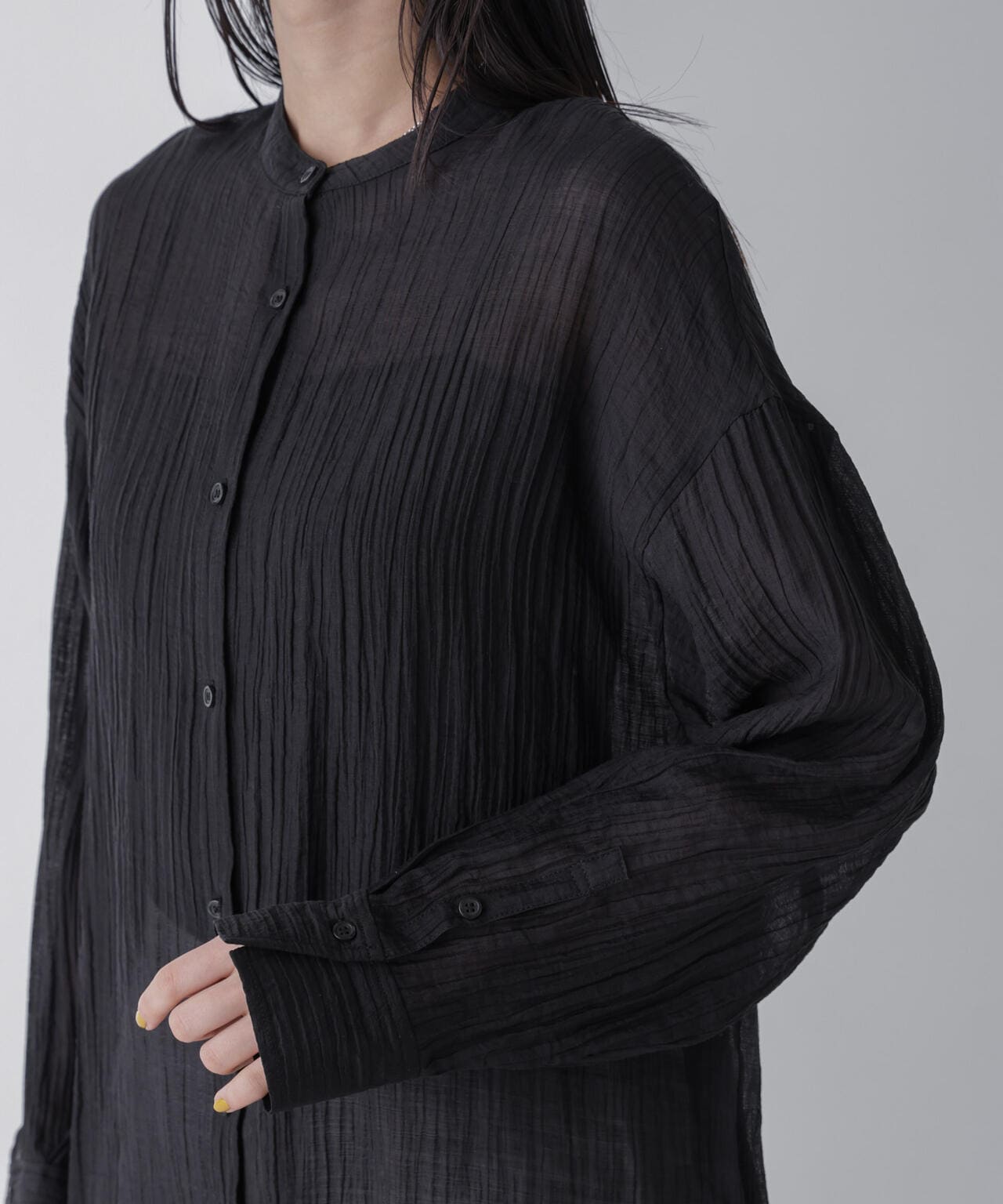 すっきりとしたバンドカラーがポイントのシアーシャツ。シワ加工が施された軽やかなシアー素材が抜け感を演出。