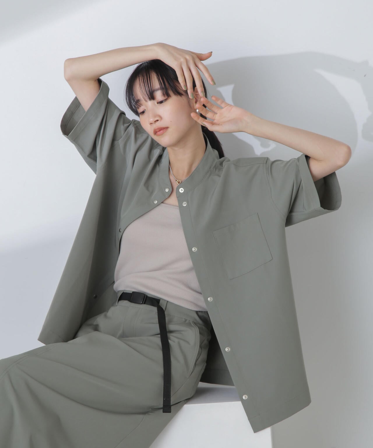 機能性素材を使用した快適な着心地のスタンドカラーシャツ。軽くてストレッチ性のある素材なので、カーディガン感覚で軽やかに羽織れるのも魅力。ゆったりとしたボックスシルエットが体型カバーにも貢献◎。シンプルでどんなボトムにも合わせやすく、デイリーの着回しに活躍するひと品です。