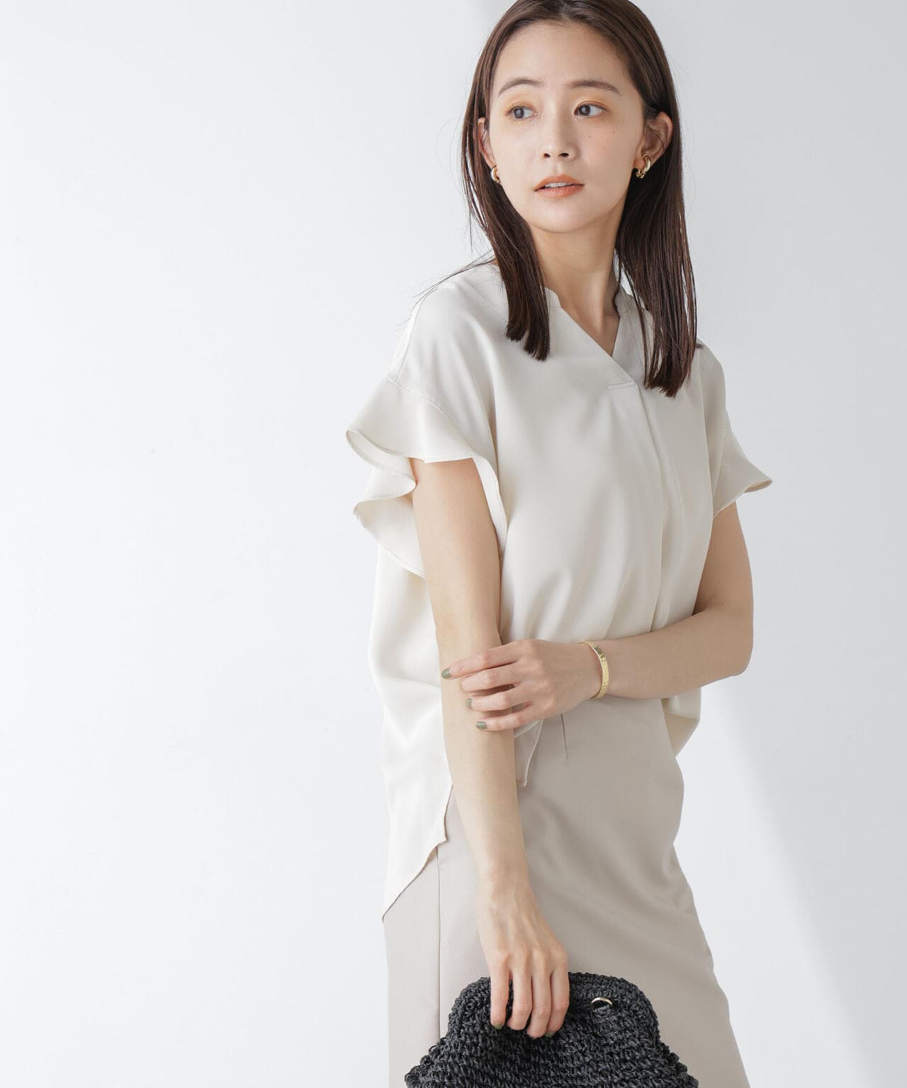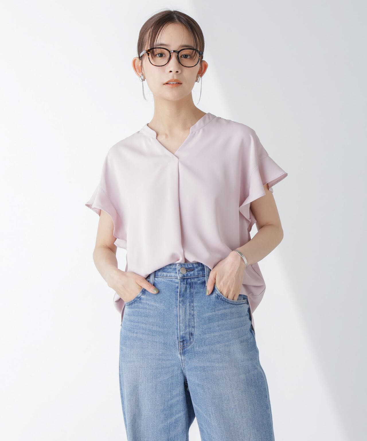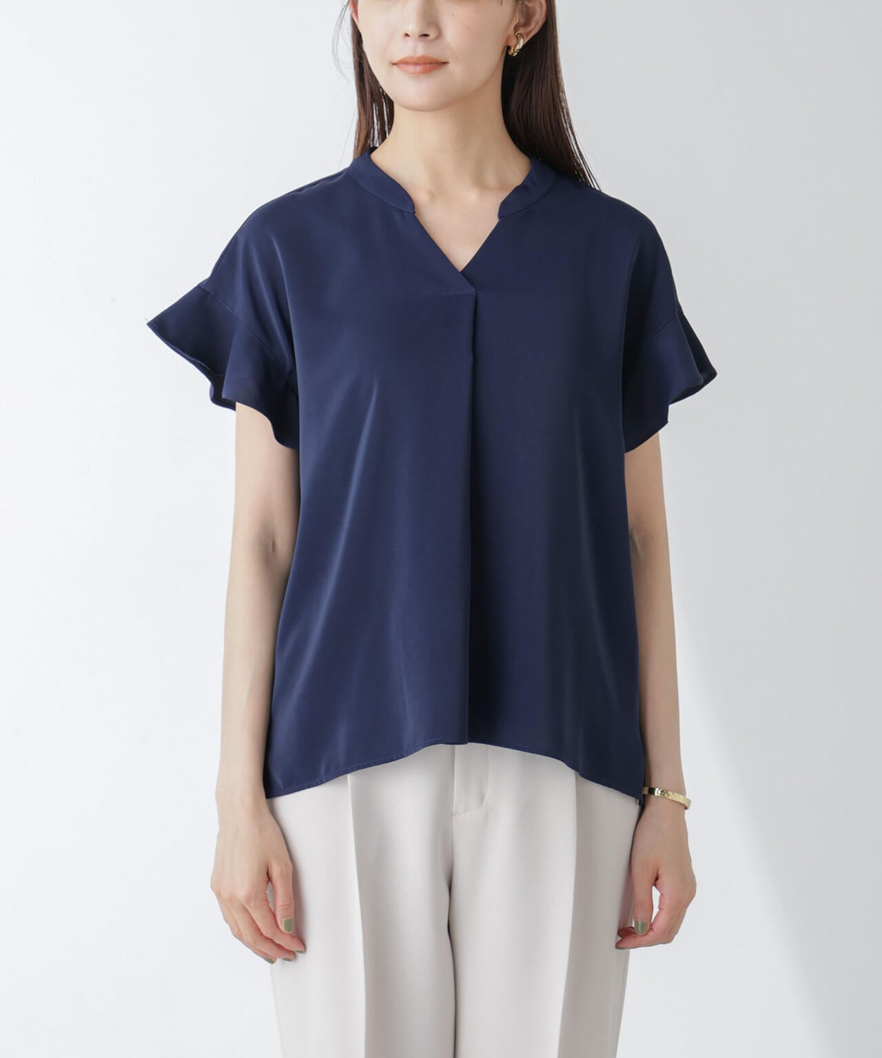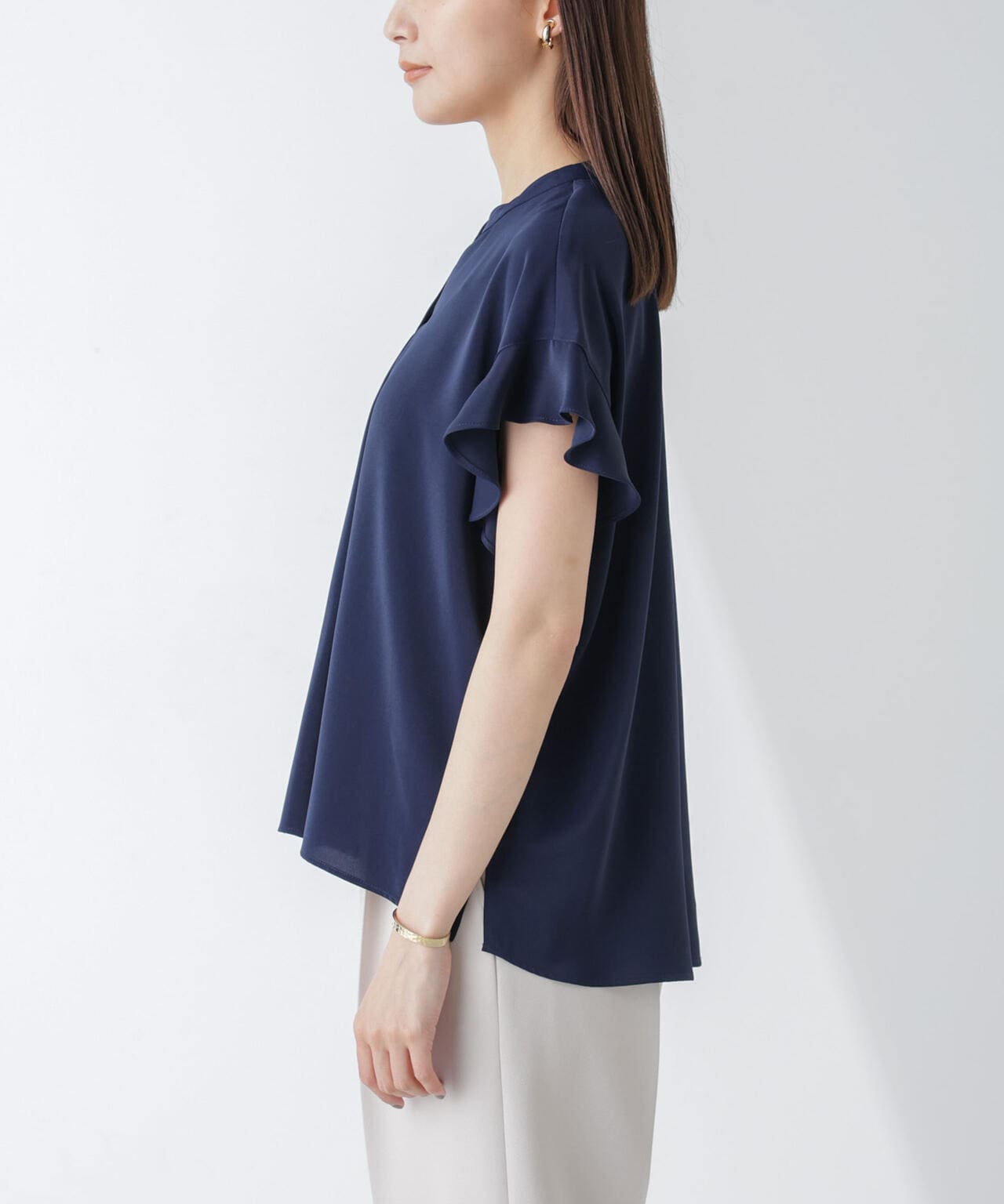 フレアスリーブが大人フェミニンな印象の半袖ブラウス。