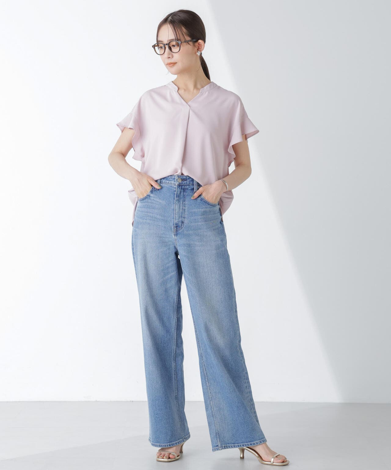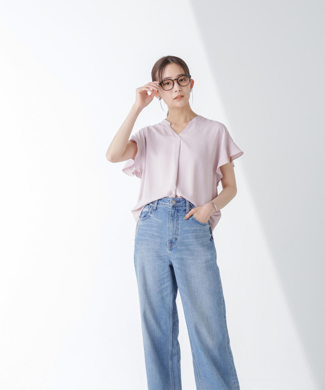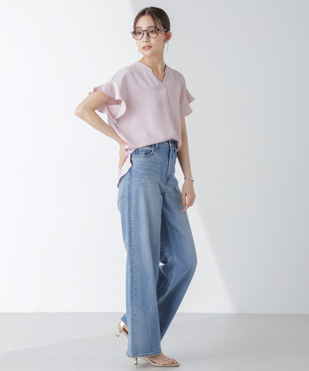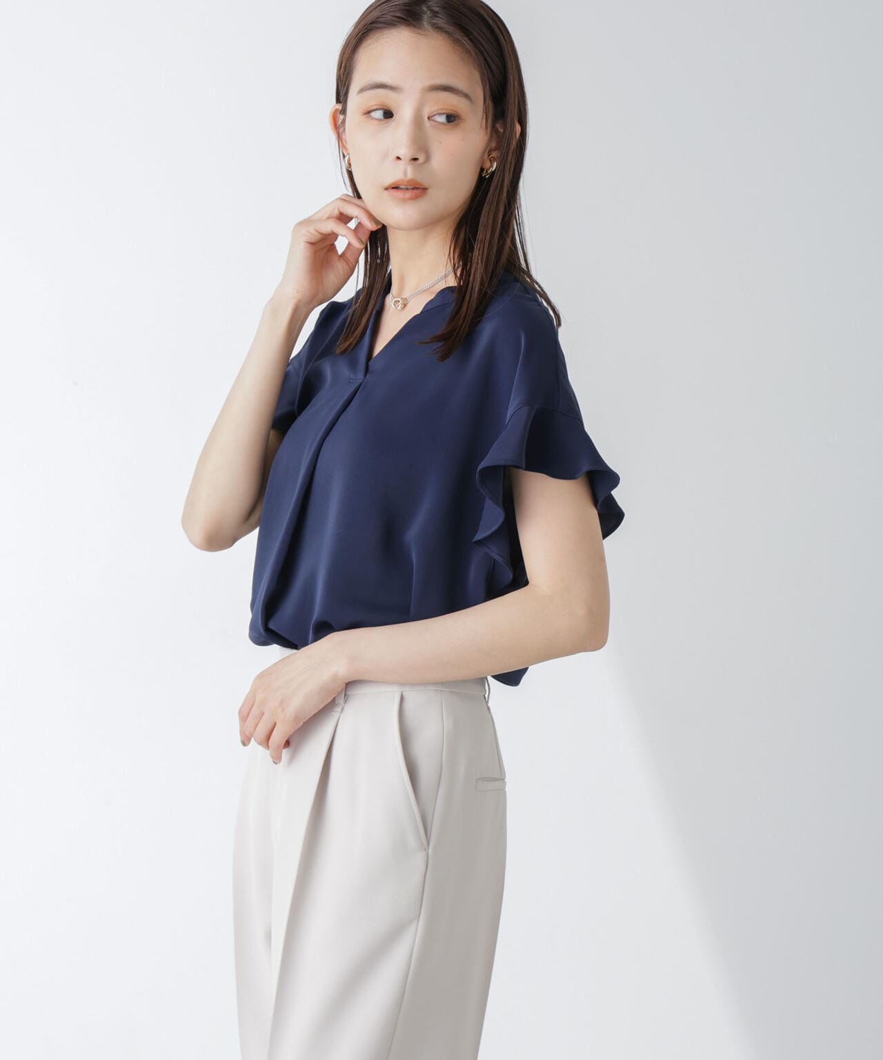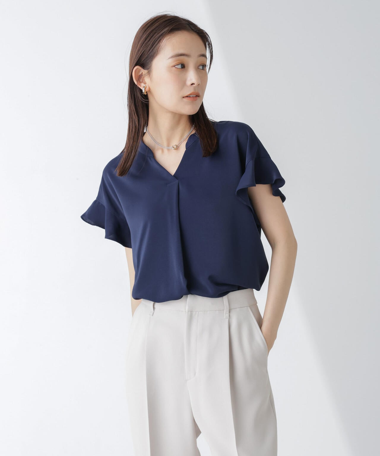 フレアスリーブが大人フェミニンな印象の半袖ブラウス。