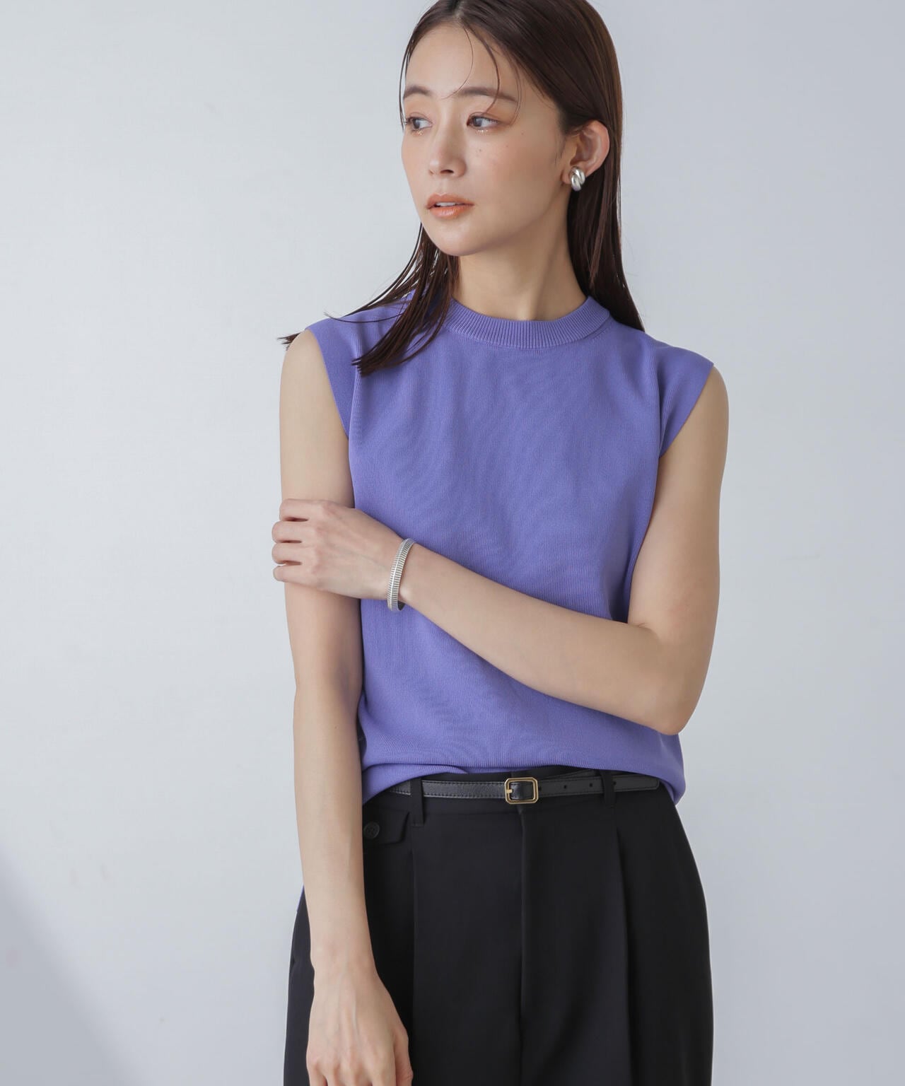 シンプルながら洗練された印象に仕上げたノースリーブニット。詰まりのあるクルーネックとスリーブレスで、肌見せのバランスに拘り仕上げました。接触冷感とUVカット機能付きのお手入れしやすい素材感なので、ワードローブに追加しておくと重宝します。