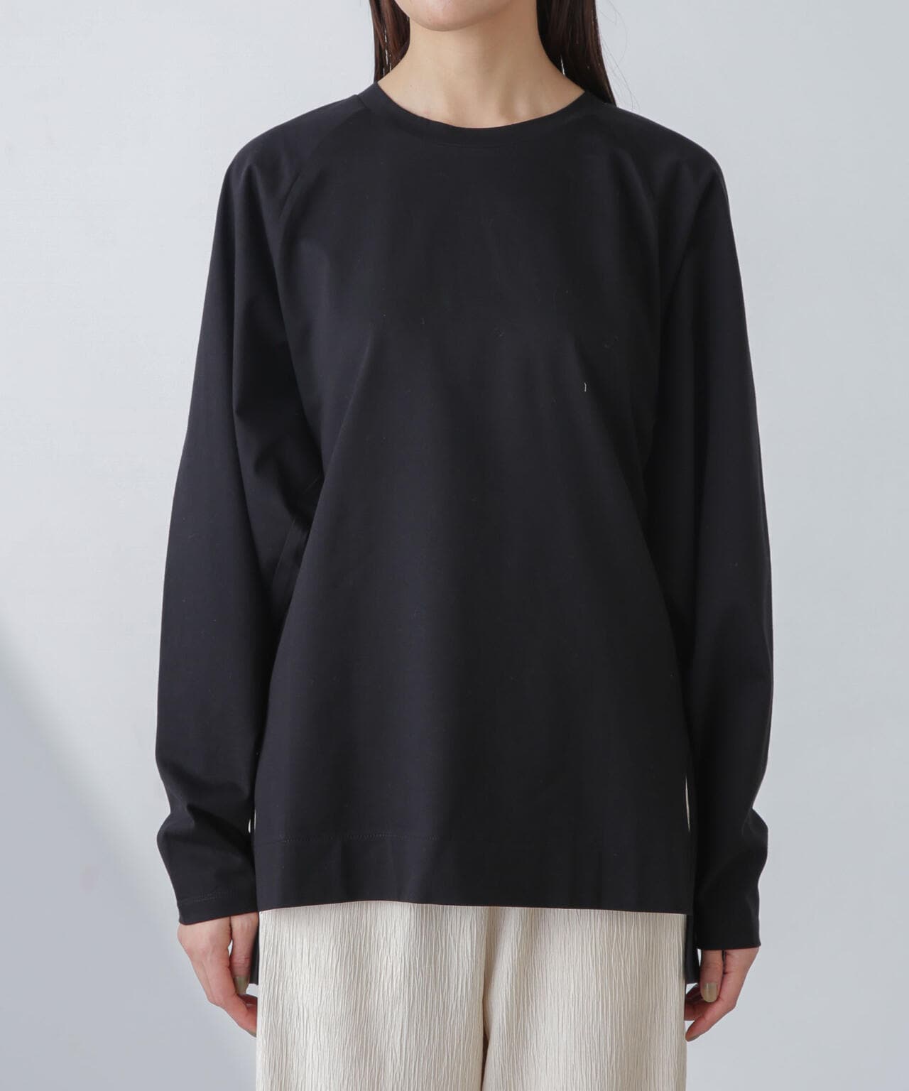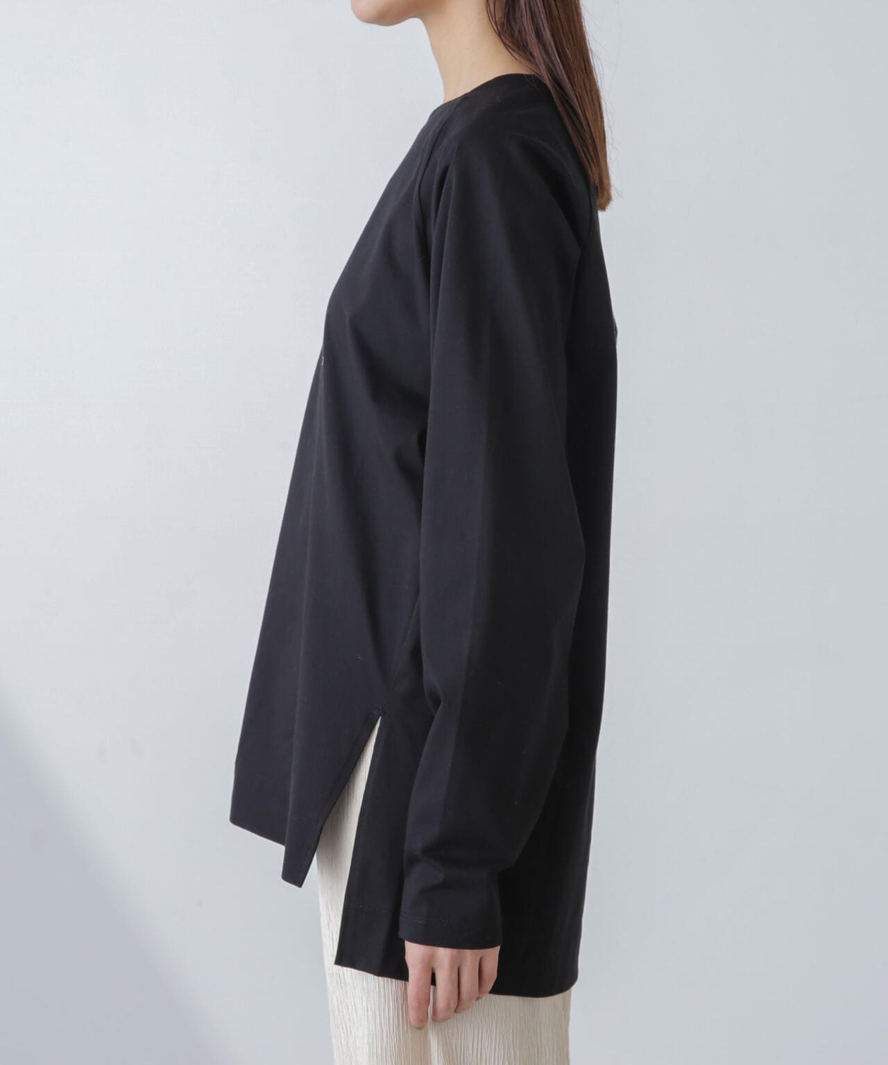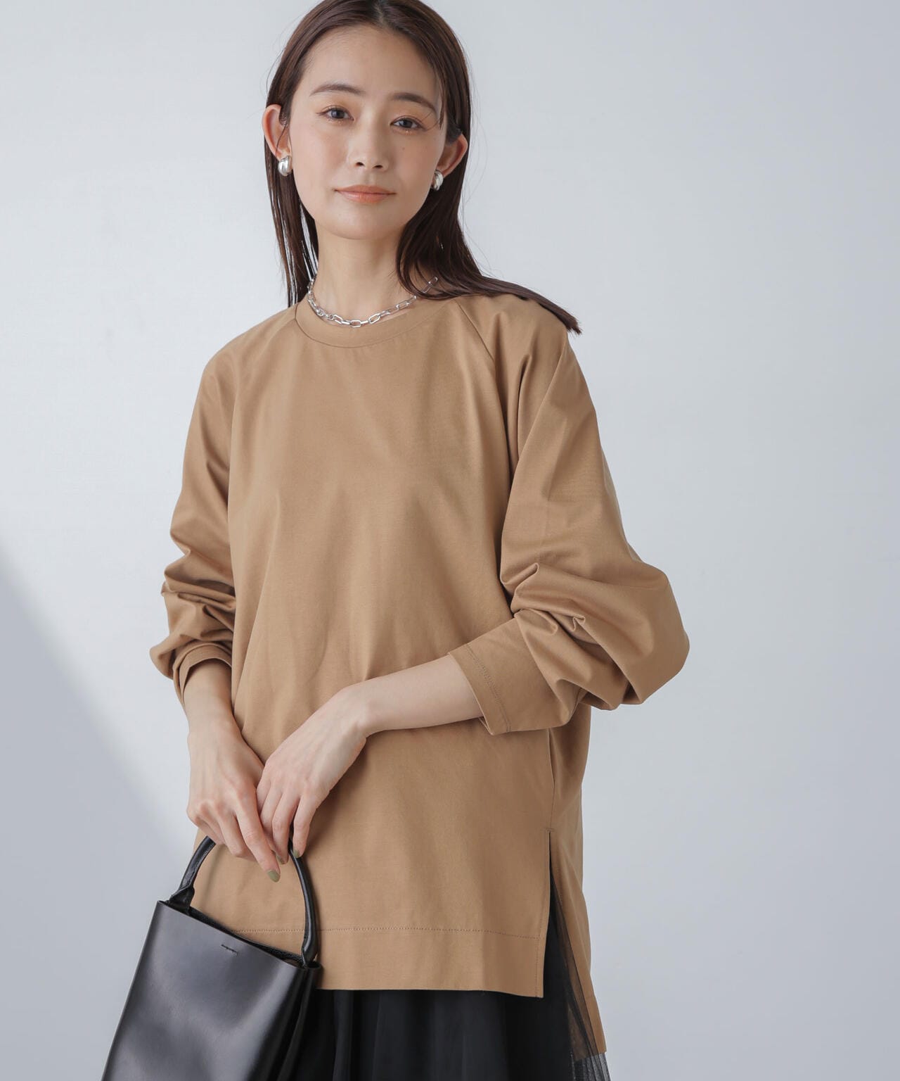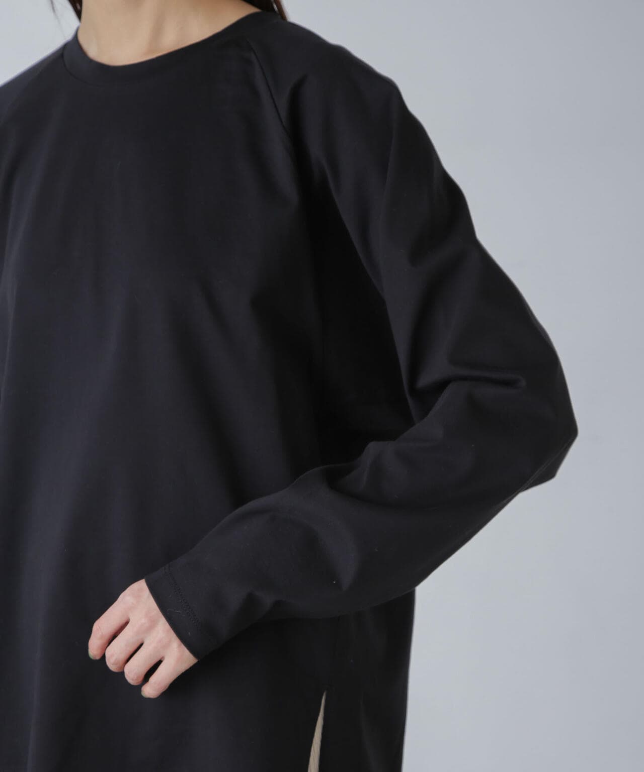 肩周りが華奢に見えるラグランスリーブのチュニックトップス。程よくルーズなシルエットながらも、縦に長さがあるのでスッキリした印象に◎。長めのサイドスリット入りで、フロントのみタックインするなど着こなしのアレンジもOK。トップスとしてはもちろん、インナーとしても着回しやすくロングシーズン活躍するひと品です。