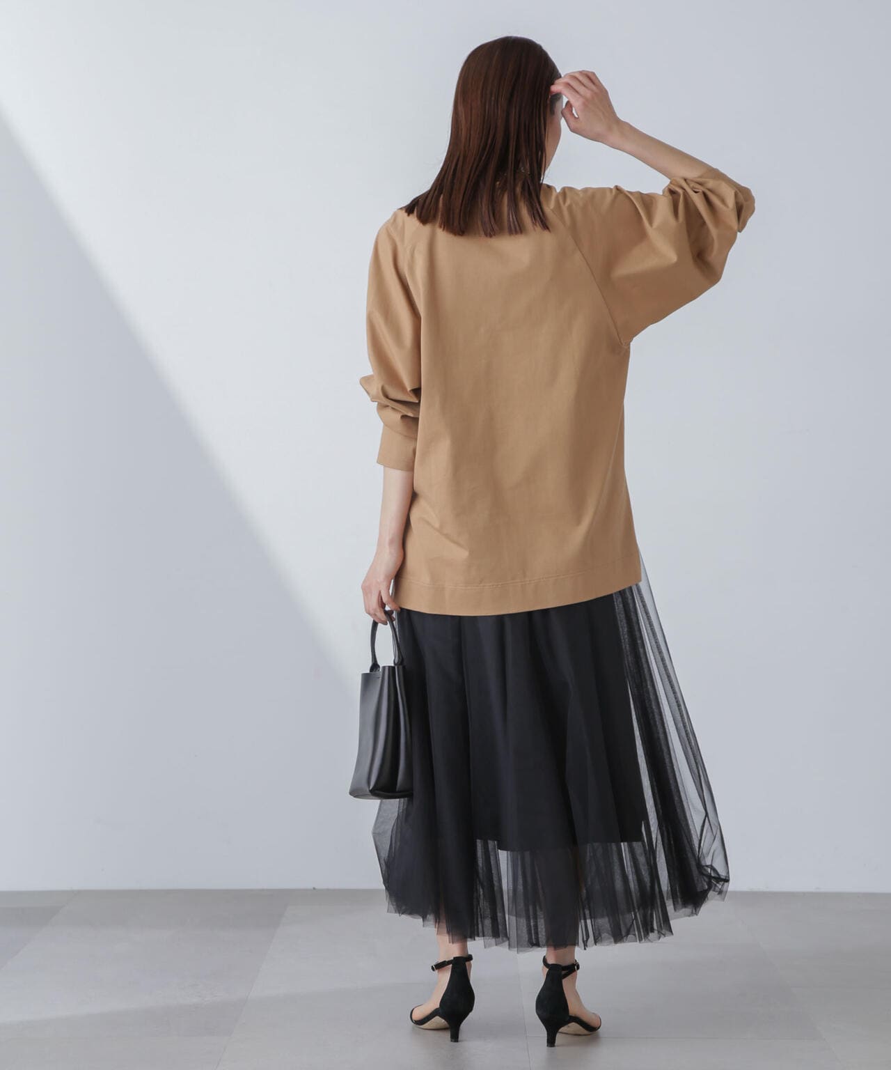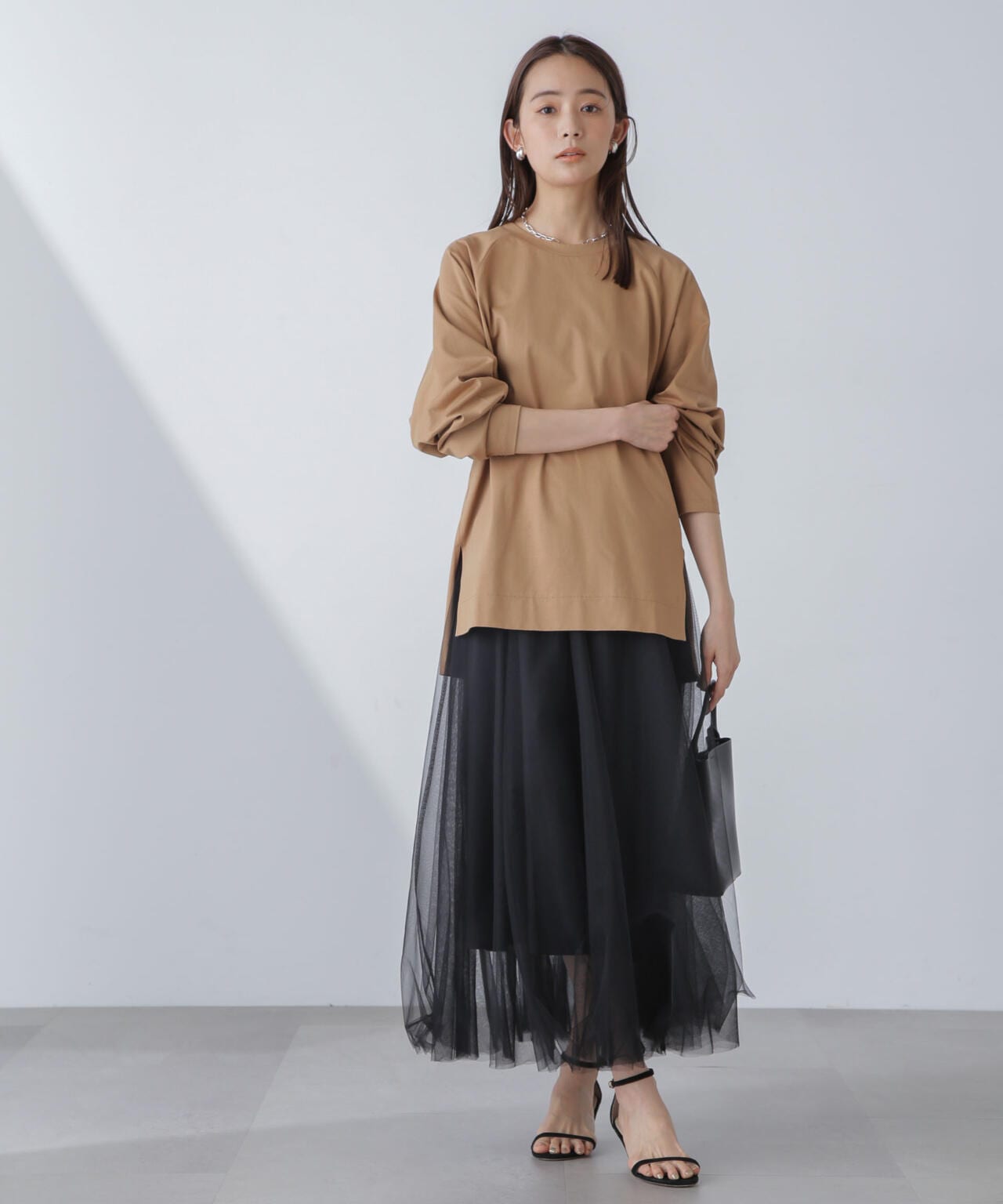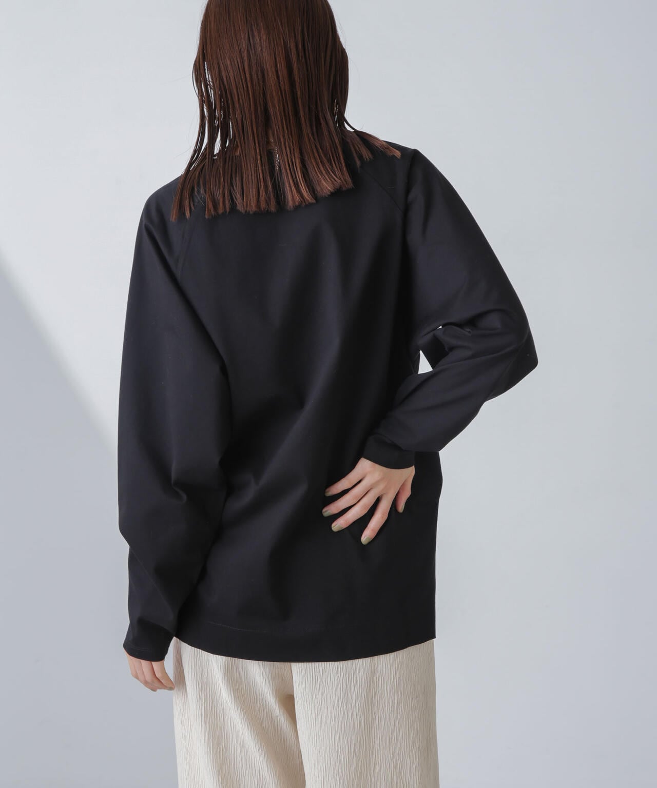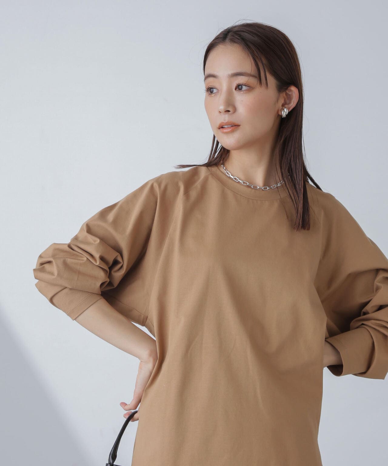 肩周りが華奢に見えるラグランスリーブのチュニックトップス。程よくルーズなシルエットながらも、縦に長さがあるのでスッキリした印象に◎。長めのサイドスリット入りで、フロントのみタックインするなど着こなしのアレンジもOK。トップスとしてはもちろん、インナーとしても着回しやすくロングシーズン活躍するひと品です。