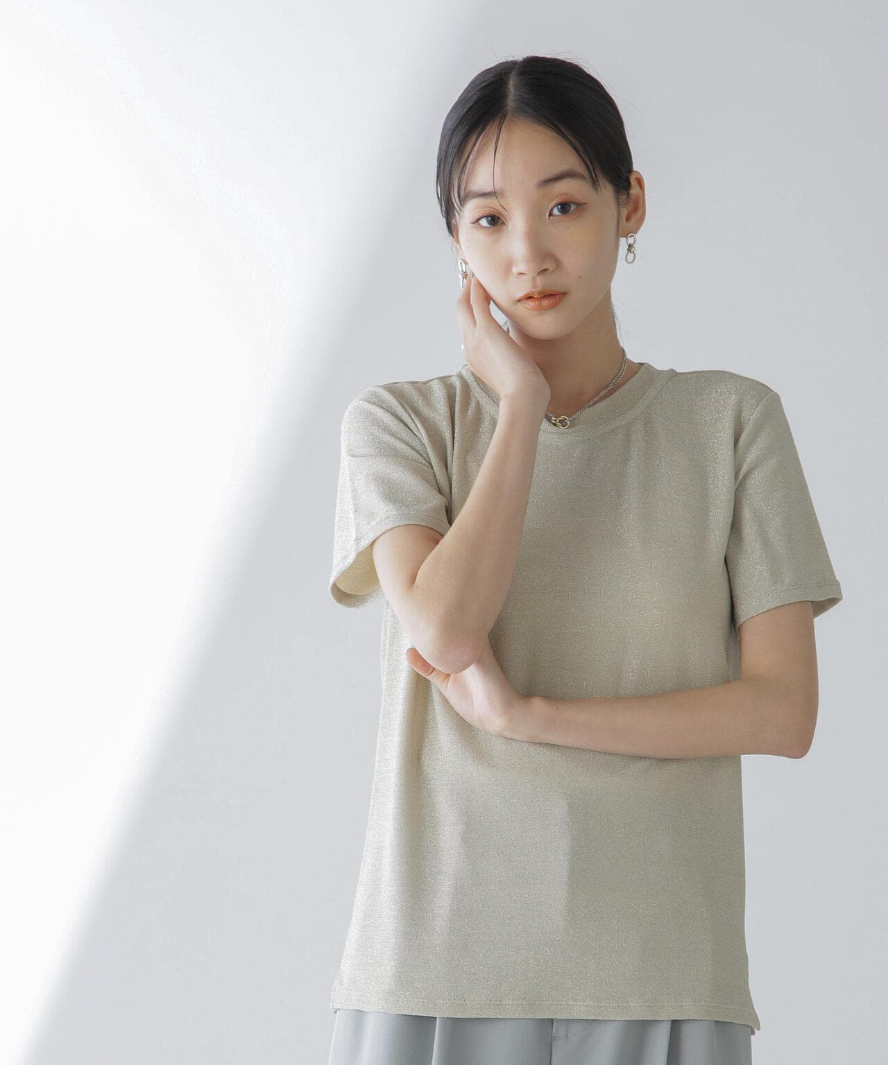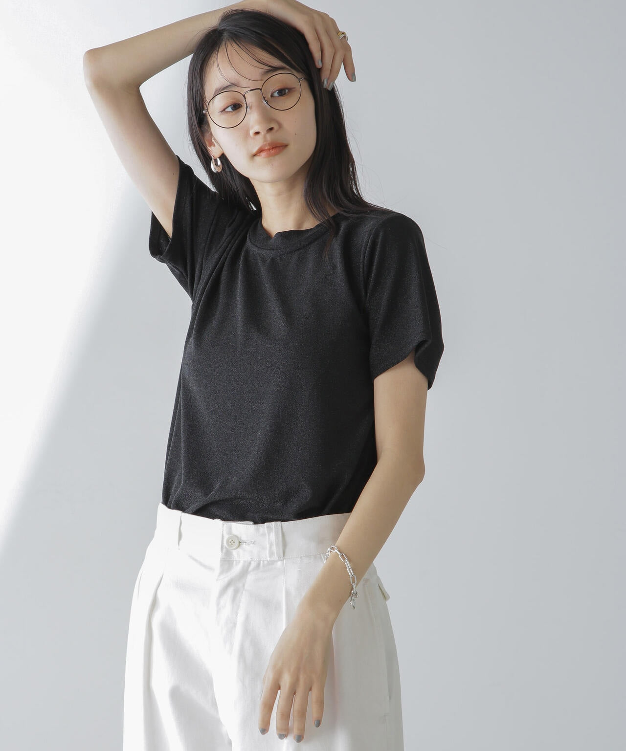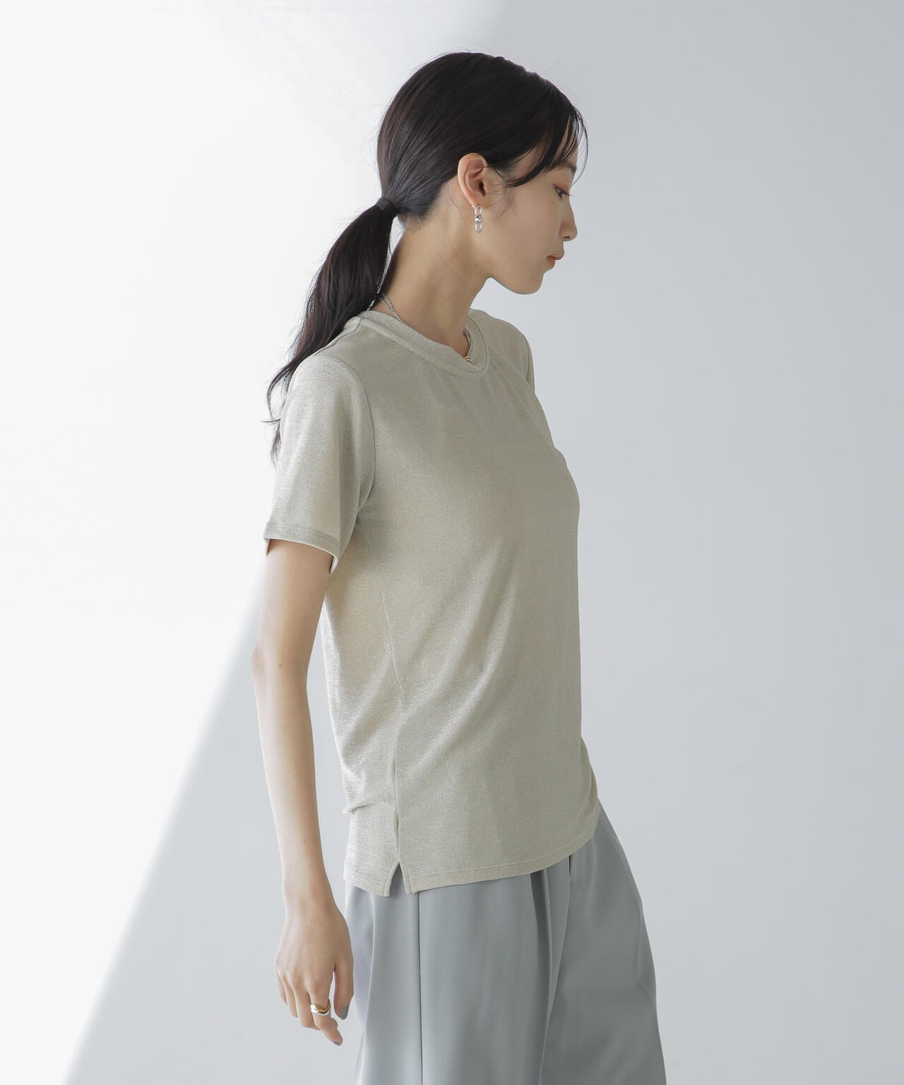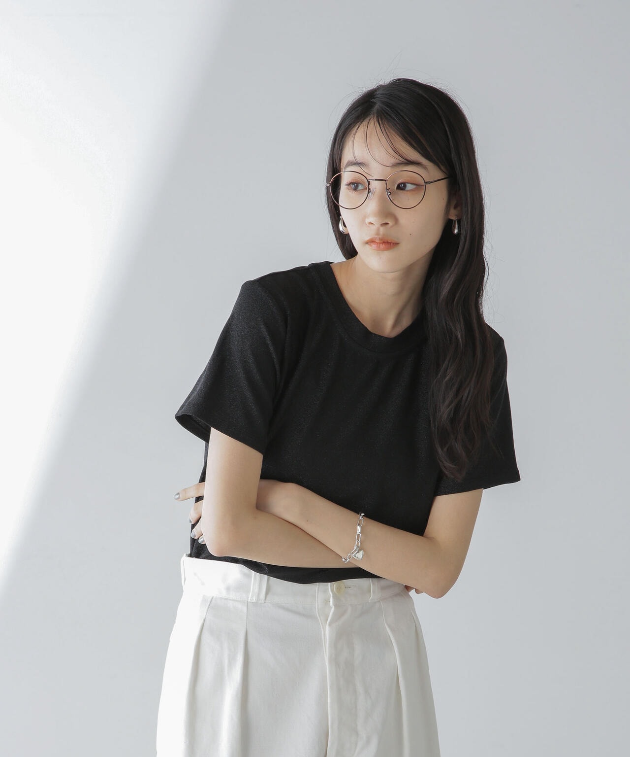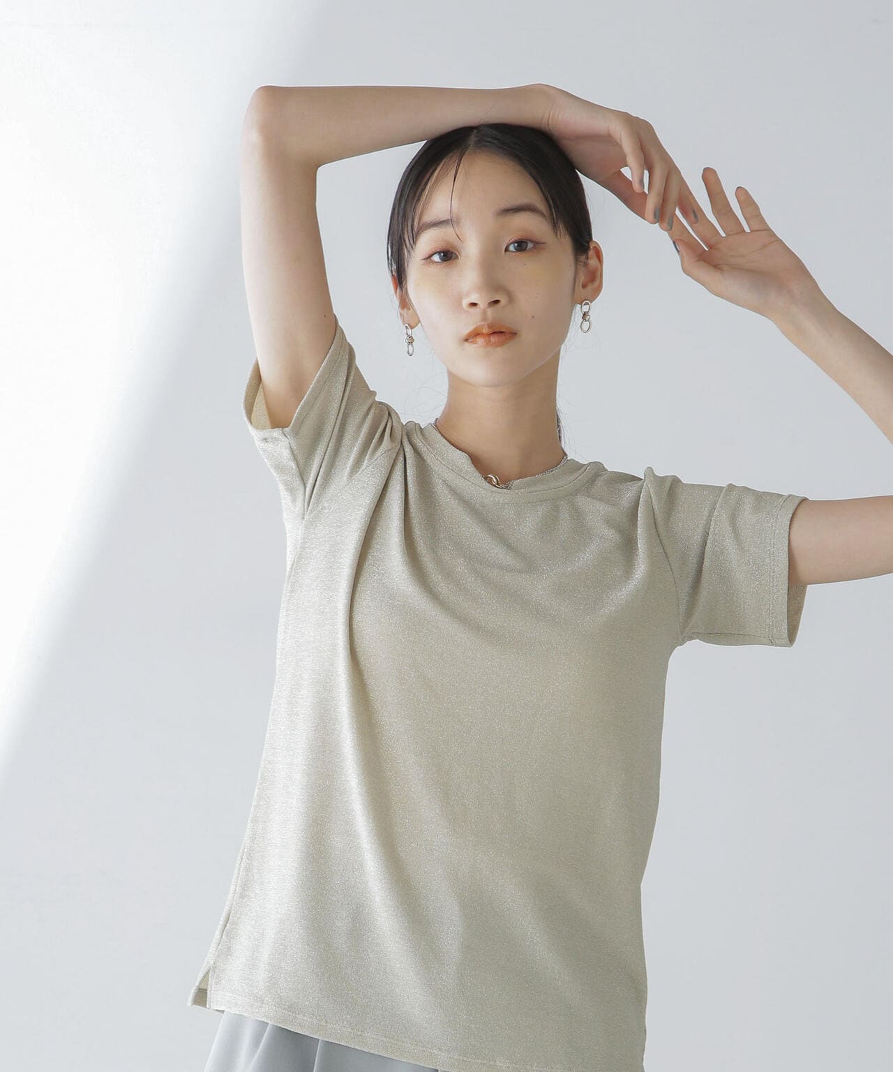 シーズンムードを盛り上げるラメ素材が映えるクルーネックTシャツ。伸縮性のある生地なので着心地が良く、デイリーコーディネートになじみやすい雰囲気がポイント◎。ジャケットやサロペットなどのインナーとしても重宝するから、シーズンレスで持っておきたいアイテムです。