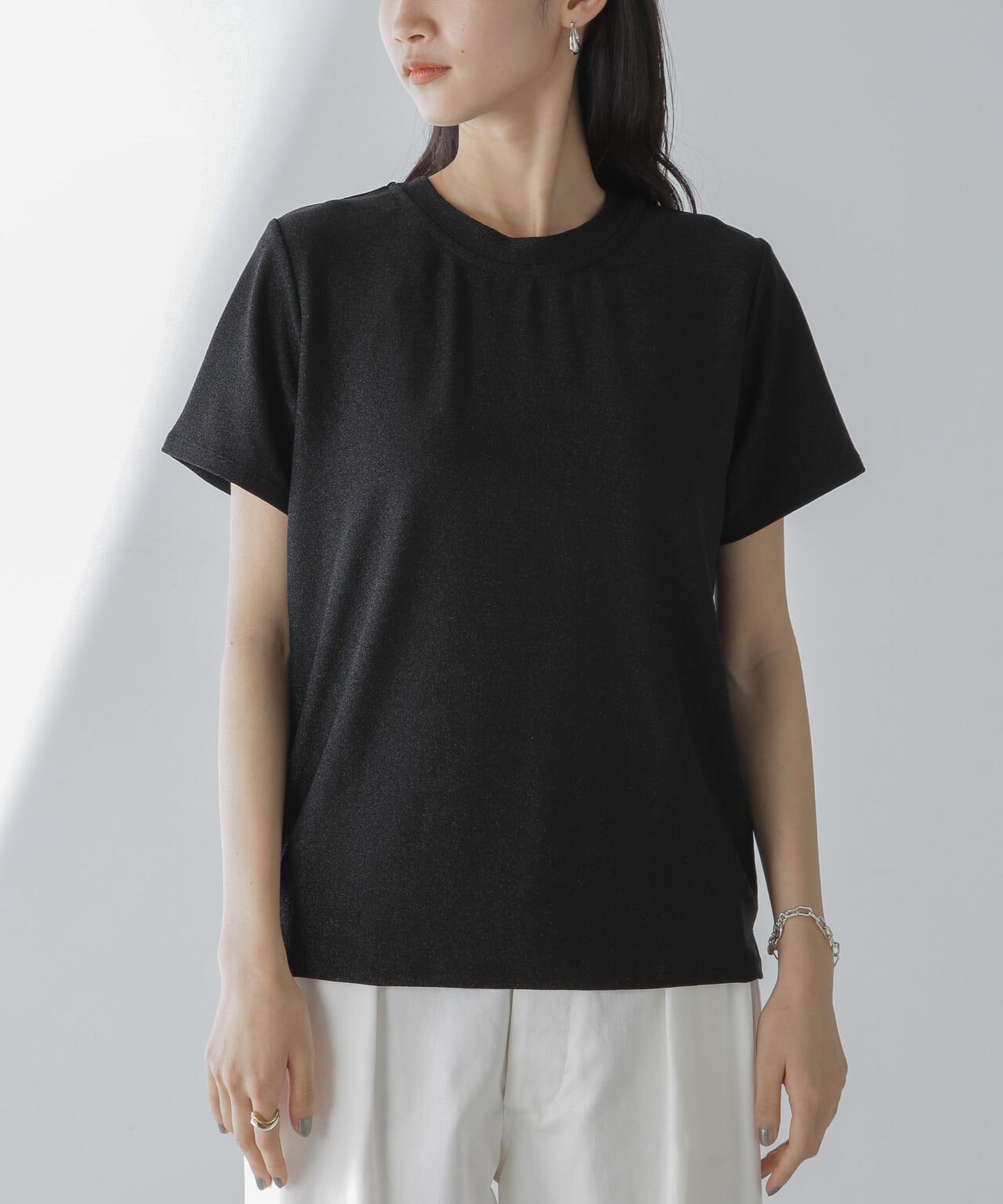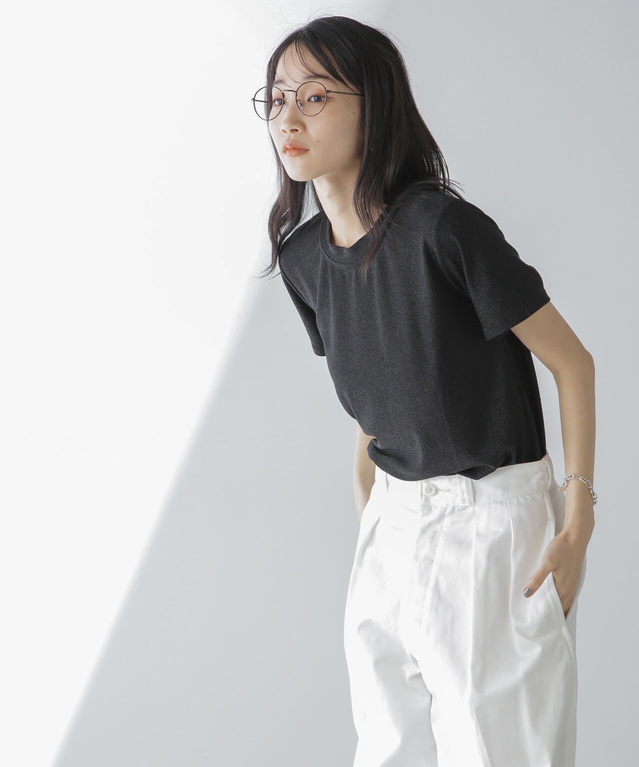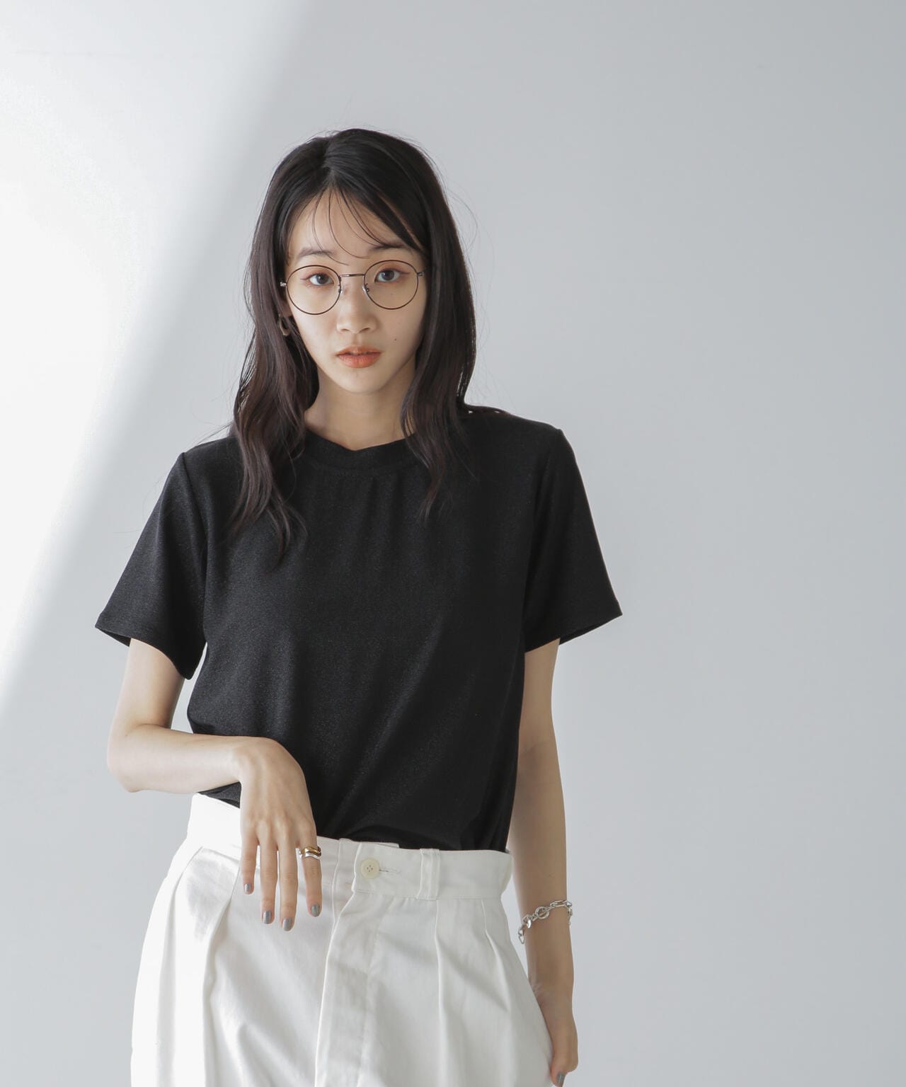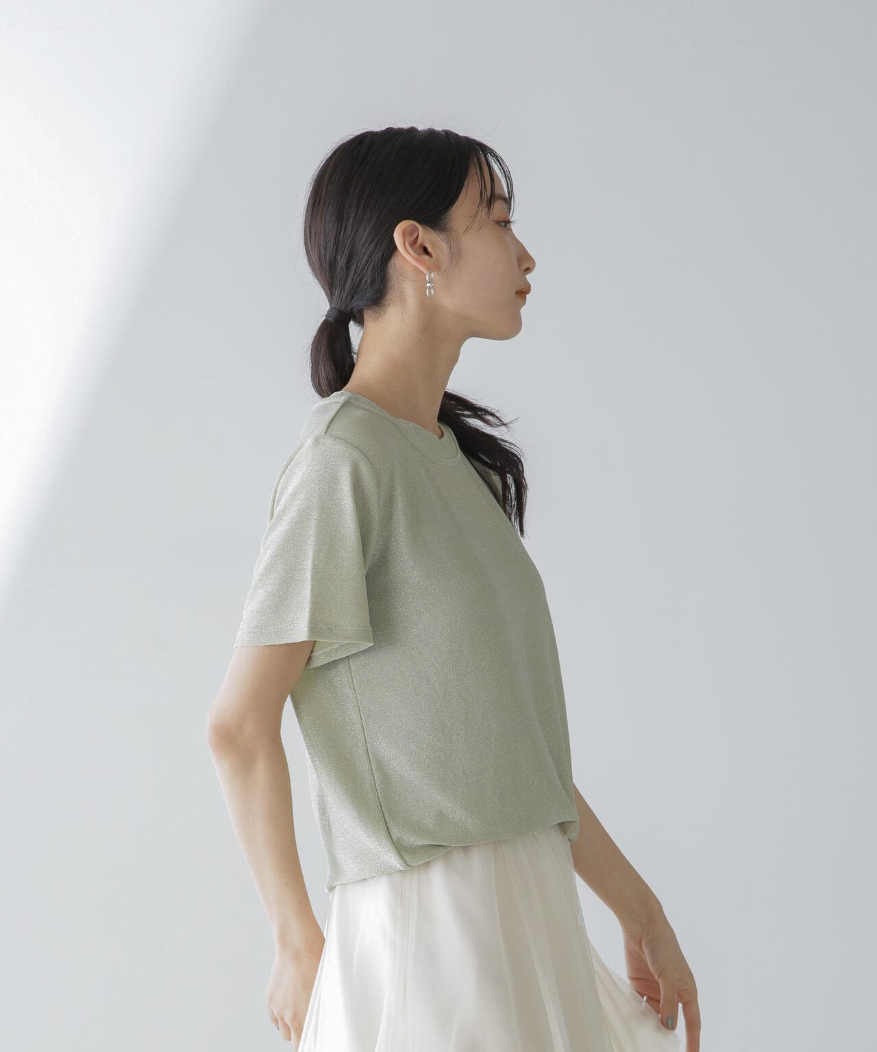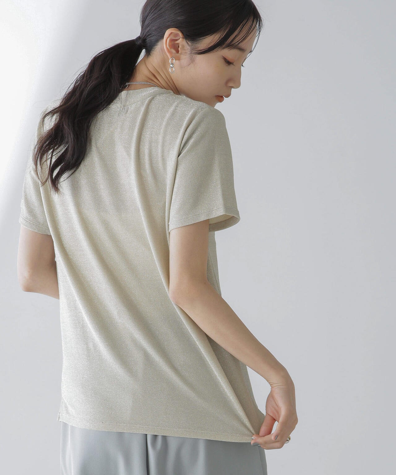 シーズンムードを盛り上げるラメ素材が映えるクルーネックTシャツ。伸縮性のある生地なので着心地が良く、デイリーコーディネートになじみやすい雰囲気がポイント◎。ジャケットやサロペットなどのインナーとしても重宝するから、シーズンレスで持っておきたいアイテムです。