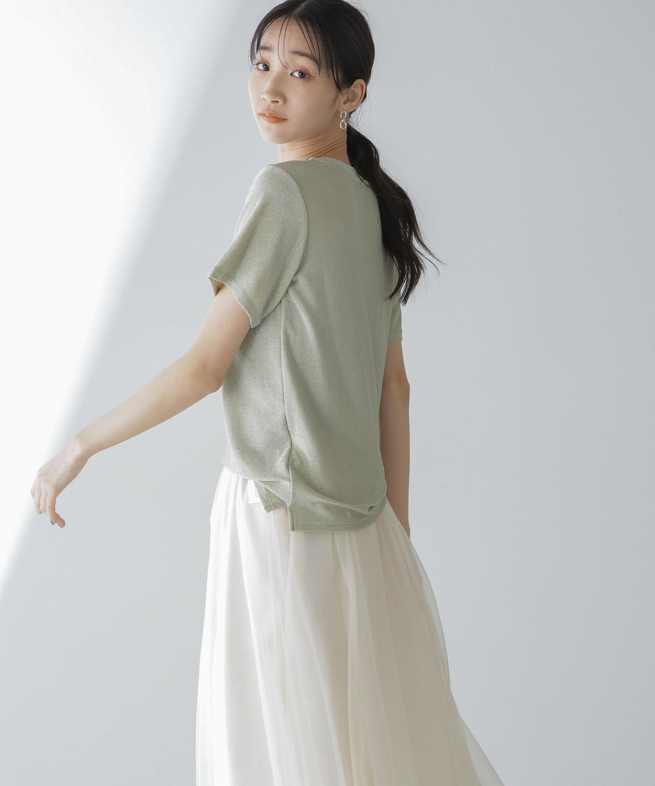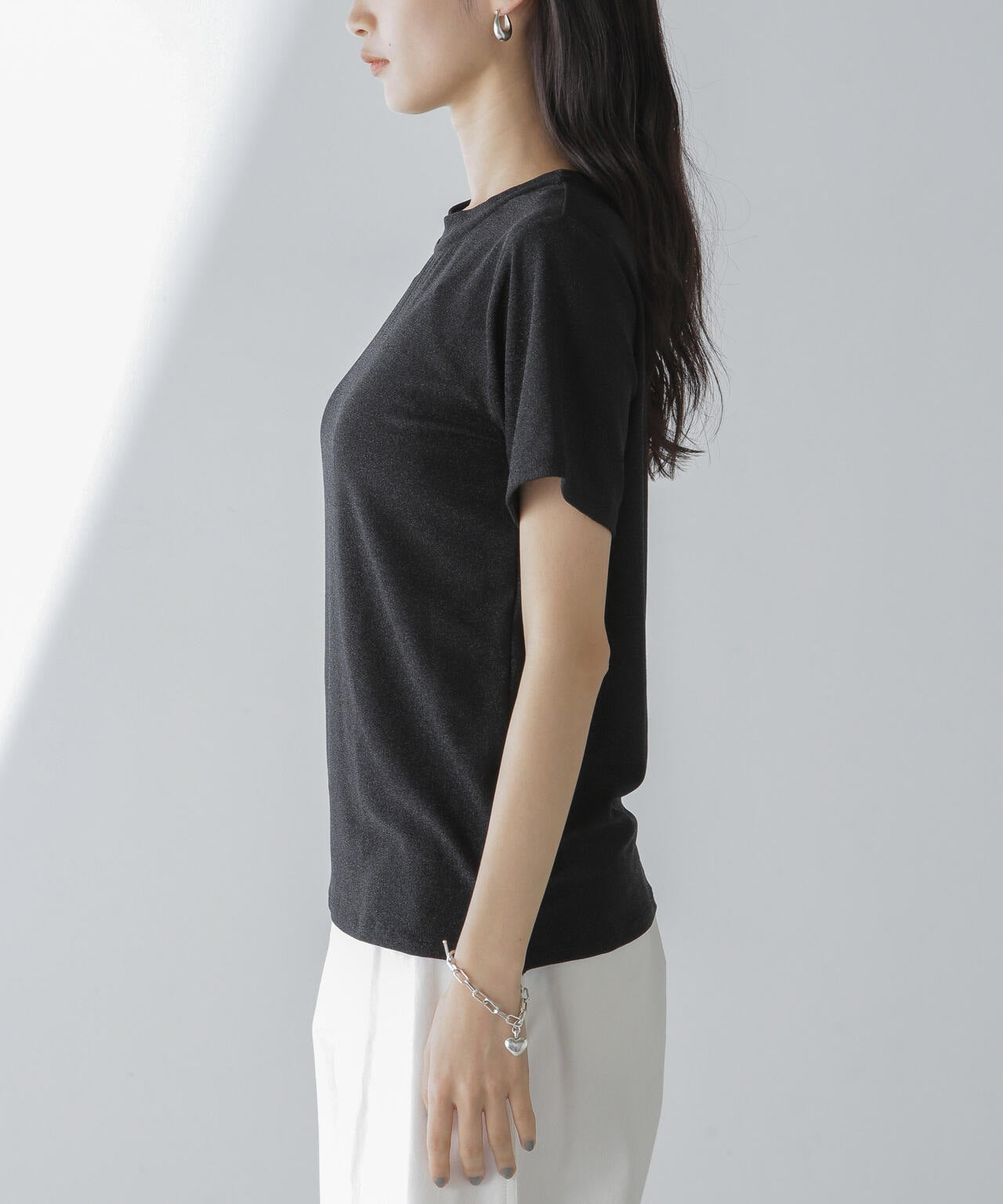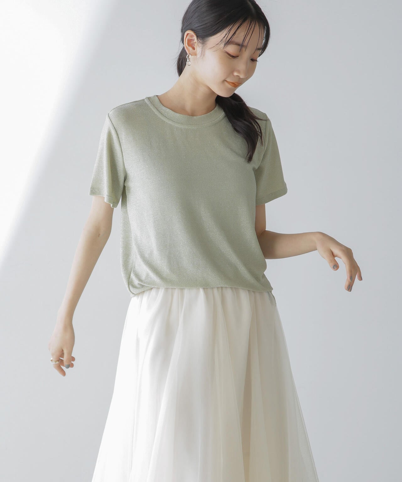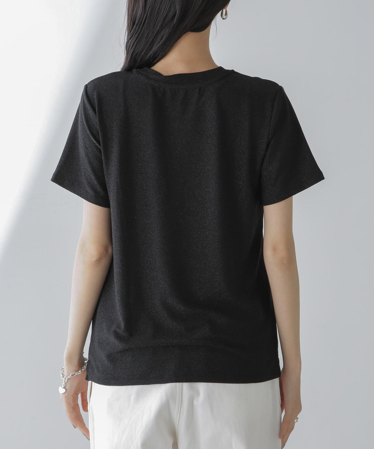 シーズンムードを盛り上げるラメ素材が映えるクルーネックTシャツ。伸縮性のある生地なので着心地が良く、デイリーコーディネートになじみやすい雰囲気がポイント◎。ジャケットやサロペットなどのインナーとしても重宝するから、シーズンレスで持っておきたいアイテムです。