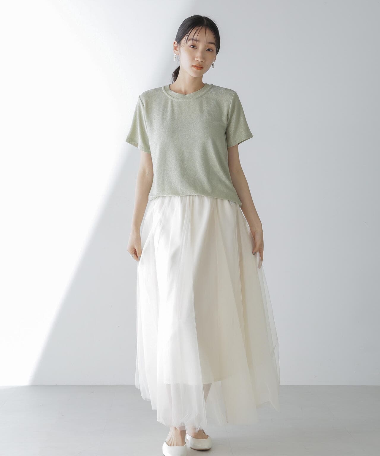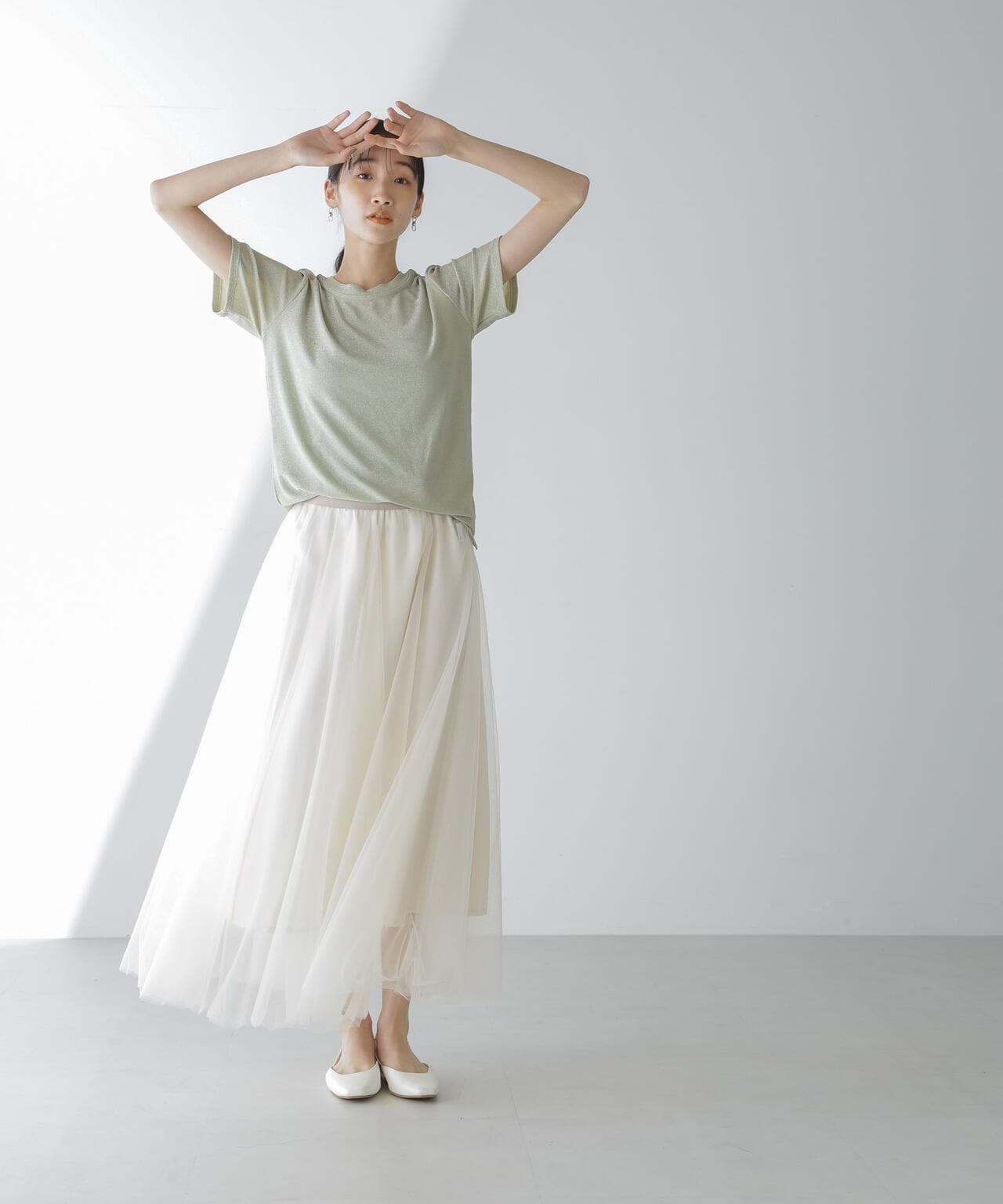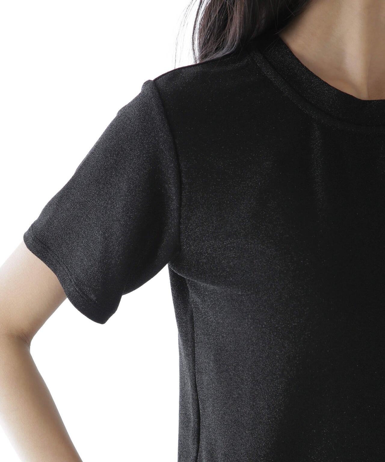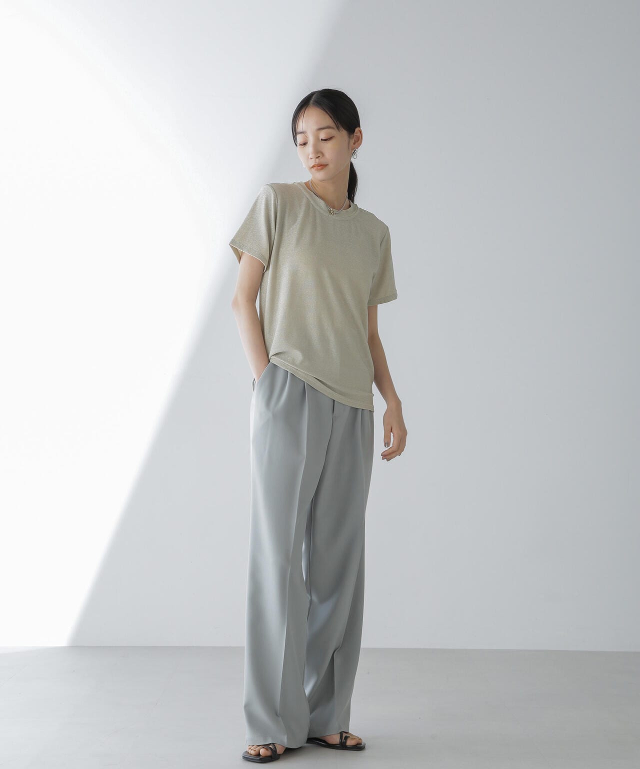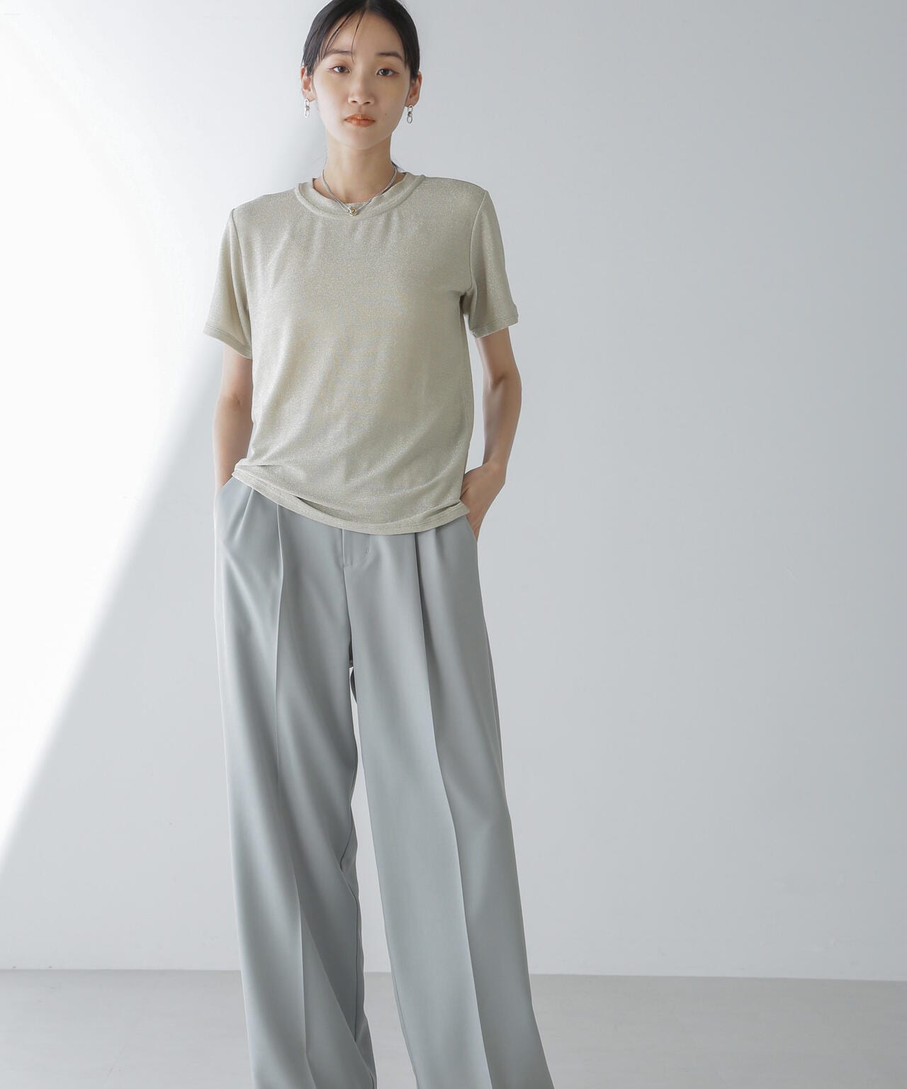 シーズンムードを盛り上げるラメ素材が映えるクルーネックTシャツ。伸縮性のある生地なので着心地が良く、デイリーコーディネートになじみやすい雰囲気がポイント◎。ジャケットやサロペットなどのインナーとしても重宝するから、シーズンレスで持っておきたいアイテムです。