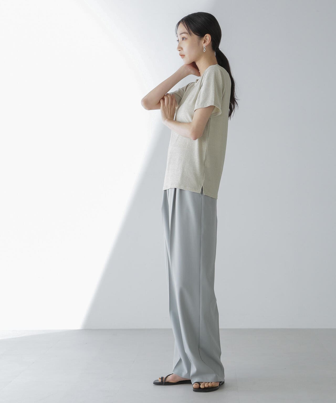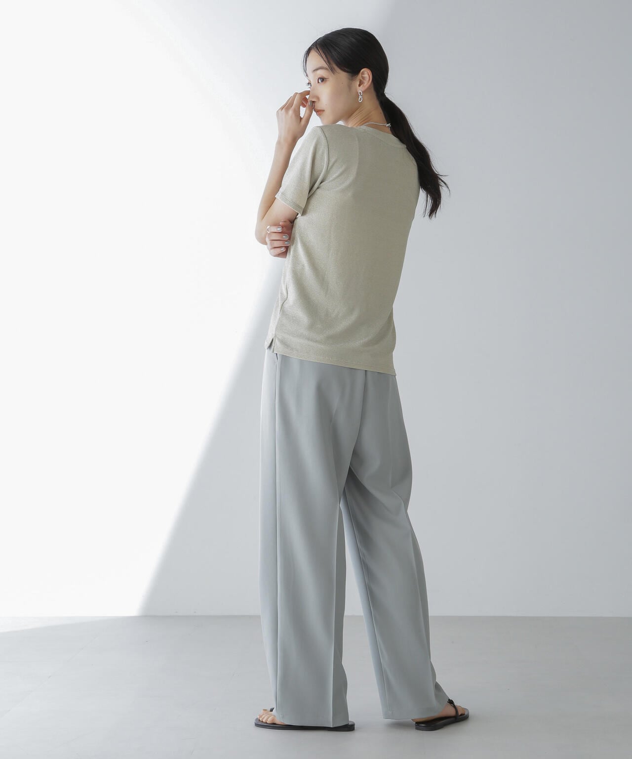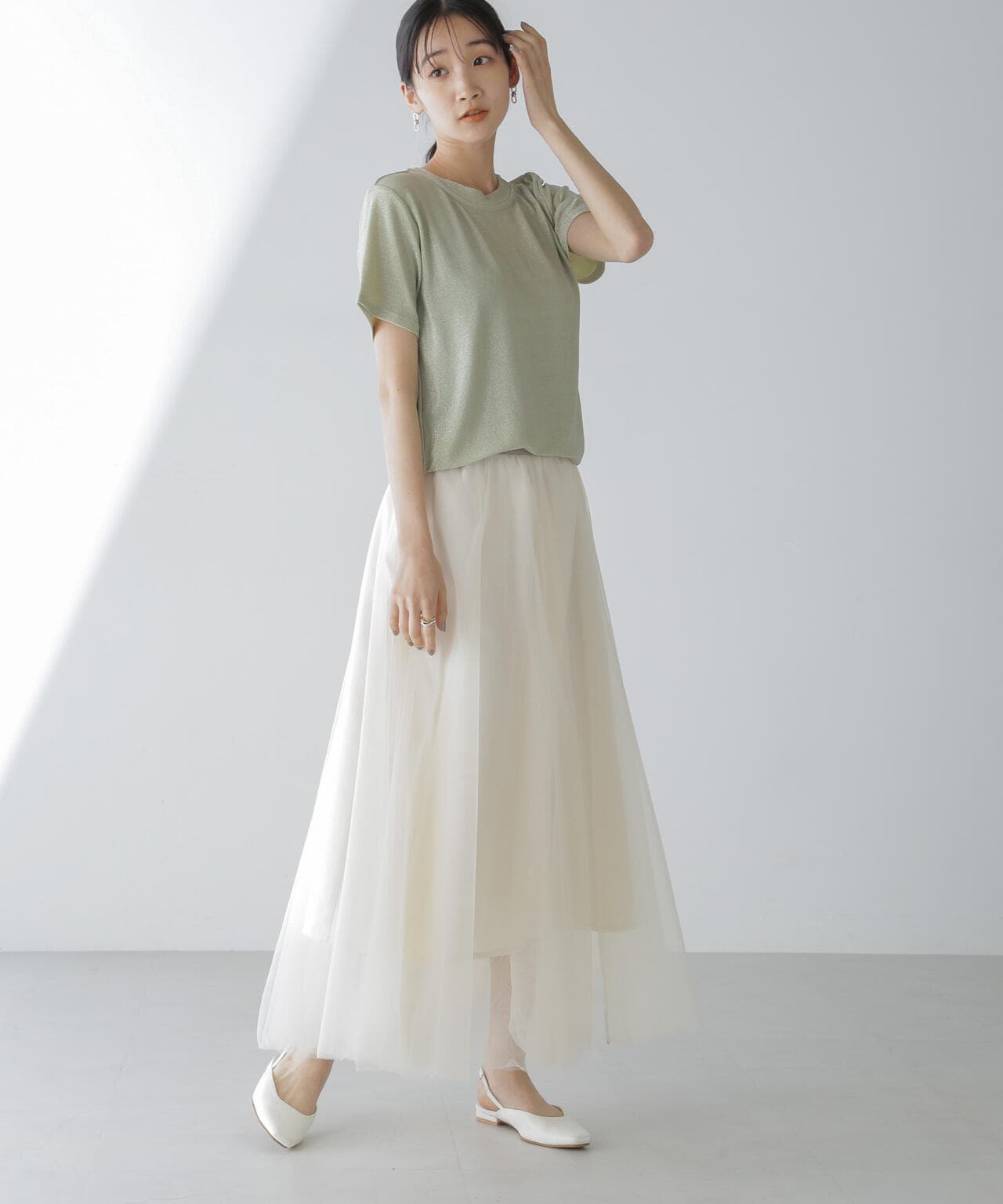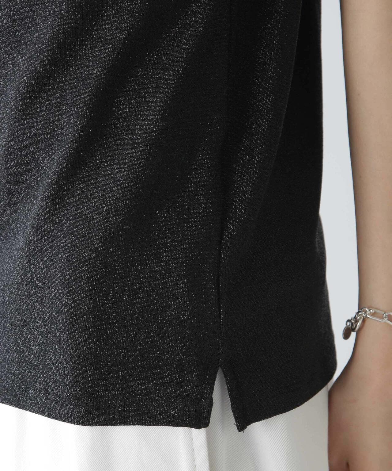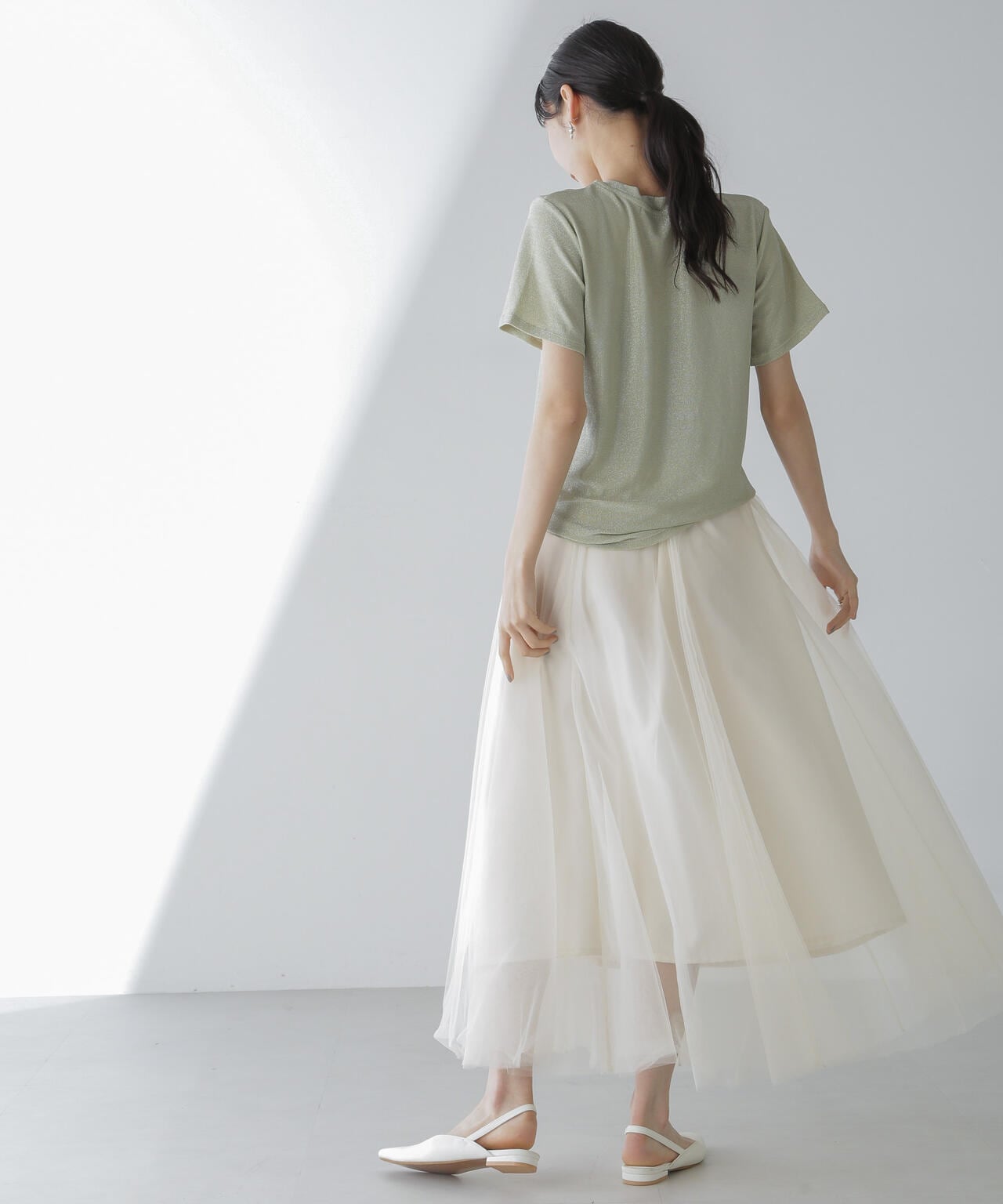 シーズンムードを盛り上げるラメ素材が映えるクルーネックTシャツ。伸縮性のある生地なので着心地が良く、デイリーコーディネートになじみやすい雰囲気がポイント◎。ジャケットやサロペットなどのインナーとしても重宝するから、シーズンレスで持っておきたいアイテムです。