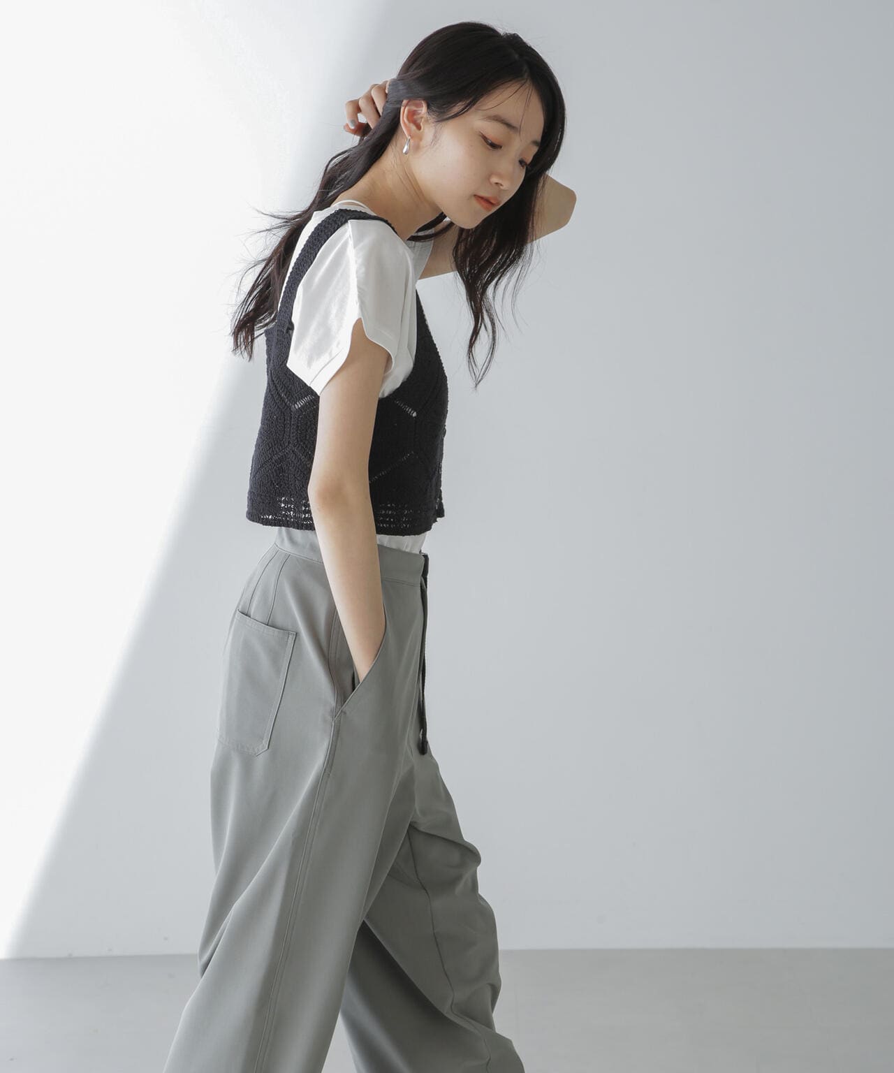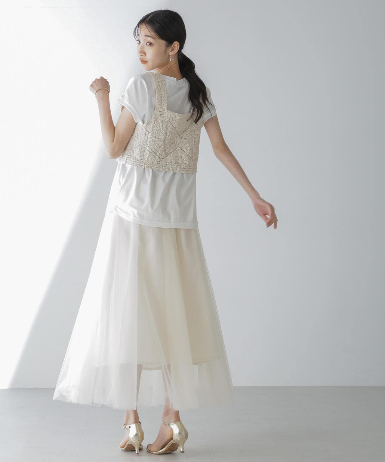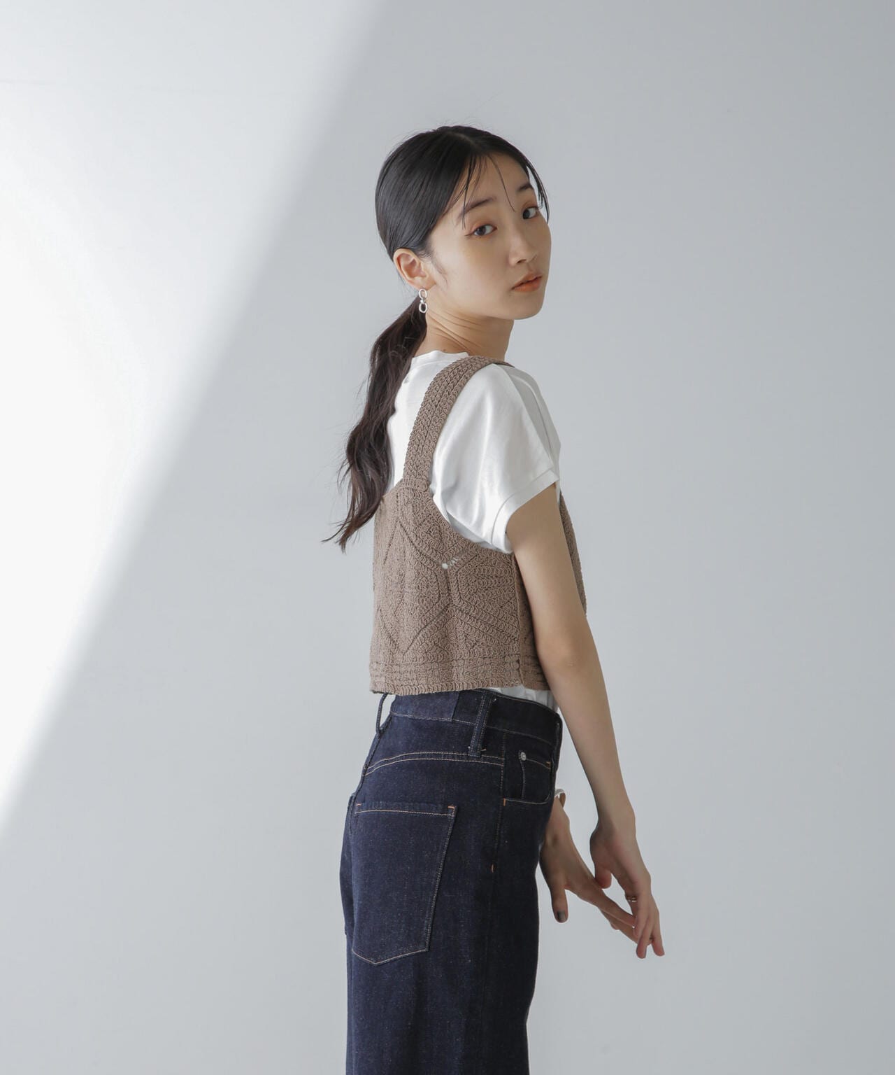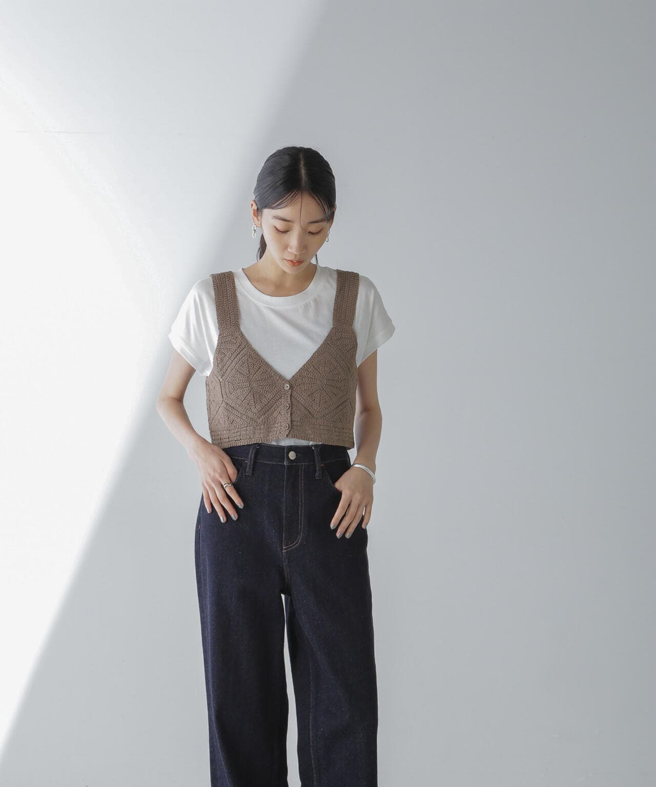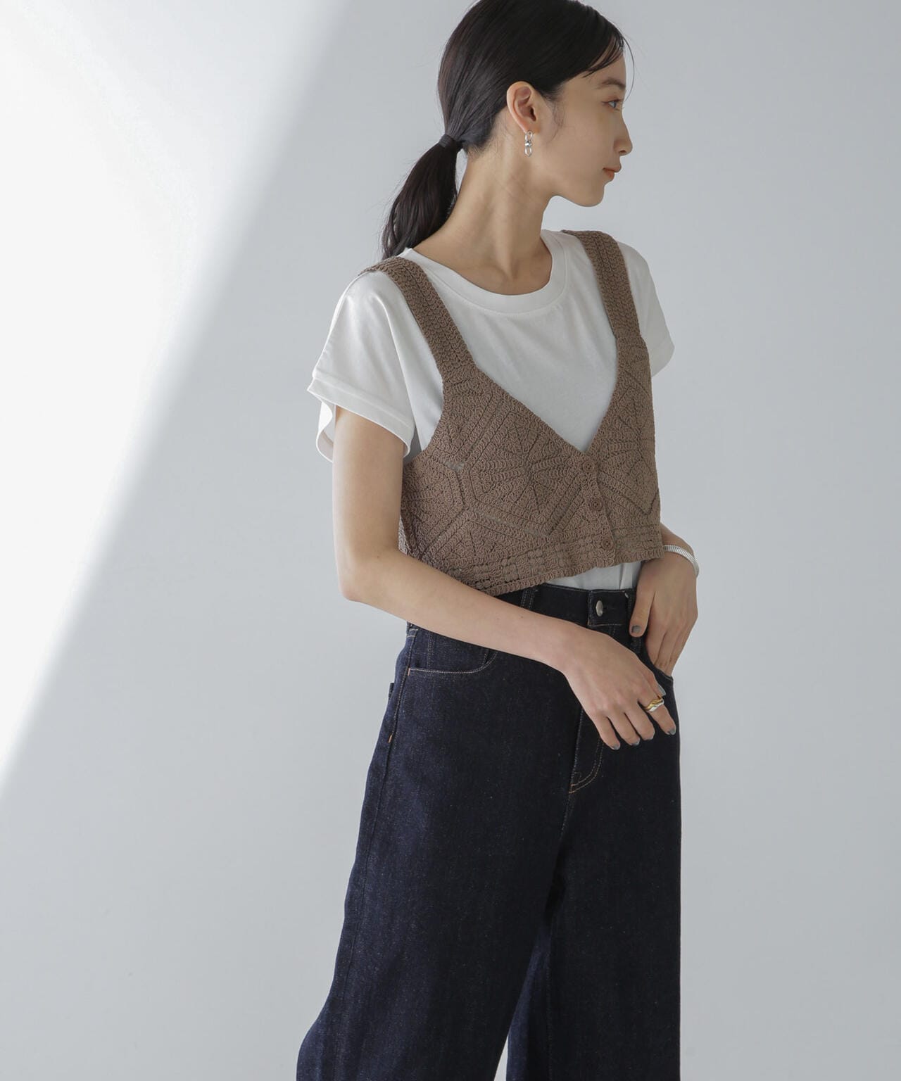 シンプルなクルーネックデザインのカットソーは汎用性が高く、レース編みのビスチェは取り入れるだけでトレンドライクなコーディネートに。