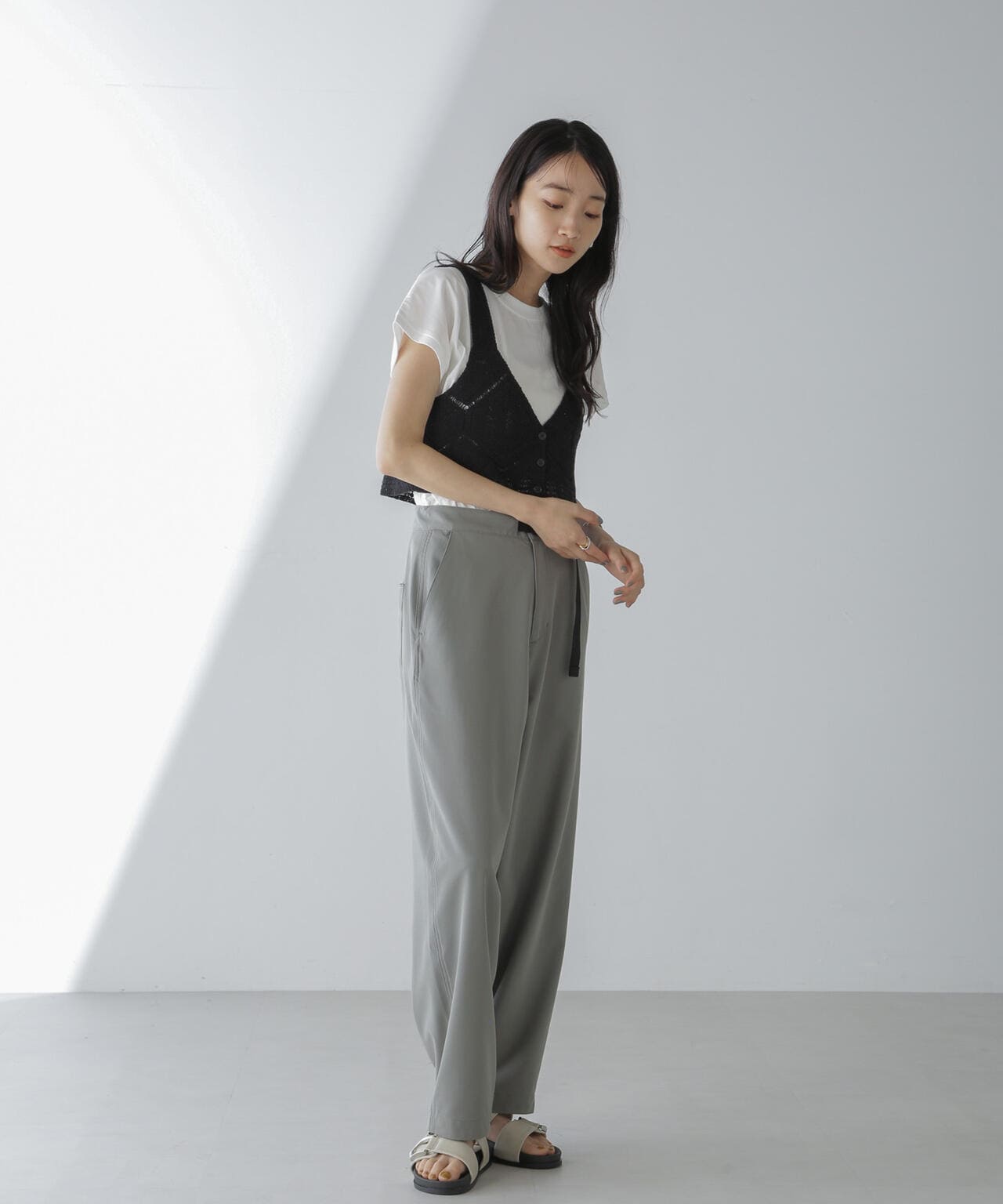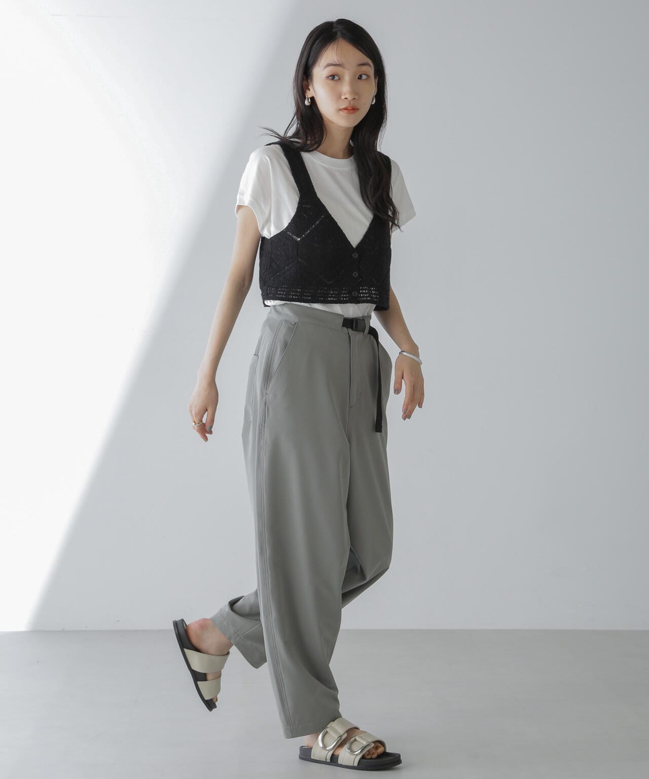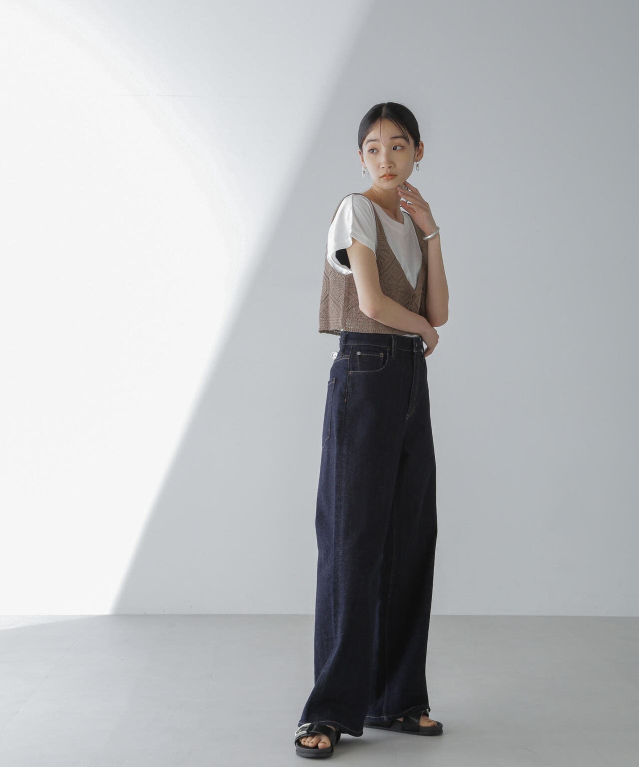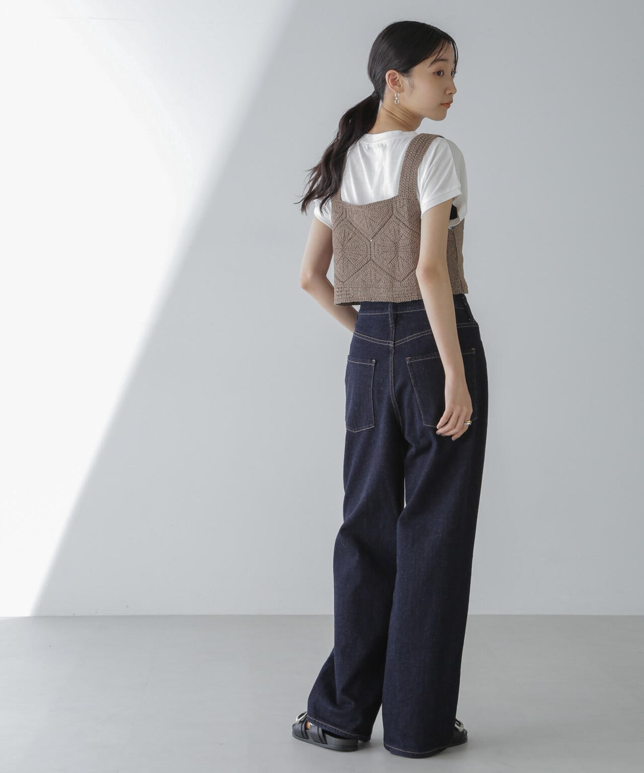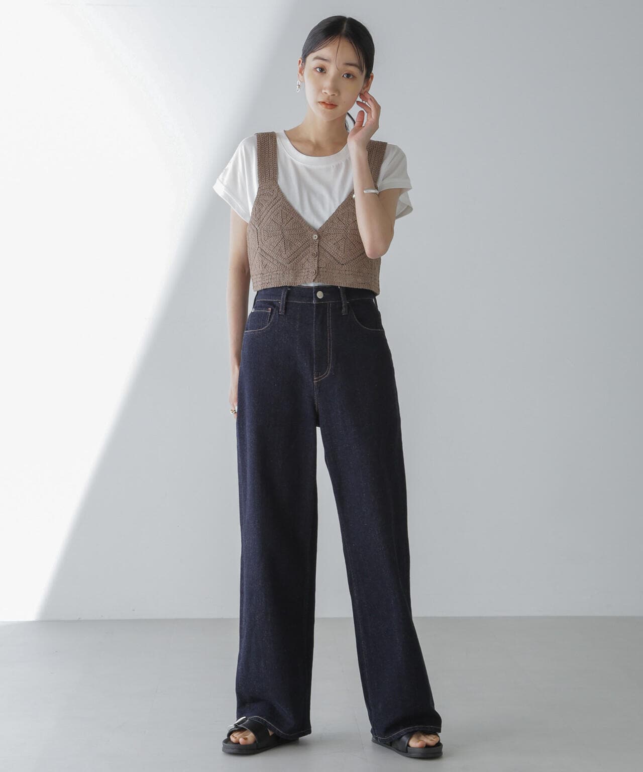 シンプルなクルーネックデザインのカットソーは汎用性が高く、レース編みのビスチェは取り入れるだけでトレンドライクなコーディネートに。