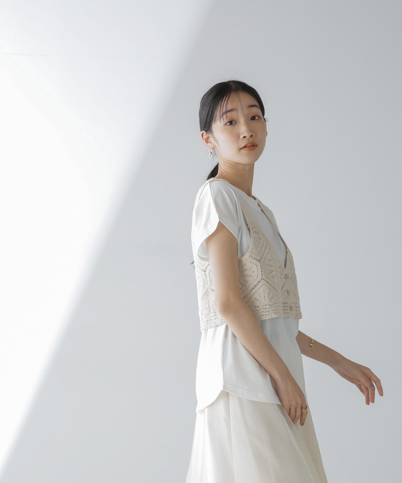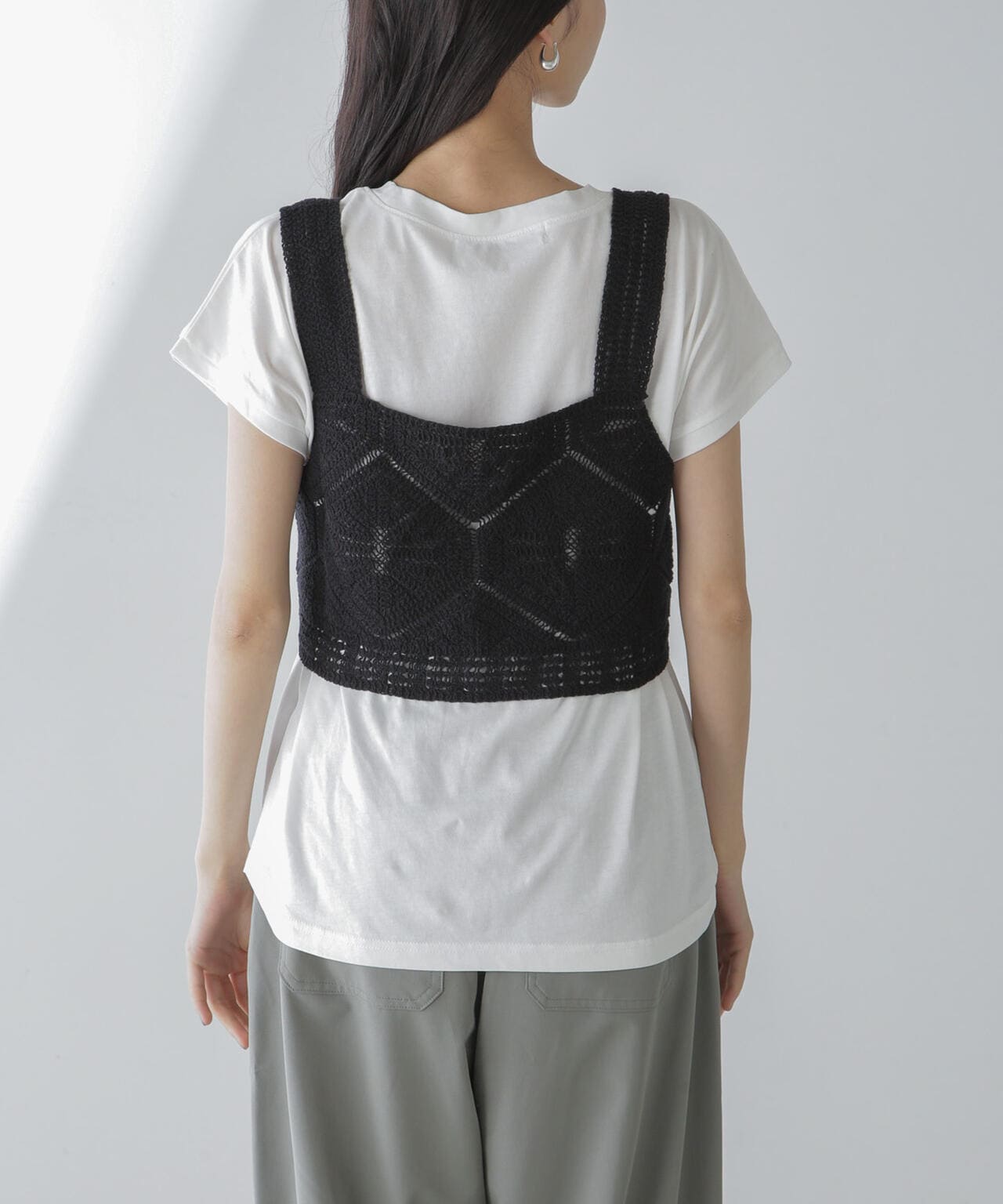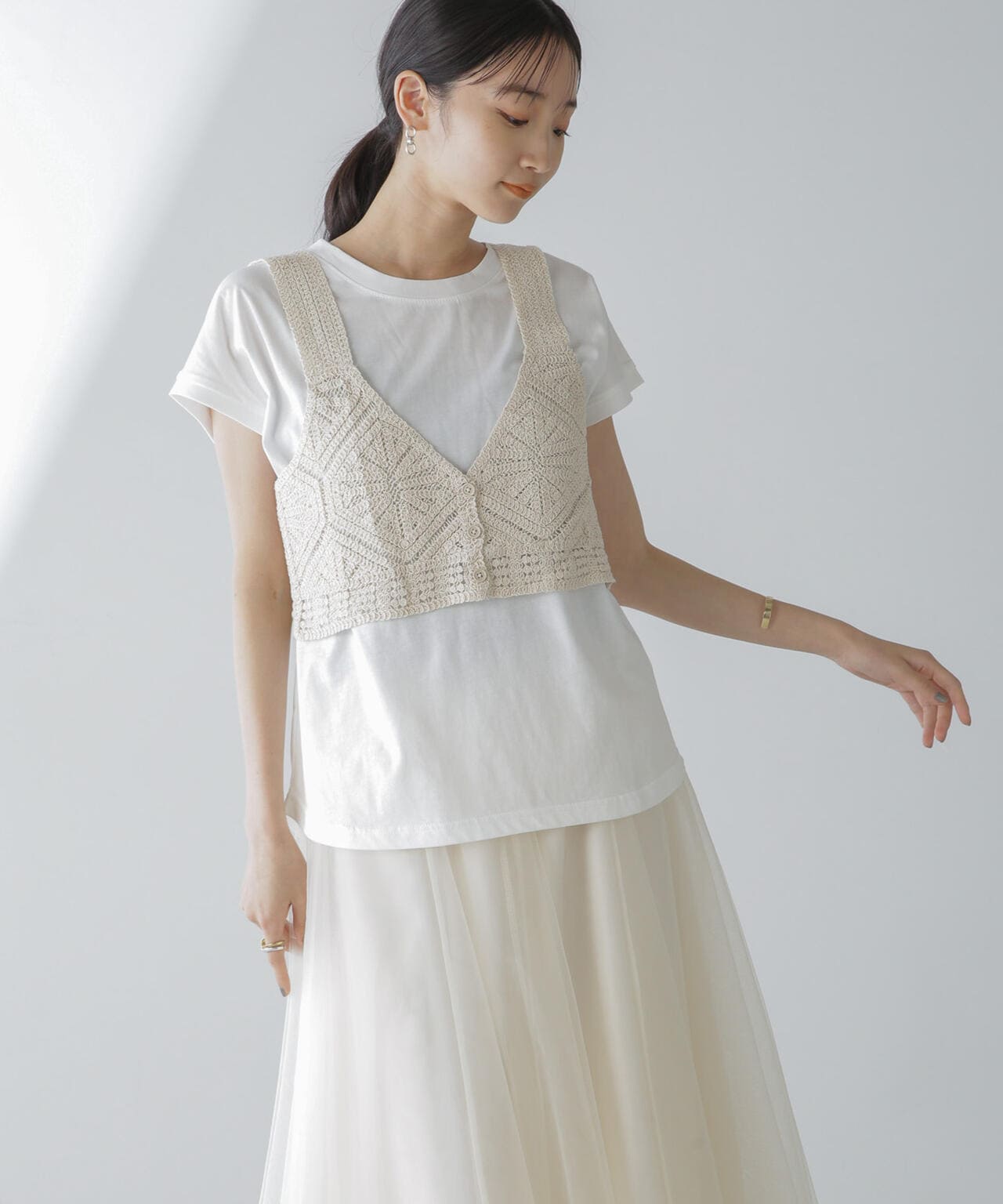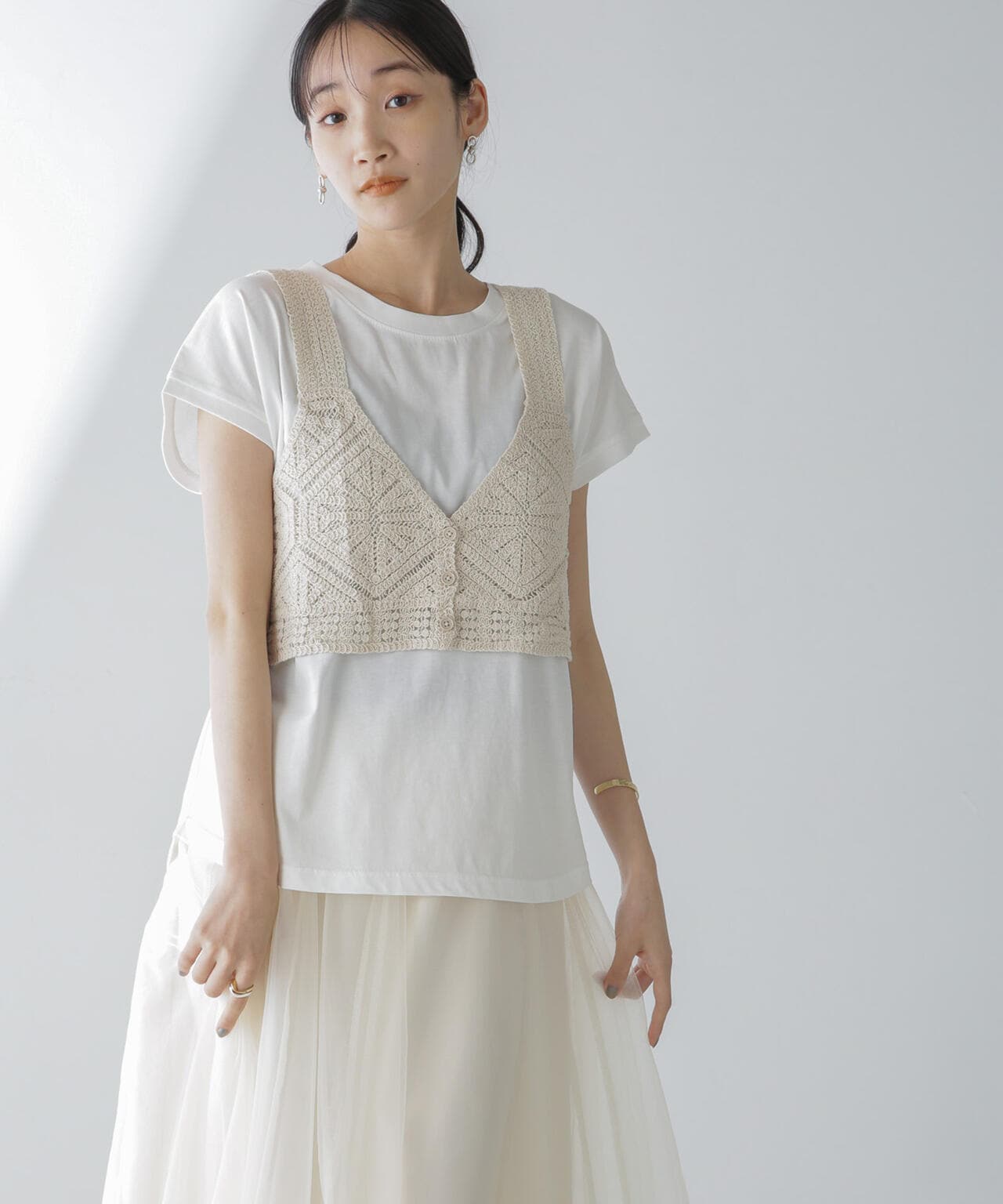 簡単にこなれたレイヤードスタイルが完成する、レース編みのビスチェとカットソーのセットアイテム。