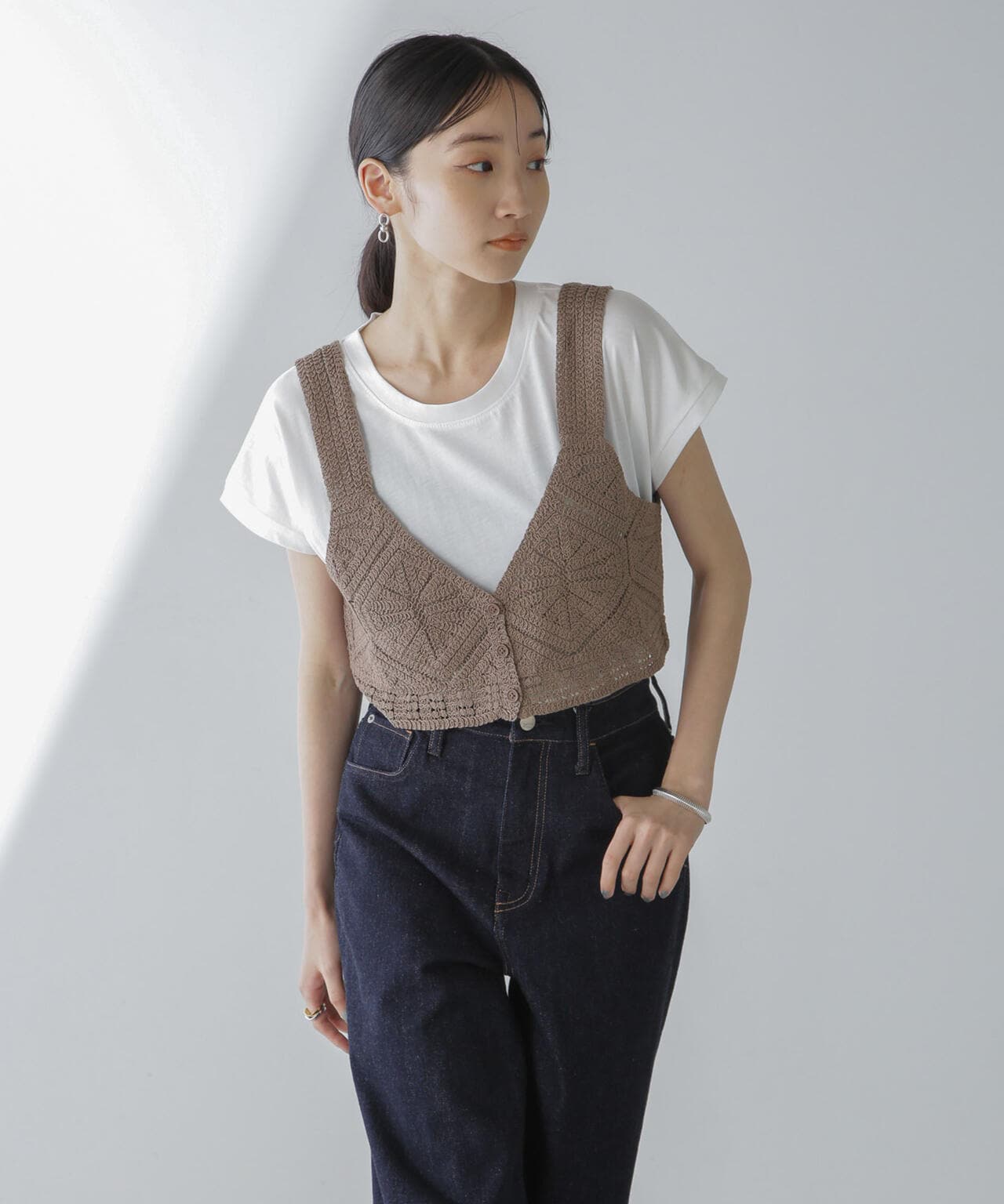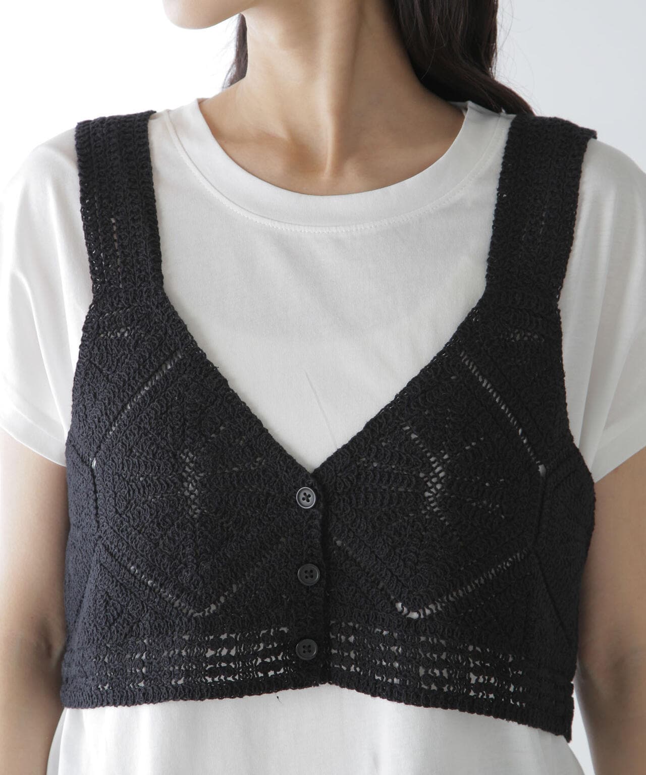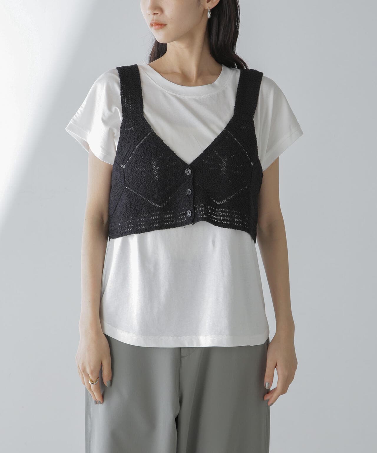 簡単にこなれたレイヤードスタイルが完成する、レース編みのビスチェとカットソーのセットアイテム。