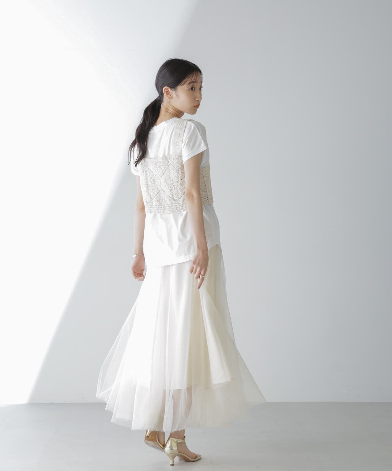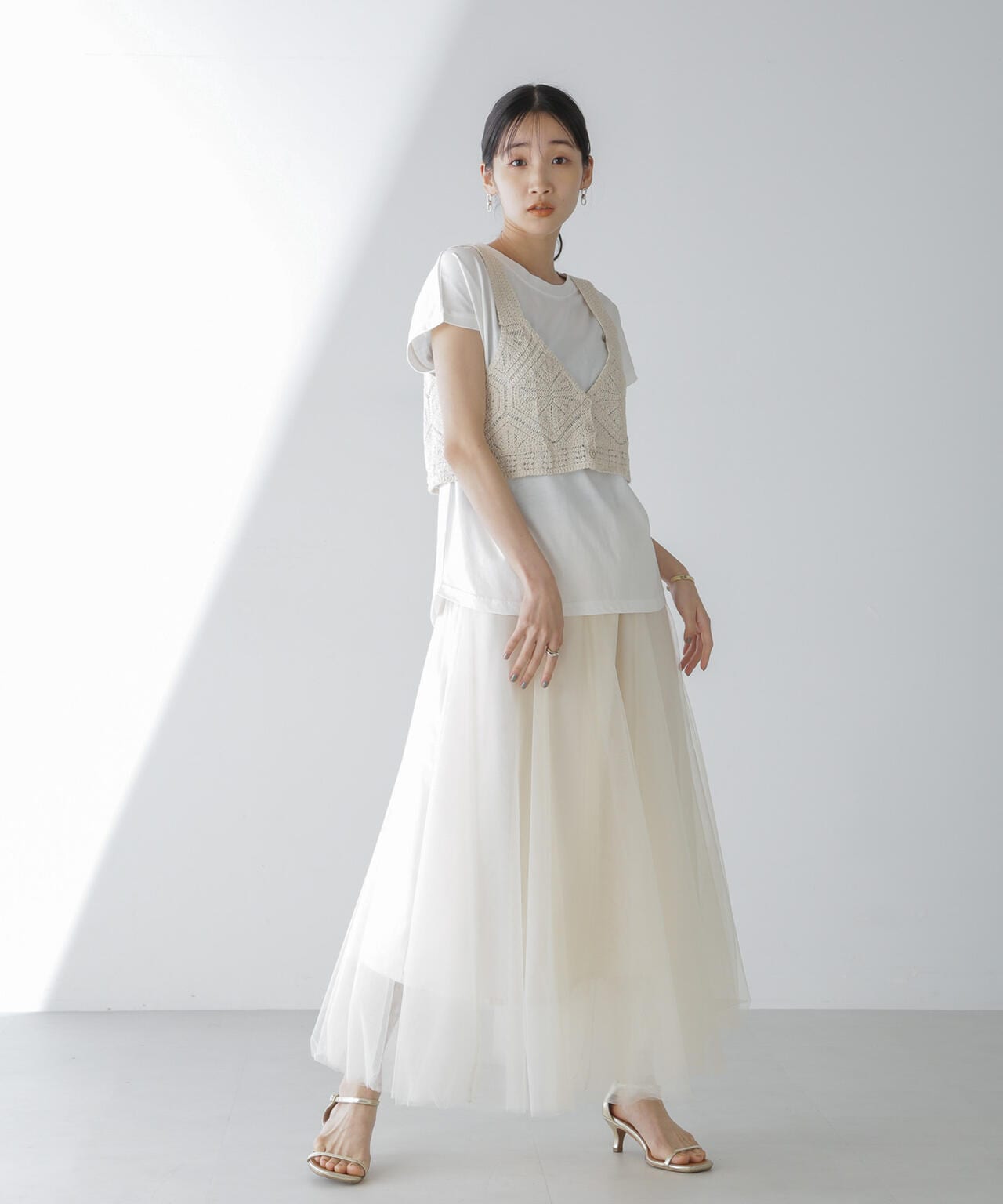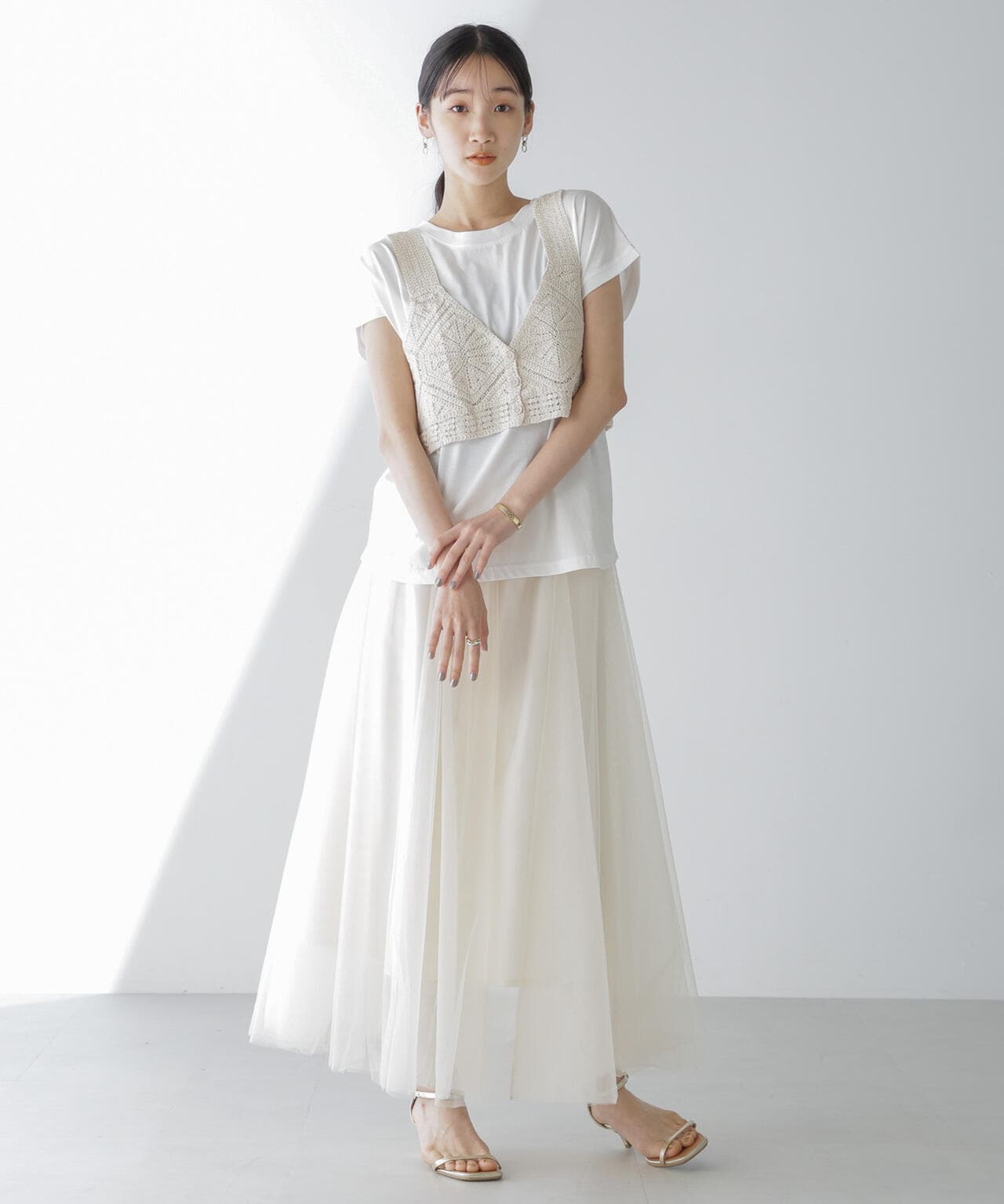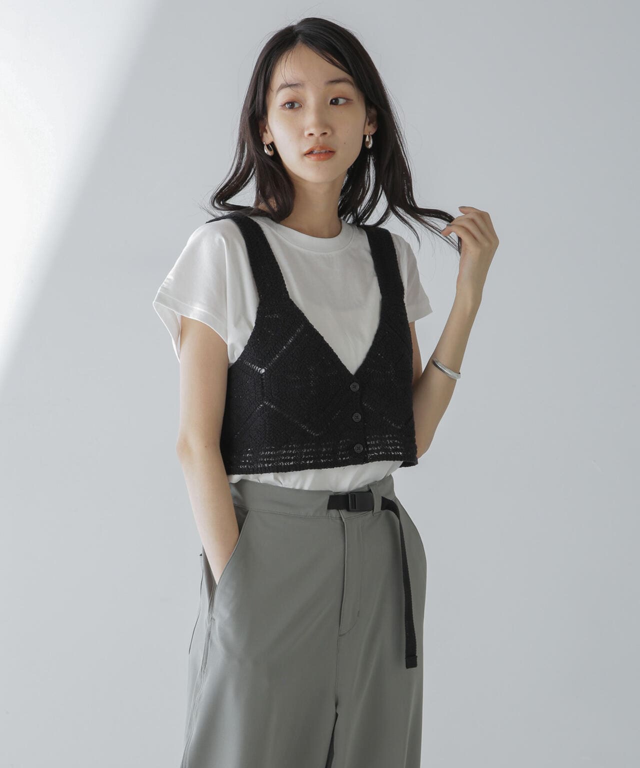 簡単にこなれたレイヤードスタイルが完成する、レース編みのビスチェとカットソーのセットアイテム。