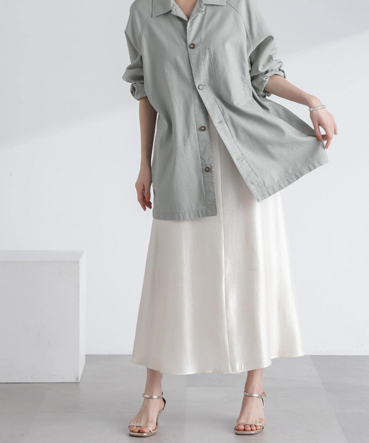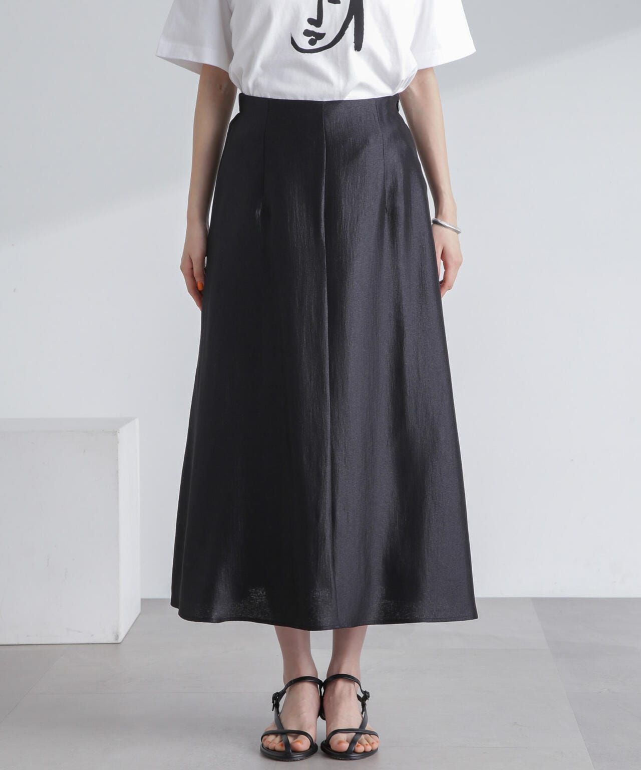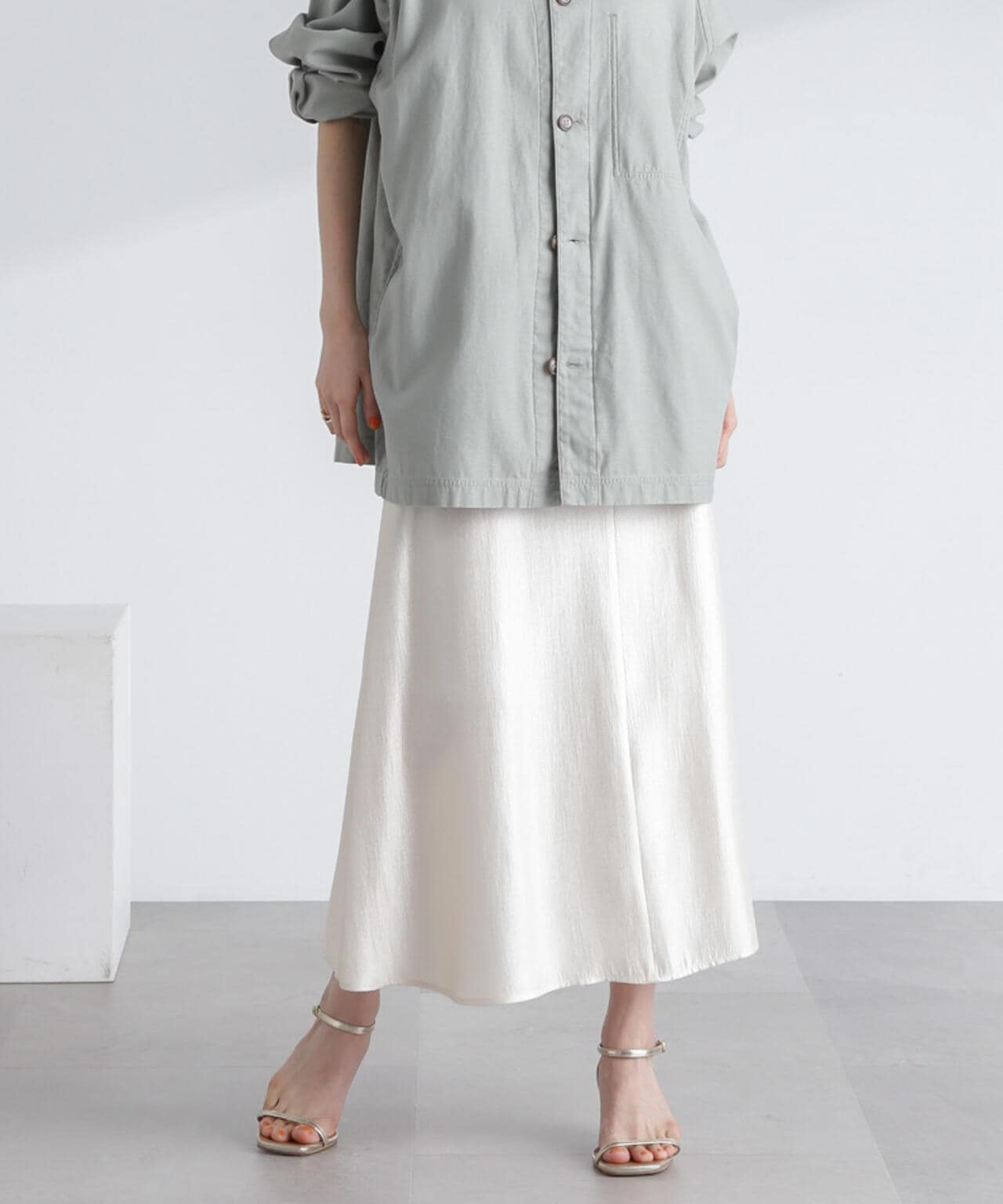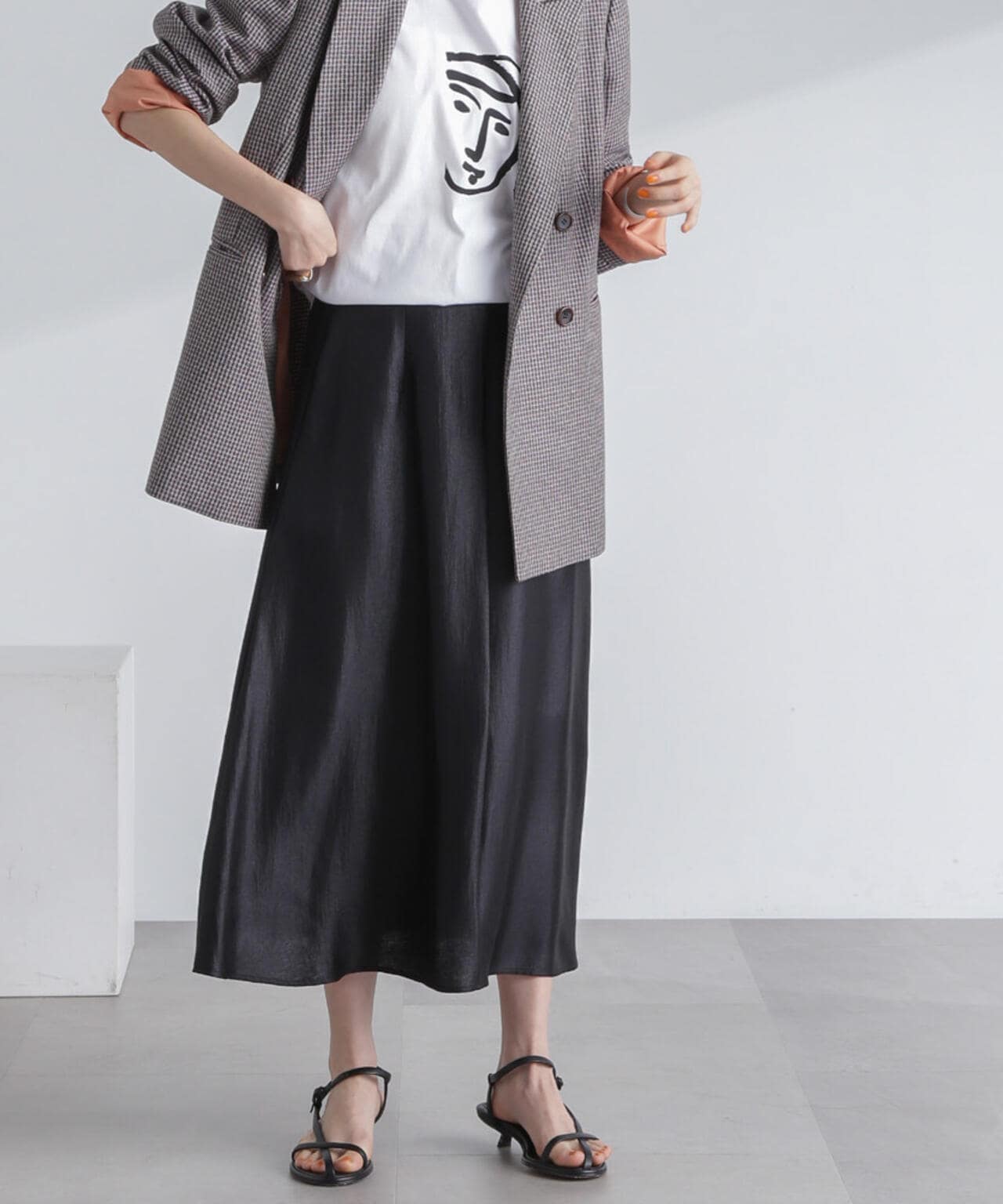 トレンド感あるシャイニー素材を品良く合わせられるロングスカート。裾にかけて絶妙に広がるシルエットが女性らしく、程よい肉感で身体のラインをひろいにくいのも魅力的。ロゴT+ジャケットで外した着こなしや、オーバーシャツを合わせて裾を見せるコーディネートも素敵です。