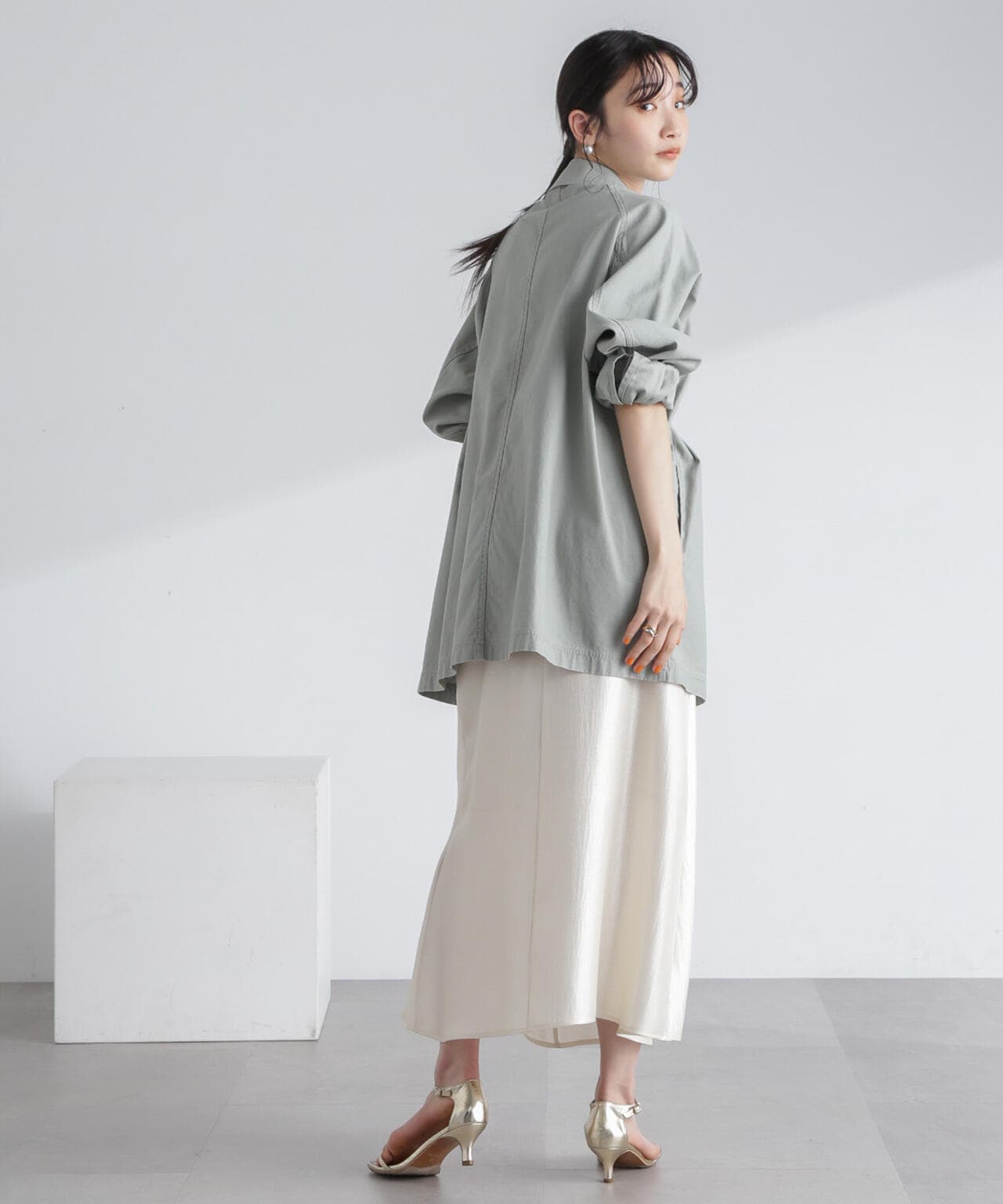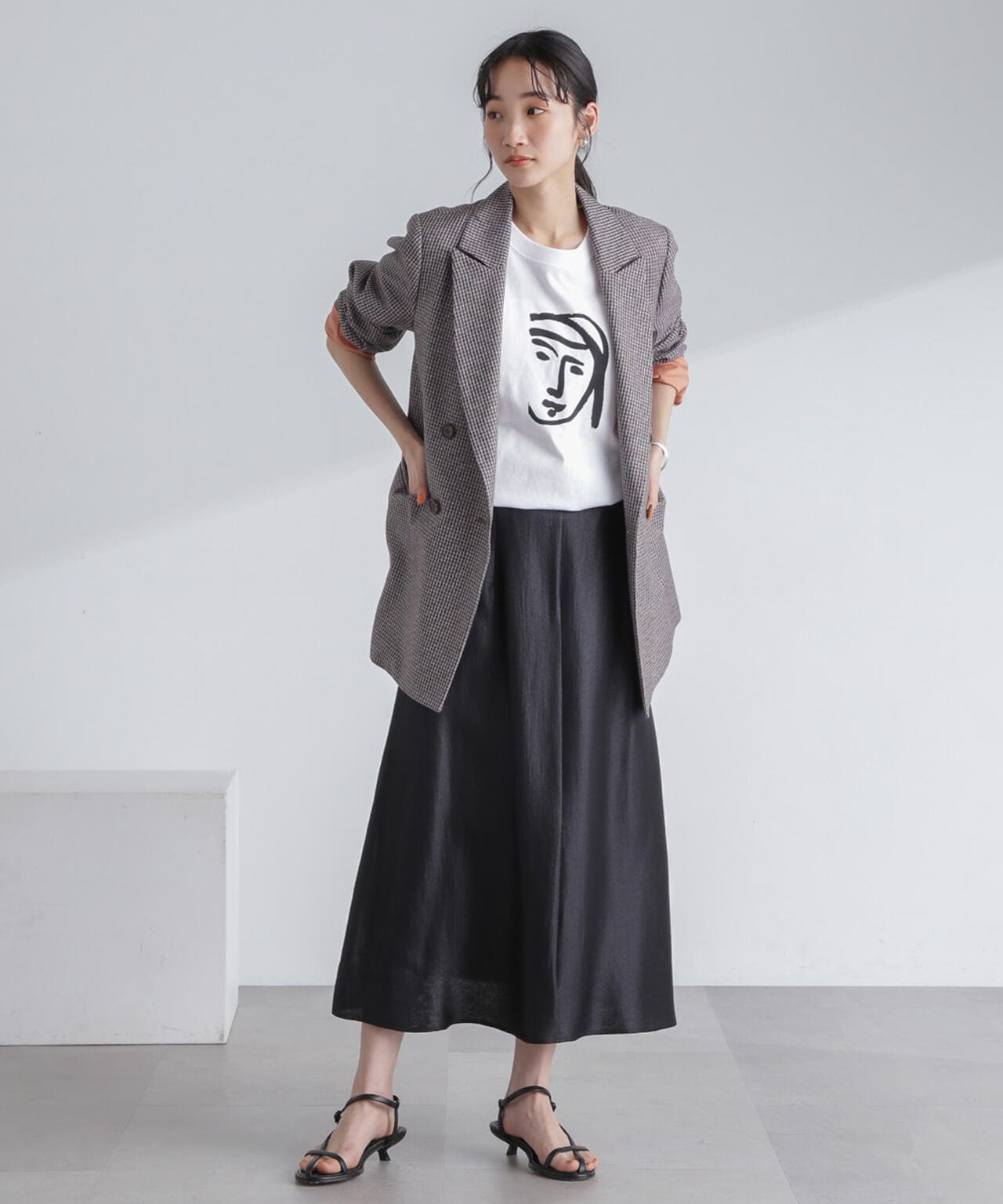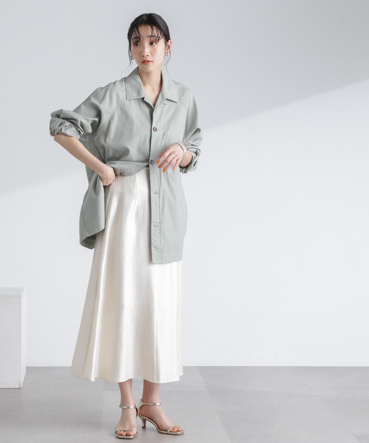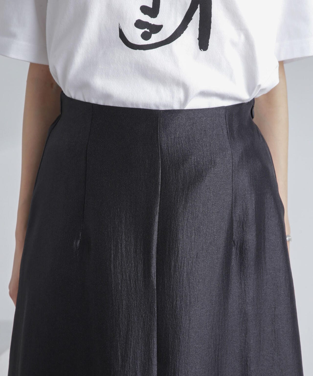 トレンド感あるシャイニー素材を品良く合わせられるロングスカート。裾にかけて絶妙に広がるシルエットが女性らしく、程よい肉感で身体のラインをひろいにくいのも魅力的。ロゴT+ジャケットで外した着こなしや、オーバーシャツを合わせて裾を見せるコーディネートも素敵です。