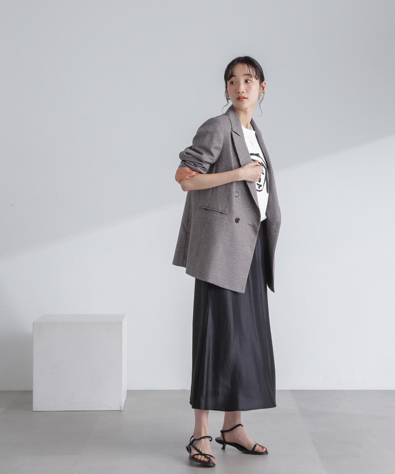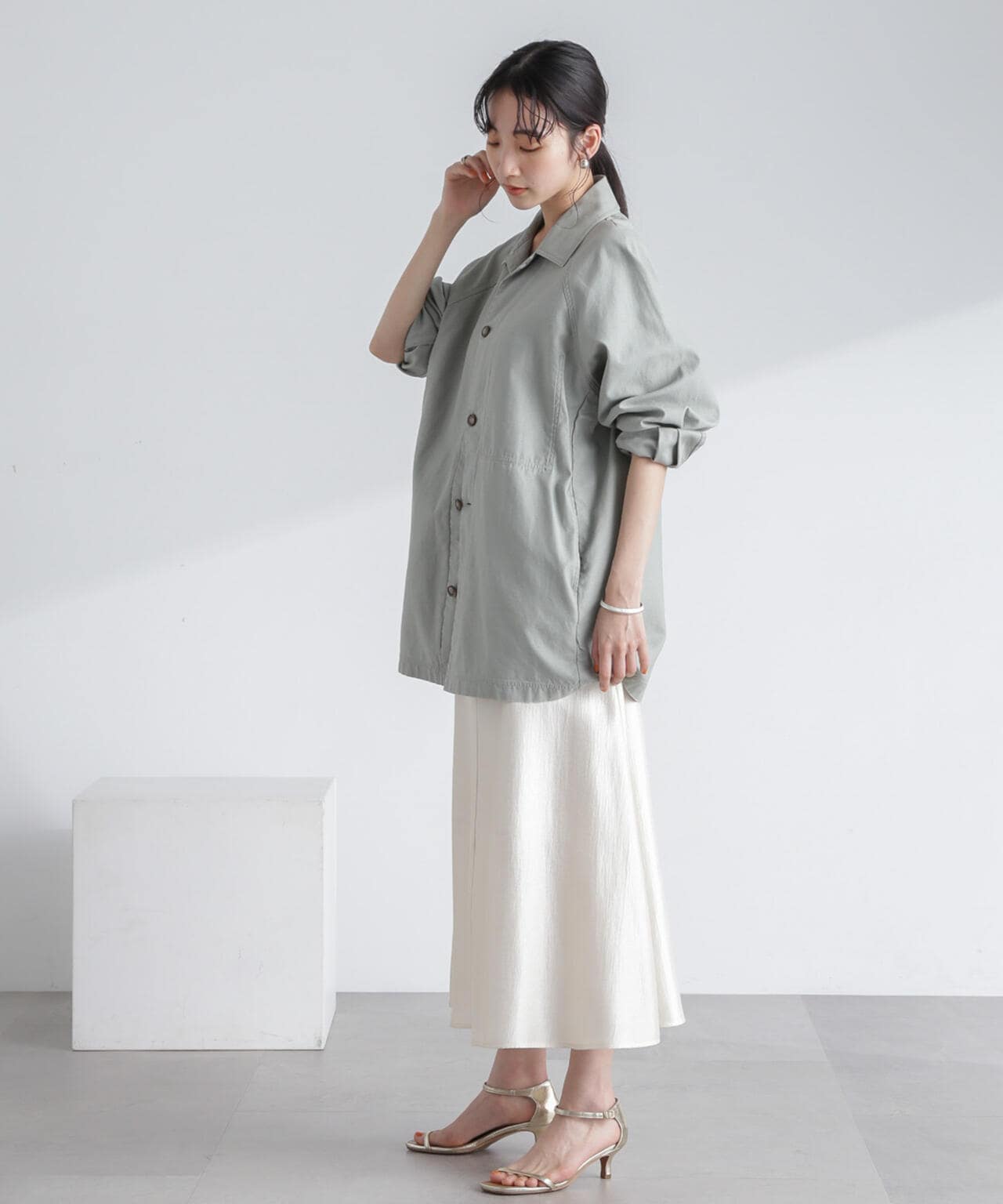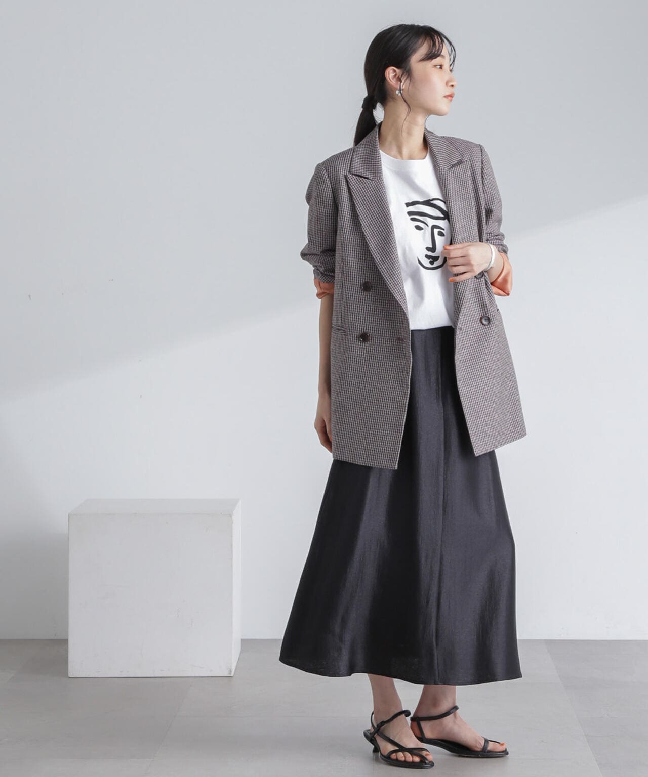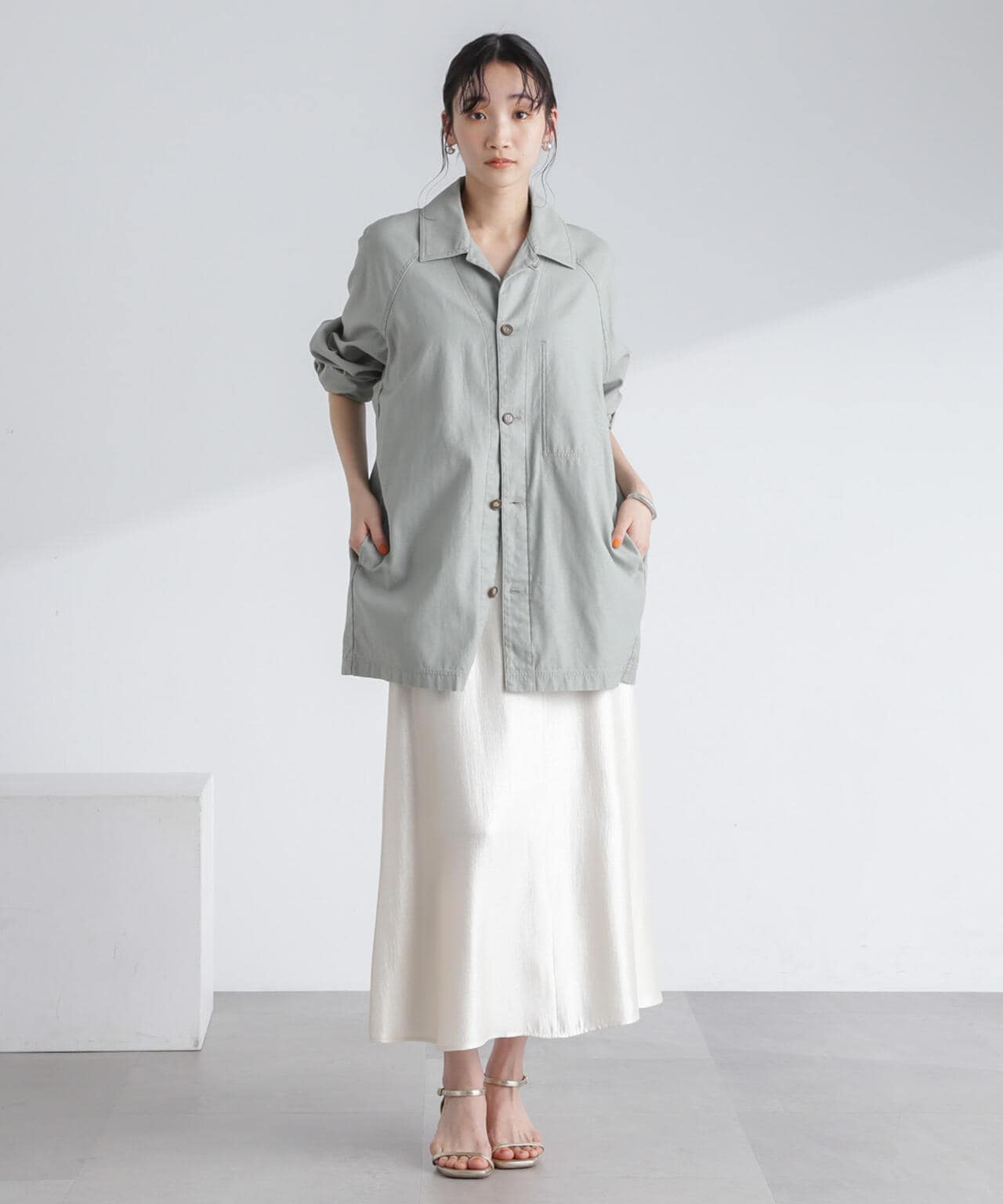 トレンド感あるシャイニー素材を品良く合わせられるロングスカート。裾にかけて絶妙に広がるシルエットが女性らしく、程よい肉感で身体のラインをひろいにくいのも魅力的。ロゴT+ジャケットで外した着こなしや、オーバーシャツを合わせて裾を見せるコーディネートも素敵です。