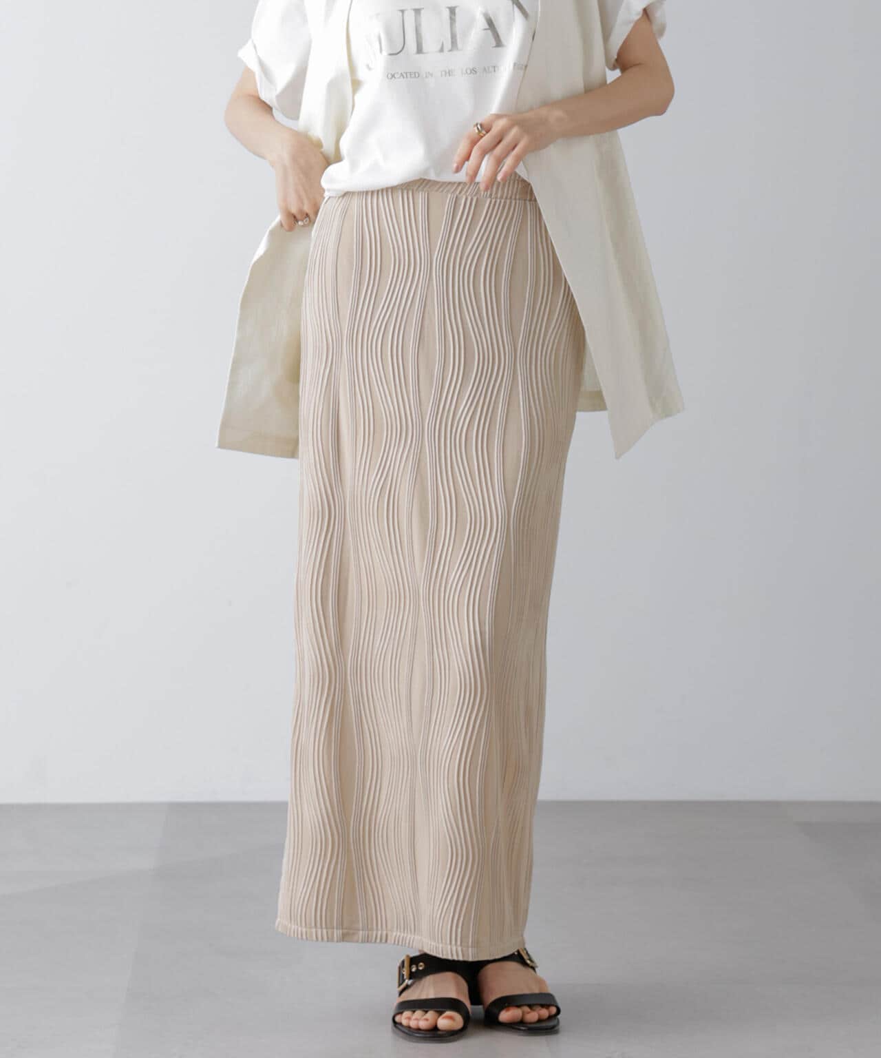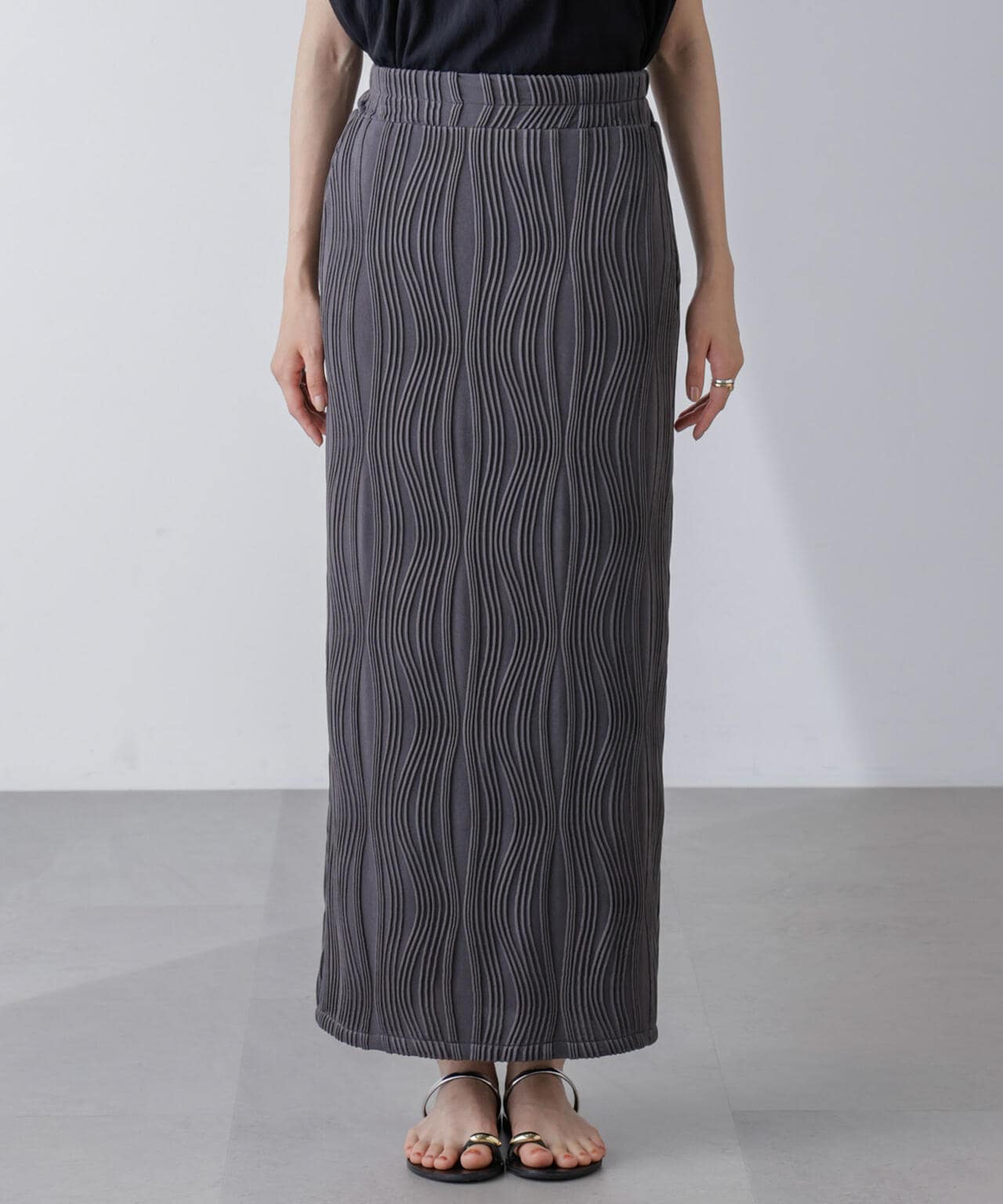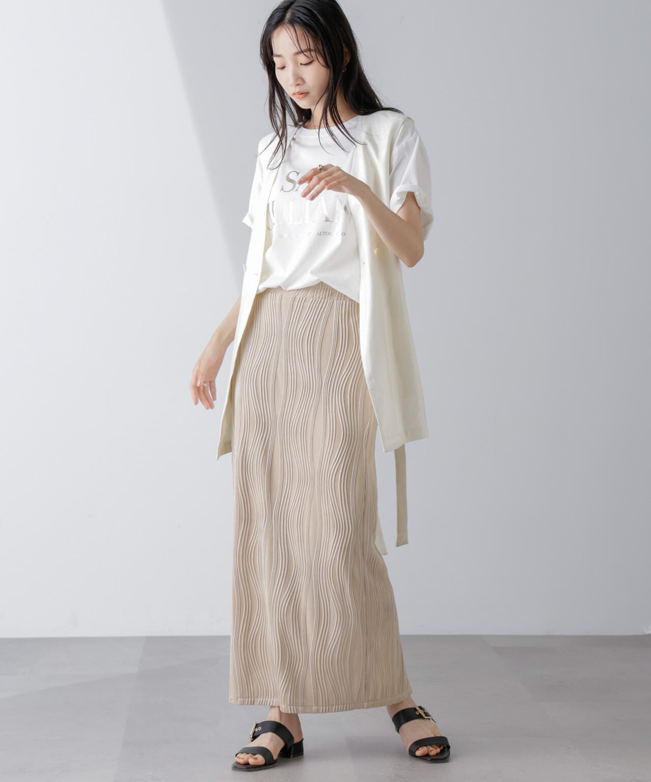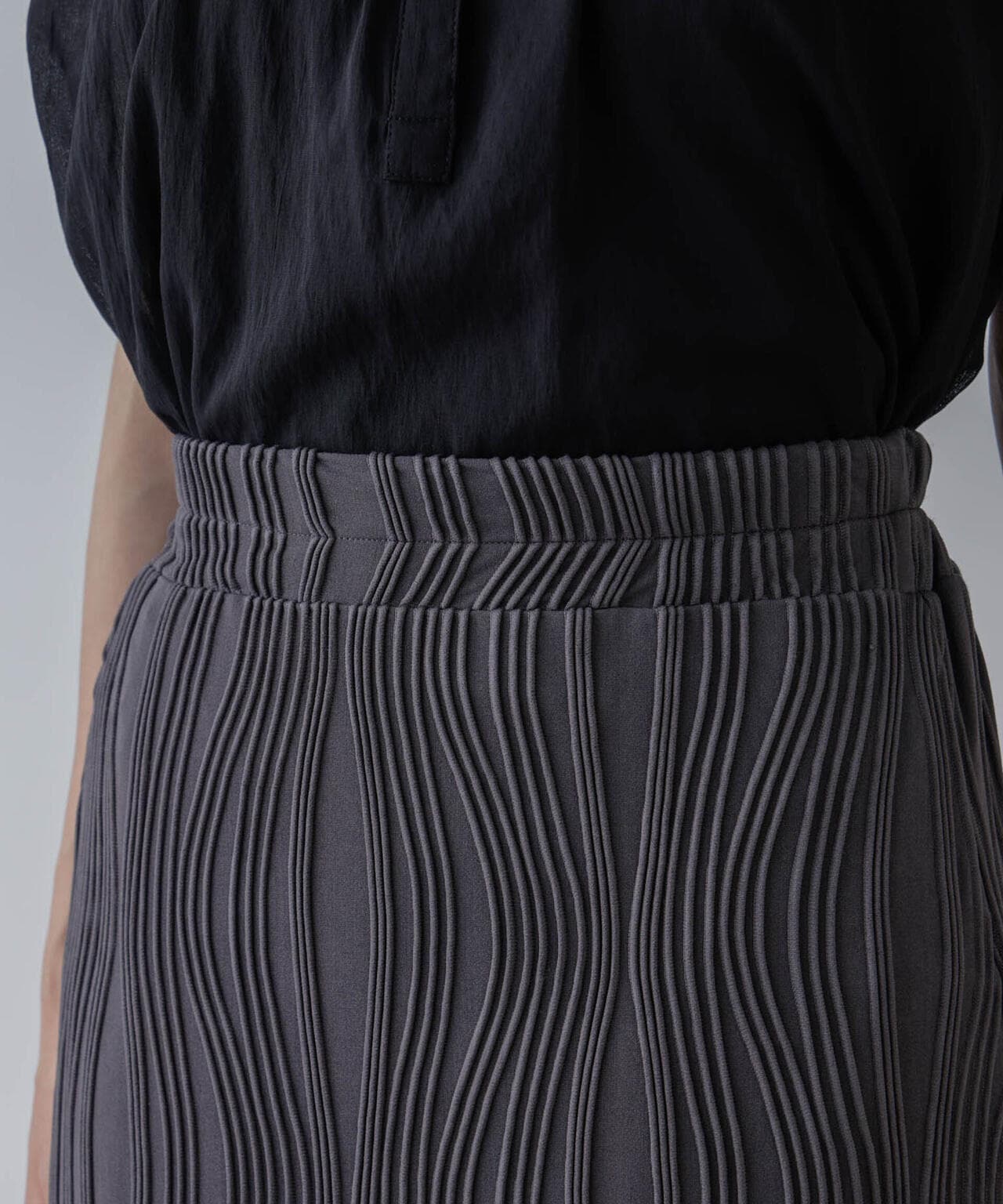 立体感のあるリップル素材が女性らしさを惹き出してくれるカットスカート。身体のラインを拾いすぎない絶妙なナローシルエットに、ウエストゴム仕様で履き心地も快適。コーディネートに取り入れやすいシンプルなデザインなので、合わせるトップス次第で様々なスタイリングが楽しめます。同素材のトップスと合わせたセットアップスタイルもオススメです。