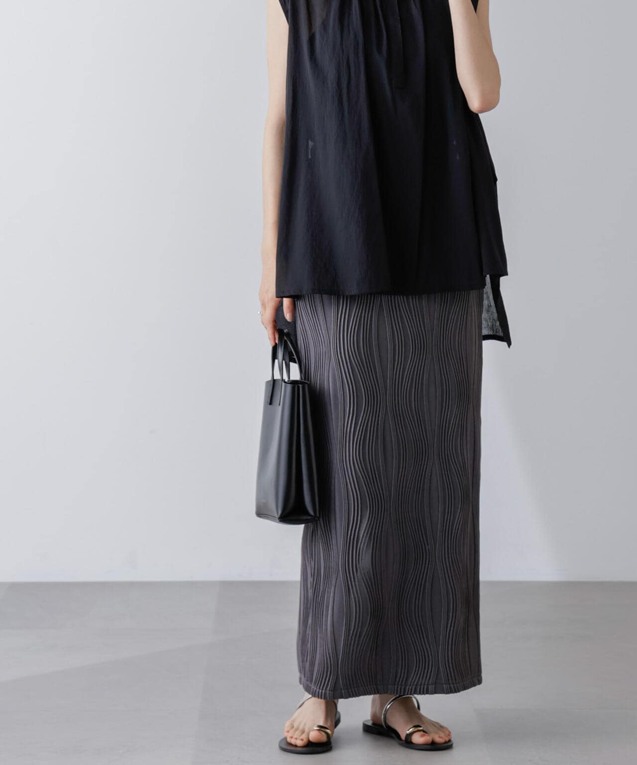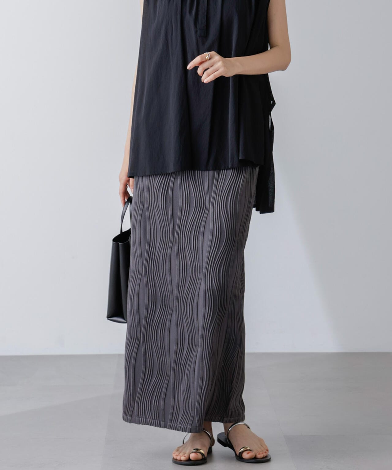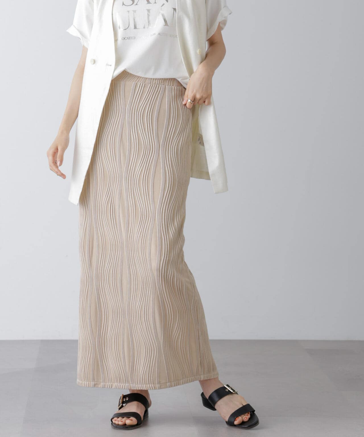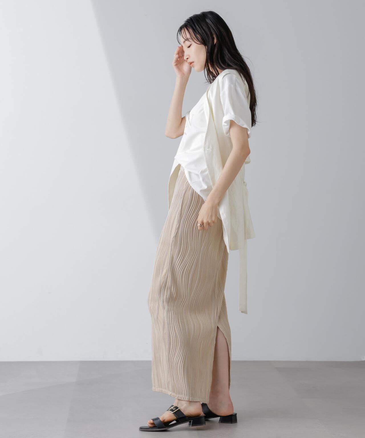 立体感のあるリップル素材が女性らしさを惹き出してくれるカットスカート。身体のラインを拾いすぎない絶妙なナローシルエットに、ウエストゴム仕様で履き心地も快適。コーディネートに取り入れやすいシンプルなデザインなので、合わせるトップス次第で様々なスタイリングが楽しめます。同素材のトップスと合わせたセットアップスタイルもオススメです。
