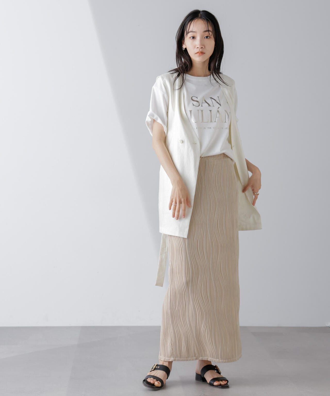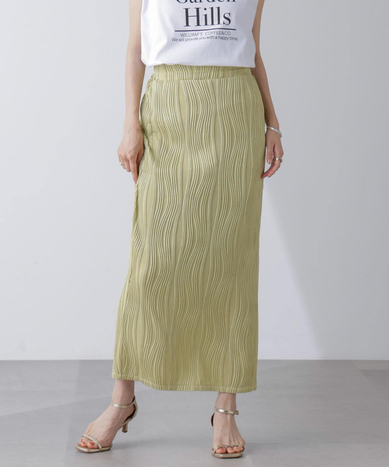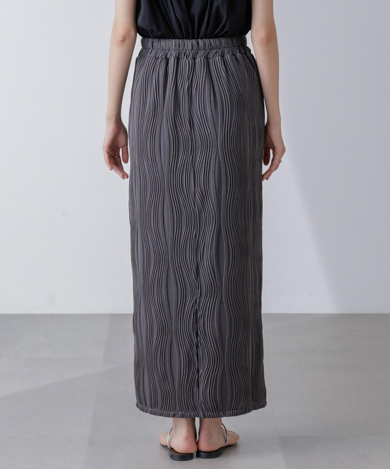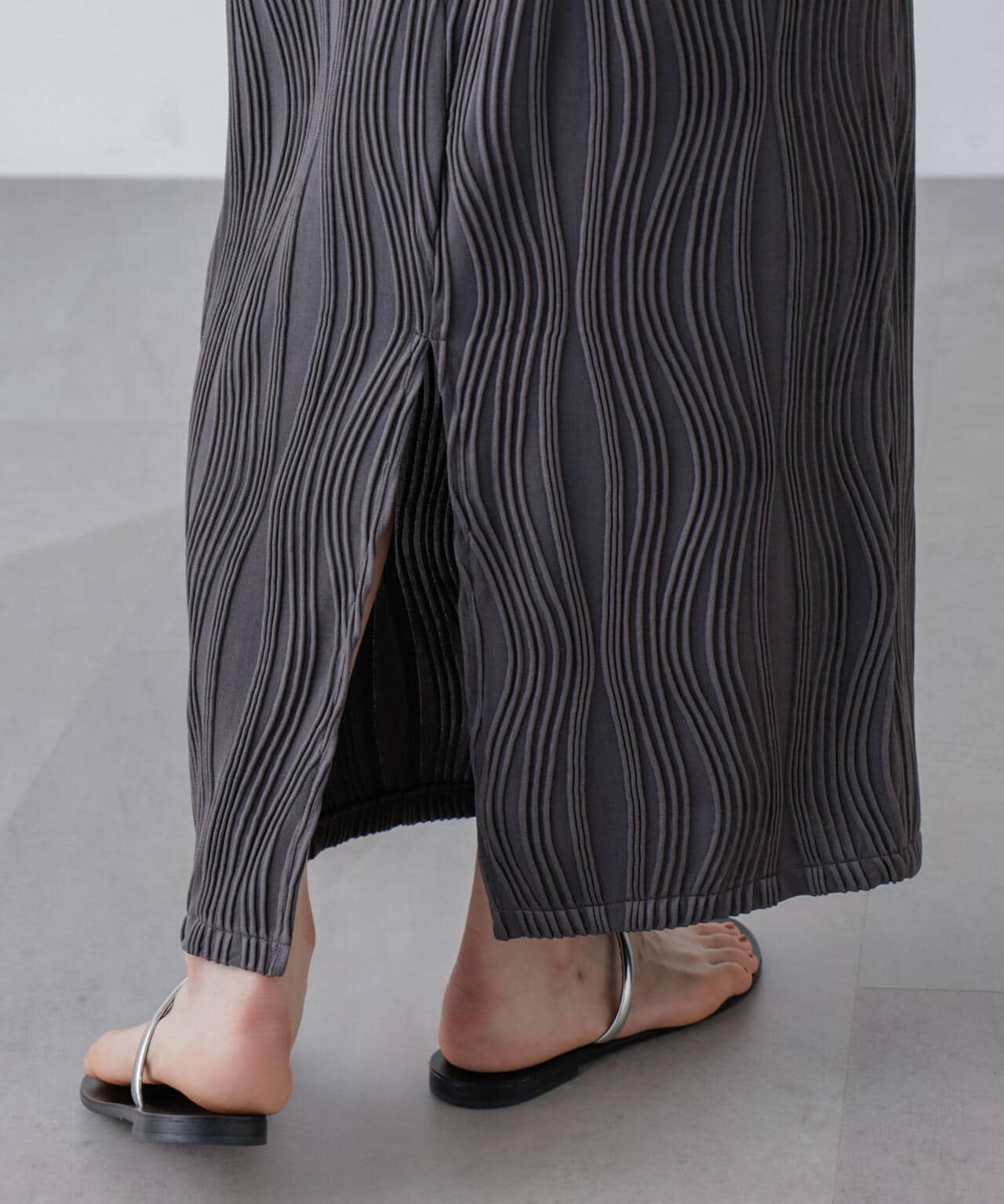 立体感のあるリップル素材が女性らしさを惹き出してくれるカットスカート。身体のラインを拾いすぎない絶妙なナローシルエットに、ウエストゴム仕様で履き心地も快適。コーディネートに取り入れやすいシンプルなデザインなので、合わせるトップス次第で様々なスタイリングが楽しめます。同素材のトップスと合わせたセットアップスタイルもオススメです。