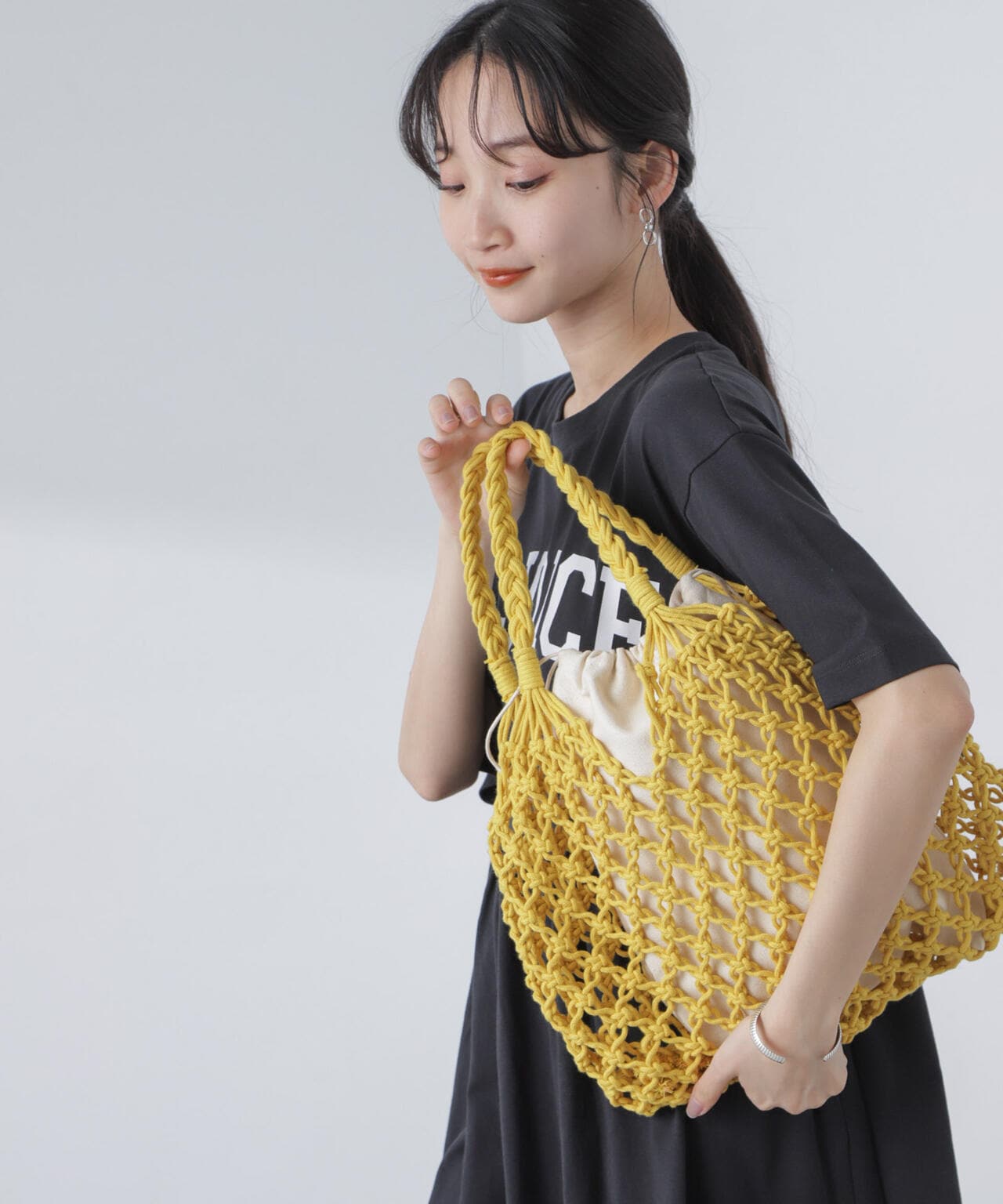 ざっくりしたマクラメ編みが特徴的なトートバッグ。セットで巾着が付いているので、インポーチとして使用することでバッグの中身が見える事なく収納が可能です。シンプルなデザインながら清涼感のある素材なので春夏のスタイリングにアクセントになってくれる一品です!