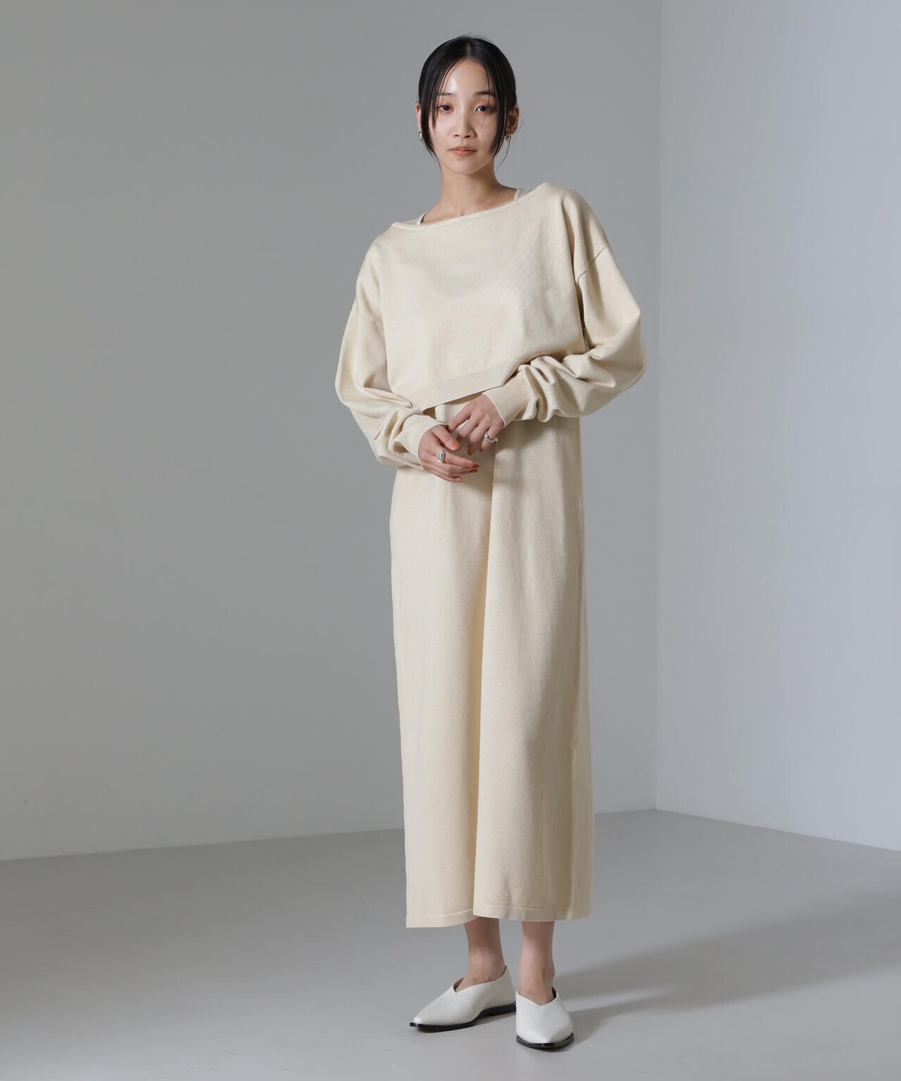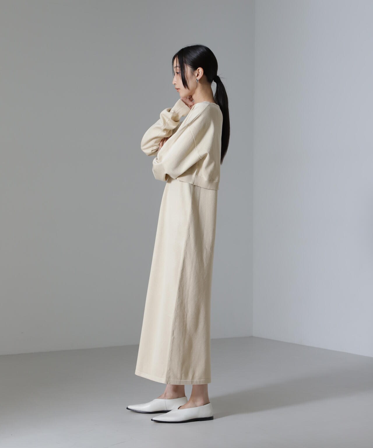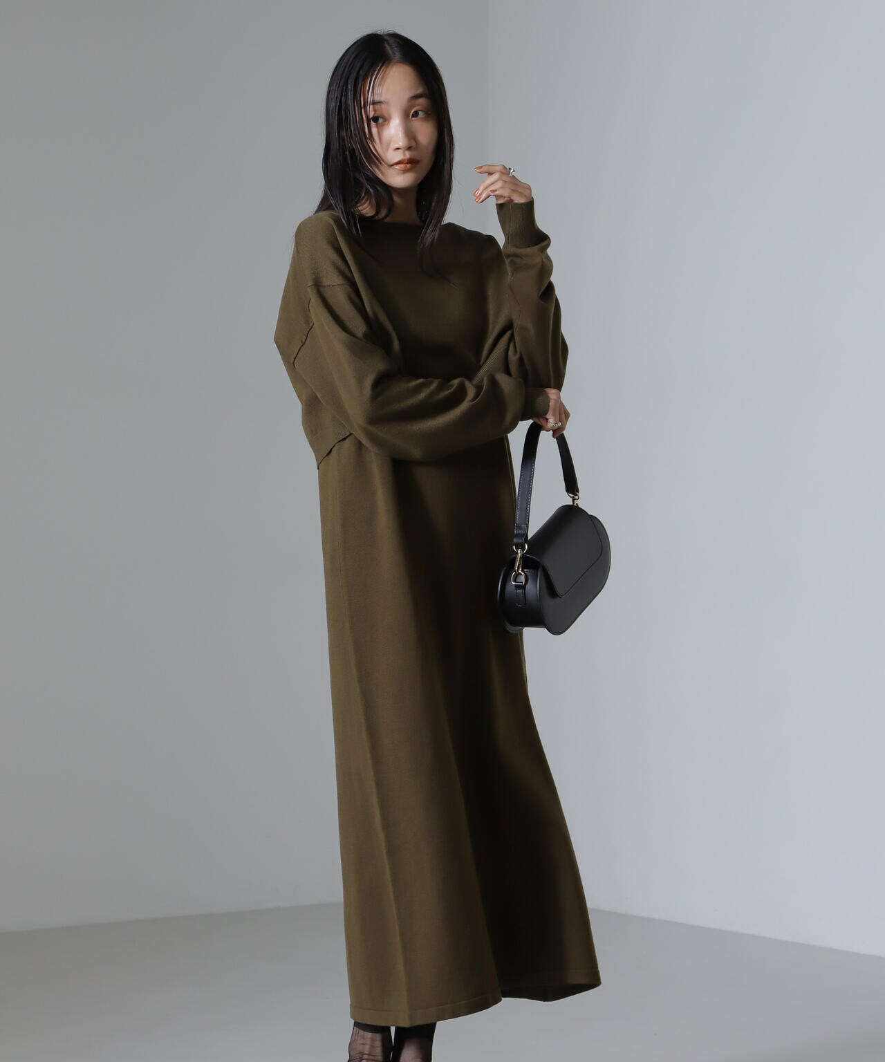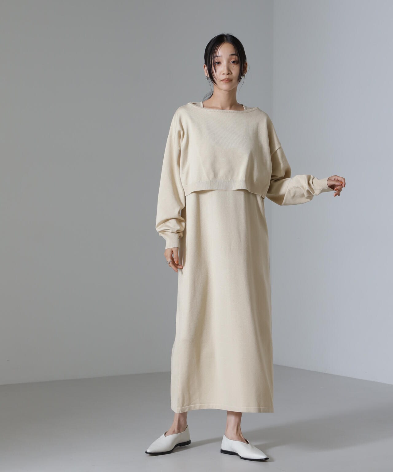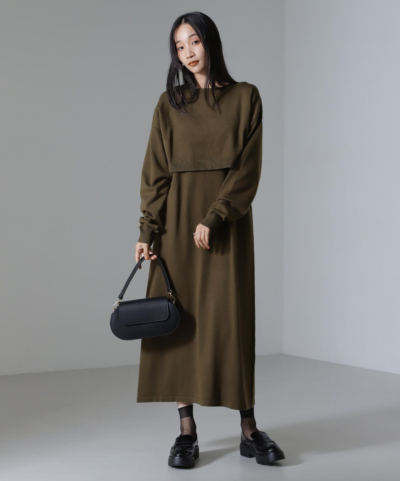 ゆるっとカジュアルに着れるニットワンピースと、クロップド丈のプルオーバーのセットアップ。ワンピース、プルオーバーともに単体で着回しのきくアイテムなので、スタイリングの幅がぐっと広がります。