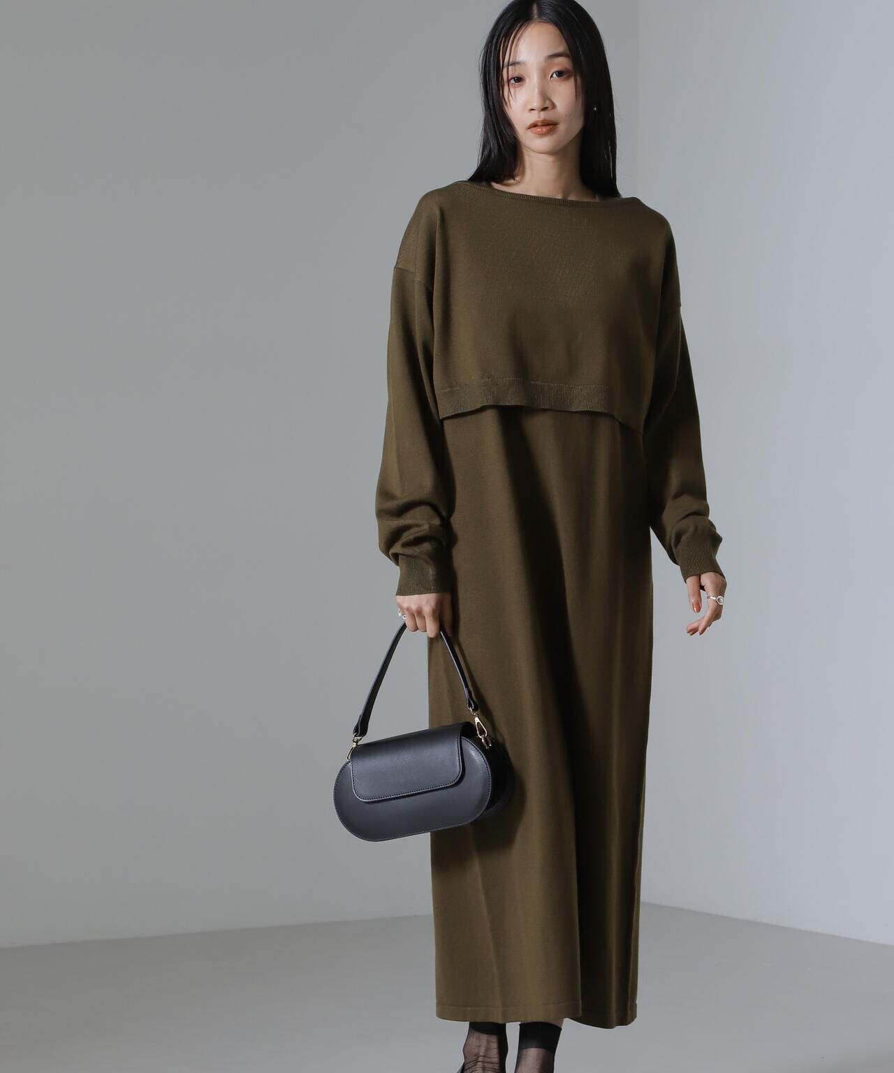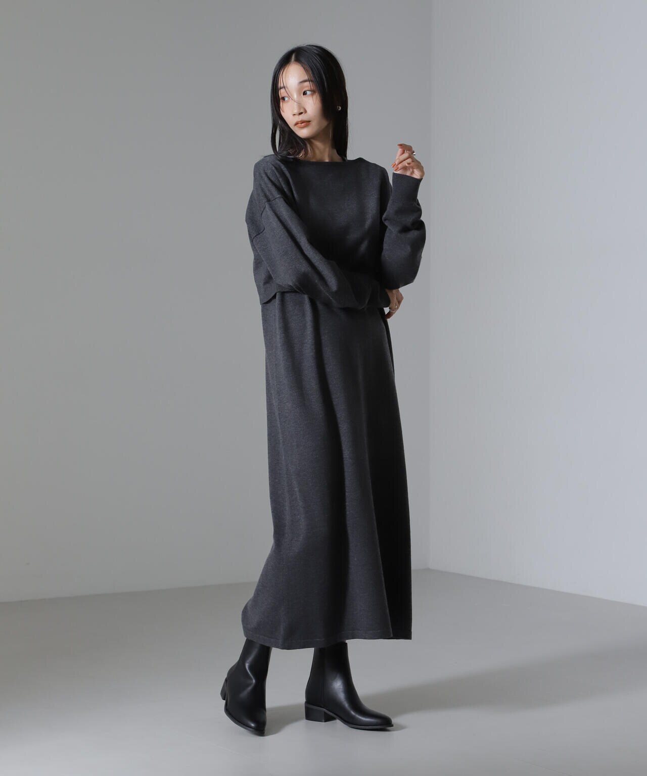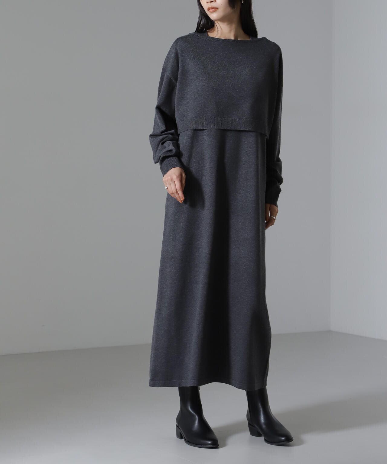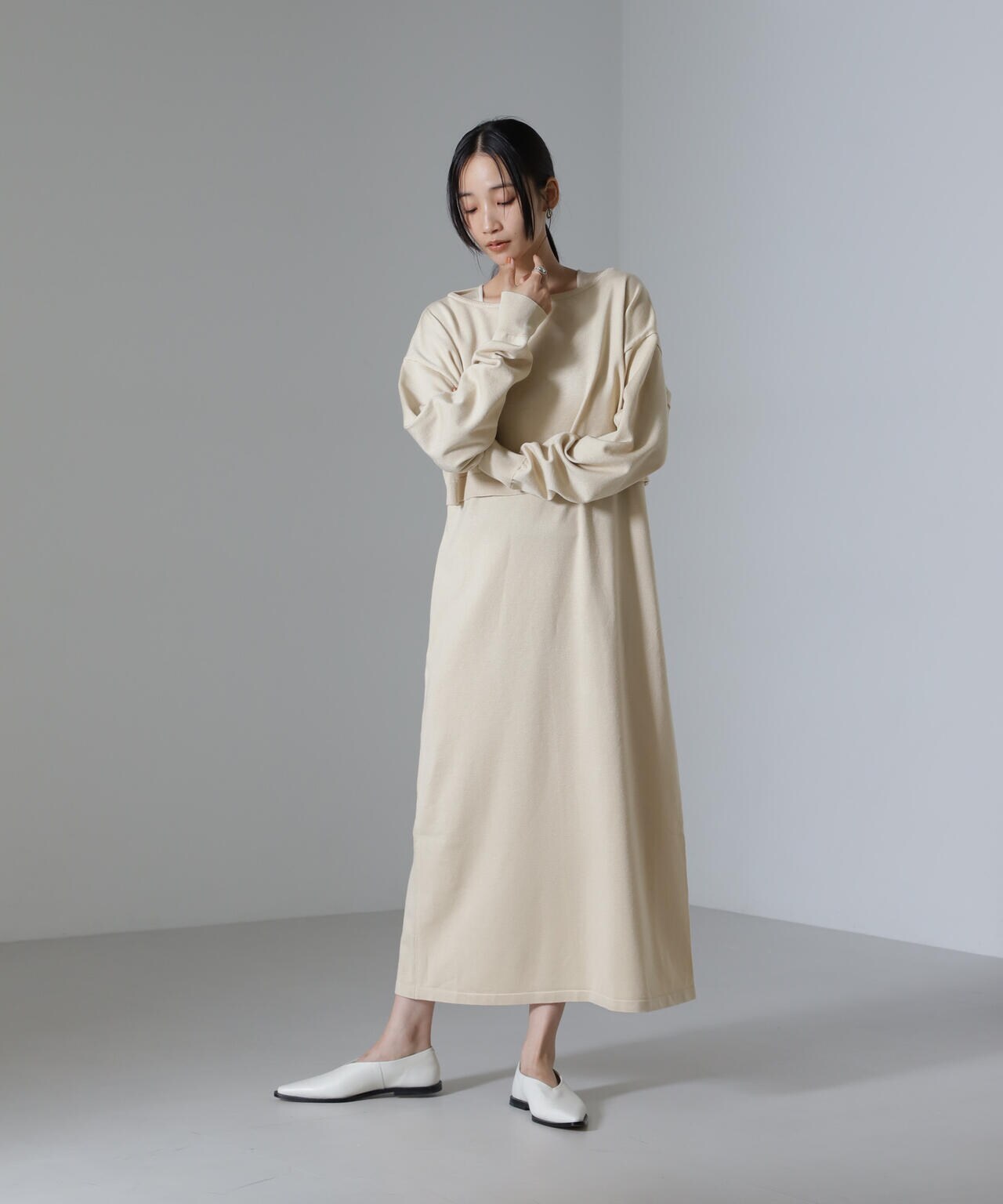 ゆるっとカジュアルに着れるニットワンピースと、クロップド丈のプルオーバーのセットアップ。ワンピース、プルオーバーともに単体で着回しのきくアイテムなので、スタイリングの幅がぐっと広がります。