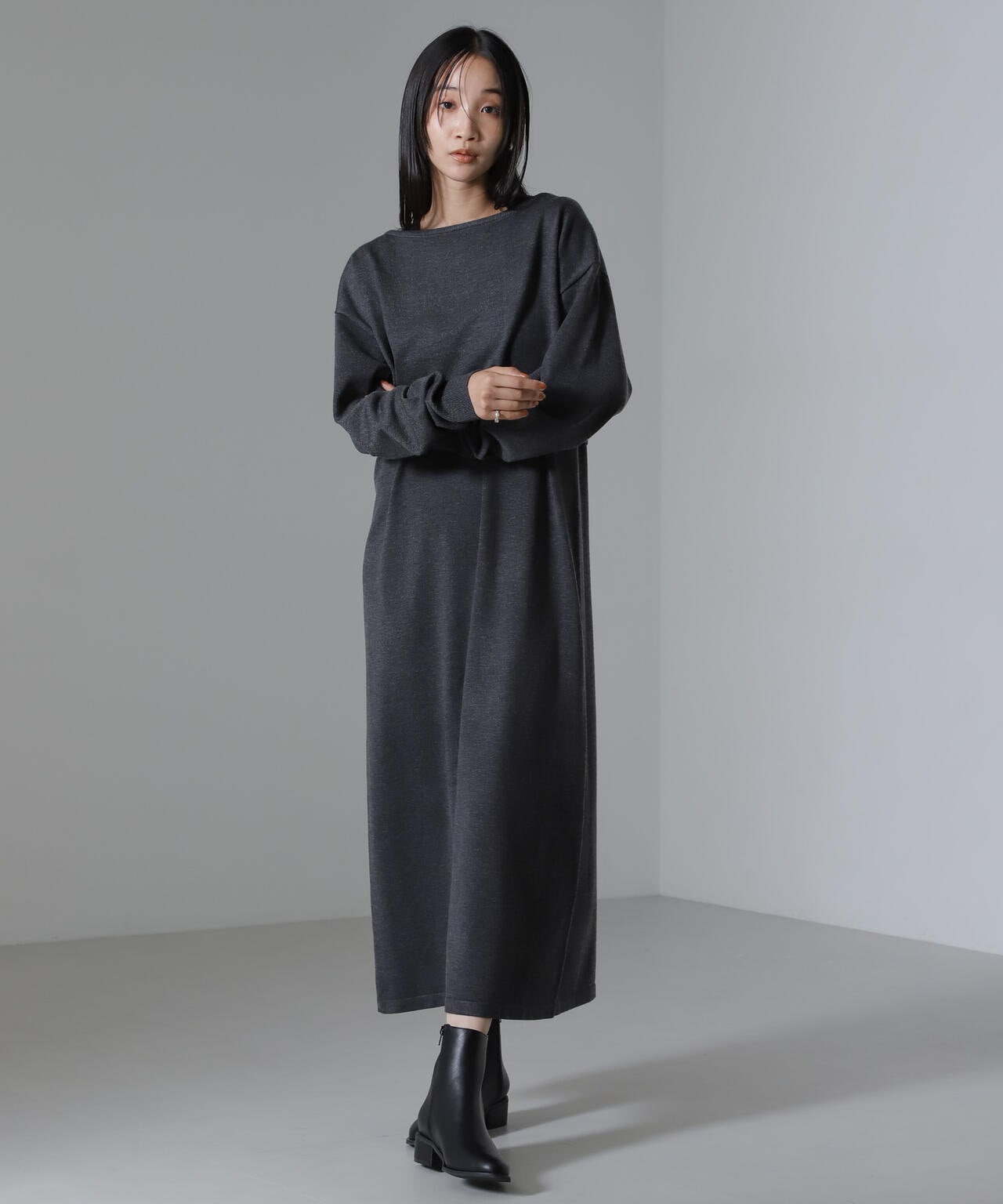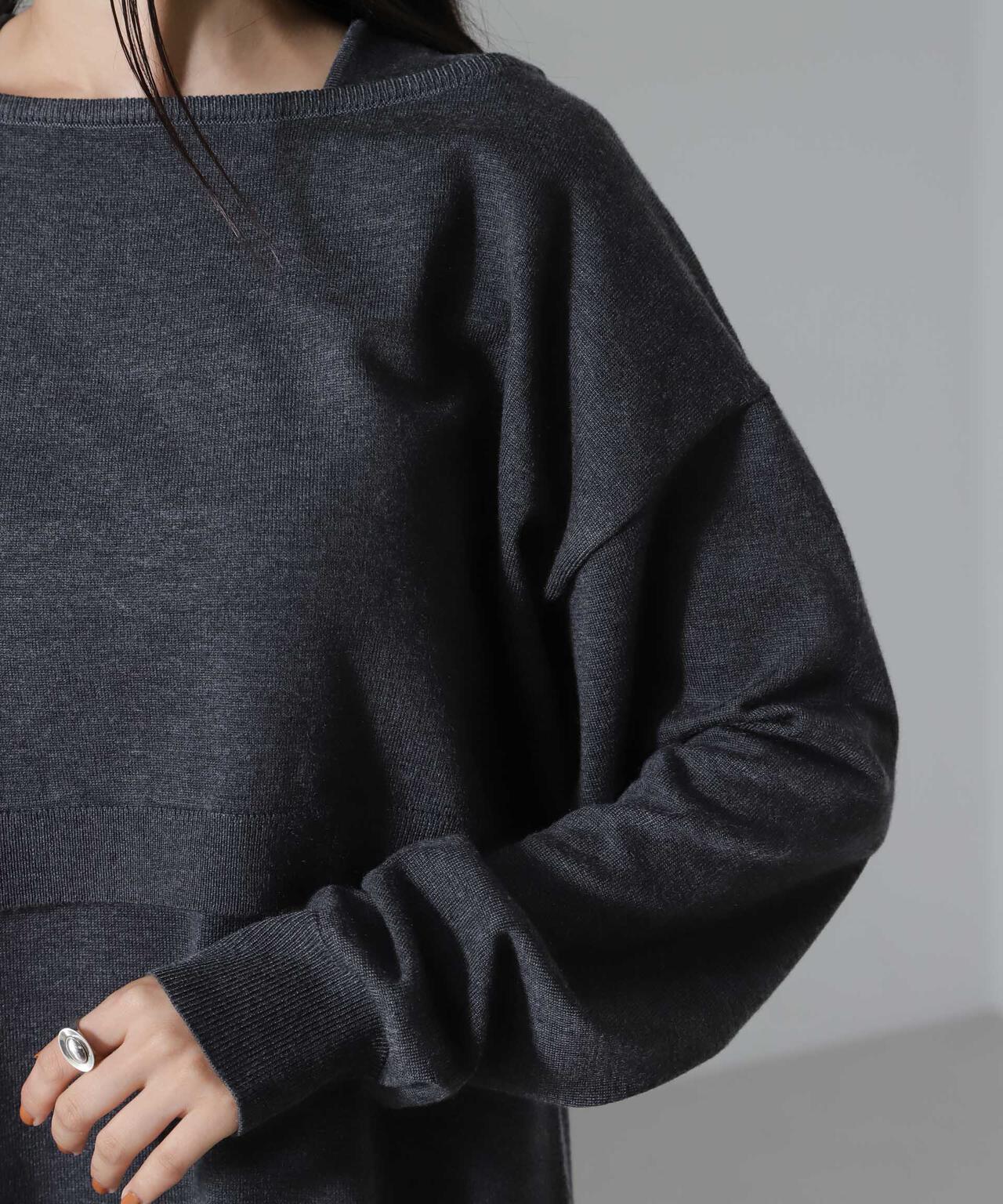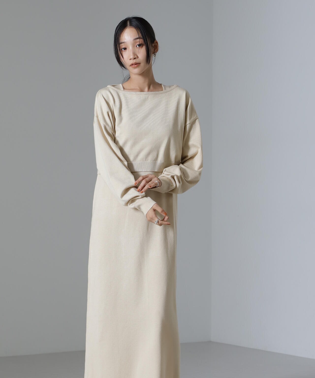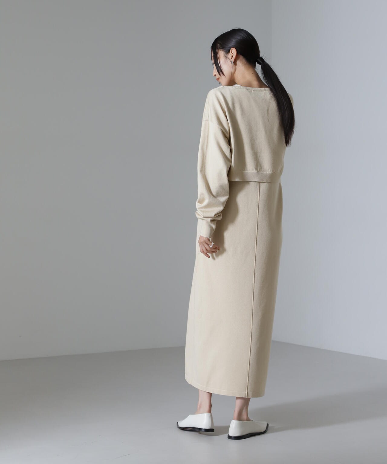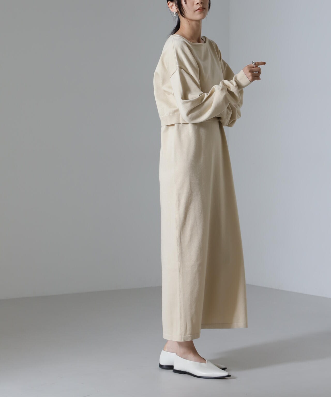 ゆるっとカジュアルに着れるニットワンピースと、クロップド丈のプルオーバーのセットアップ。ワンピース、プルオーバーともに単体で着回しのきくアイテムなので、スタイリングの幅がぐっと広がります。