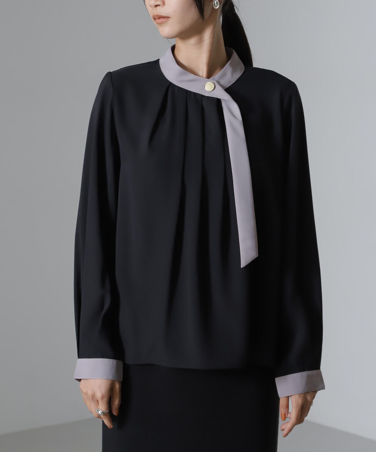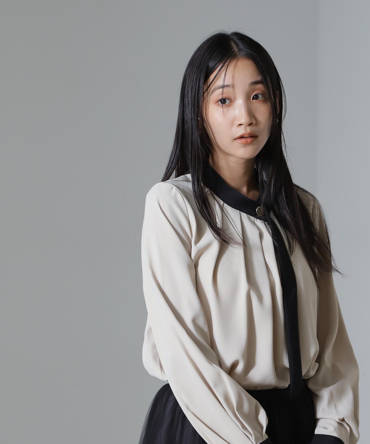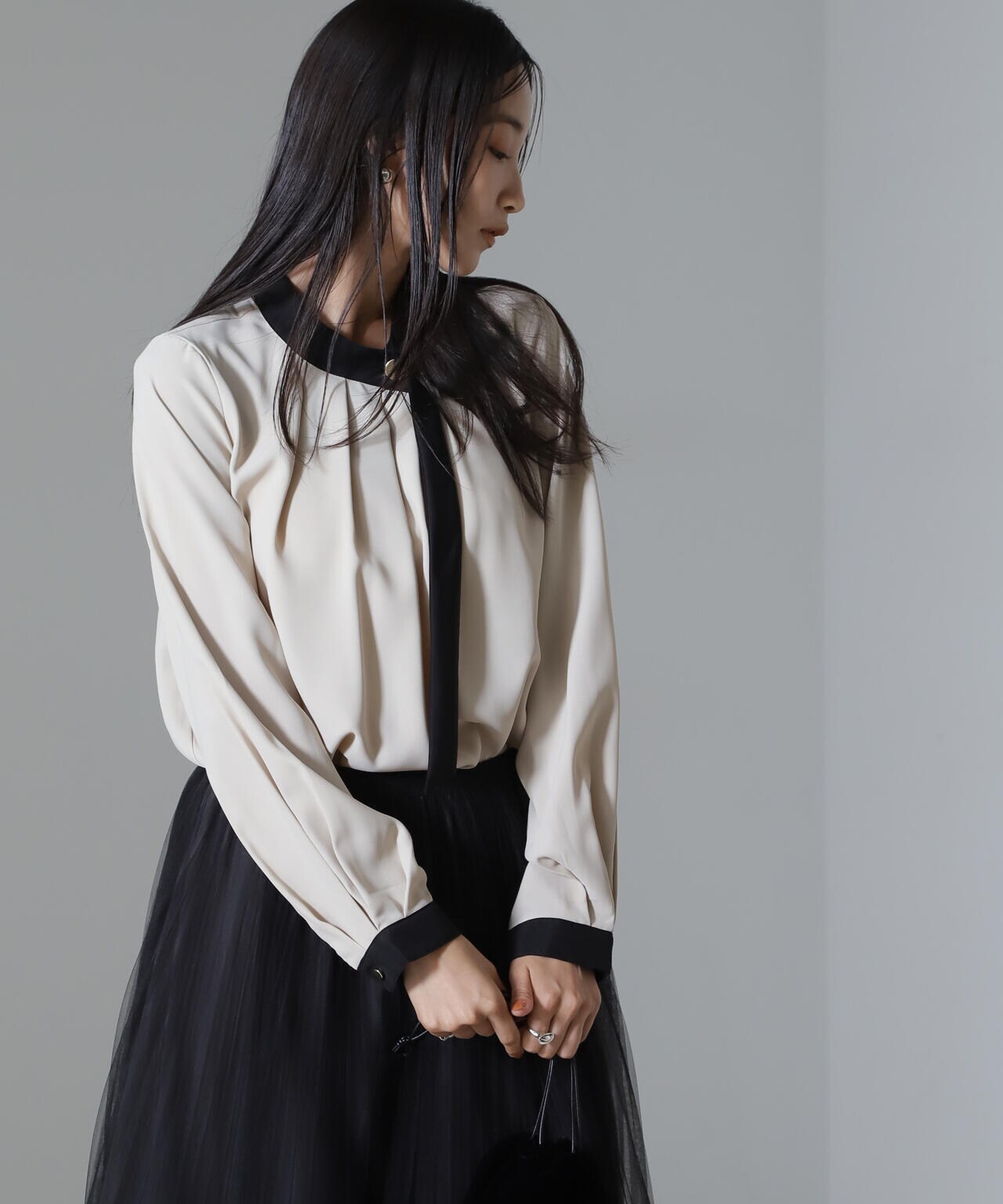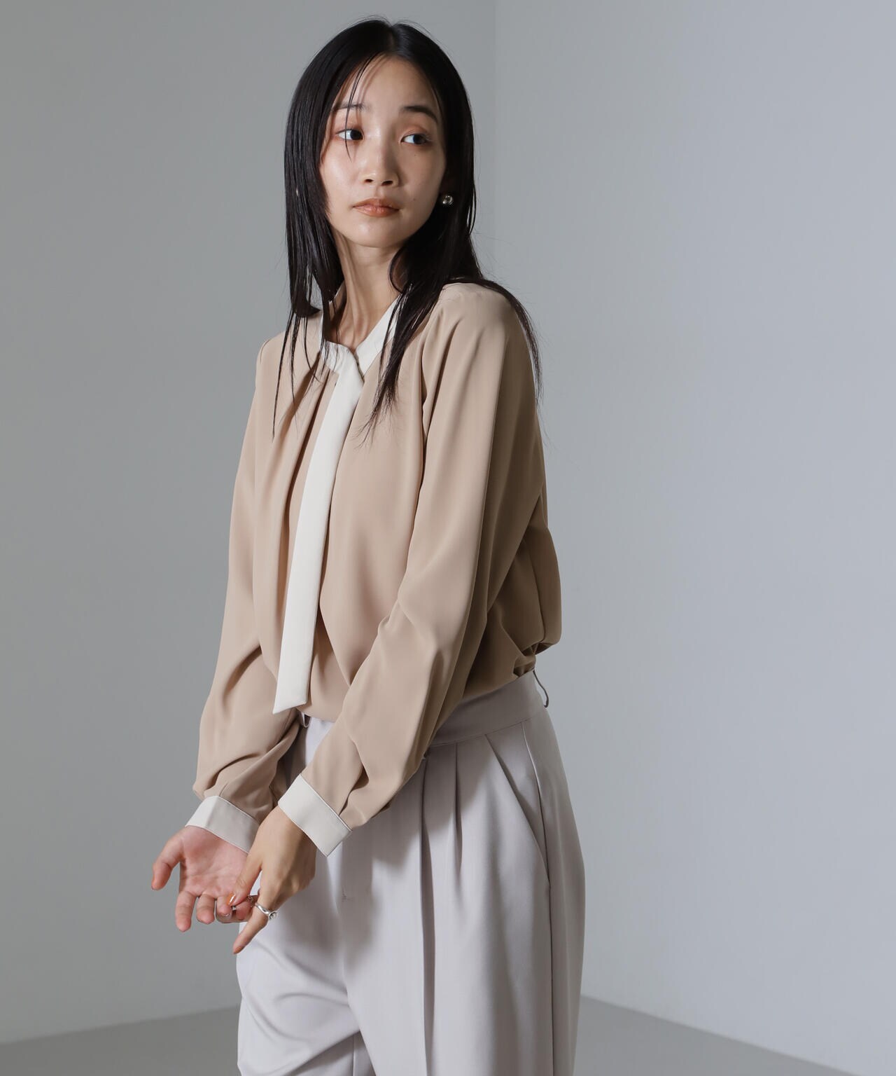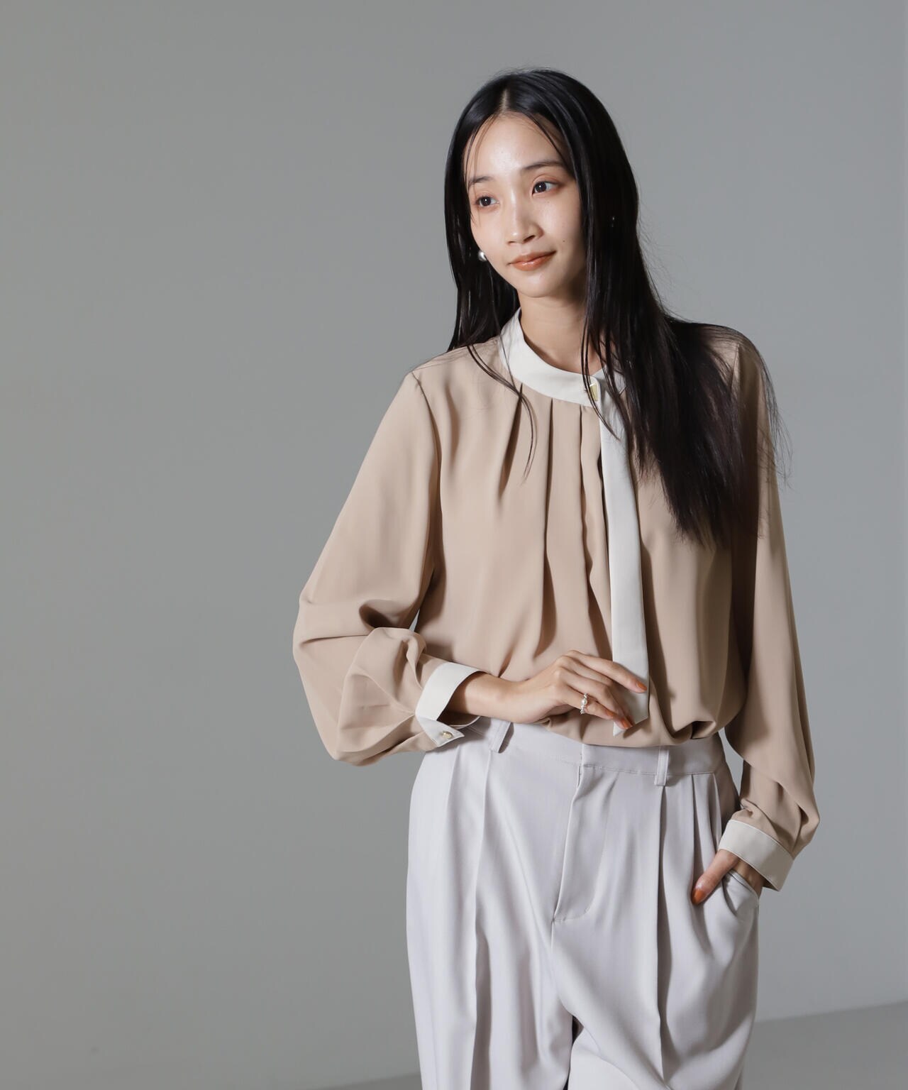 衿と袖のバイカラーとフロントに入ったタックが華やかなボータイブラウス。シンプルながらも上品さと女性らしい雰囲気を演出してくれるので、ON/OFFで様になる着映えアイテムです。