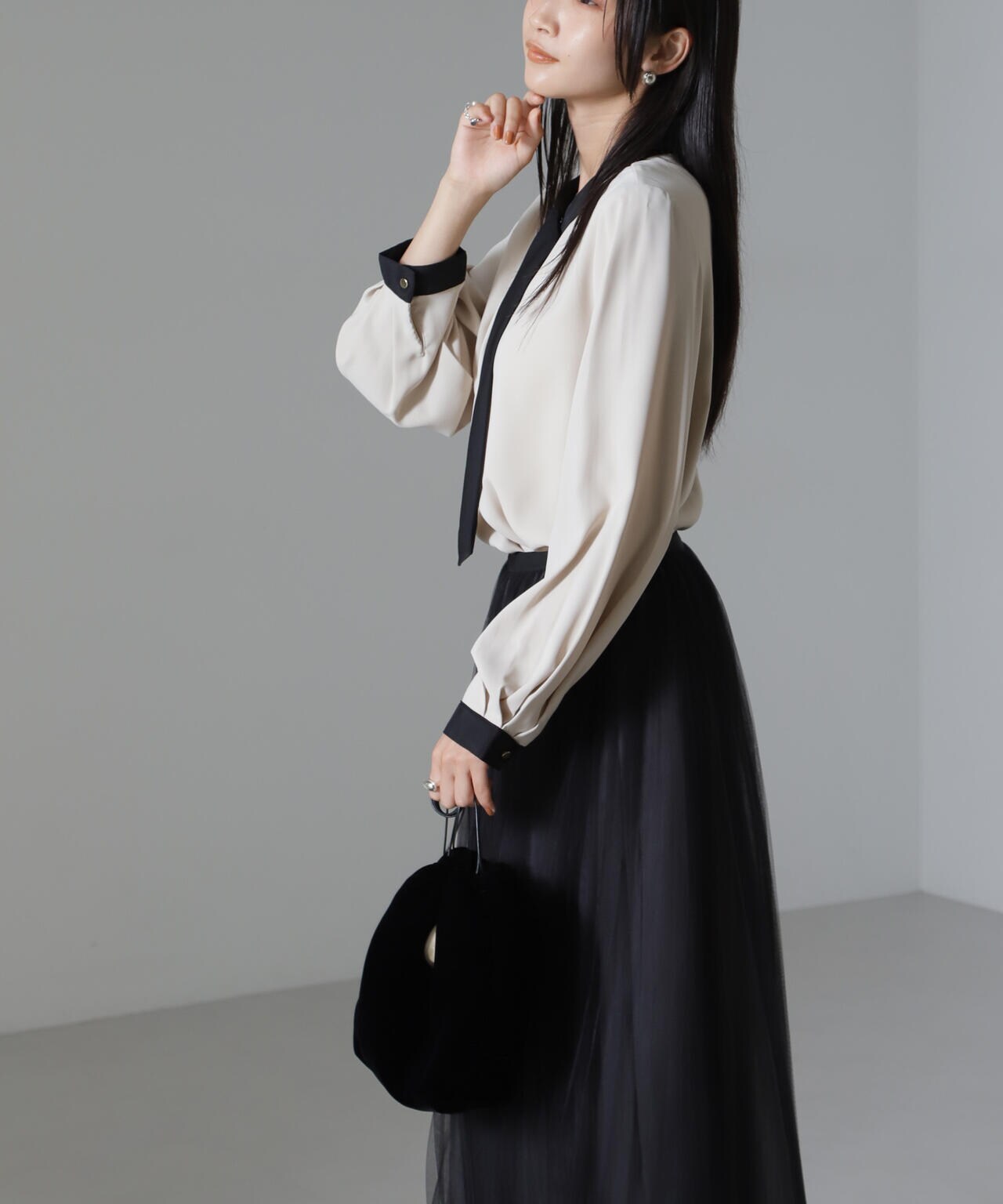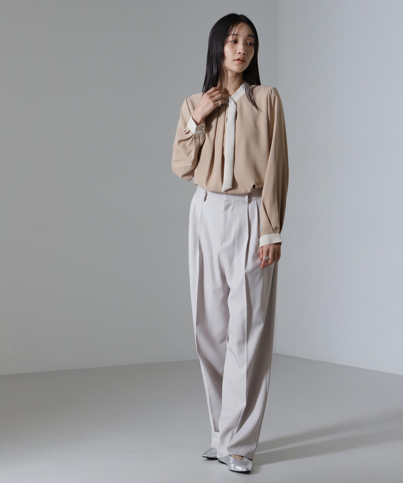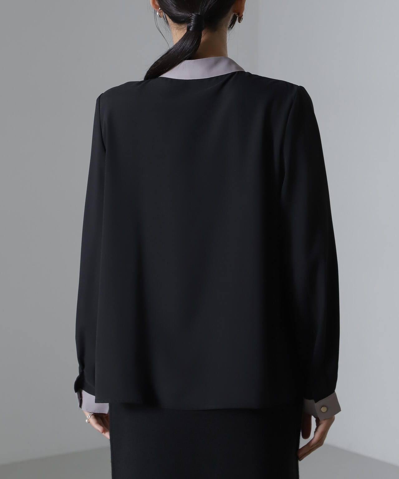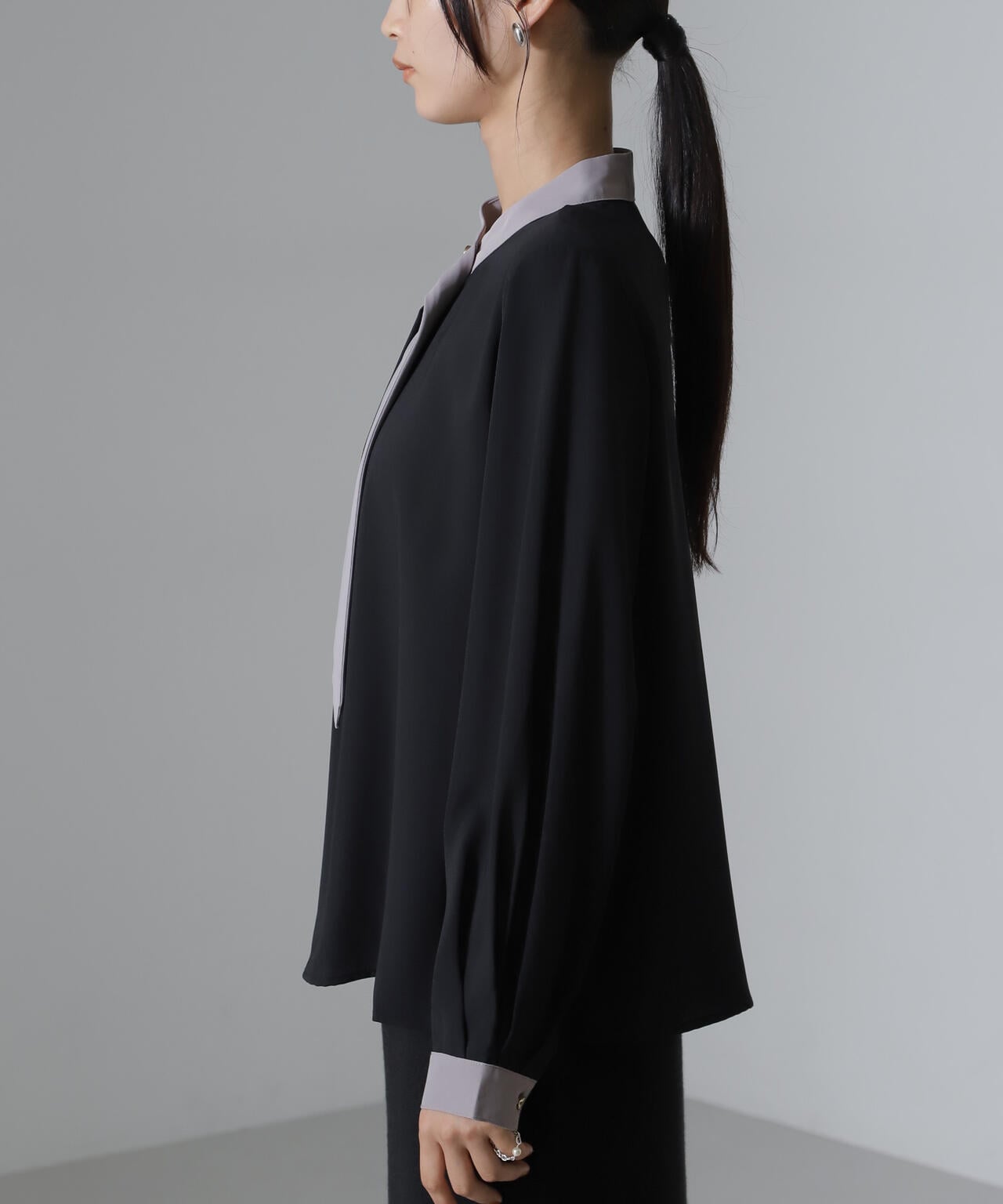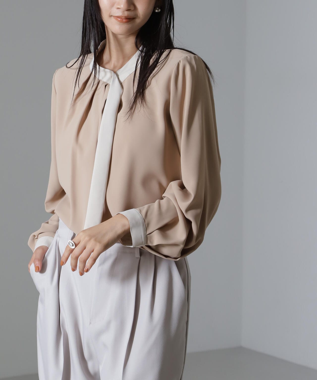 衿と袖のバイカラーとフロントに入ったタックが華やかなボータイブラウス。シンプルながらも上品さと女性らしい雰囲気を演出してくれるので、ON/OFFで様になる着映えアイテムです。