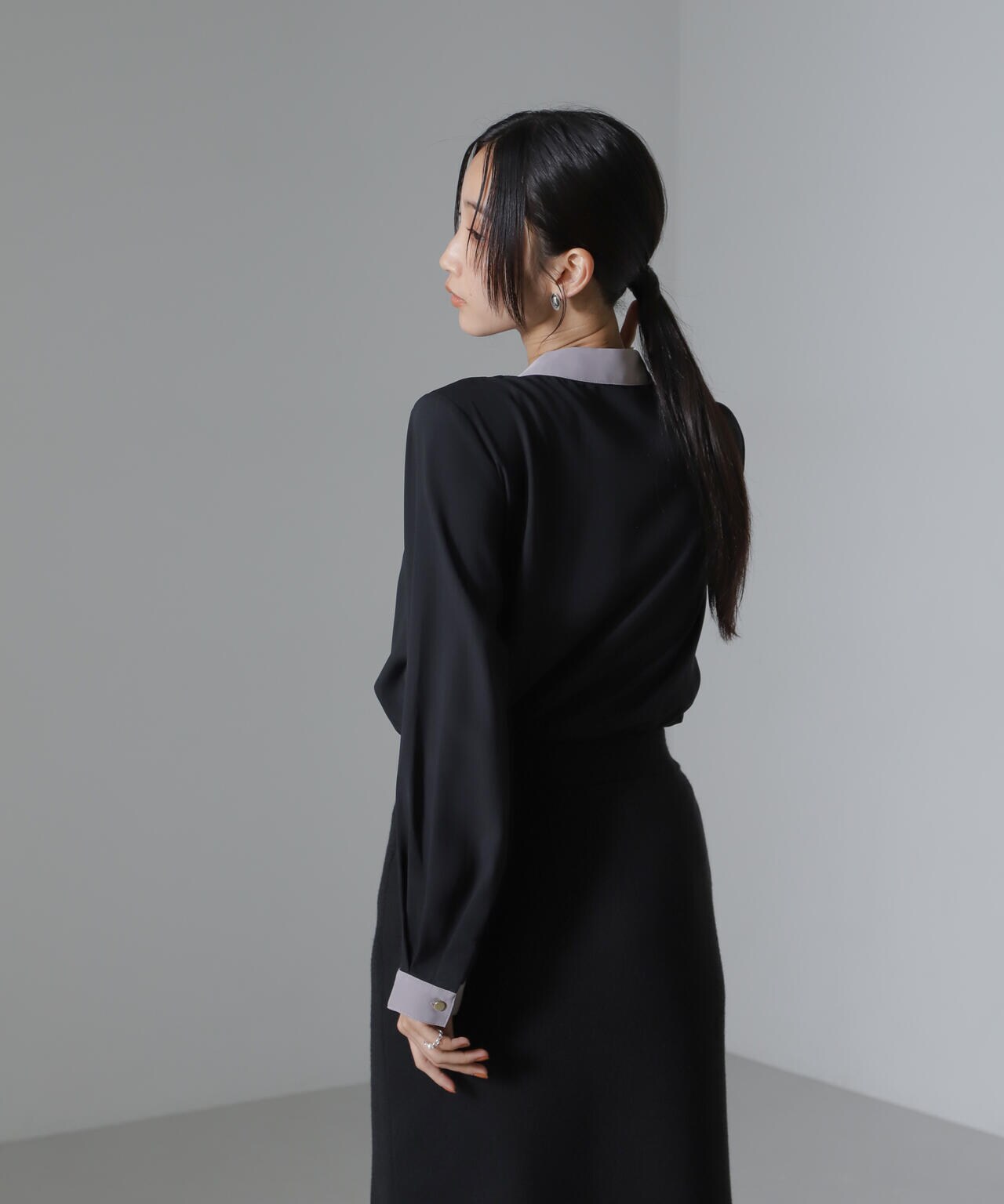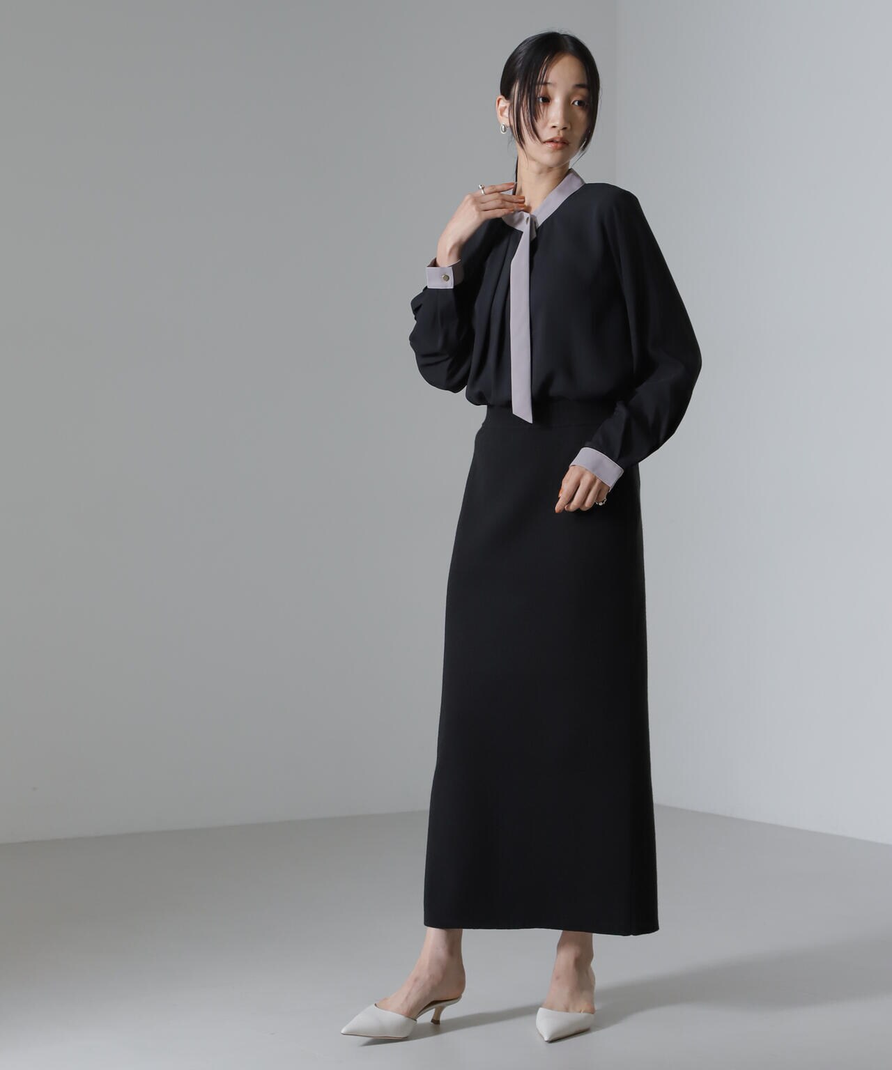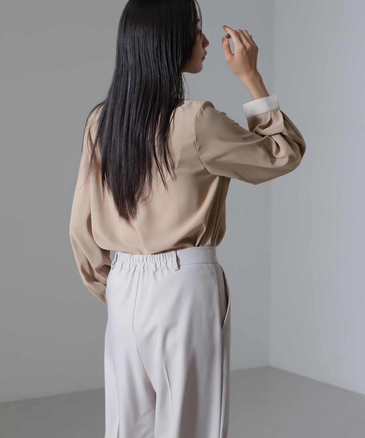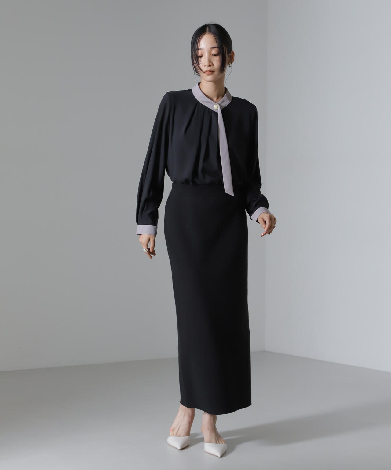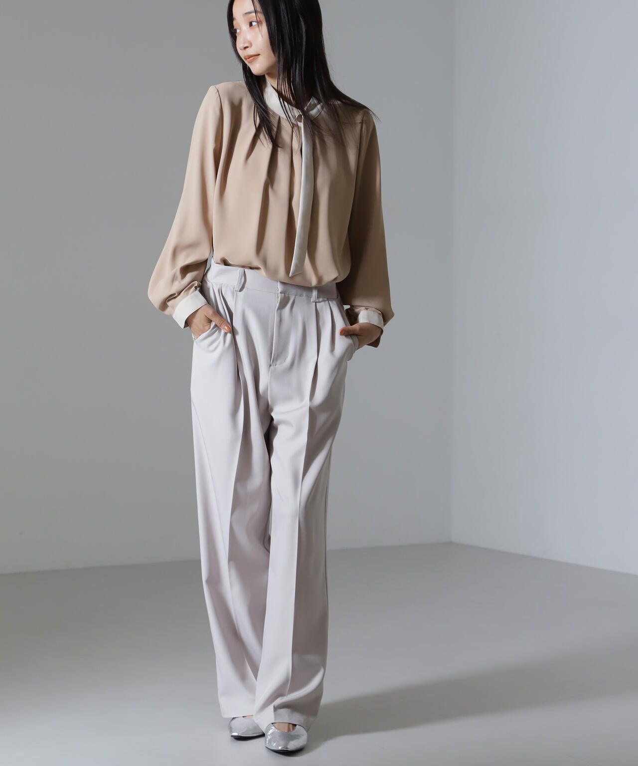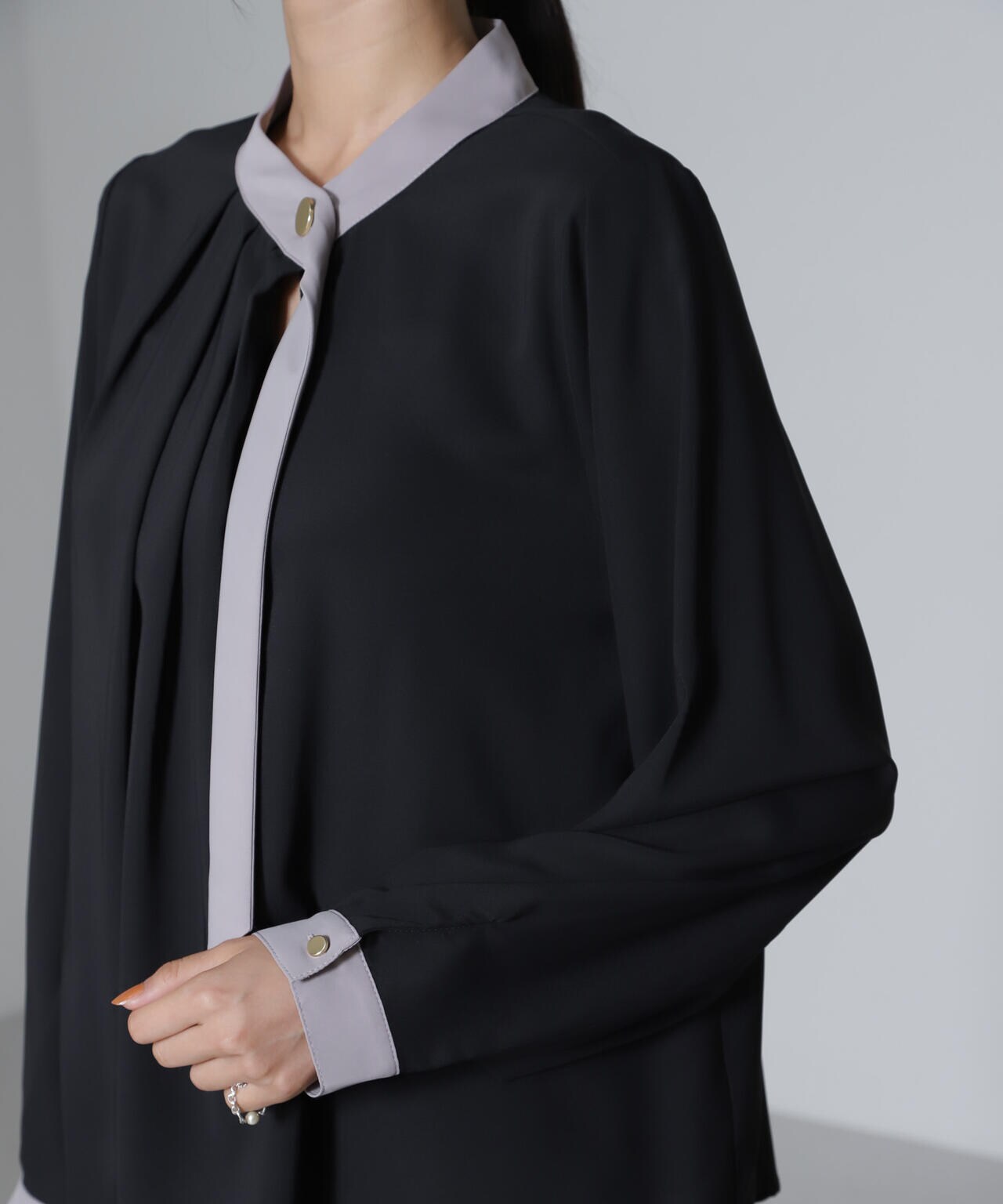 衿と袖のバイカラーとフロントに入ったタックが華やかなボータイブラウス。シンプルながらも上品さと女性らしい雰囲気を演出してくれるので、ON/OFFで様になる着映えアイテムです。