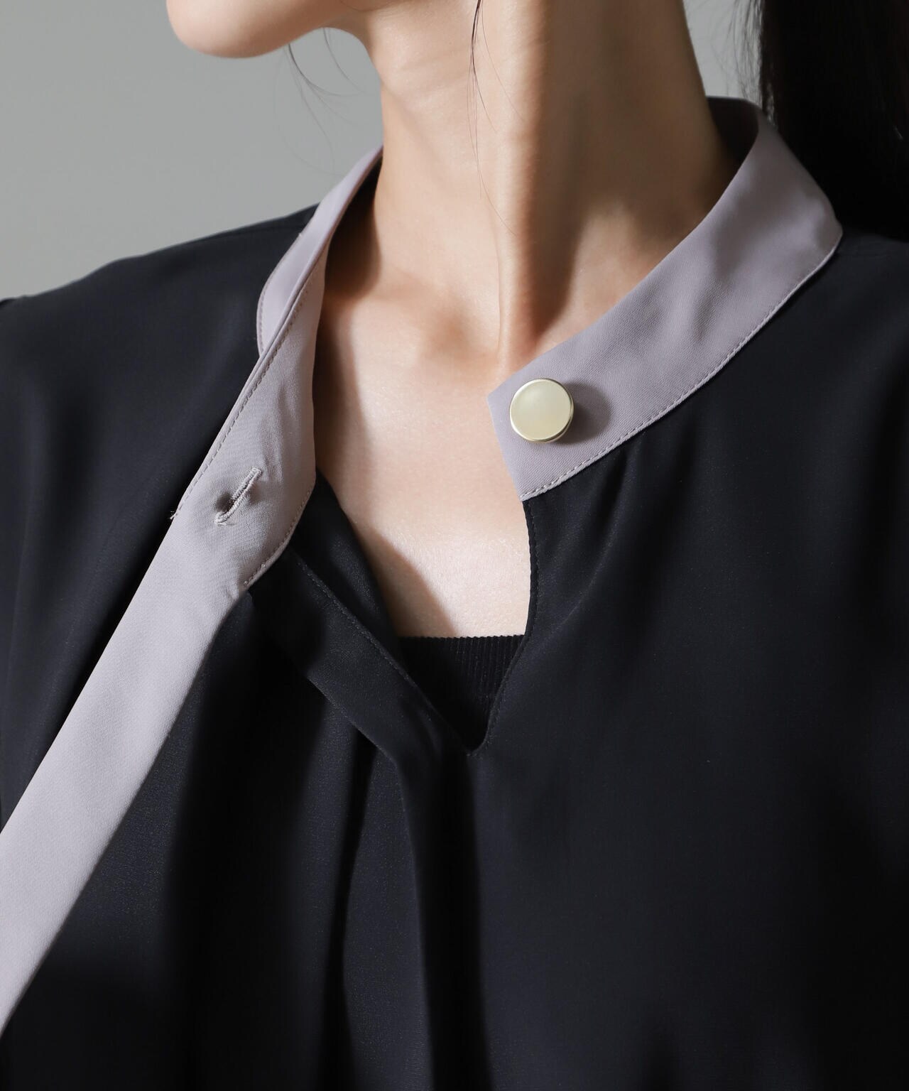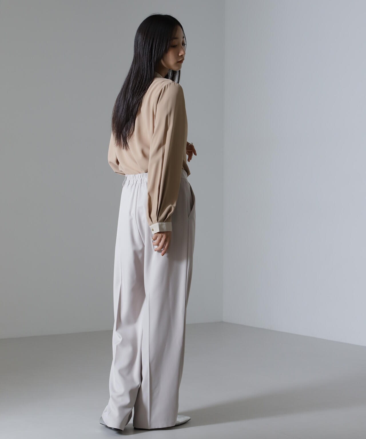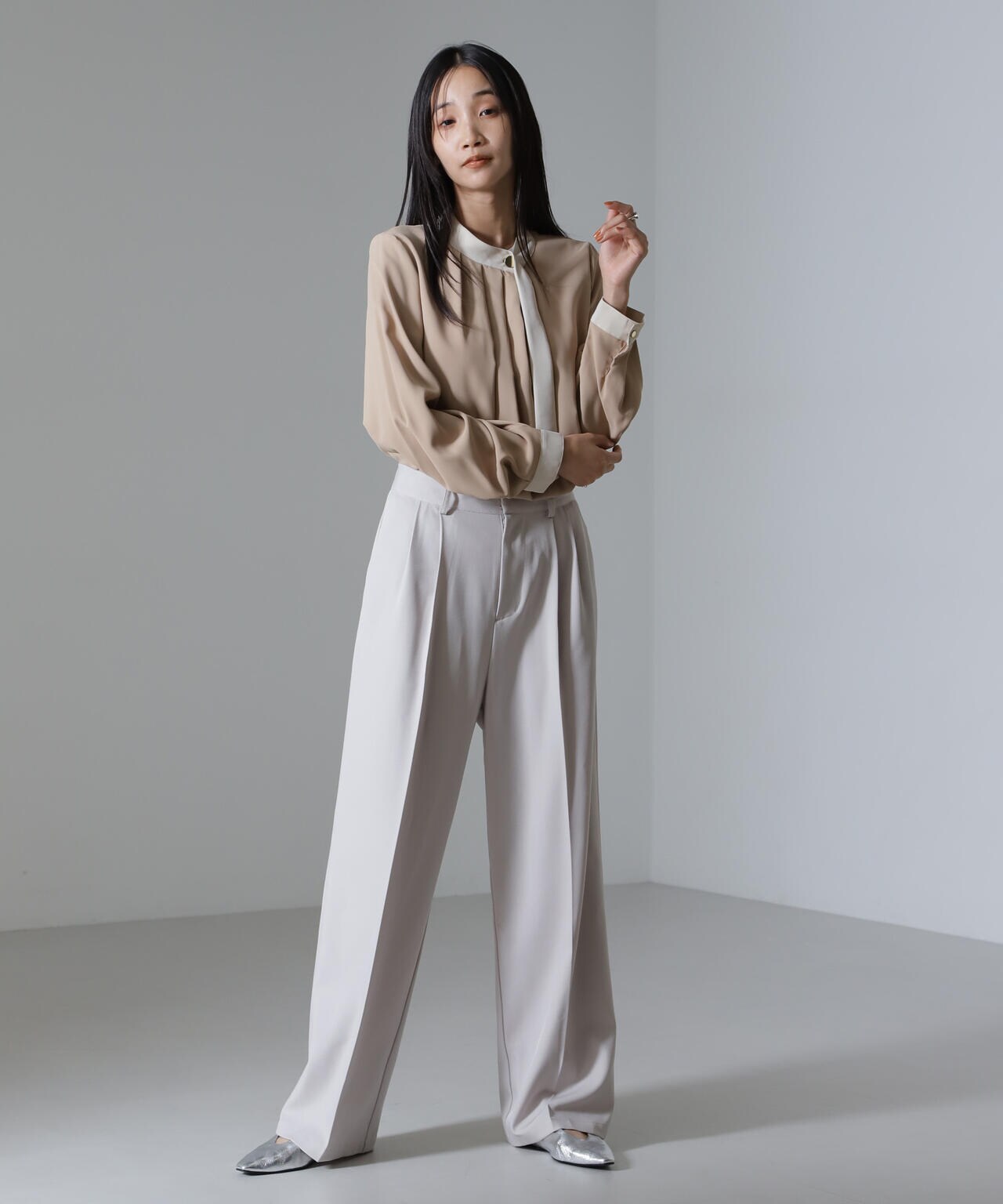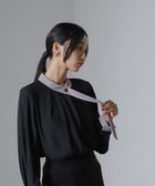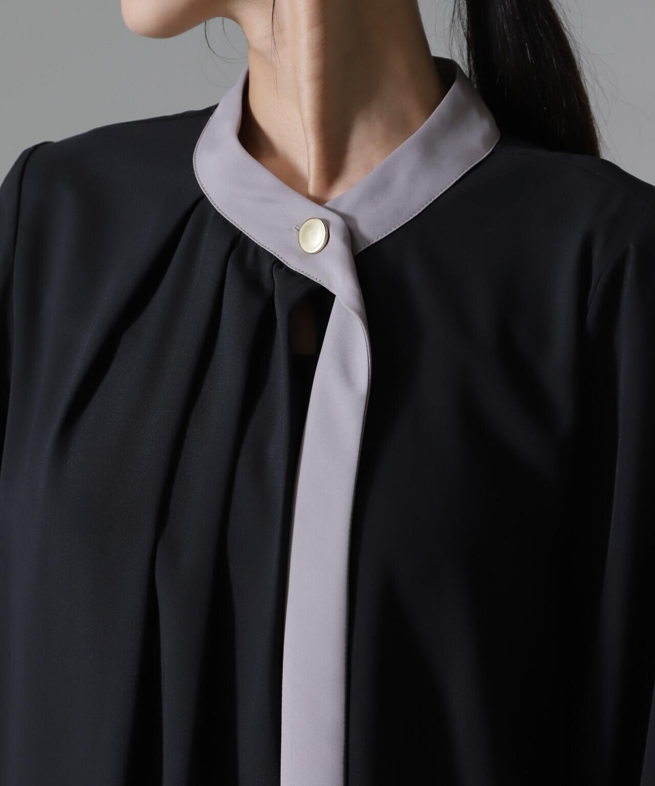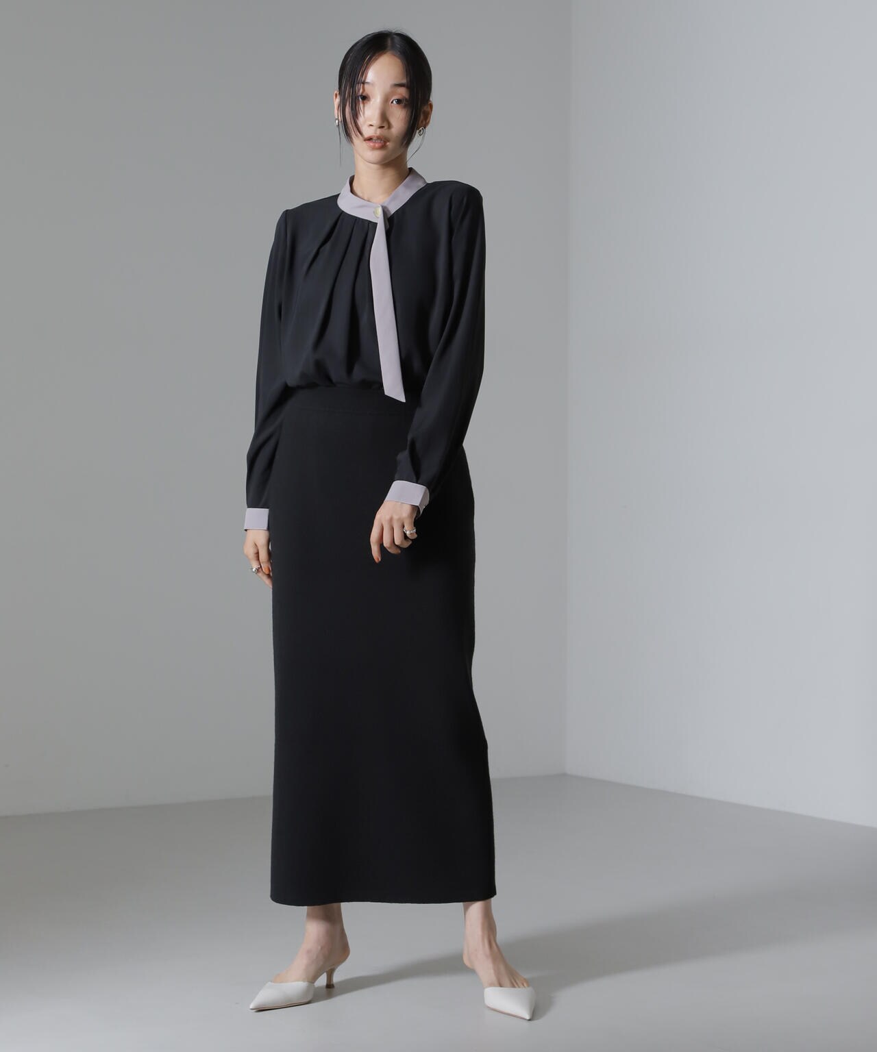 衿と袖のバイカラーとフロントに入ったタックが華やかなボータイブラウス。シンプルながらも上品さと女性らしい雰囲気を演出してくれるので、ON/OFFで様になる着映えアイテムです。