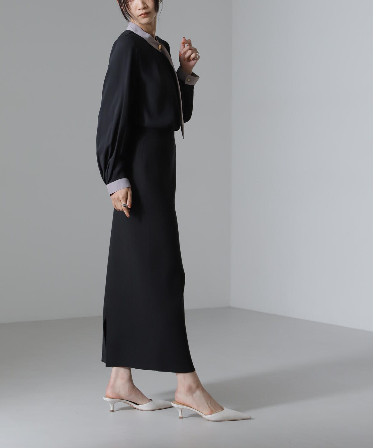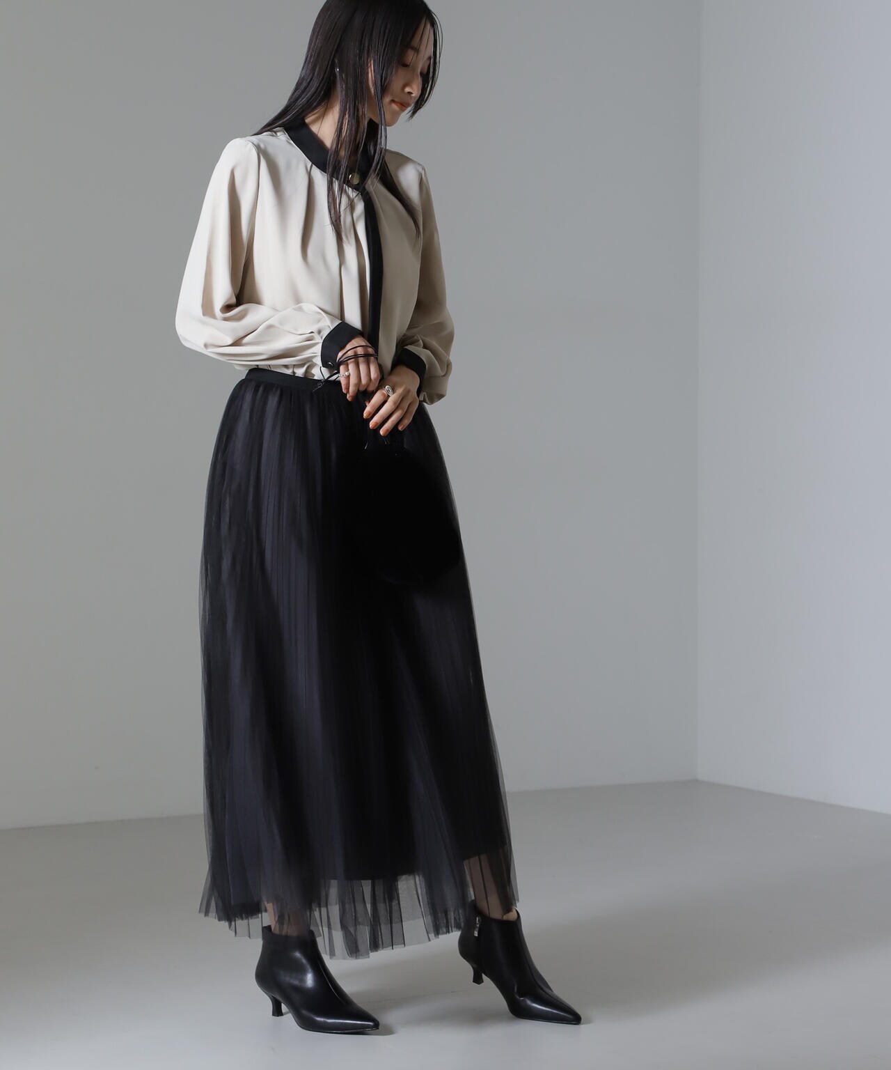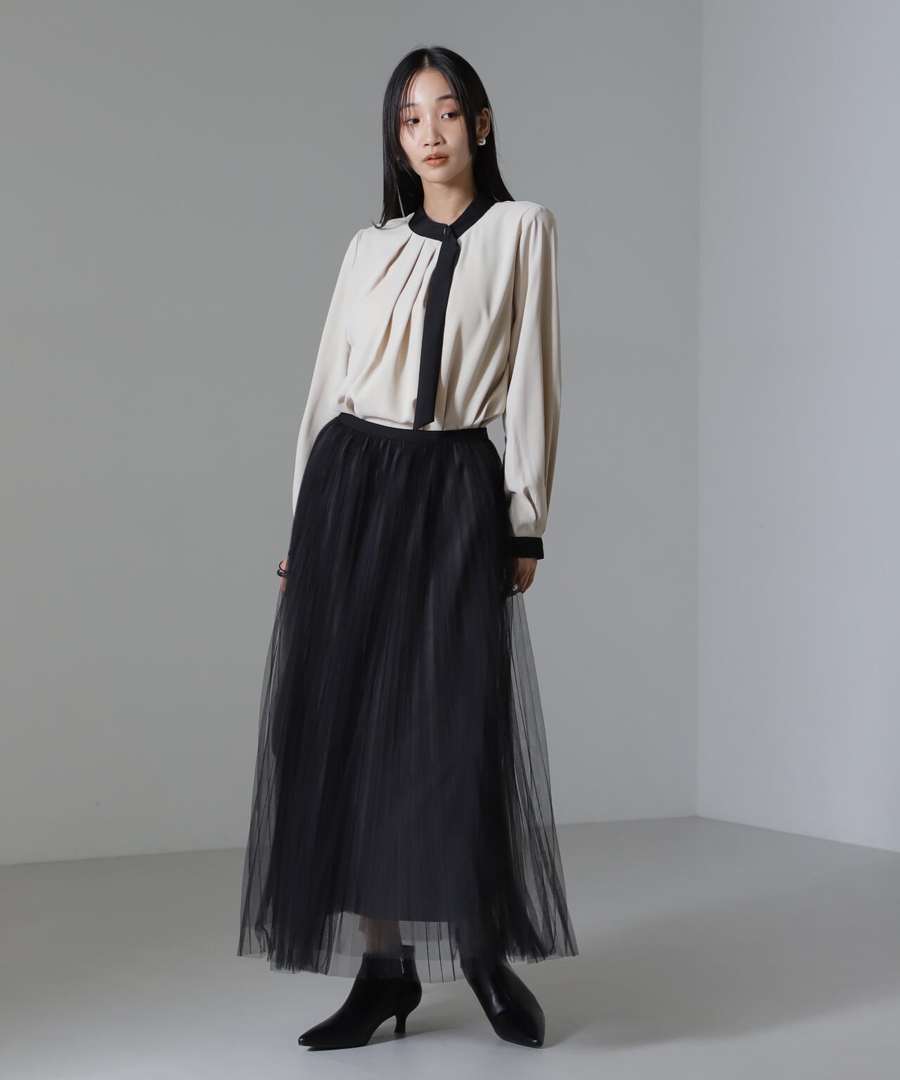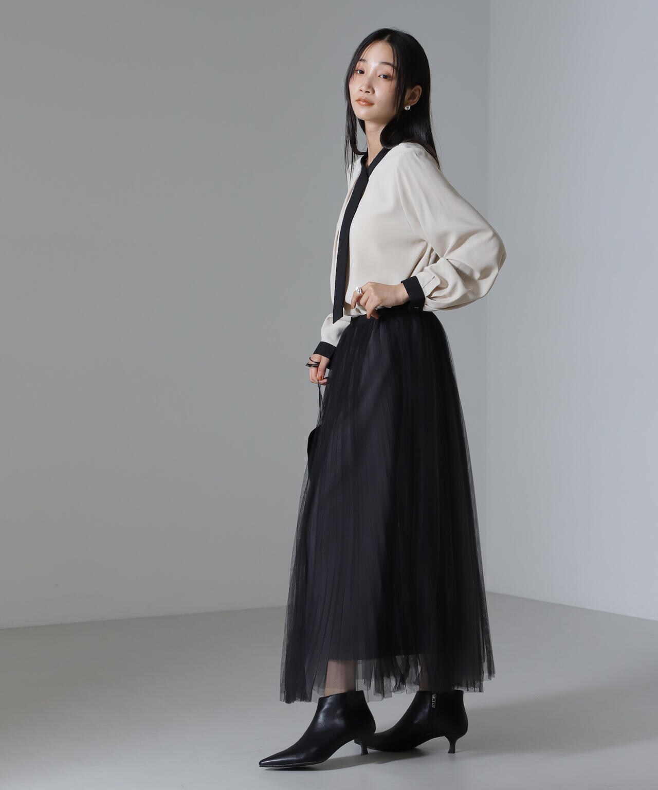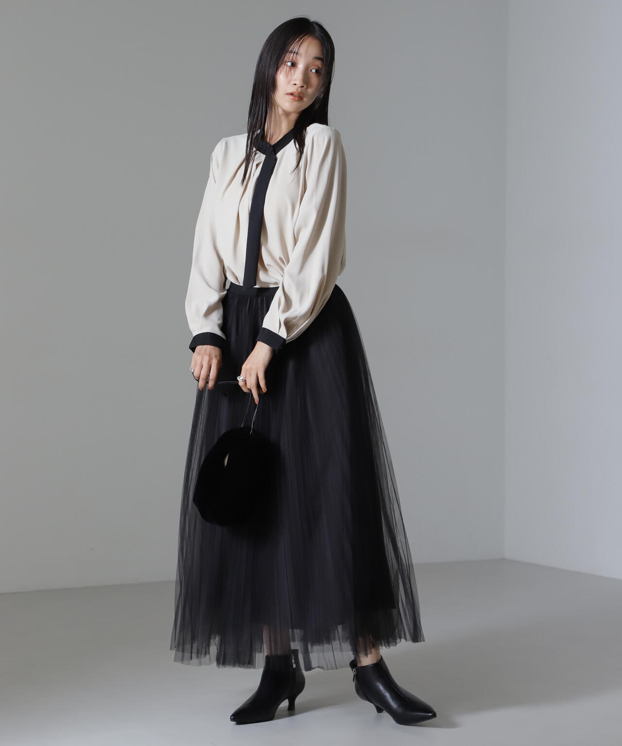 衿と袖のバイカラーとフロントに入ったタックが華やかなボータイブラウス。シンプルながらも上品さと女性らしい雰囲気を演出してくれるので、ON/OFFで様になる着映えアイテムです。