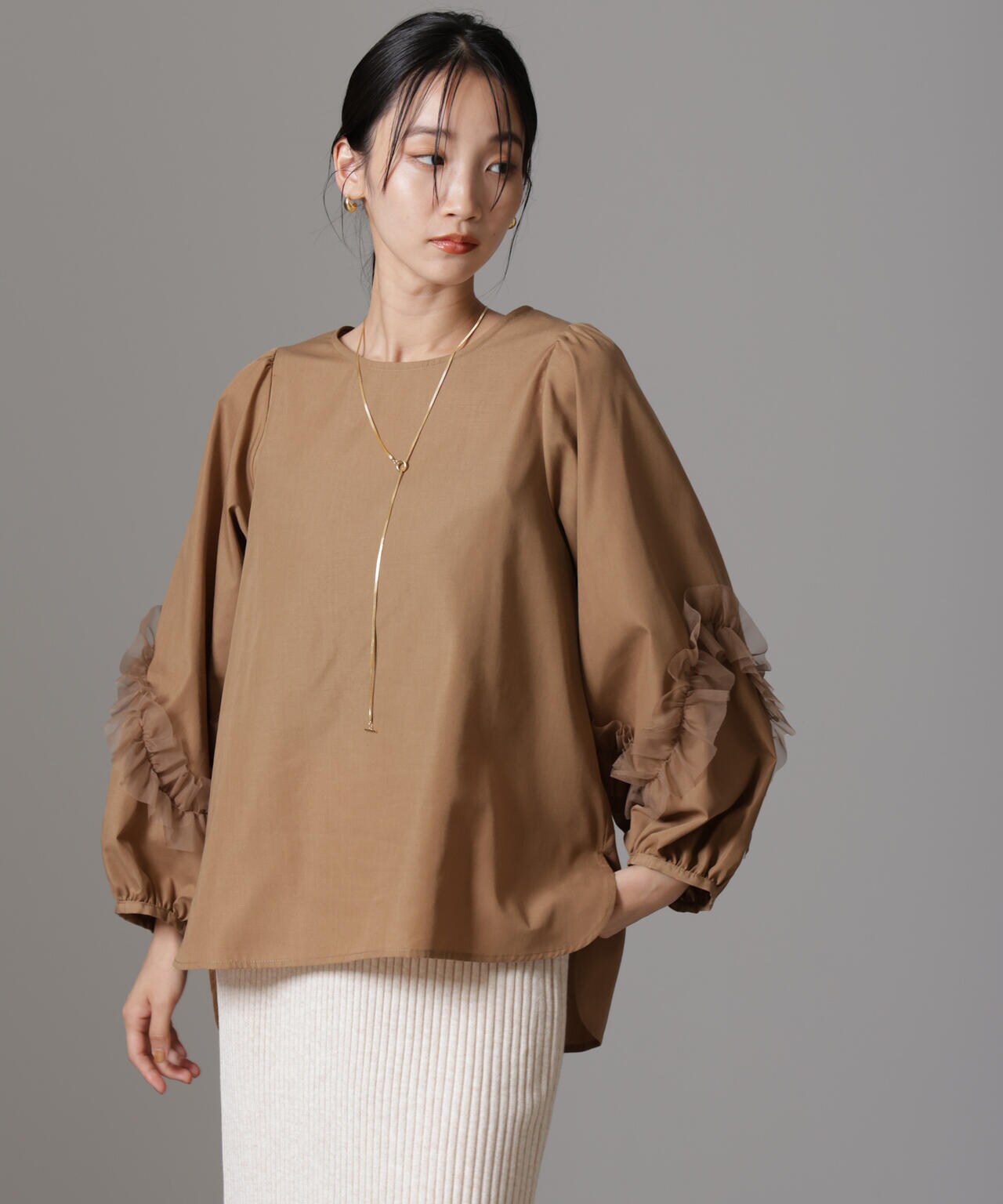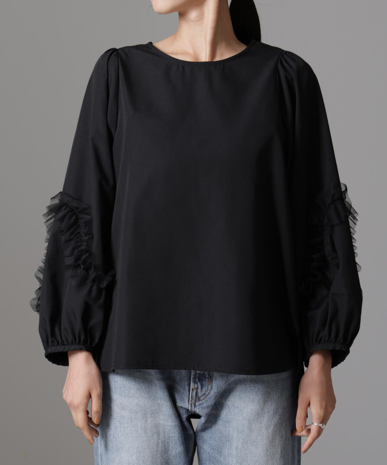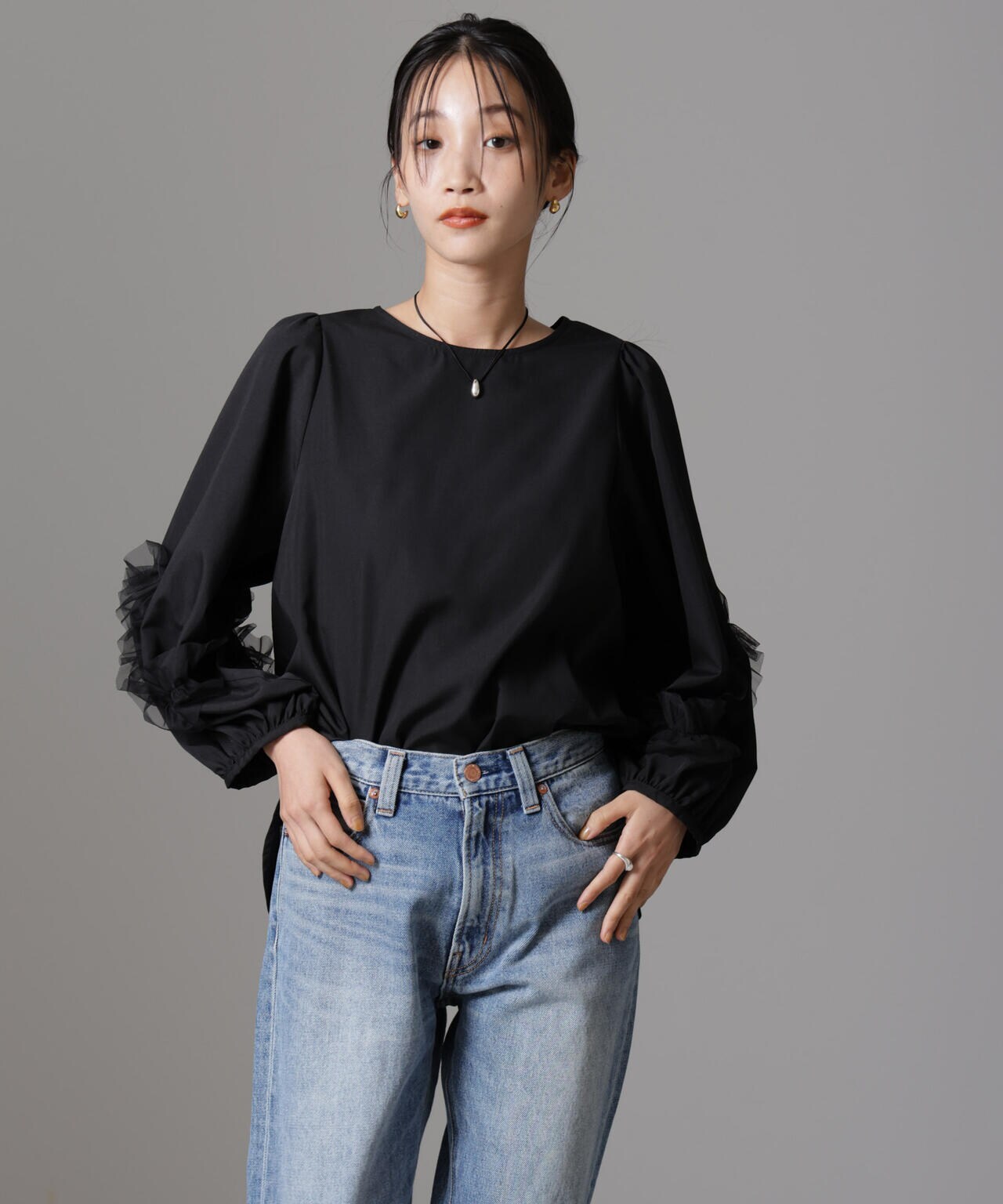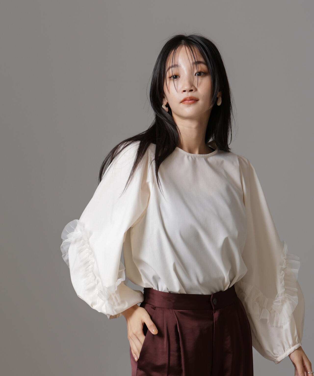ボリューム感のある袖のチュールフリルデザインがポイントのブラウス。首周りのすっきりしたデザインと袖のボリューム感のバランスが良く、甘くなりすぎず着用できるのがポイント。