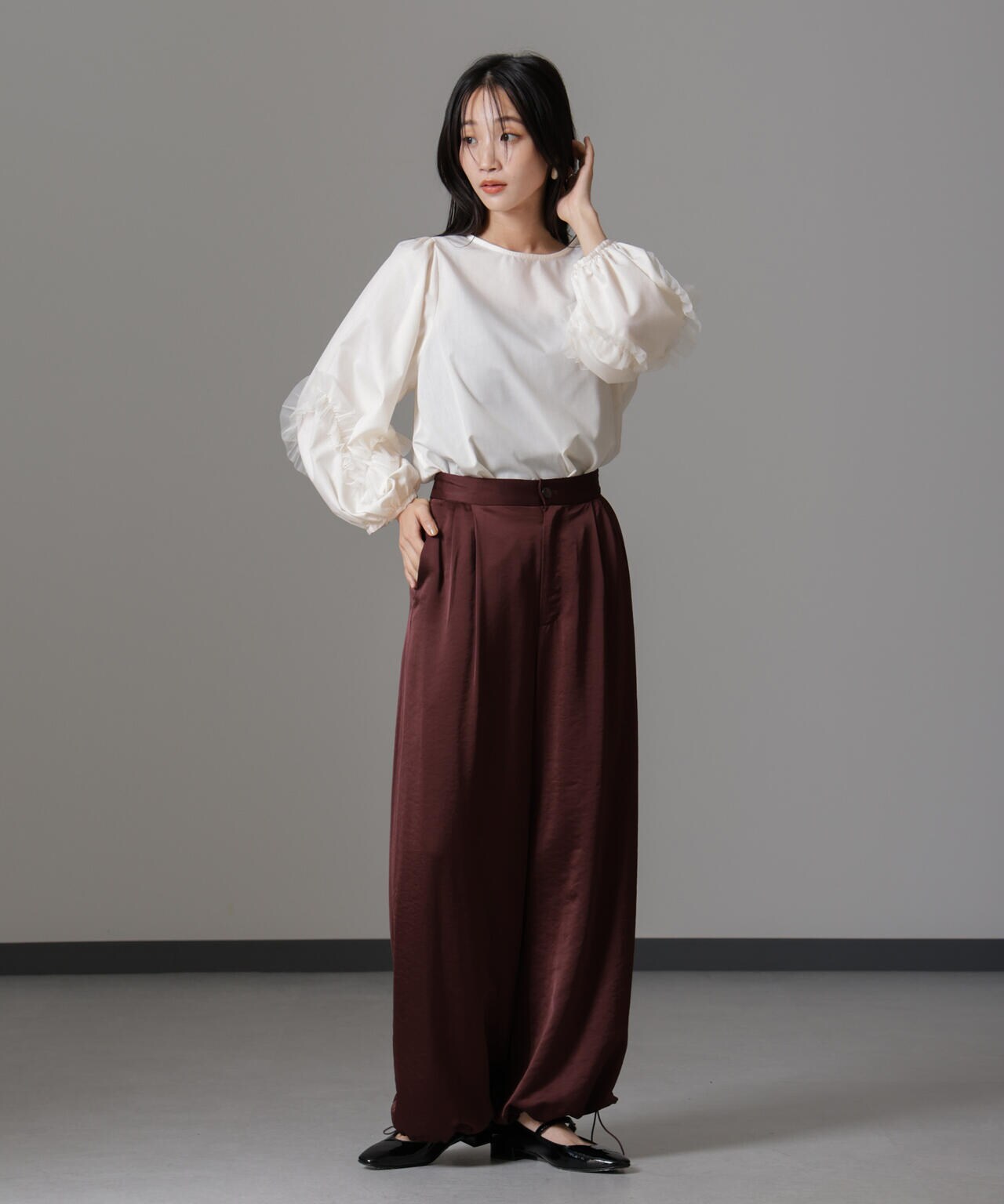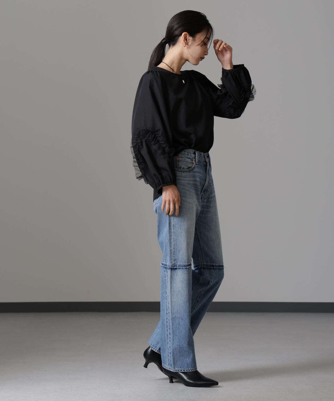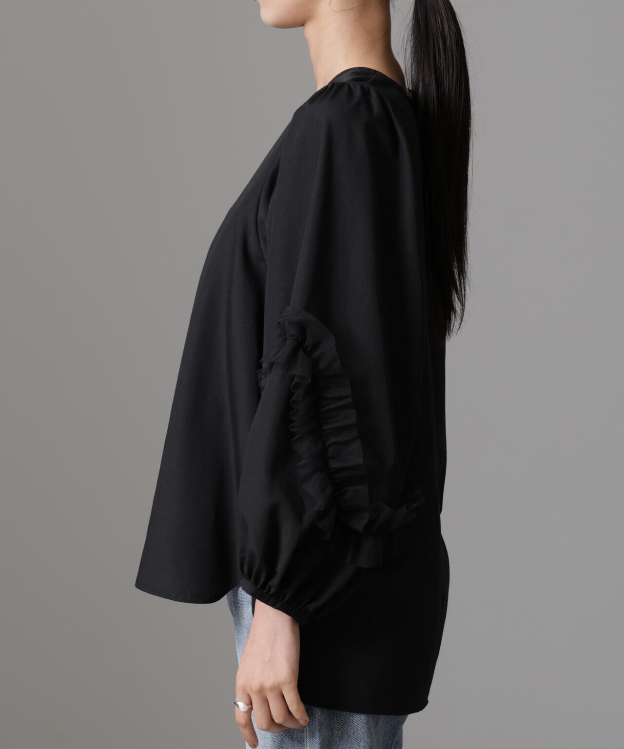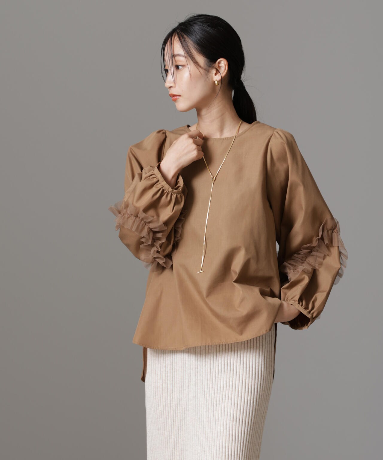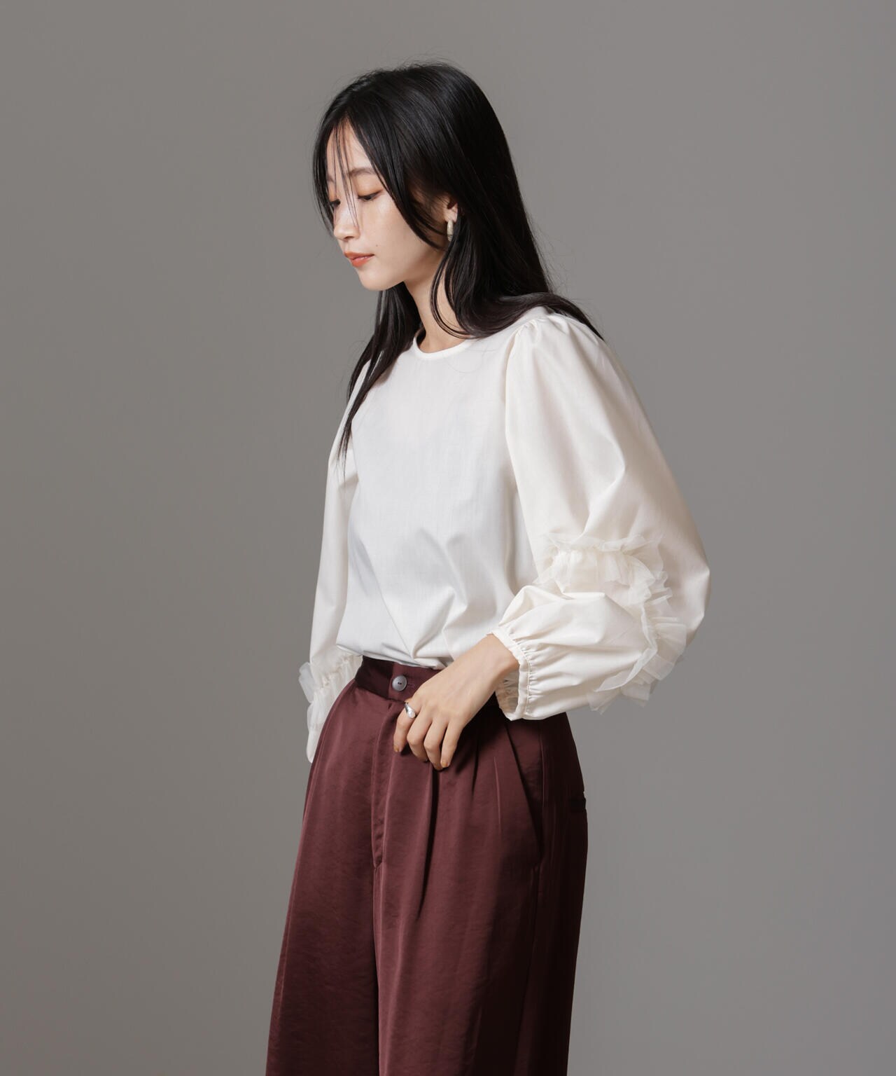 ボリューム感のある袖のチュールフリルデザインがポイントのブラウス。首周りのすっきりしたデザインと袖のボリューム感のバランスが良く、甘くなりすぎず着用できるのがポイント。