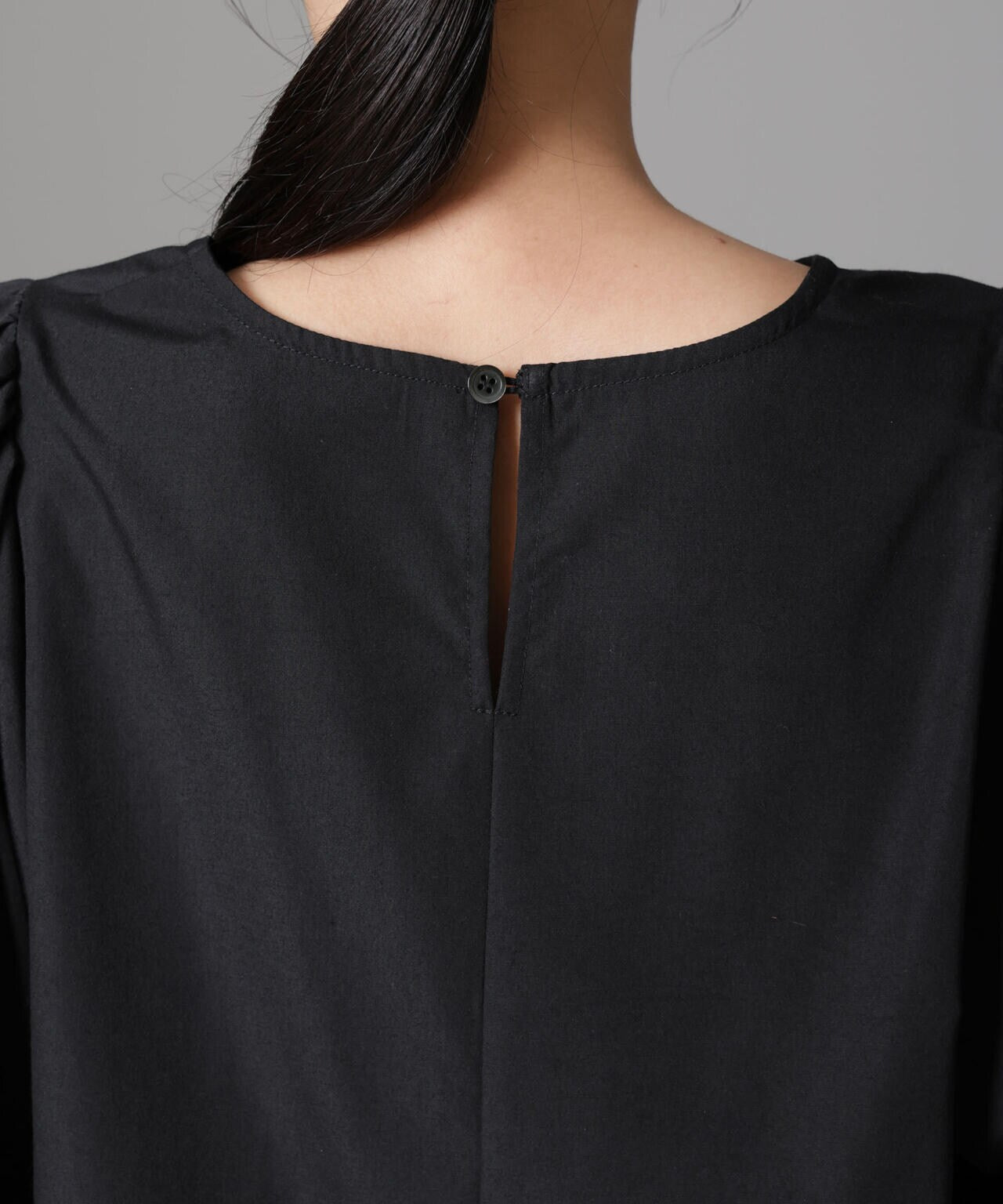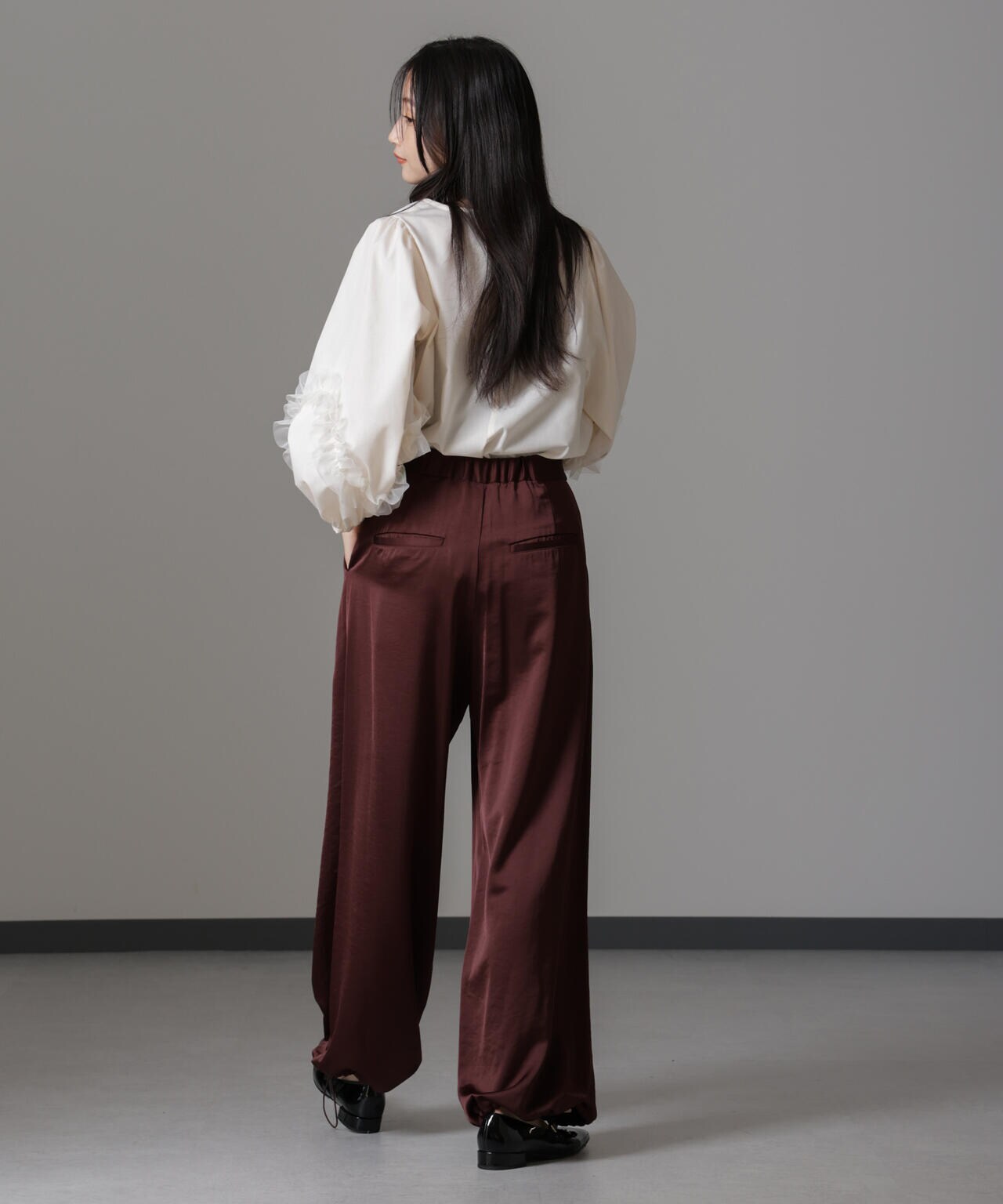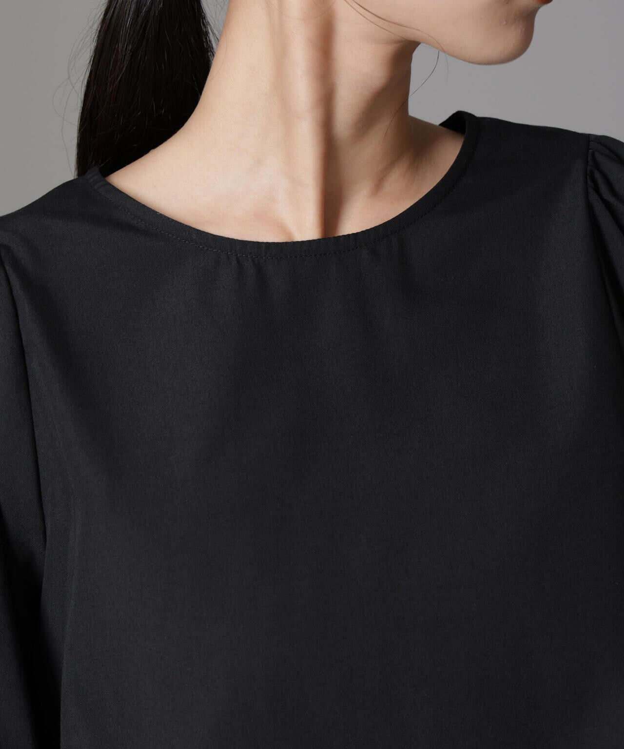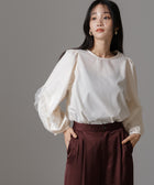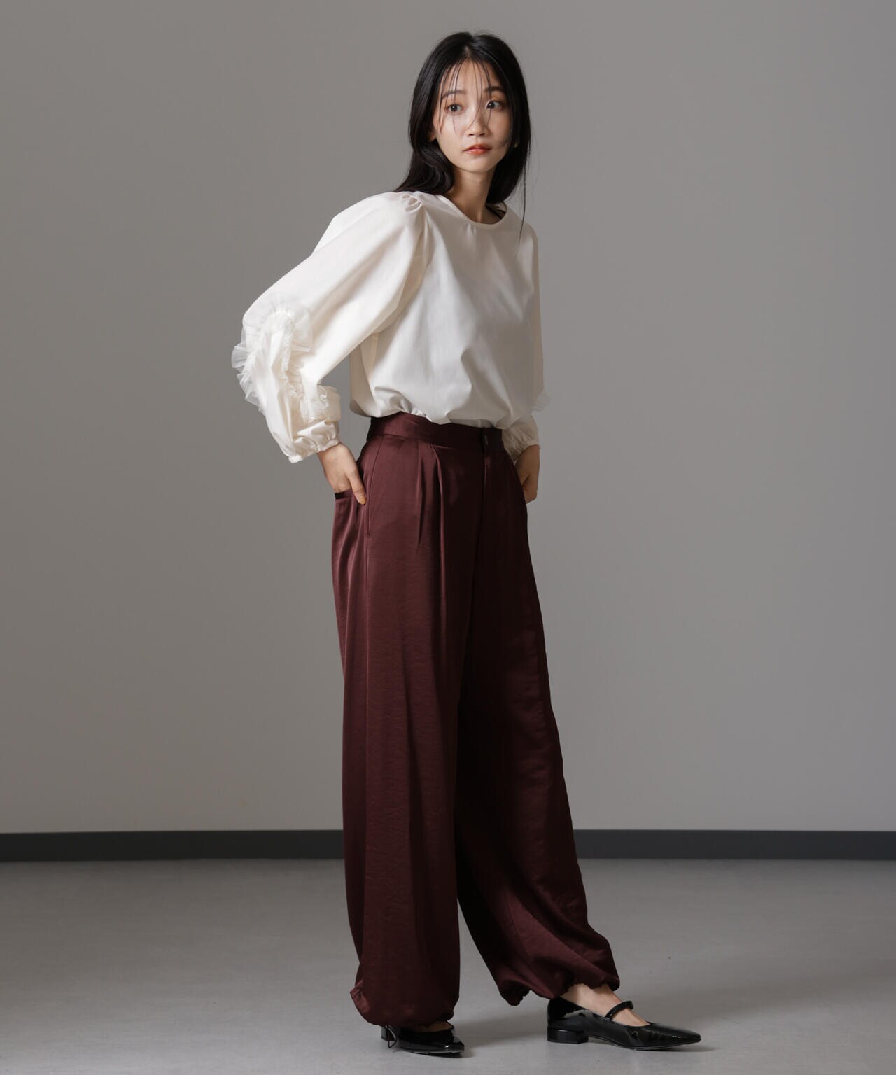 ボリューム感のある袖のチュールフリルデザインがポイントのブラウス。首周りのすっきりしたデザインと袖のボリューム感のバランスが良く、甘くなりすぎず着用できるのがポイント。