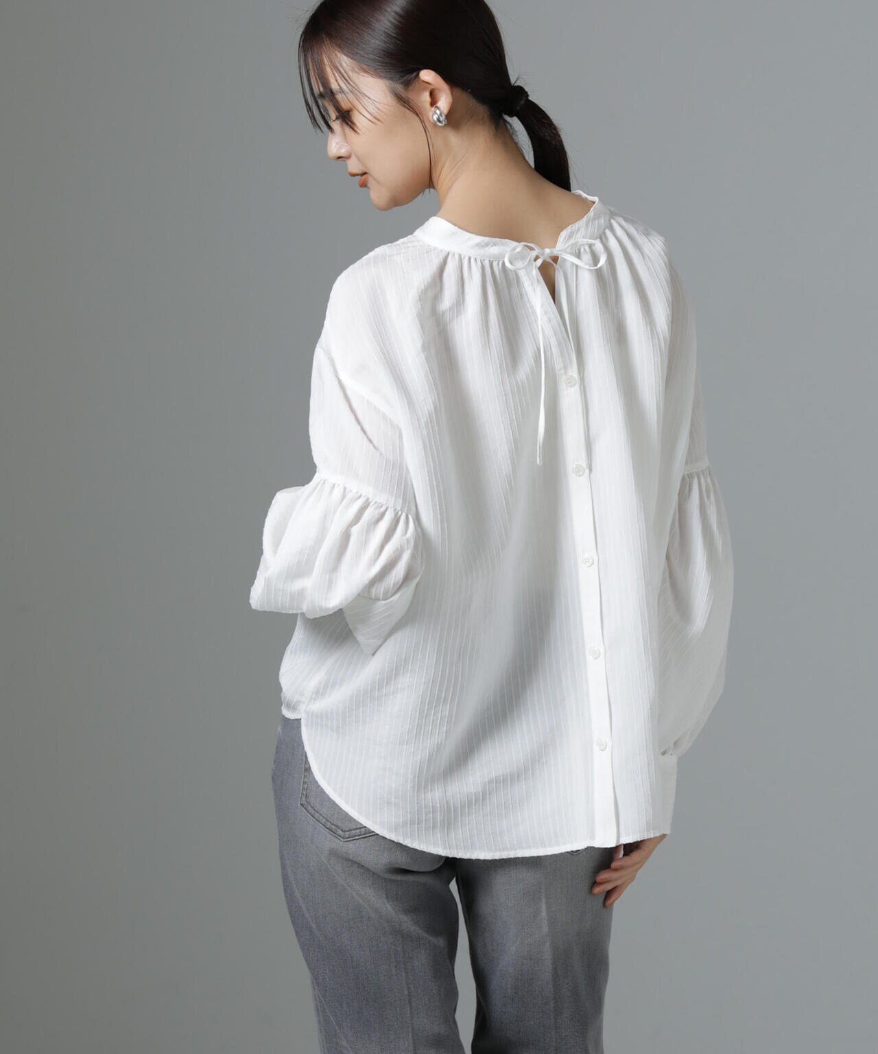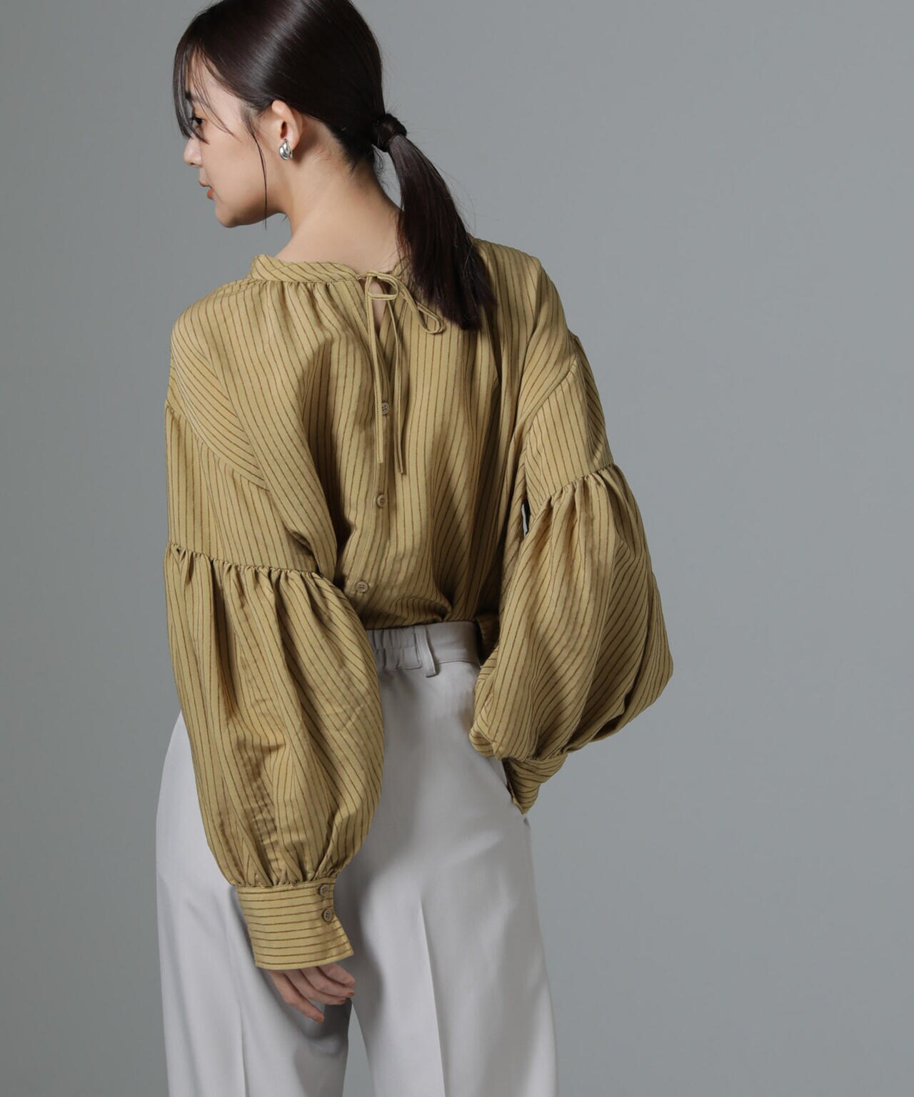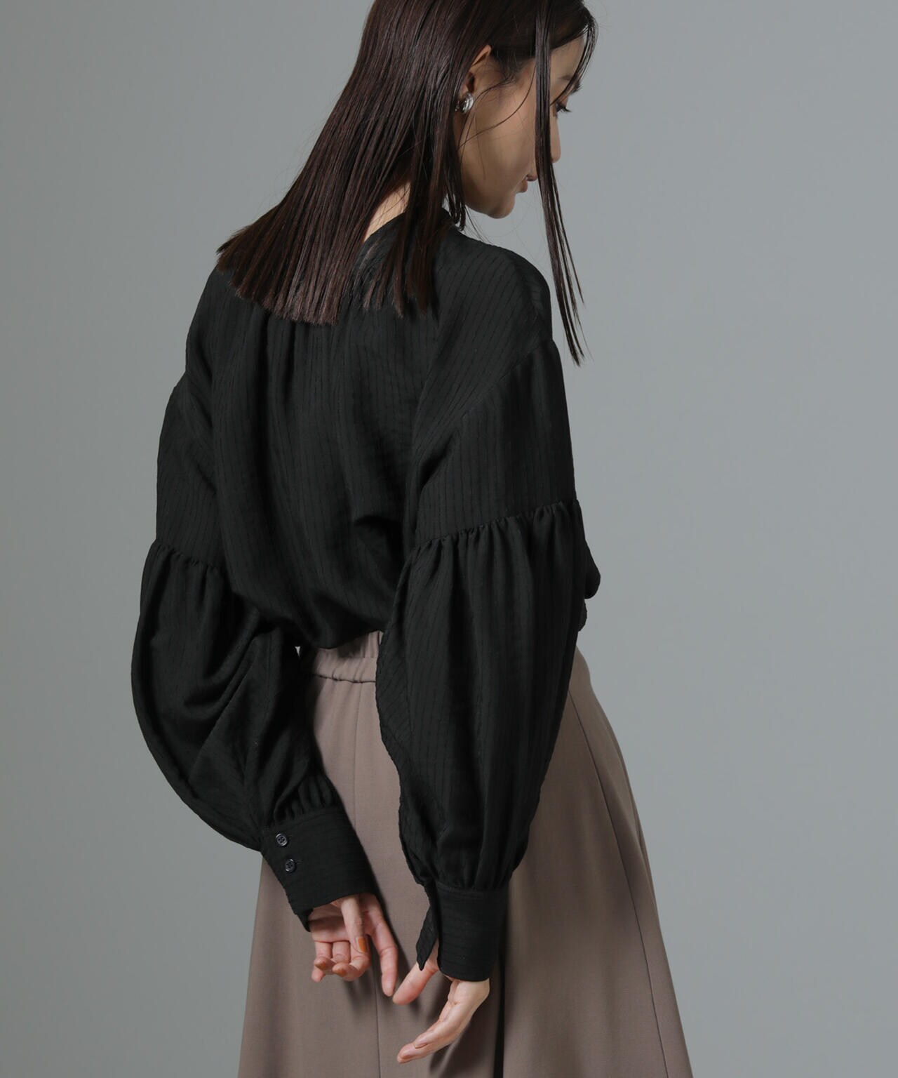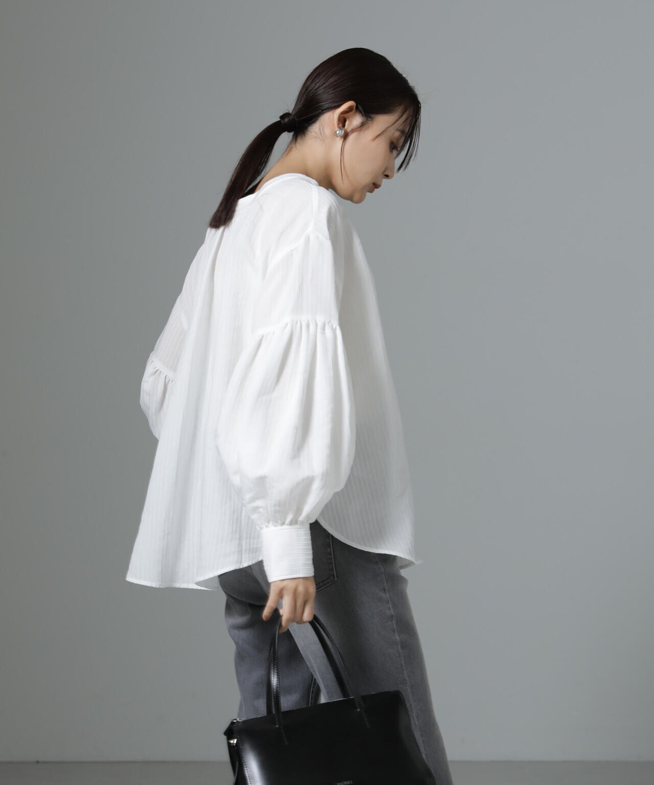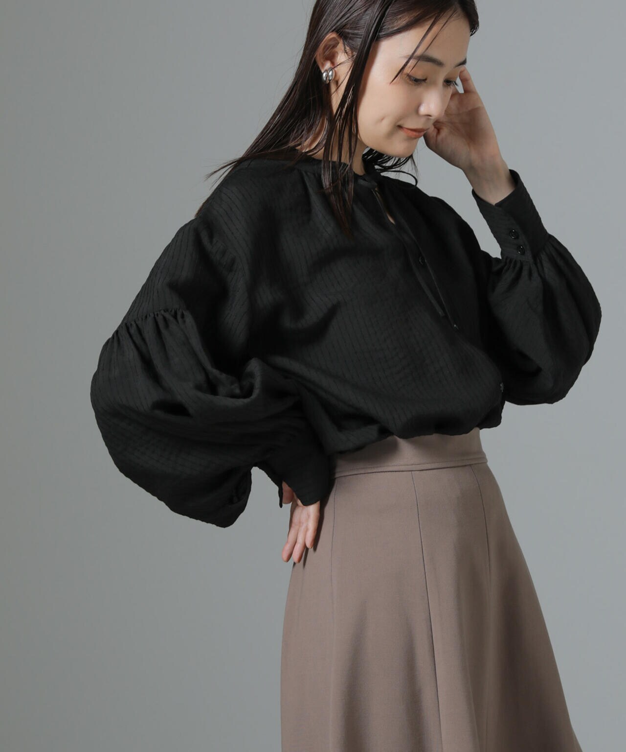 モールストライプデザインがポイントの前後2wayブラウス。リボンを外してスキッパー衿にして、抜け感を演出しても素敵◎。立体的なバルーンスリーブが、華やかさをプラスし一枚でしっかりとサマになるアイテムです。