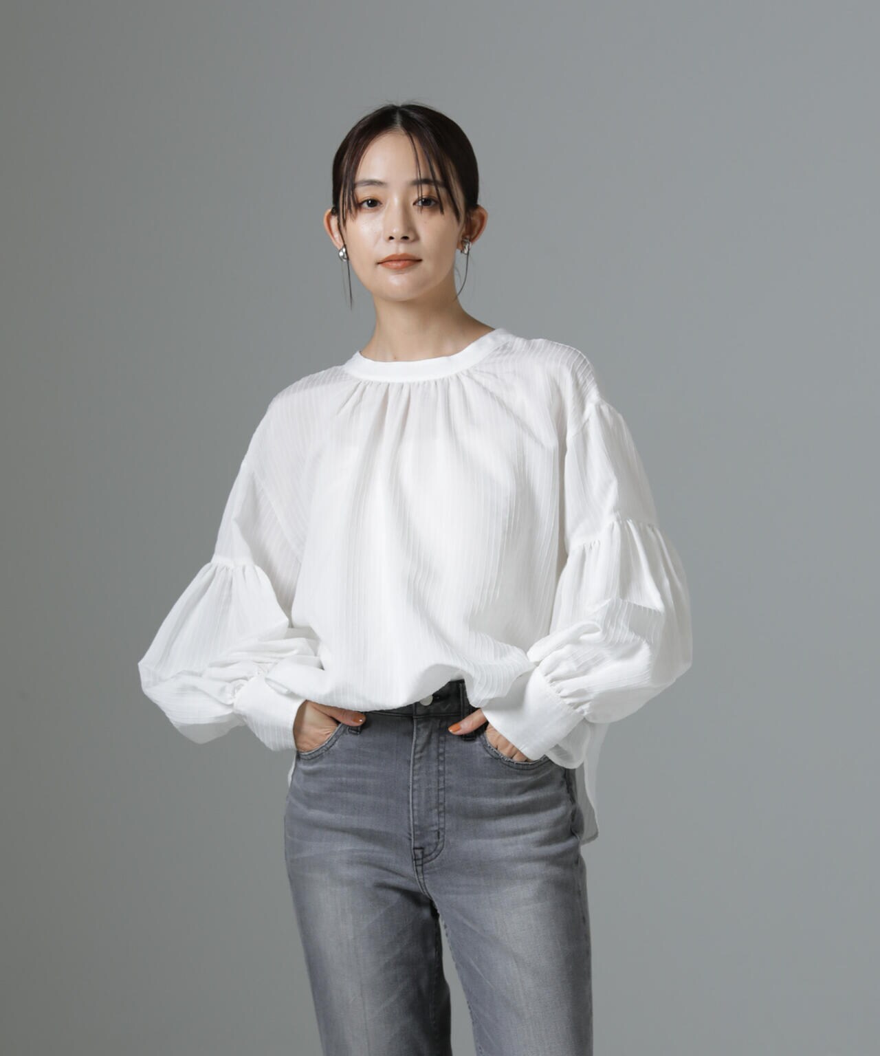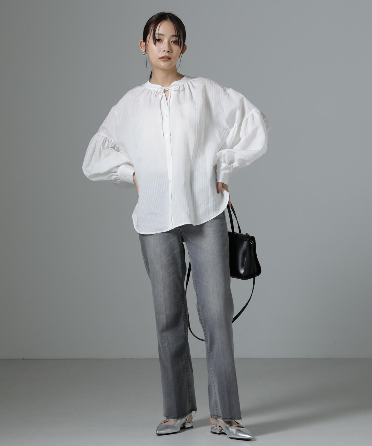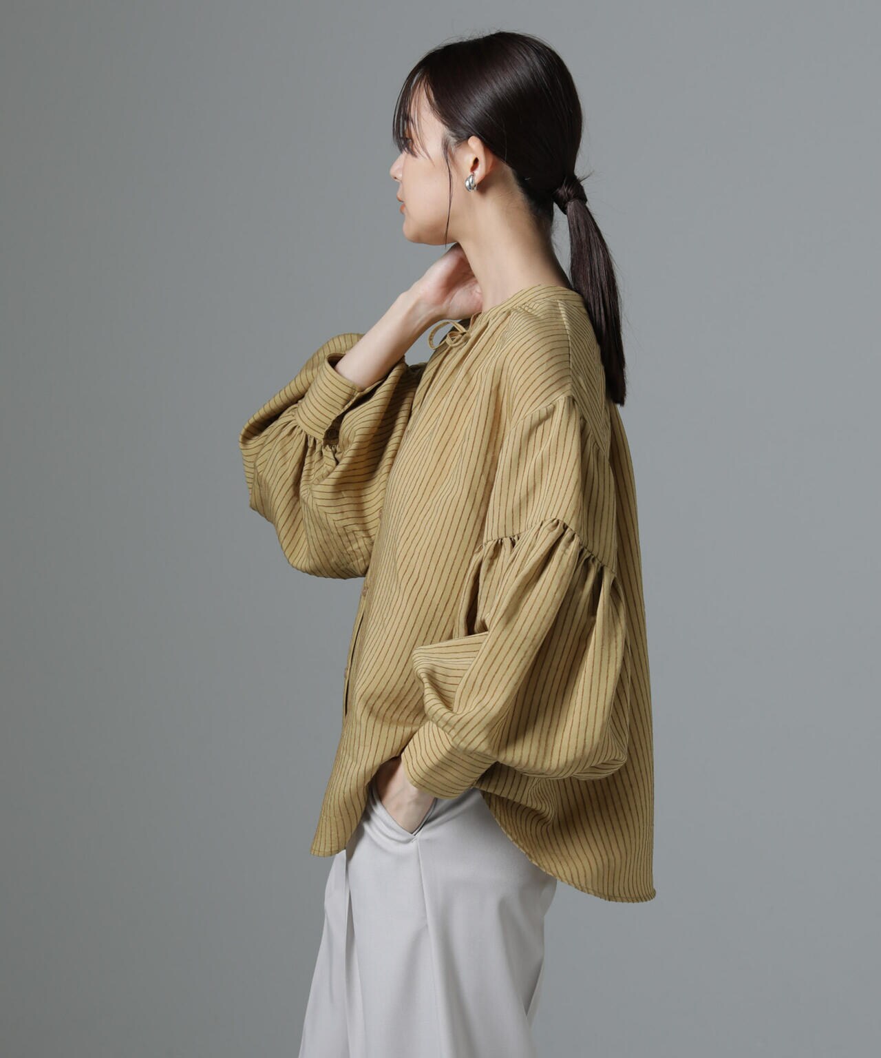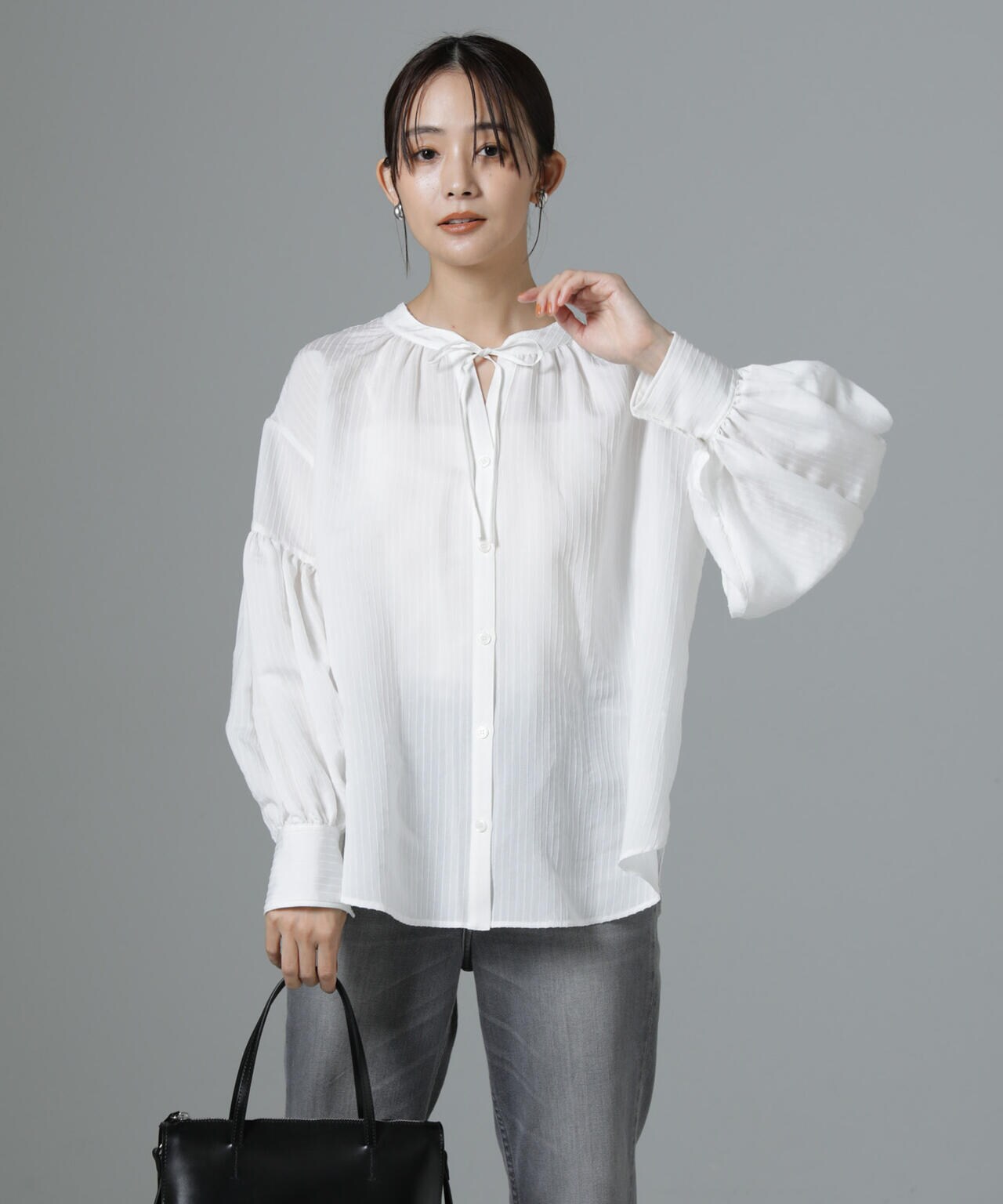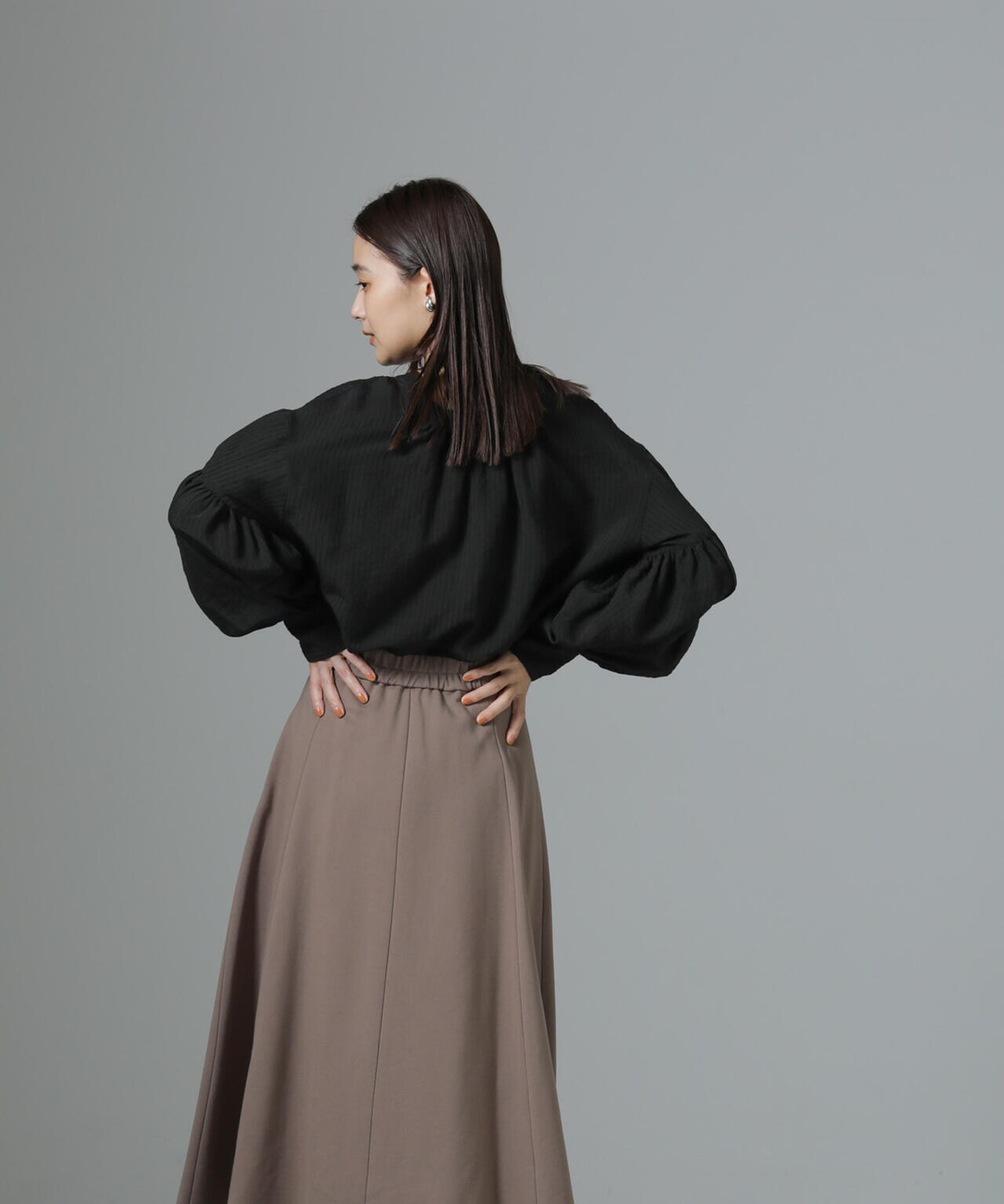 モールストライプデザインがポイントの前後2wayブラウス。リボンを外してスキッパー衿にして、抜け感を演出しても素敵◎。立体的なバルーンスリーブが、華やかさをプラスし一枚でしっかりとサマになるアイテムです。