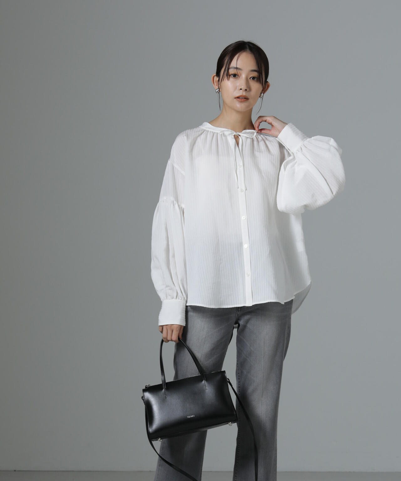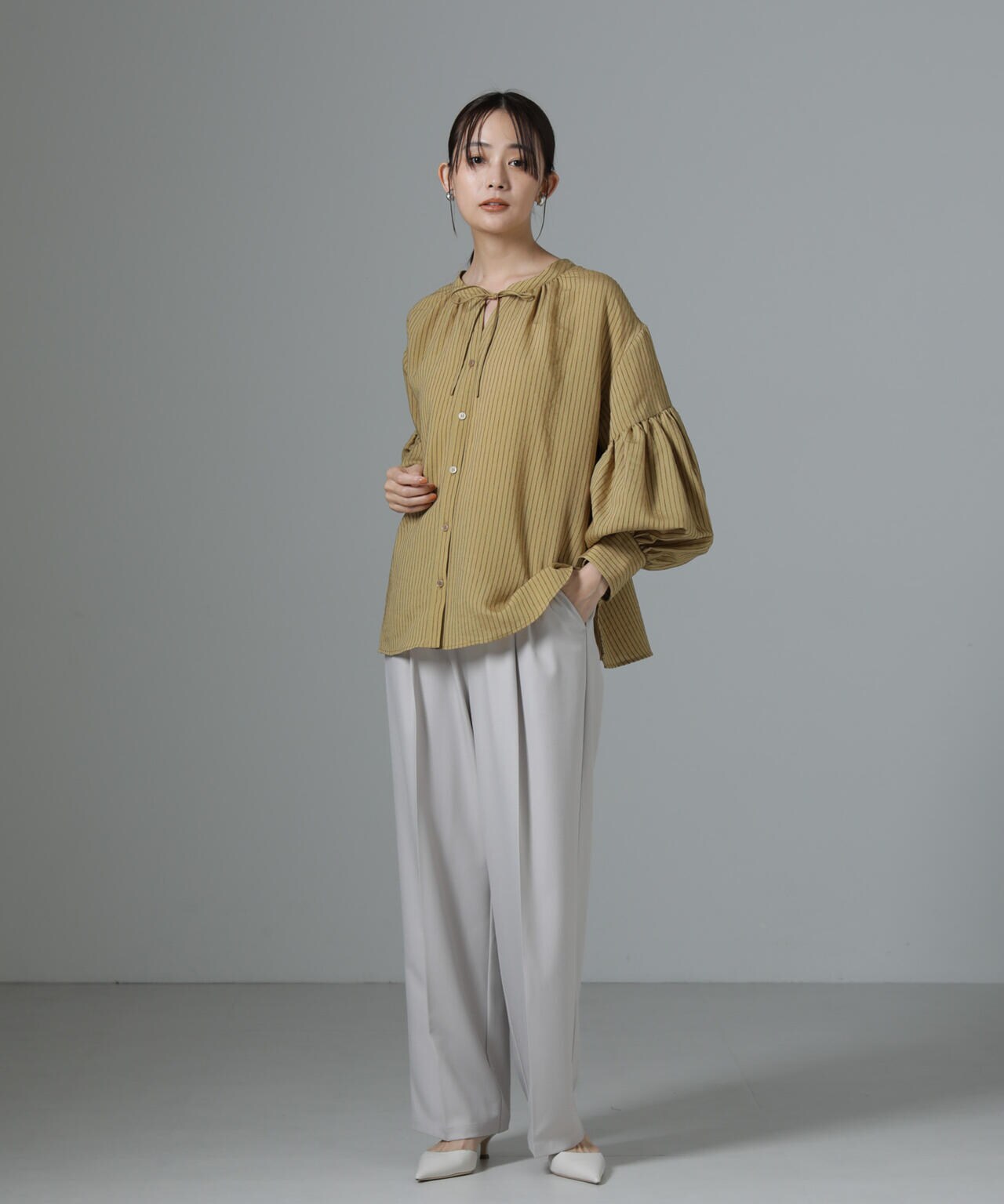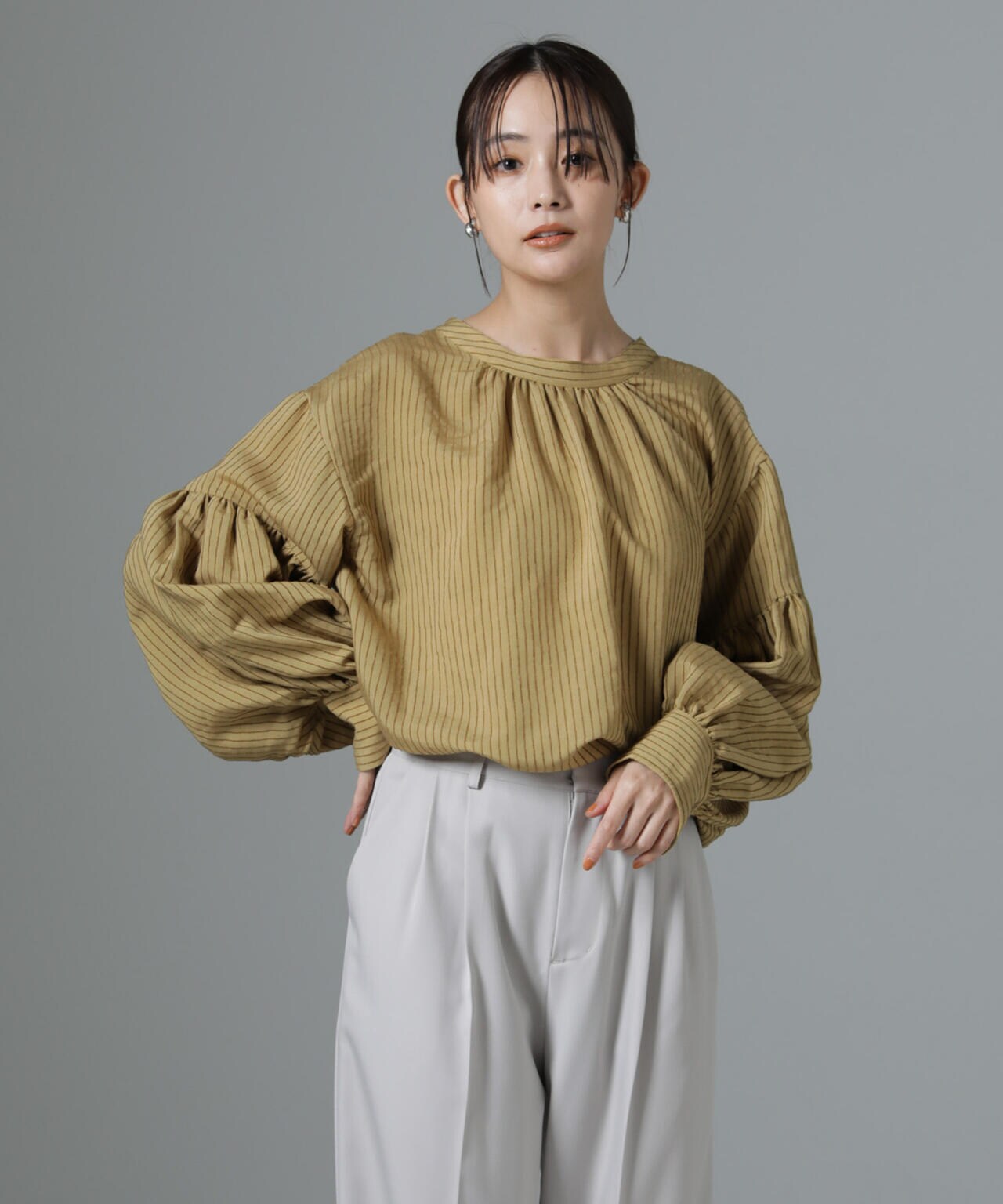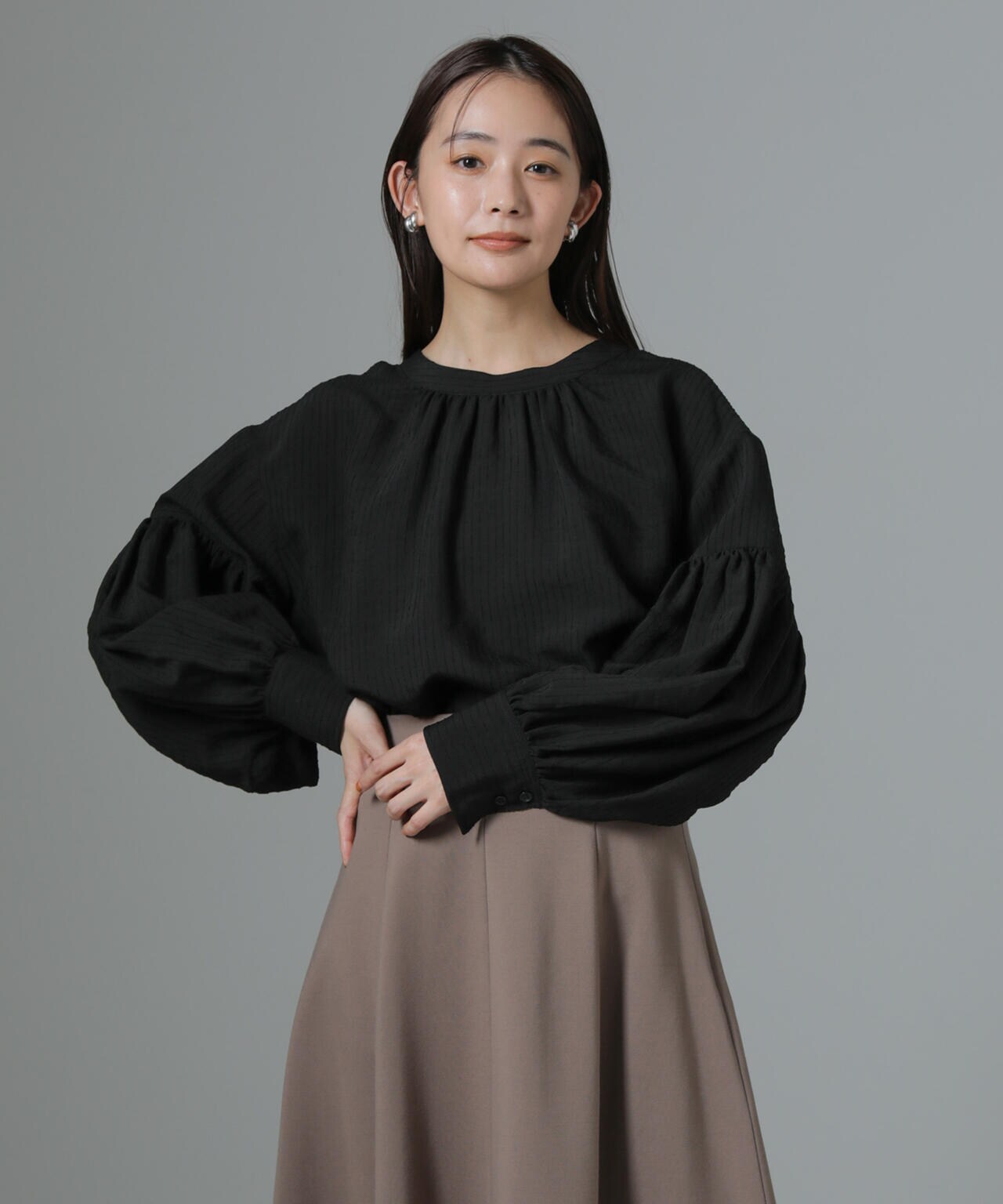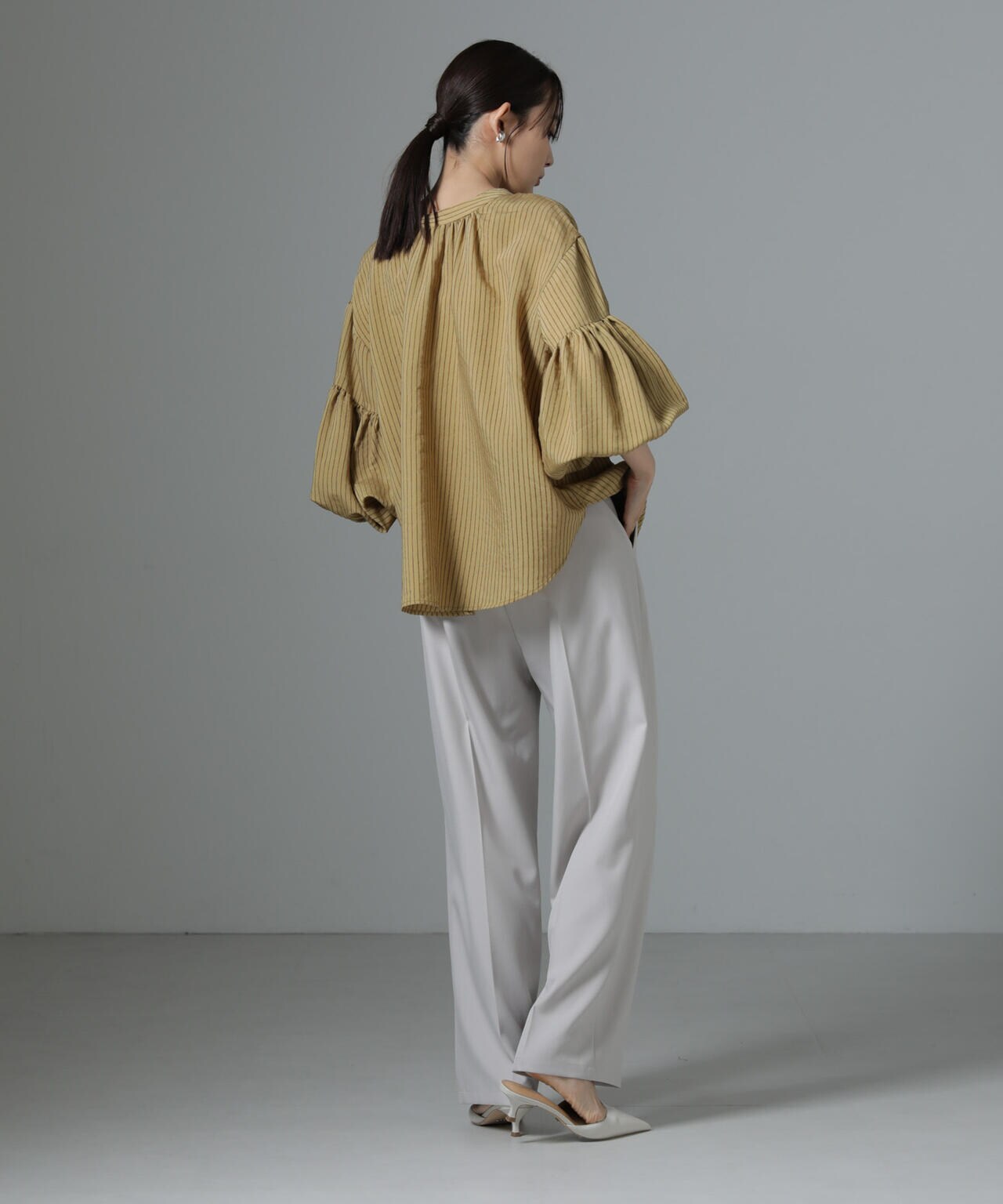 モールストライプデザインがポイントの前後2wayブラウス。リボンを外してスキッパー衿にして、抜け感を演出しても素敵◎。立体的なバルーンスリーブが、華やかさをプラスし一枚でしっかりとサマになるアイテムです。