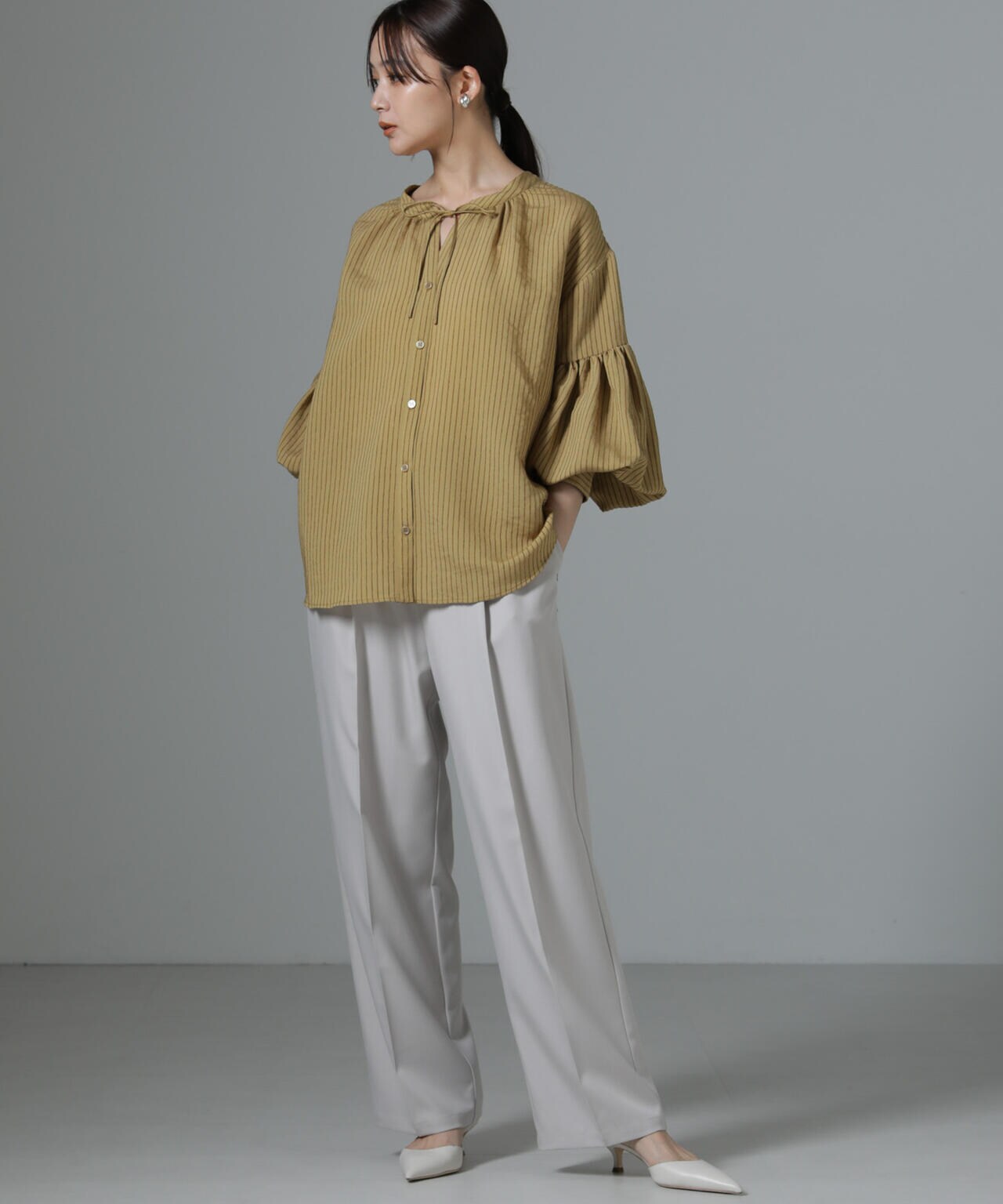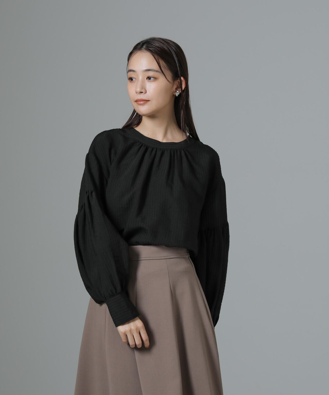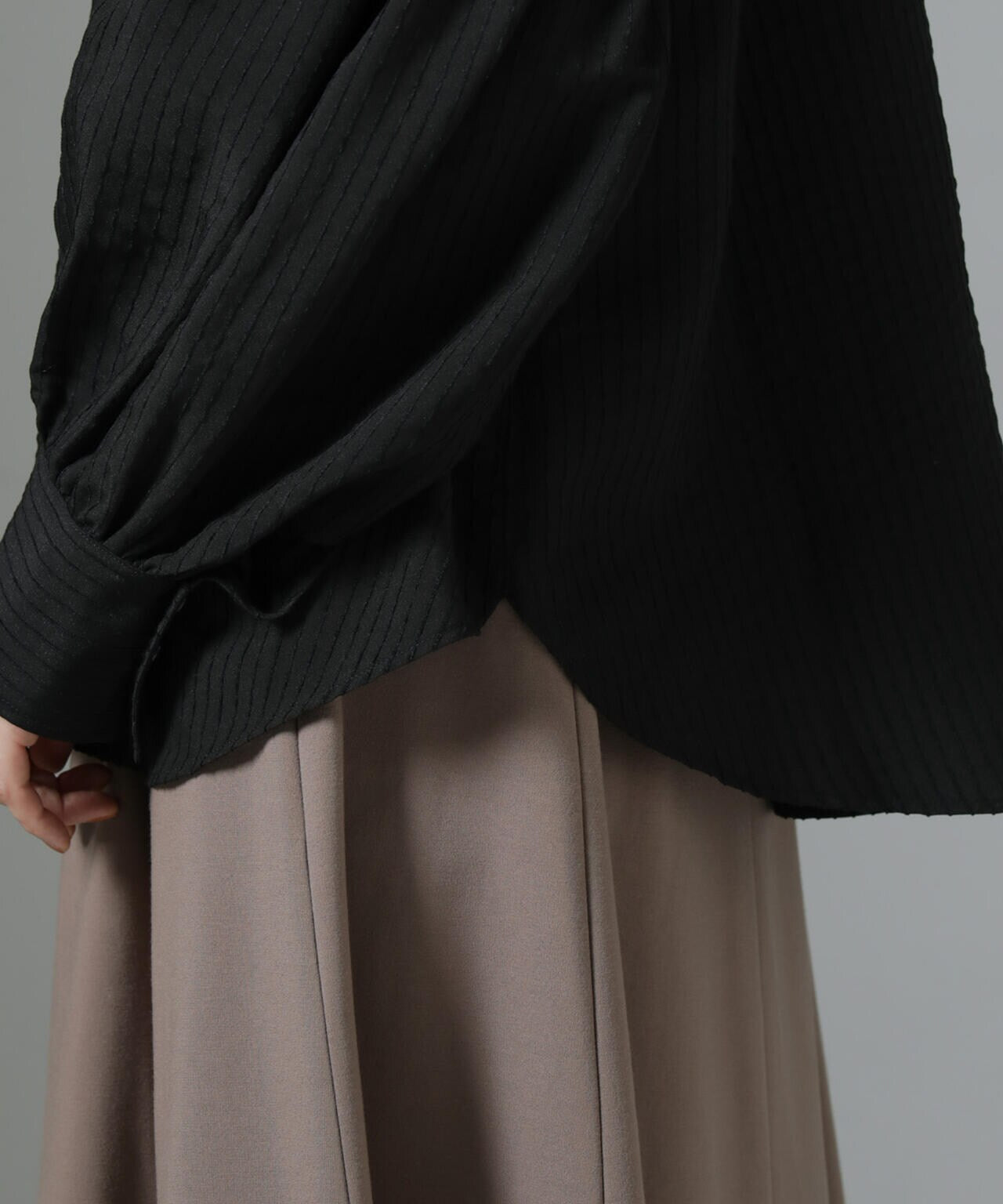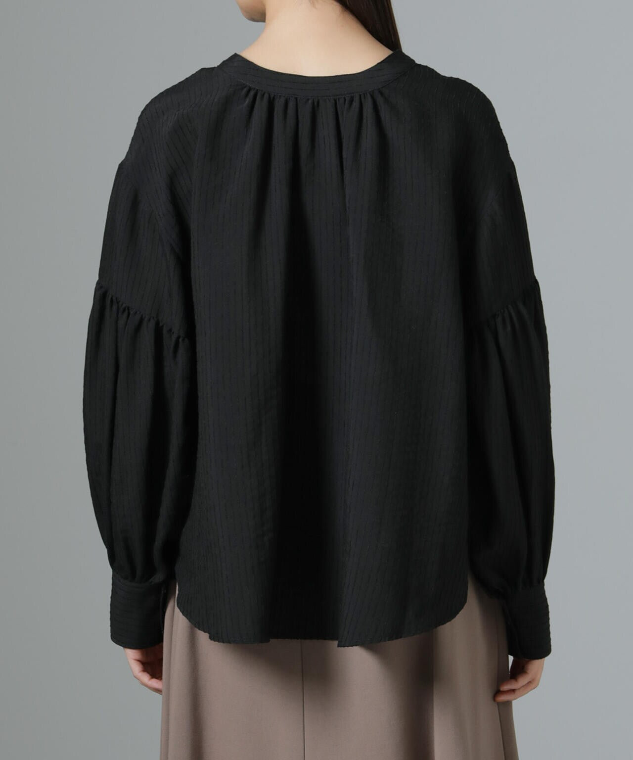 モールストライプデザインがポイントの前後2wayブラウス。リボンを外してスキッパー衿にして、抜け感を演出しても素敵◎。立体的なバルーンスリーブが、華やかさをプラスし一枚でしっかりとサマになるアイテムです。