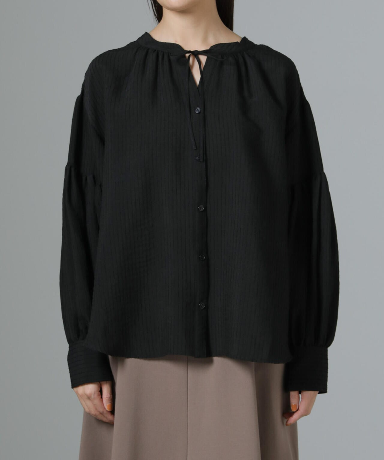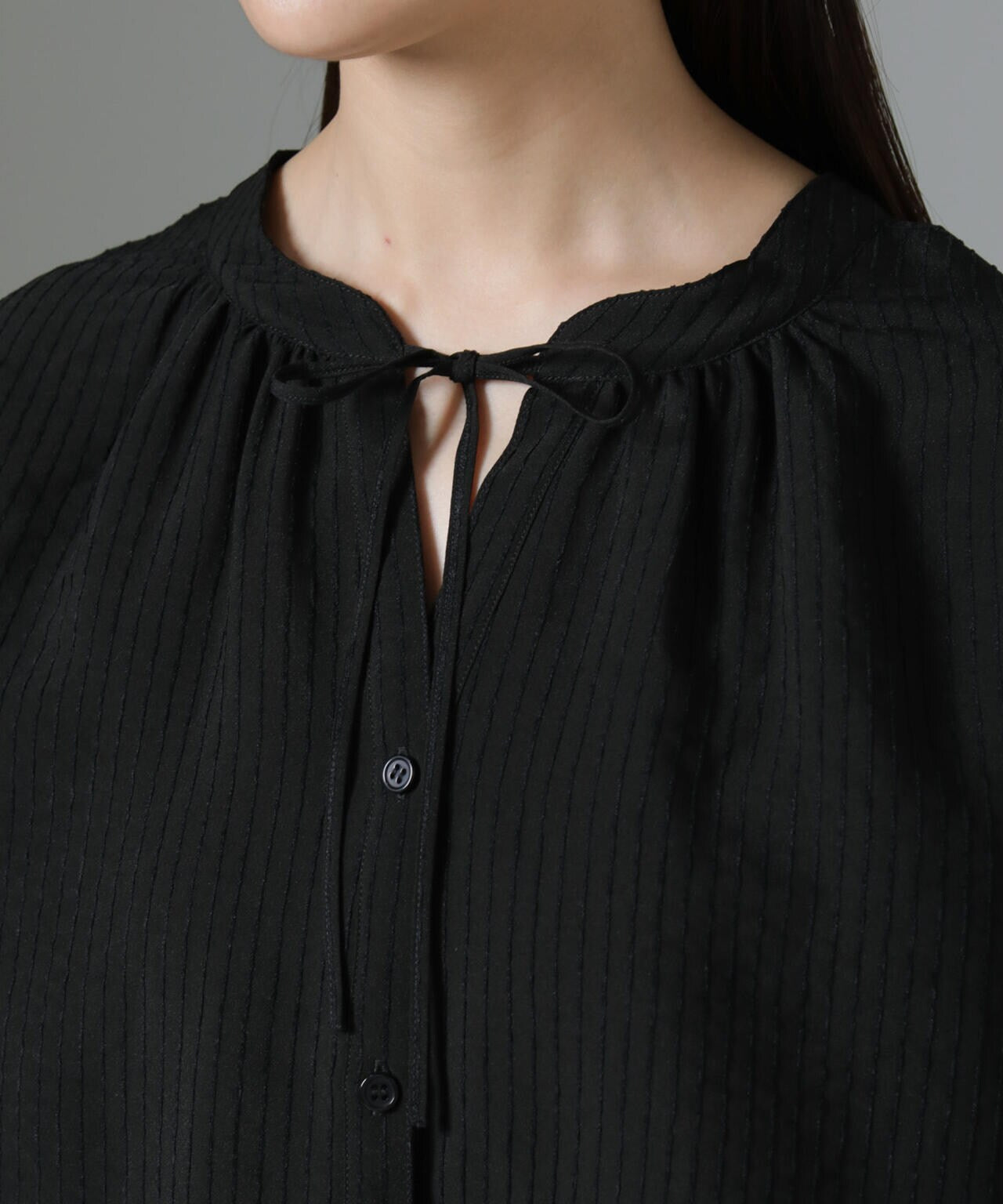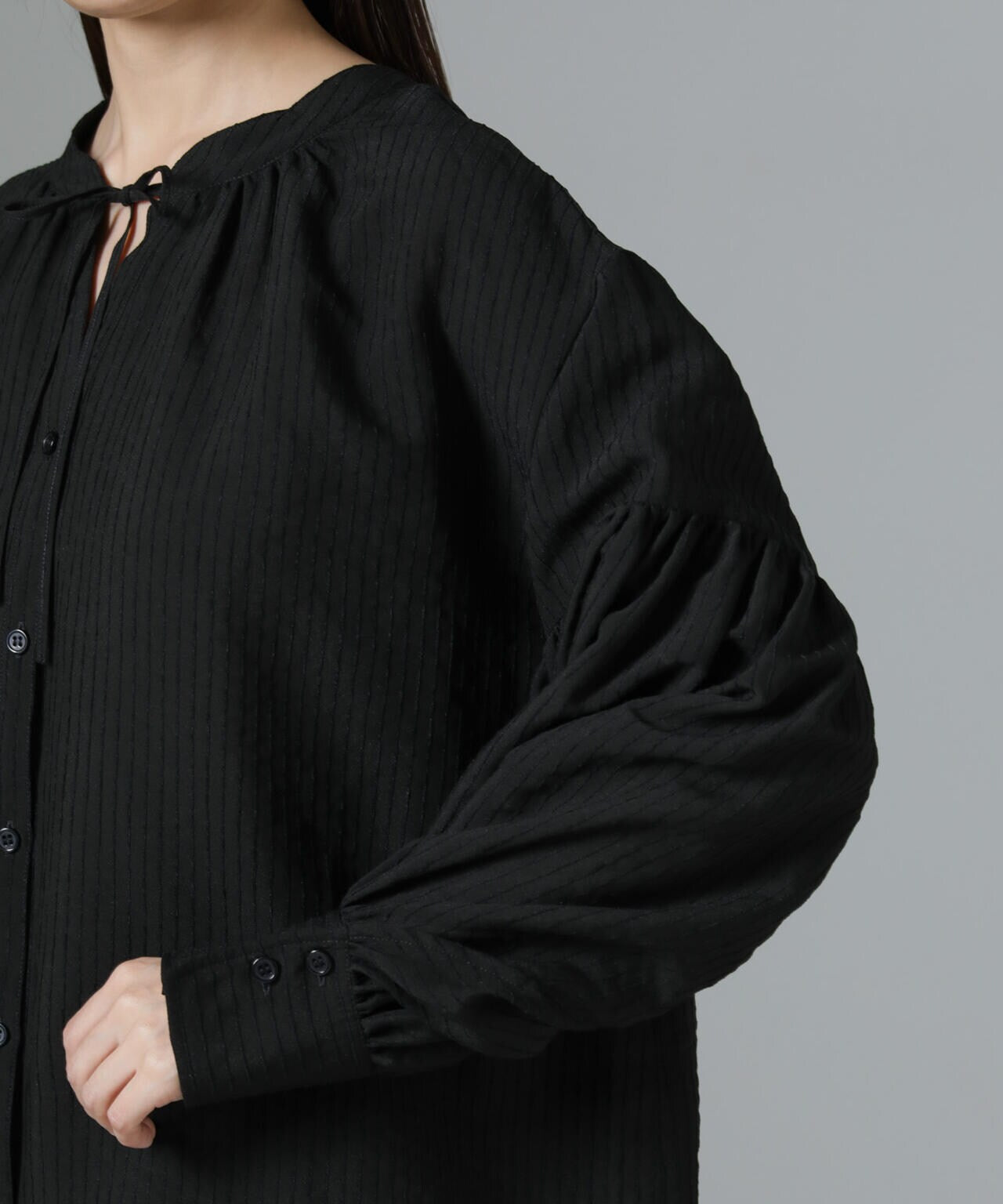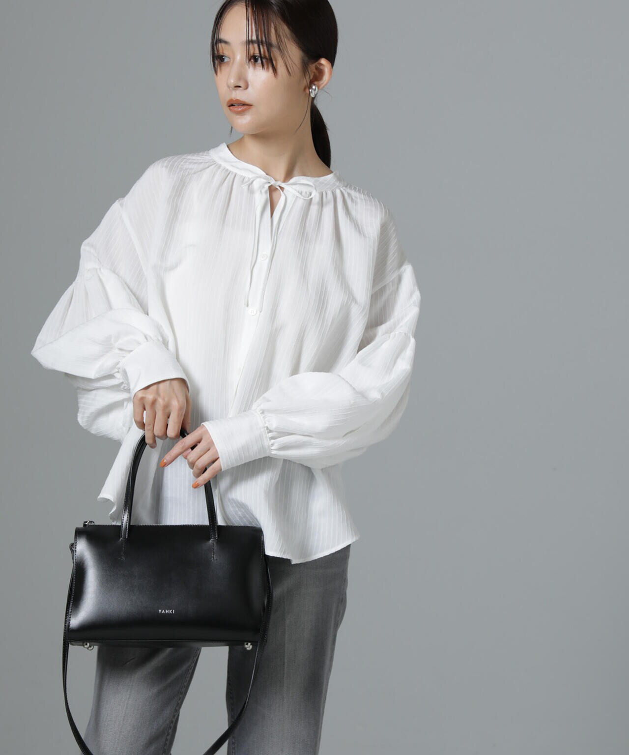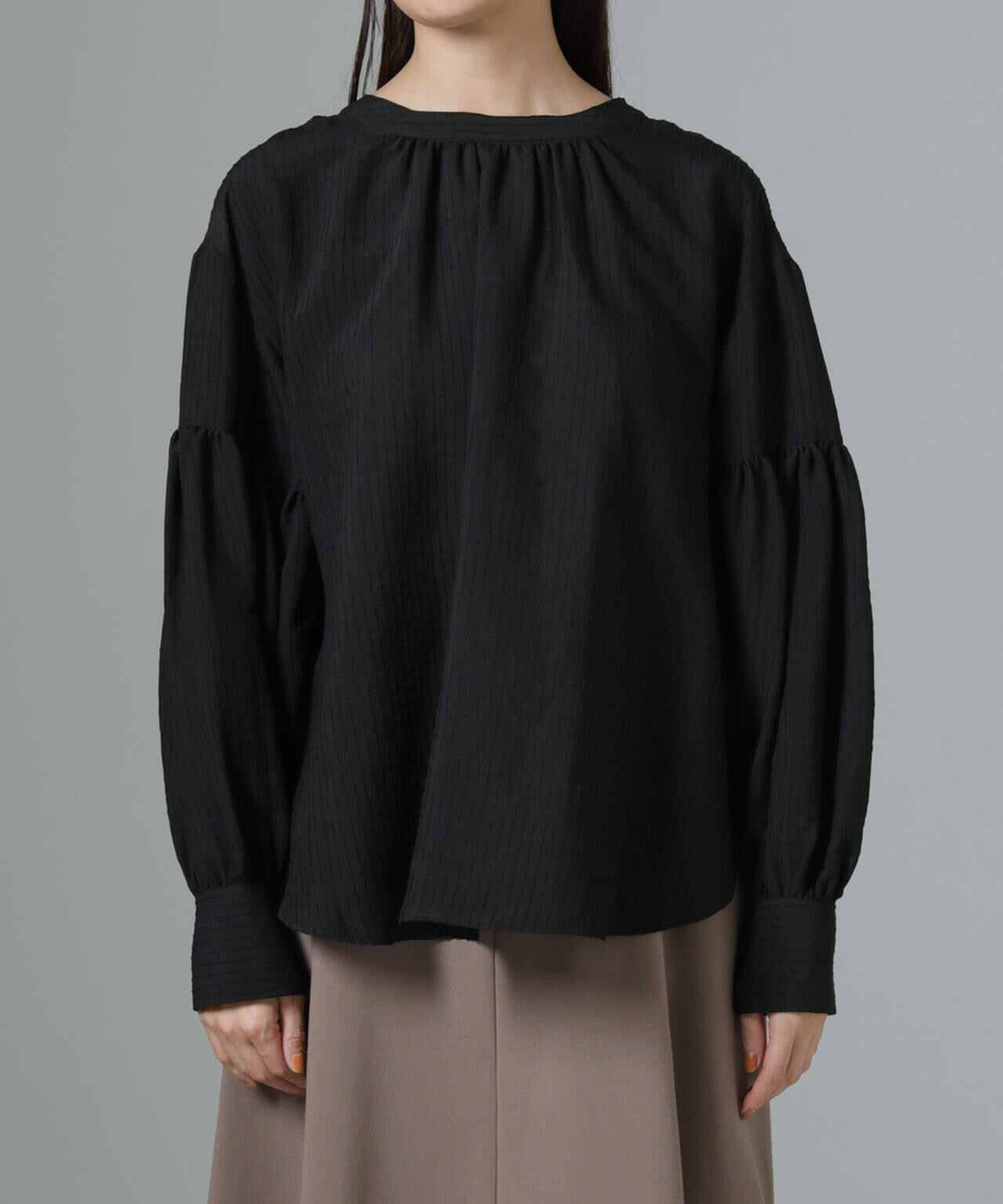 モールストライプデザインがポイントの前後2wayブラウス。リボンを外してスキッパー衿にして、抜け感を演出しても素敵◎。立体的なバルーンスリーブが、華やかさをプラスし一枚でしっかりとサマになるアイテムです。