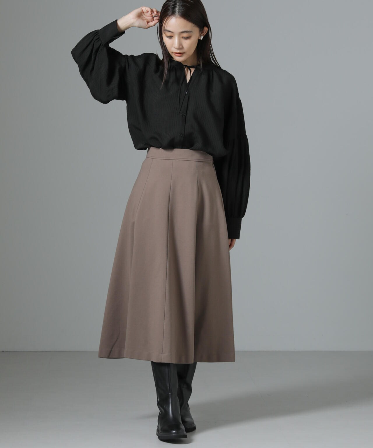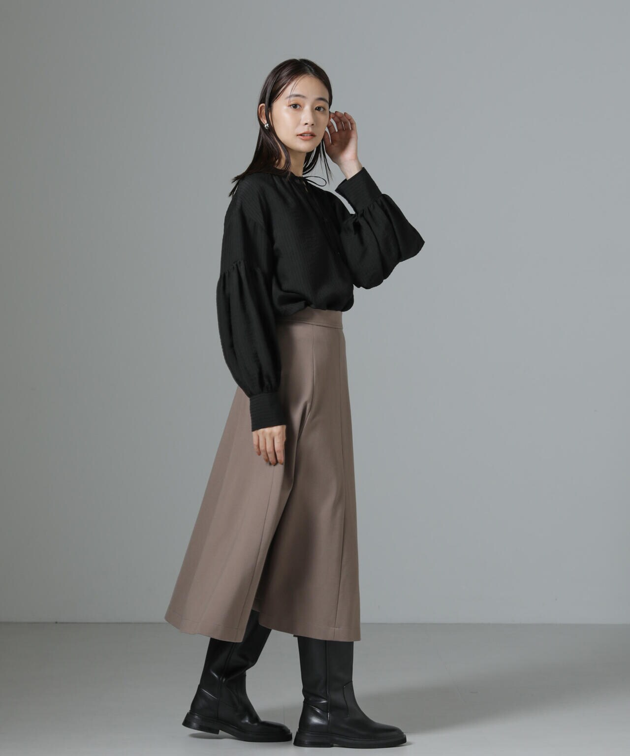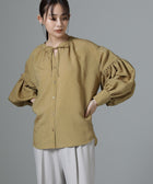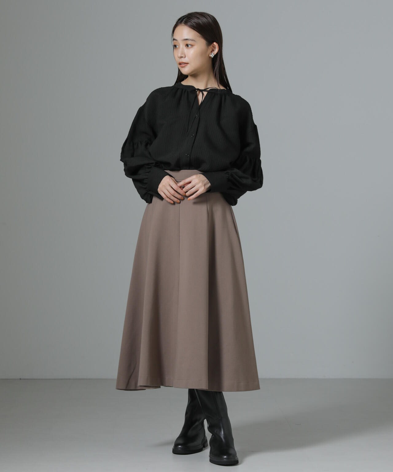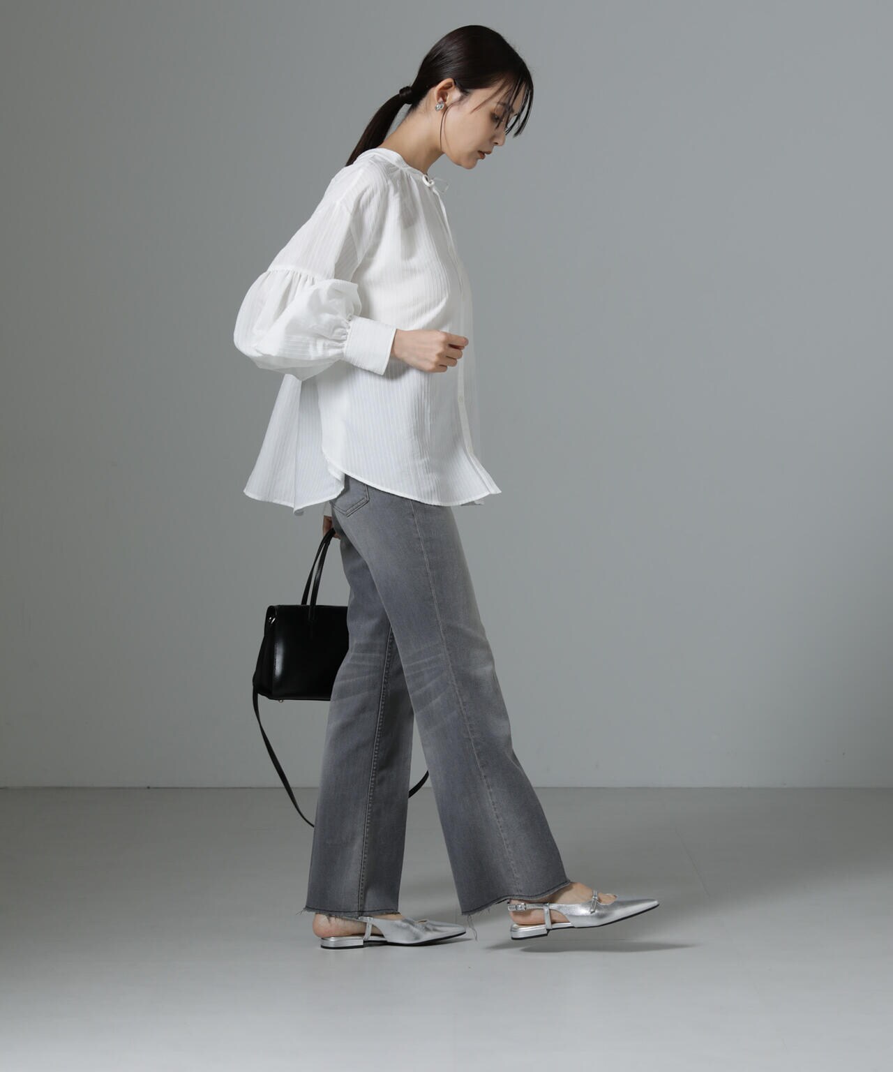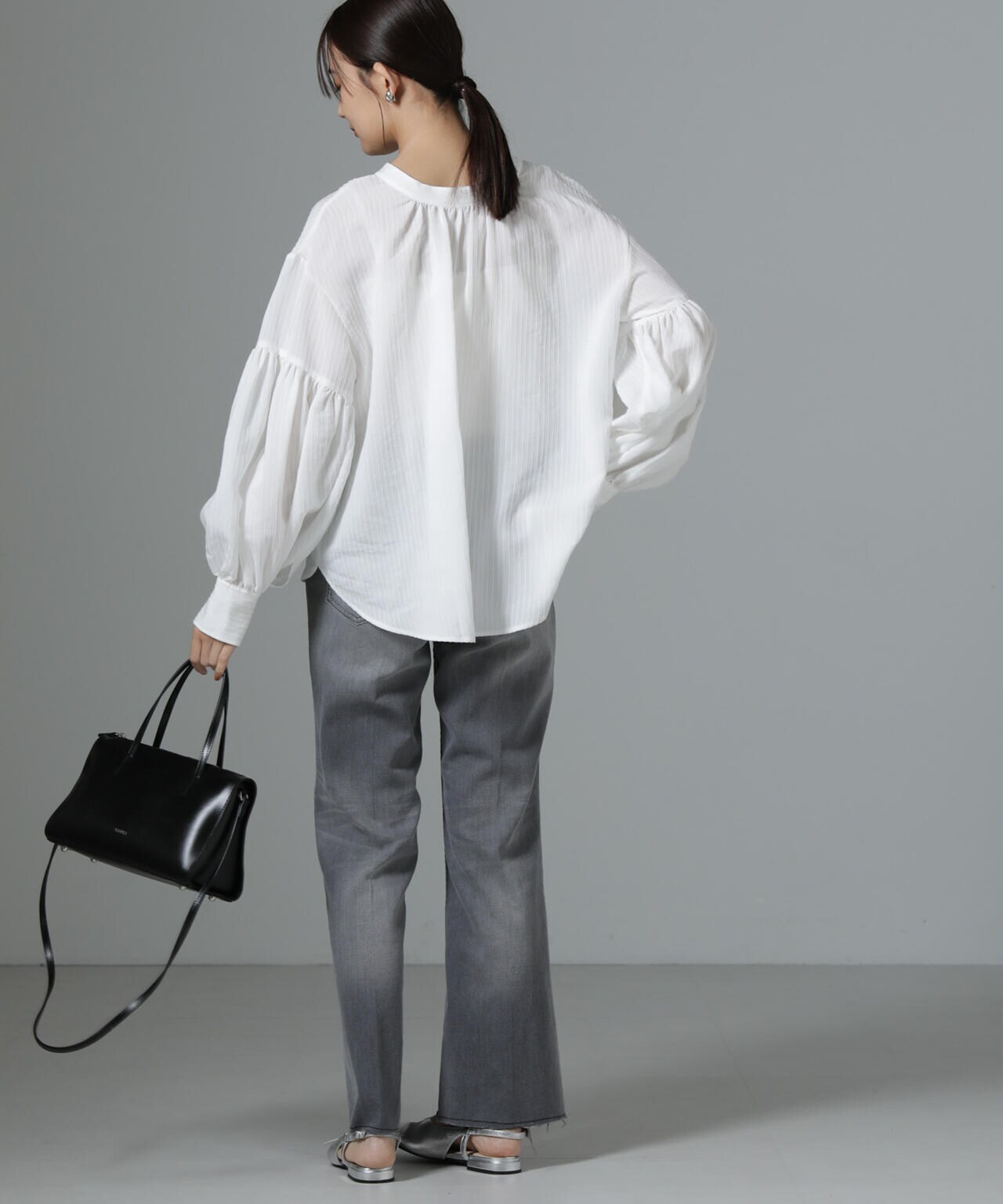 モールストライプデザインがポイントの前後2wayブラウス。リボンを外してスキッパー衿にして、抜け感を演出しても素敵◎。立体的なバルーンスリーブが、華やかさをプラスし一枚でしっかりとサマになるアイテムです。