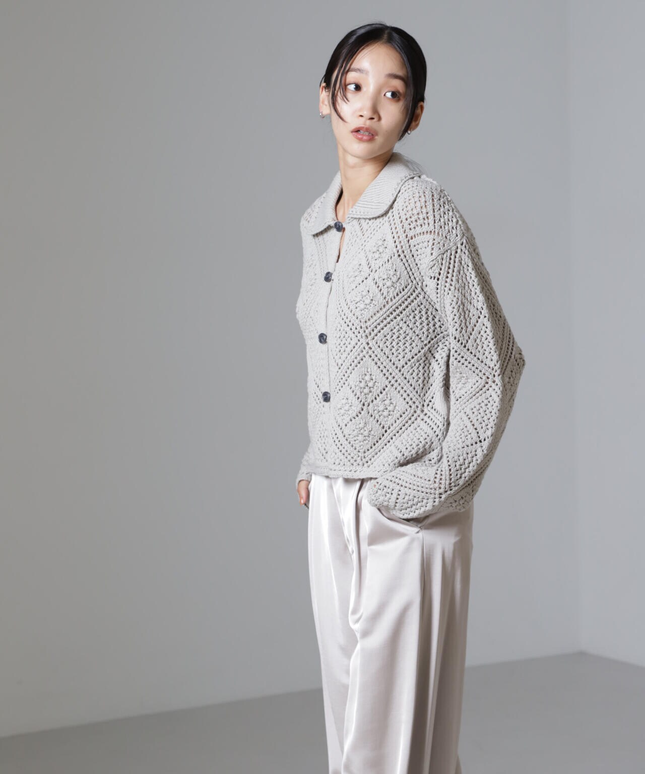 クラフト感のあるクロシェニット風のカーディガン。ふくらみの感じられる素材感を重たくならないように調整し、絶妙なカラーリングで仕上げたキレイ目にも合わせやすいデザイン。ノースリーブや半袖のアイテムに羽織るだけで秋のムードを演出してくれるから、端境期の羽織りとしても重宝します。