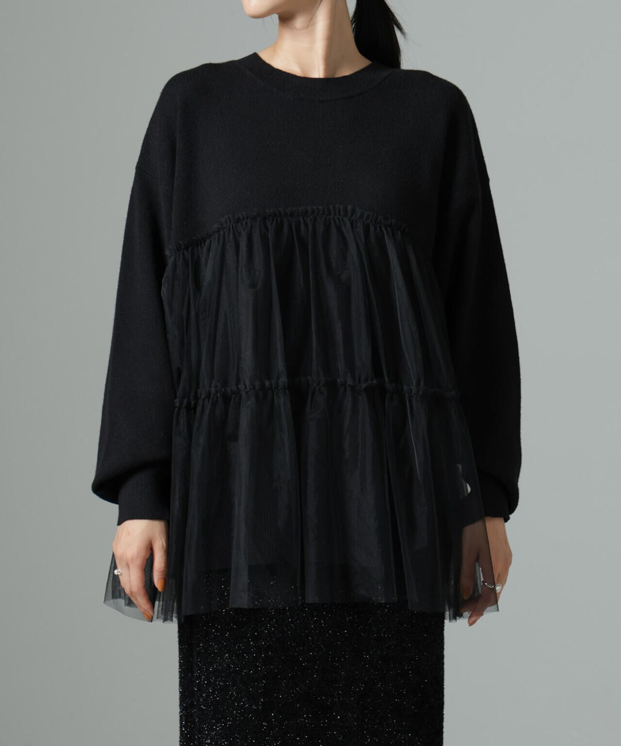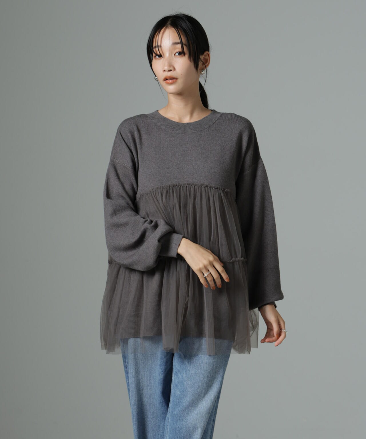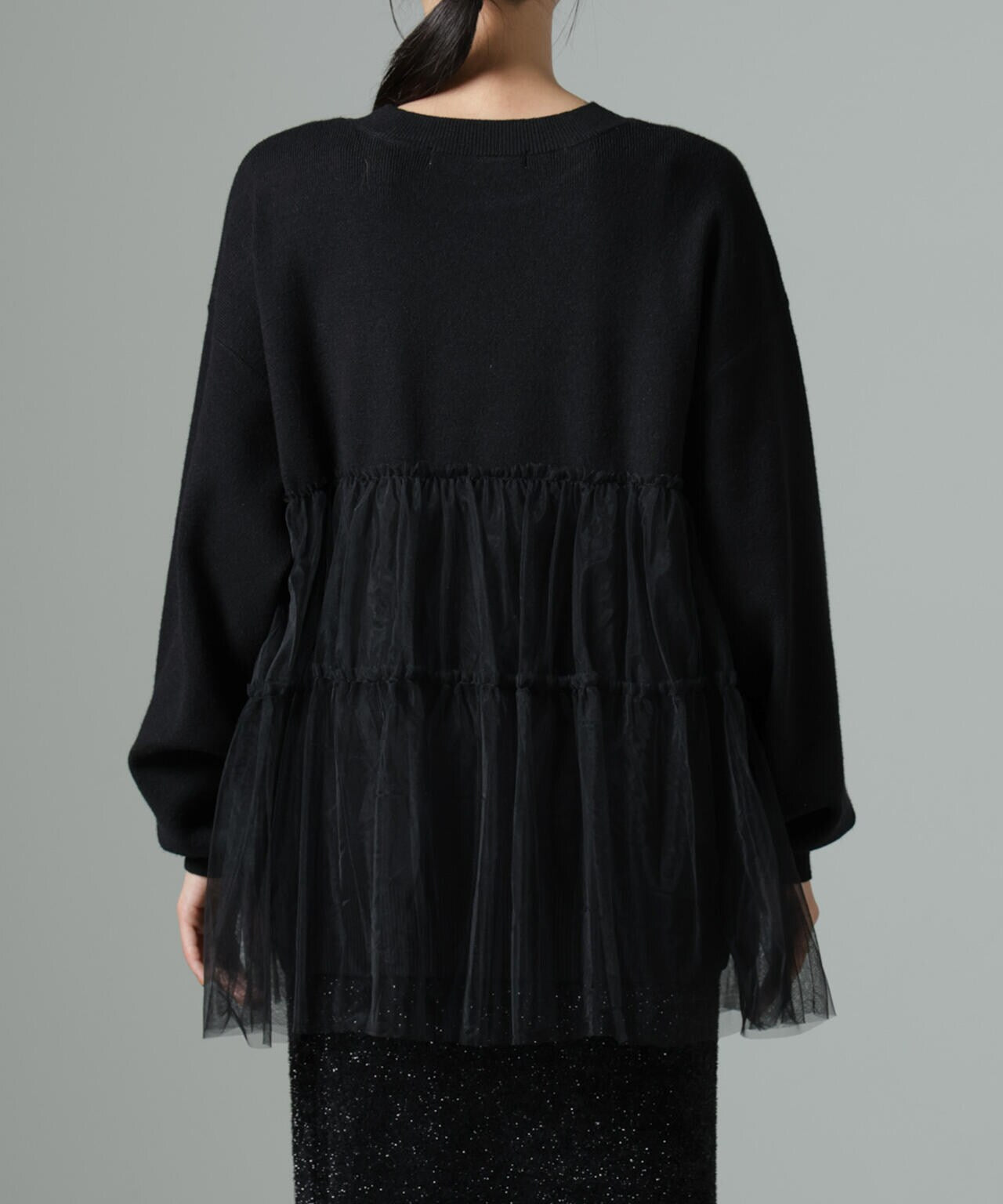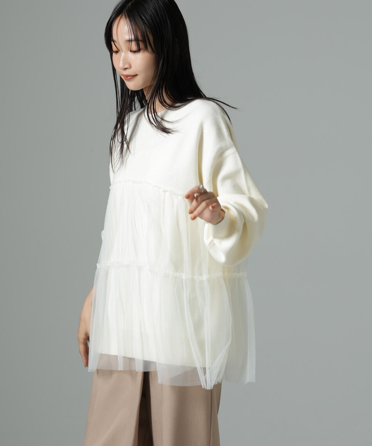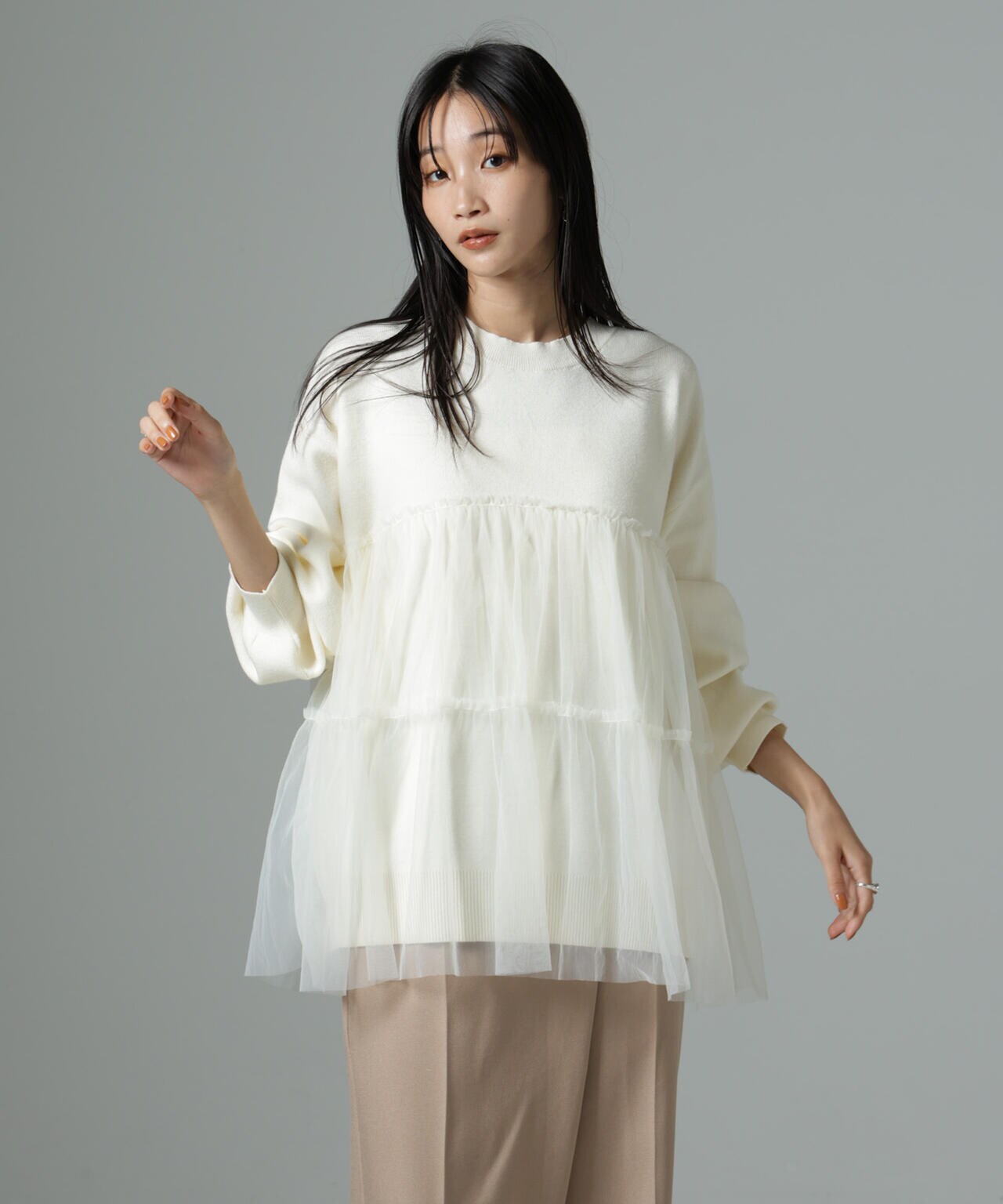 女性らしく華やかに着映えるチュールコンビのニットトップス。甘さを控えた落ち着いた色味が大人っぽい雰囲気に仕上げてくれます。ゆるっとしたサイズ感で着心地も良く、ワードローブに追加したい逸品です。
