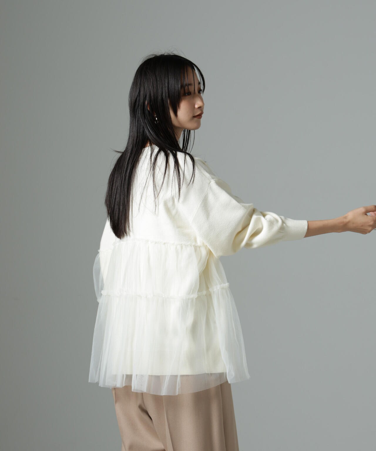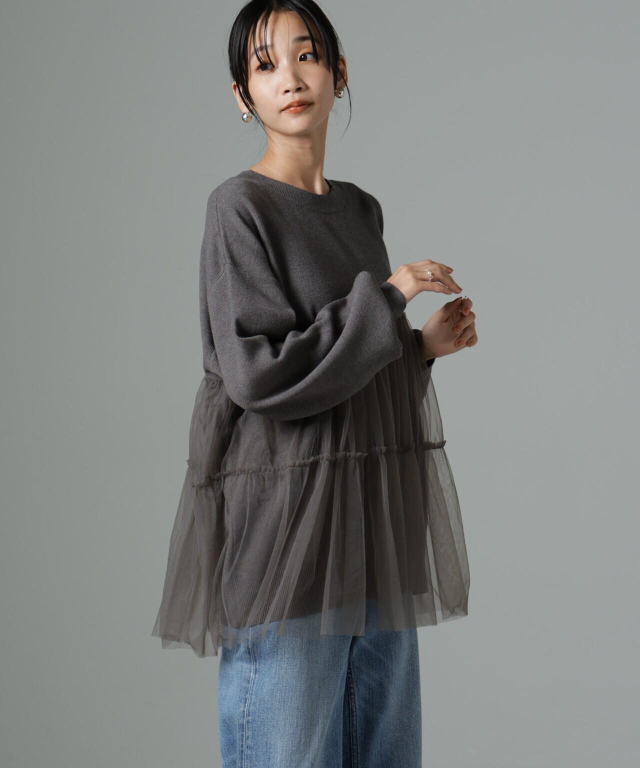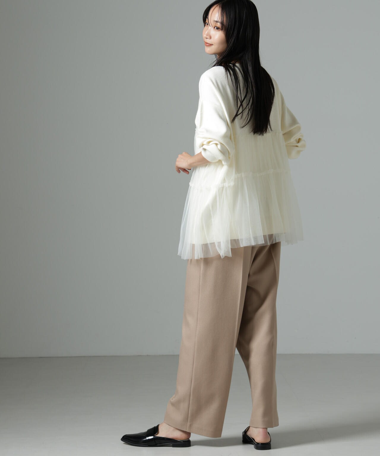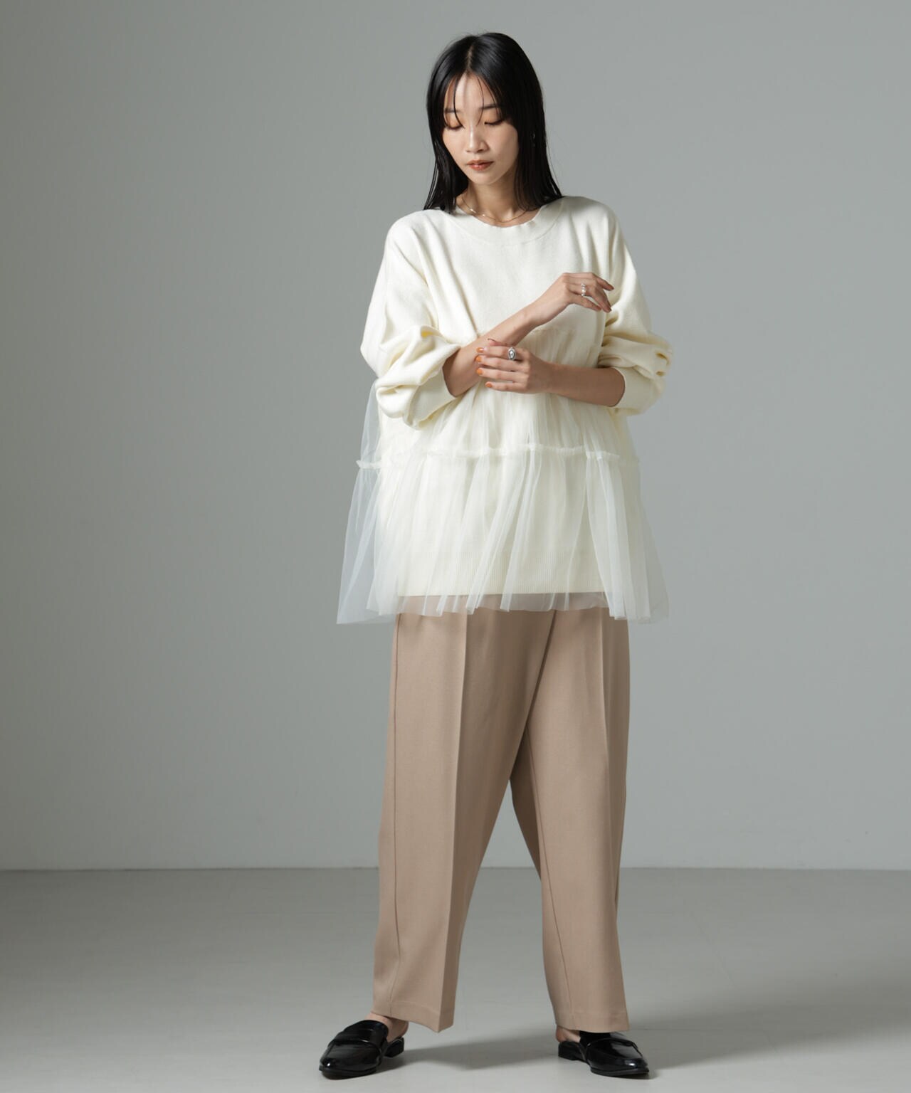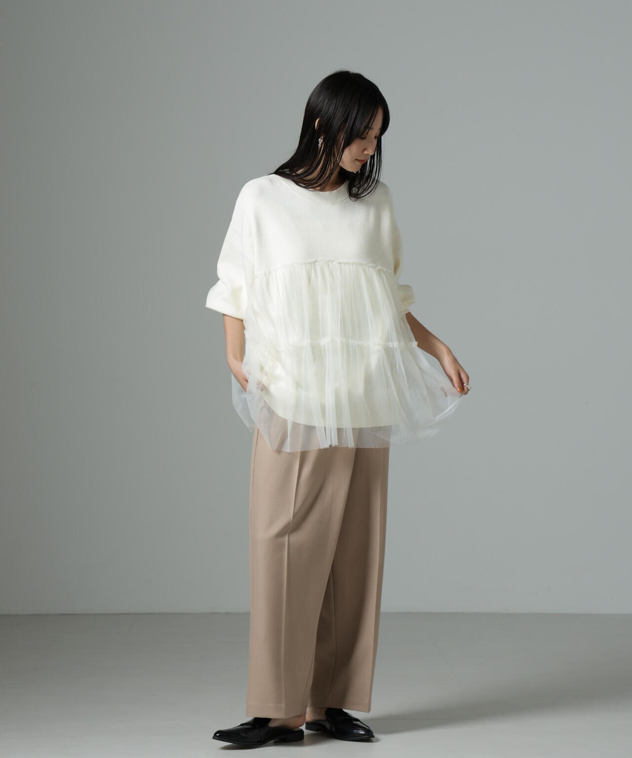 女性らしく華やかに着映えるチュールコンビのニットトップス。甘さを控えた落ち着いた色味が大人っぽい雰囲気に仕上げてくれます。ゆるっとしたサイズ感で着心地も良く、ワードローブに追加したい逸品です。