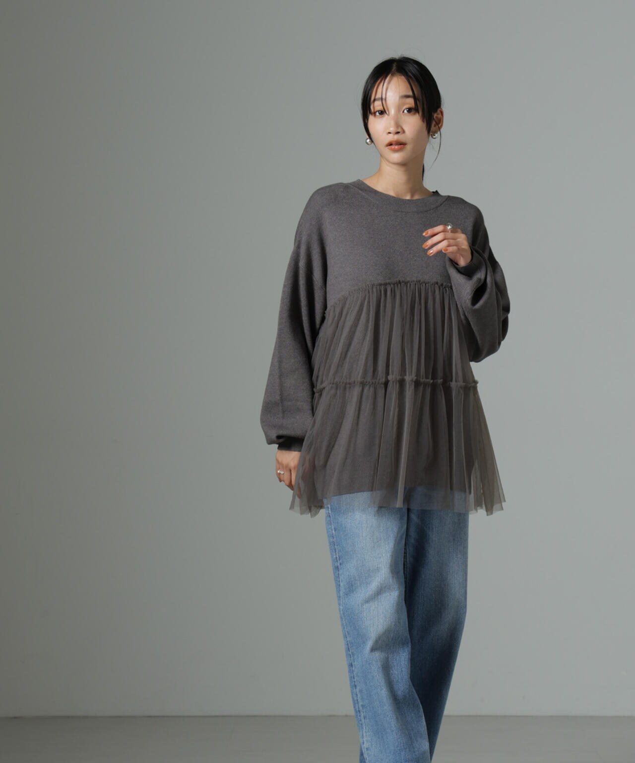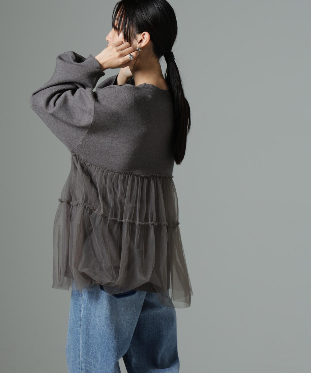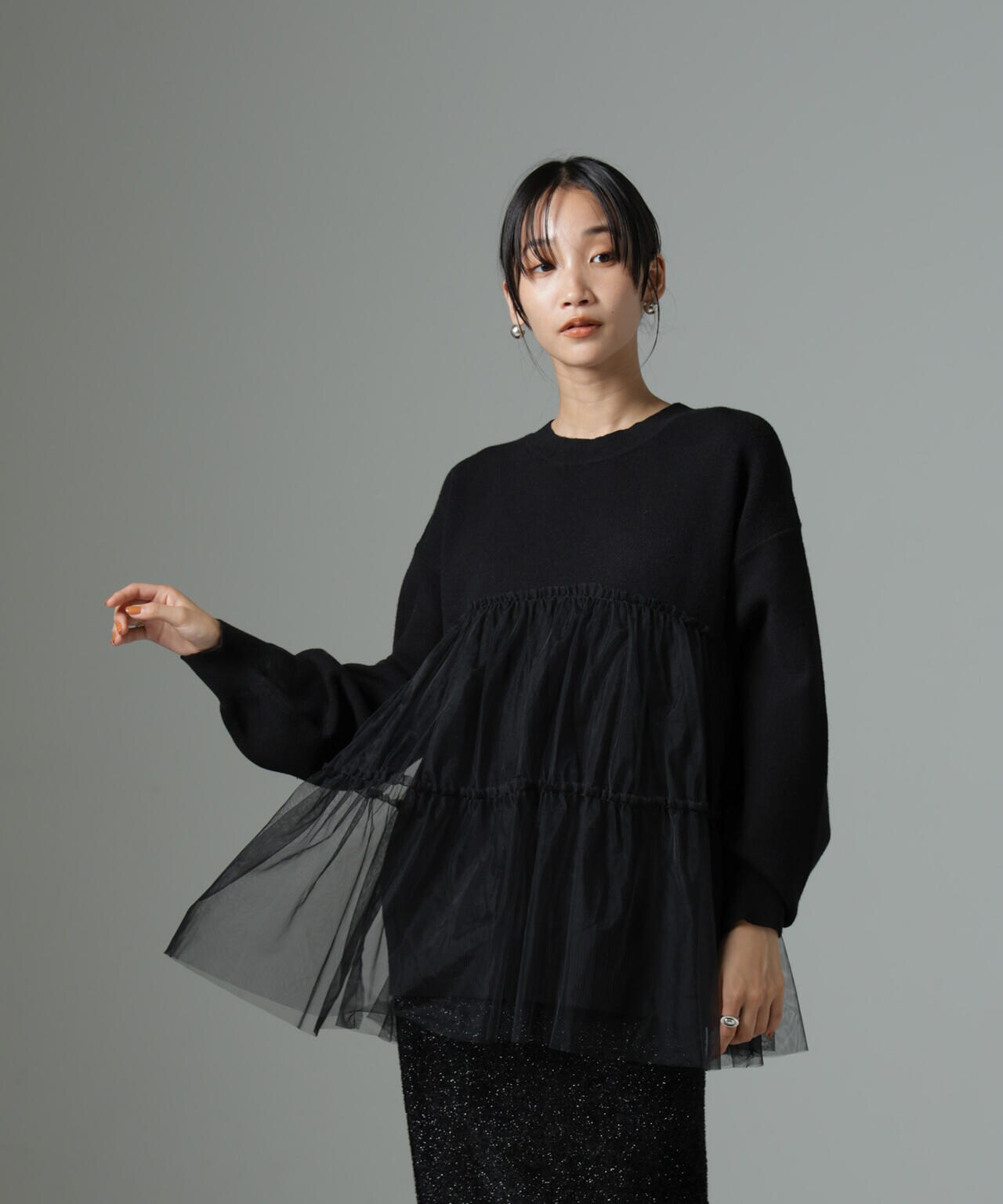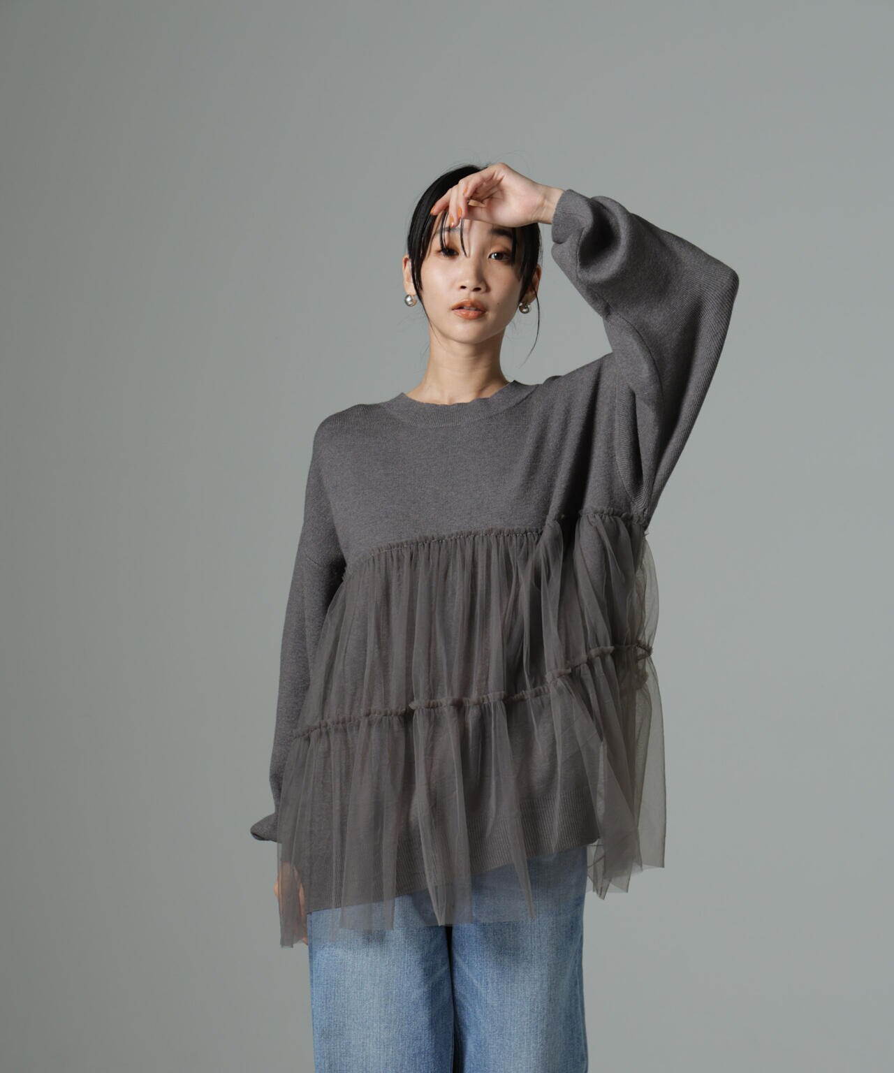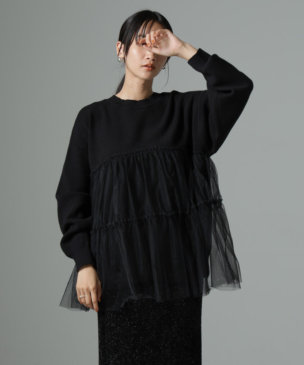 女性らしく華やかに着映えるチュールコンビのニットトップス。甘さを控えた落ち着いた色味が大人っぽい雰囲気に仕上げてくれます。ゆるっとしたサイズ感で着心地も良く、ワードローブに追加したい逸品です。