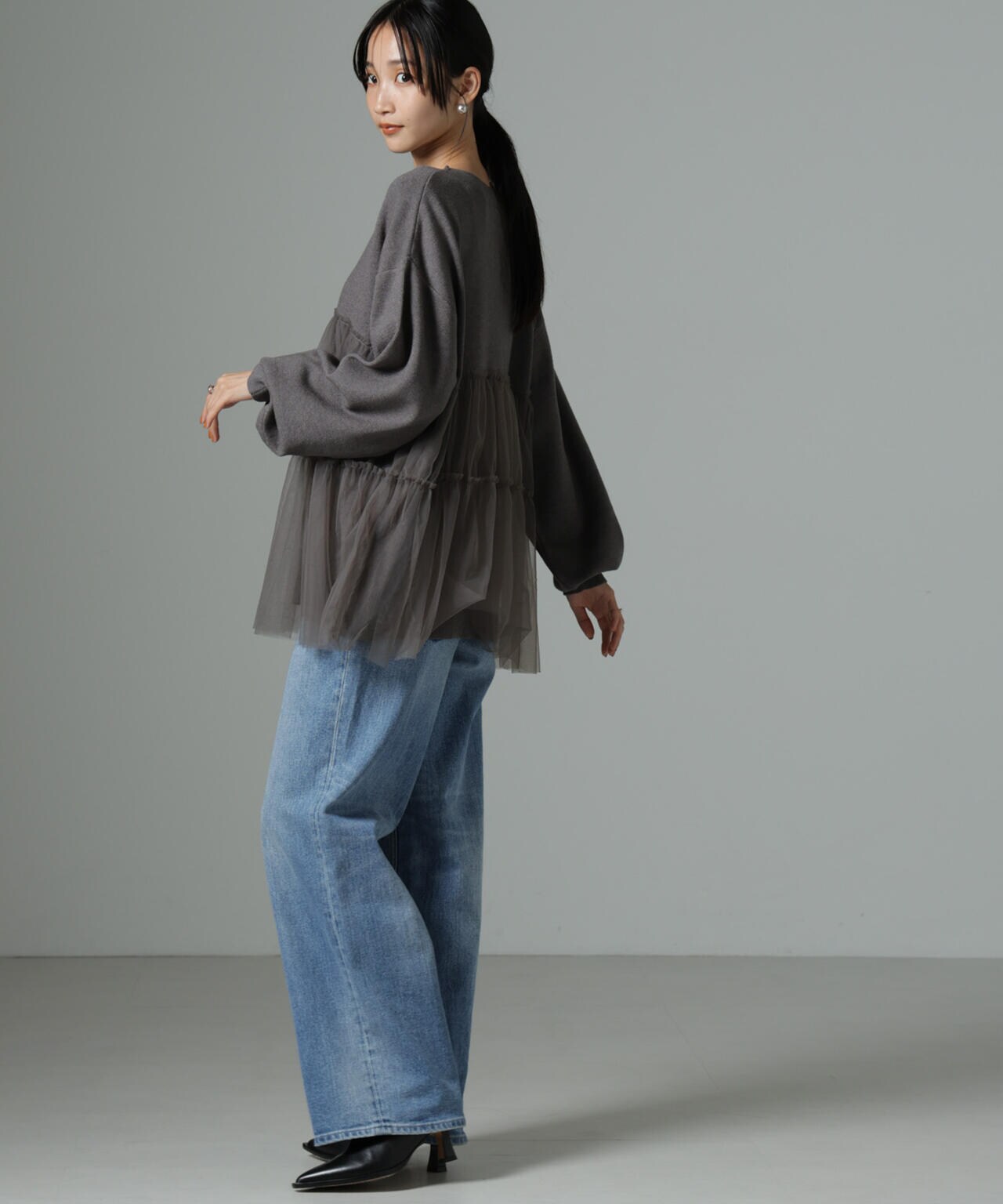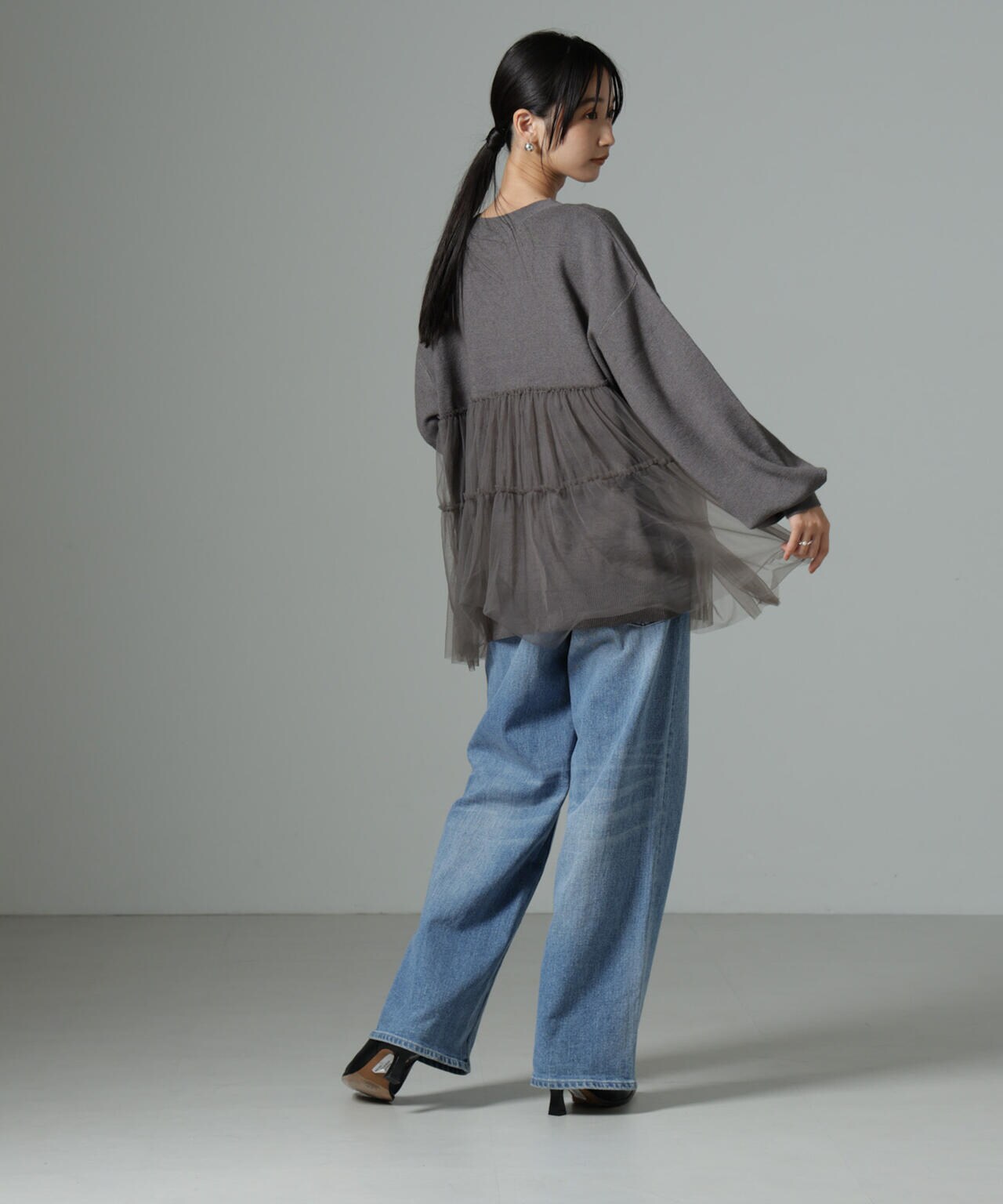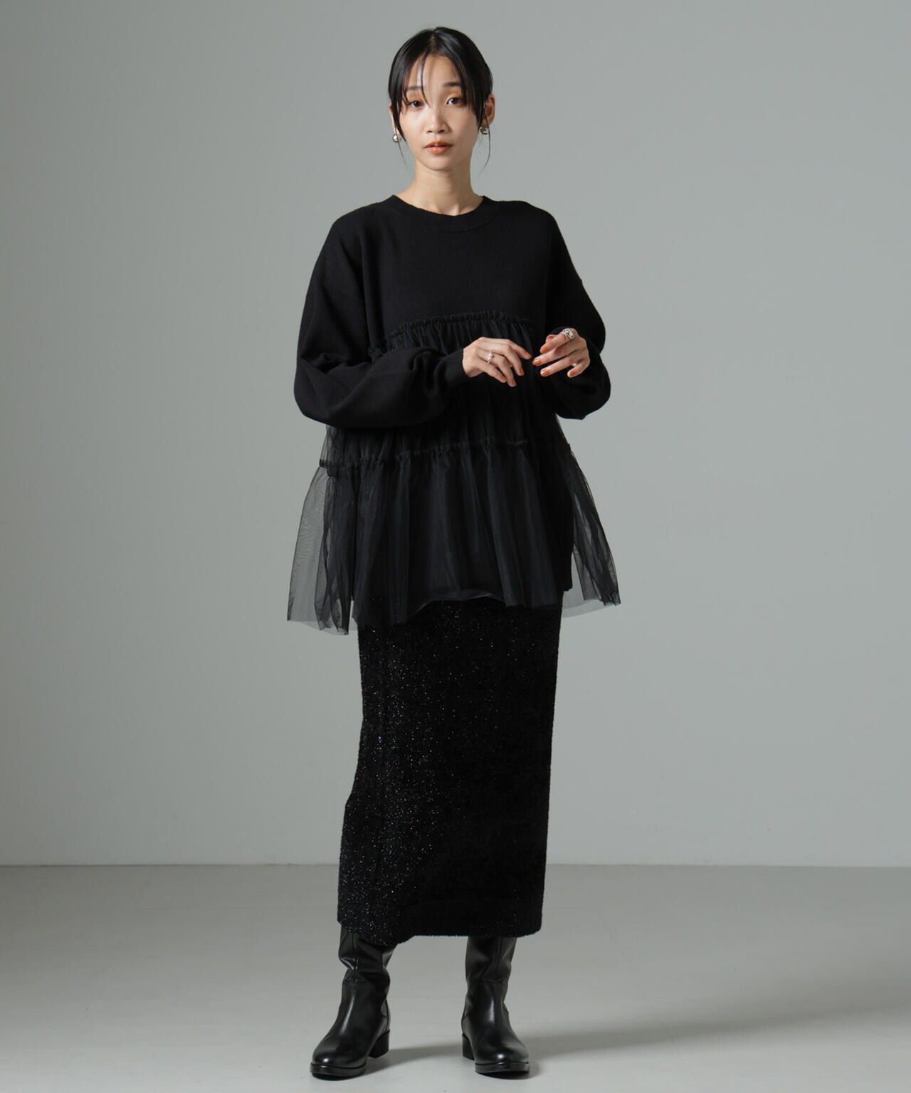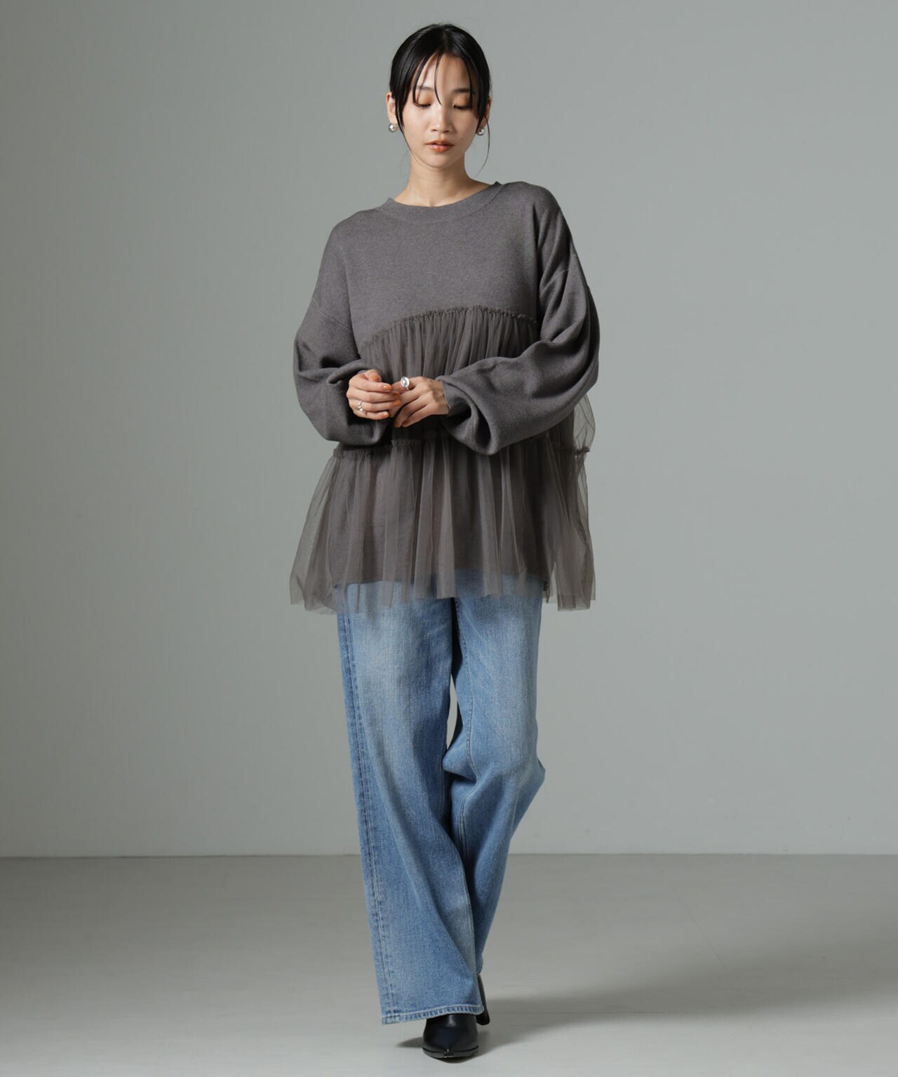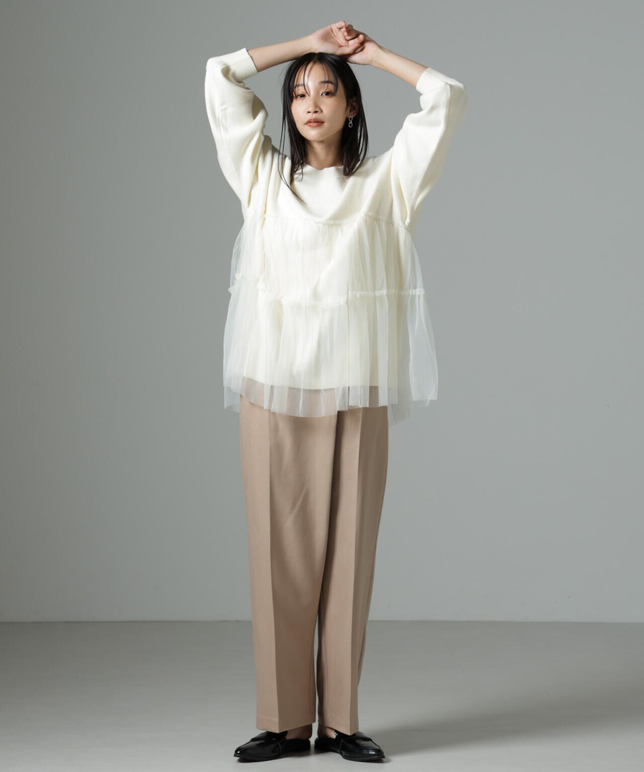 女性らしく華やかに着映えるチュールコンビのニットトップス。甘さを控えた落ち着いた色味が大人っぽい雰囲気に仕上げてくれます。ゆるっとしたサイズ感で着心地も良く、ワードローブに追加したい逸品です。